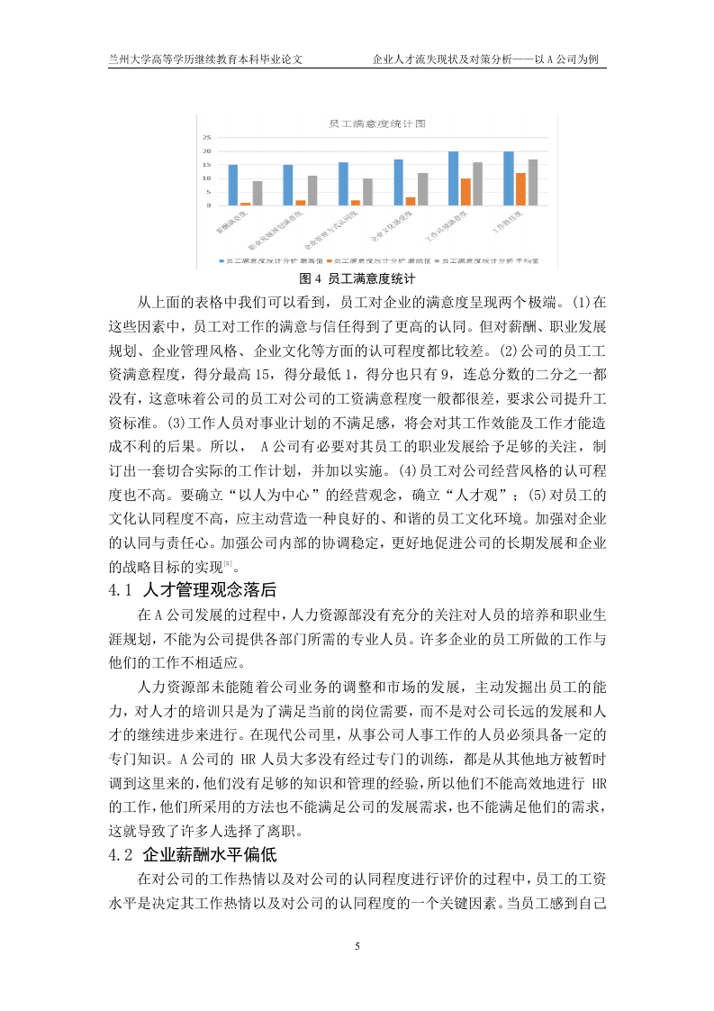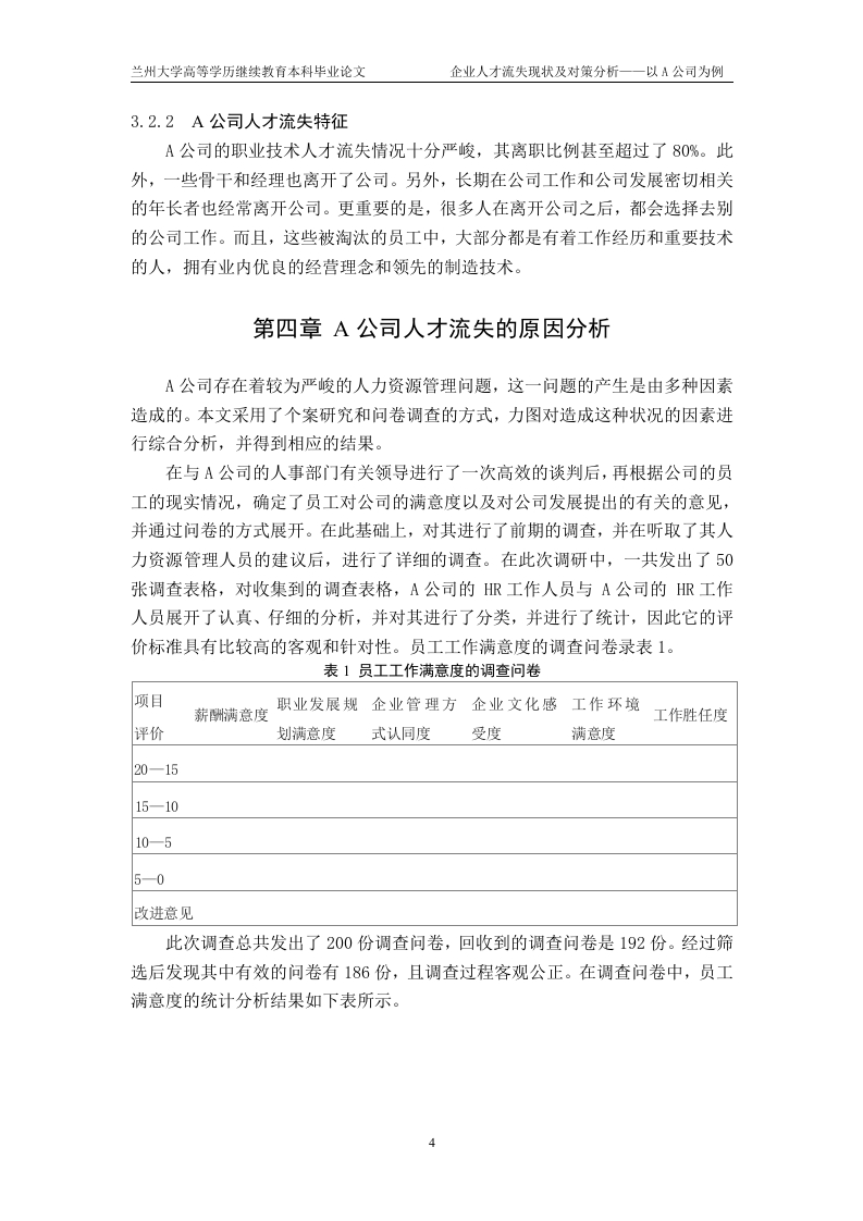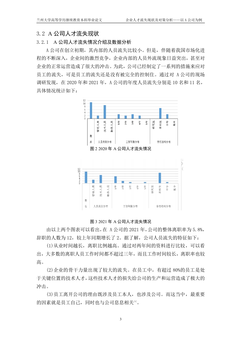 企业人才流失现状及对策分析一一以A公司为例摘要21世纪将是知识与创新的时代,任何一家中小型企业的成长,都需要优秀员工的努力和付出。而人才是决定公司竞争能力的关键因素。由于劳动力供给与需求的不平衡以及激烈的市场竞争,致使大量的人员离开本单位,从而引发了大量的人员外流。由此可见,解决好人才流失问题,可以为中小企业的发展保驾护航。本论文以A公司为例,对其人才流失的现状进行了调查,探讨了结合该公司在人才管理理念、企业薪酬水平、企业文化、员工自身等方面进行探讨,最后得出该公司存在人才管理理念落后、企业薪酬水平较低、企业文化匮乏,最后笔者根据上述问题制定了切实可行的措施,这种措施对A公司人力资源的发展有一定的促进作用。关键词:人才流失:问题:对策:A公司Current situation and countermeasureanalysis of brain drain in enterprisesTake A Company as an exampleAbstractThe 21st century will be an era of knowledge and innovation.The growth of anysmall and medium-sized enterprise requires the efforts and efforts of excellentemployees.Talent is the key factor in determining the competitiveness of a company.Due to the imbalance of labor supply and demand and the fierce market competition,a large number of people leave the unit,resulting in a large number of people outflow.Thus,solving the problem of brain drain can escort the development of small andmedium-sized enterprises.This paper in A company,for example,investigated thepresent situation of the brain drain,discusses the combination of the company in thetalent management concept,enterprise salary level,corporate culture,employees,andconcluded that the company has backward talent management concept,enterprisecompensation level is low,the lack of corporate culture,the author according to theabove problems,the feasible measures for the development of human resources.Keywords:Brain drain;problem;countermeasures;Company A兰州大学高等学历继续教育本科毕业论文企业人才流失现状及对策分析—一以A公司为例目录Abstract.…第一章引言…第二章概念界定2.1人才流失的定义。..cc2.2人才流失的类型第三章A公司人才流失现状23.1A公司简介2图1A公司人力资源基本情况…3.2A公司人才流失现状….2图22020年A公司人才流失情况..3图32021年A公司人才流失情况第四章A公司人才流失的原因分析…4表1员工工作满意度的调查问卷图4员工满意度统计4.1人才管理观念落后…4.2企业薪酬水平偏低54.3缺乏员工职业生涯发展规划.6第五章A公司防范人才流失的对策,。65.1推行人本管理…5.2提高员工薪酬水平…75.3完善员工职业生涯发展规划8第六章结论…9参考文献….9致谢.10兰州大学高等学历继续教育本料毕业论文企业人才流失现状及对策分析一一以A公司为例第一章引言目前,我国的中小企业面临着人才的大量外流现象,而这一现象又与其自身的生存与发展密切相关。中小企业一方面要持续发展,必定向一个具有一定规模的、稳定的企业过渡:另一方面,在发展的进程中,也会因为多种原因而出现发展停滞,从其对公司发展的冲击来分析,其中最为重要的就是员工的流失问题,这很有可能会引起公司的经营出现停顿,乃至是公司的经营状况出现严重的下滑。所以,要实现公司的长期、稳步发展,就需要处理好公司内部的人员流失问题,保证公司内部人员的稳定性。文章从员工流失给公司带来的负面效应入手,进行了正向的研究与分析。在此基础上,提出了两个重要的因素:企业和个人。根据这两个主要原因,并根据我国的实际情况,探讨如何应对公司人员流失,进而探索公司招揽人才的战略。从员工流失的成因出发,并与我国当前公司产业发展的实际情况相联系,通过查阅有关的数据,可以得到员工的流失对公司产生的负面作用。第二章概念界定长久以来,人才流失问题都是限制我国企业发展的主要原因,而且,伴随着国家的高速发展和行业的不断提升,这种情况也变得越来越突出。人才的外溢问题,已成为制约企业发展的瓶颈。2.1人才流失的定义所谓的“人才流失”,就是本来在公司内部工作的员工,由于自己或公司的因素而离职,导致原来工作岗位的空缺,对公司的生产经营活动产生不良的影响。按照其表现方式,一般可分为:显性和隐性两类。最直接的体现就是显性的人员流失是直观的。而隐形人才流失就不一样了,它是无法直接感知到的,一般情况下,它是一种在公司内部工作的员工,因为其本身价值难以实现,或是觉得薪资水平制度不合理等原因,对工作的热情会大幅度降低,从而造成了他们的能力没有得到有效的发挥,生产率也会下降,这对公司经营战略的实现和长期的发展不利。2.2人才流失的类型人才流失按类型大致可以分为两类:2.2.1显性流失和隐性流失显性人才流失就是在公司工作过的人员,由于某些因素而离职。使得其站位职位出现空缺,而公司却找不到新的员工,从而影响了公司的正常的生产经营活