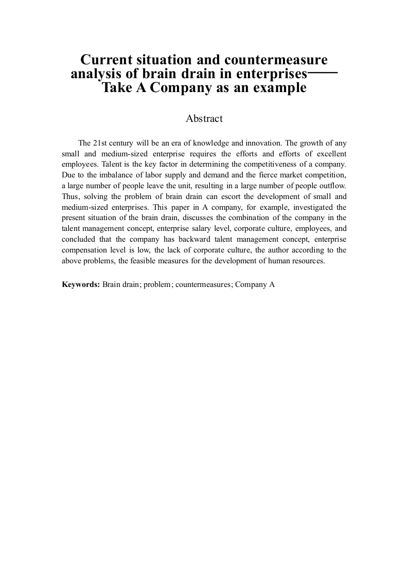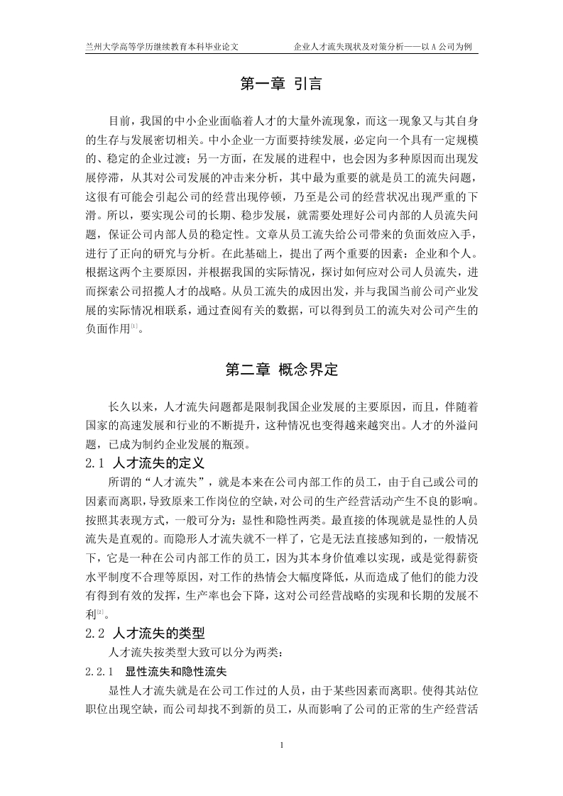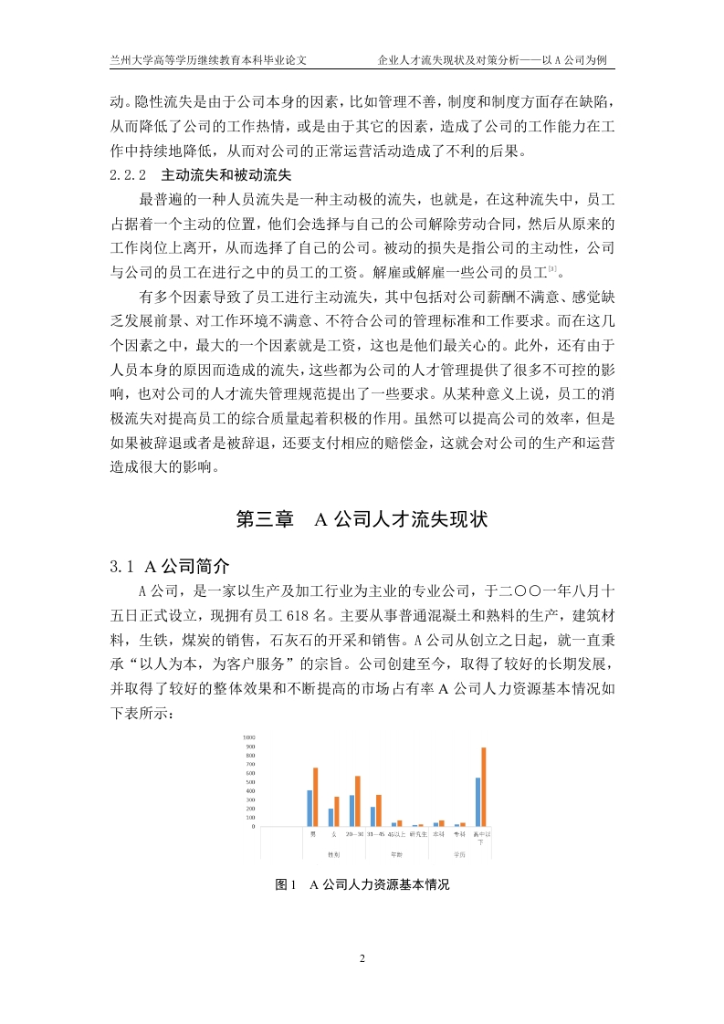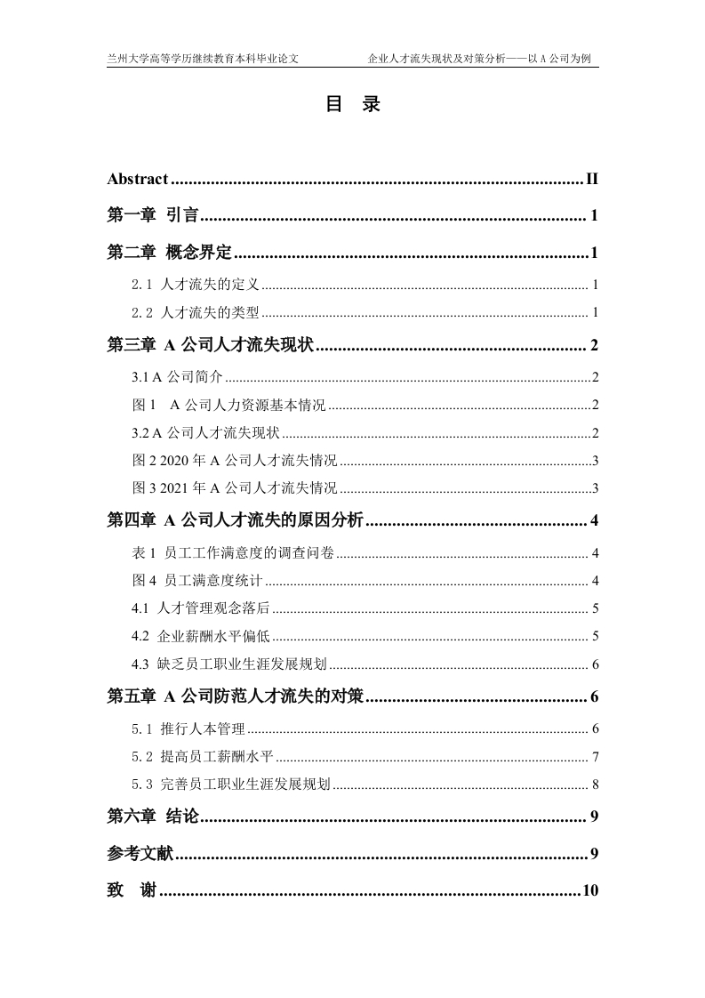 企业人才流失现状及对策分析一一以A公司为例摘要21世纪将是知识与创新的时代,任何一家中小型企业的成长,都需要优秀员工的努力和付出。而人才是决定公司竞争能力的关键因素。由于劳动力供给与需求的不平衡以及激烈的市场竞争,致使大量的人员离开本单位,从而引发了大量的人员外流。由此可见,解决好人才流失问题,可以为中小企业的发展保驾护航。本论文以A公司为例,对其人才流失的现状进行了调查,探讨了结合该公司在人才管理理念、企业薪酬水平、企业文化、员工自身等方面进行探讨,最后得出该公司存在人才管理理念落后、企业薪酬水平较低、企业文化匮乏,最后笔者根据上述问题制定了切实可行的措施,这种措施对A公司人力资源的发展有一定的促进作用。关键词:人才流失:问题:对策:A公司Current situation and countermeasureanalysis of brain drain in enterprisesTake A Company as an exampleAbstractThe 21st century will be an era of knowledge and innovation.The growth of anysmall and medium-sized enterprise requires the efforts and efforts of excellentemployees.Talent is the key factor in determining the competitiveness of a company.Due to the imbalance of labor supply and demand and the fierce market competition,a large number of people leave the unit,resulting in a large number of people outflow.Thus,solving the problem of brain drain can escort the development of small andmedium-sized enterprises.This paper in A company,for example,investigated thepresent situation of the brain drain,discusses the combination of the company in thetalent management concept,enterprise salary level,corporate culture,employees,andconcluded that the company has backward talent management concept,enterprisecompensation level is low,the lack of corporate culture,the author according to theabove problems,the feasible measures for the development of human resources.Keywords:Brain drain;problem;countermeasures;Company A兰州大学高等学历继续教育本科毕业论文企业人才流失现状及对策分析—一以A公司为例目录Abstract.…第一章引言…第二章概念界定2.1人才流失的定义。..cc2.2人才流失的类型第三章A公司人才流失现状23.1A公司简介2图1A公司人力资源基本情况…3.2A公司人才流失现状….2图22020年A公司人才流失情况..3图32021年A公司人才流失情况第四章A公司人才流失的原因分析…4表1员工工作满意度的调查问卷图4员工满意度统计4.1人才管理观念落后…4.2企业薪酬水平偏低54.3缺乏员工职业生涯发展规划.6第五章A公司防范人才流失的对策,。65.1推行人本管理…5.2提高员工薪酬水平…75.3完善员工职业生涯发展规划8第六章结论…9参考文献….9致谢.10兰州大学高等学历继续教育本料毕业论文企业人才流失现状及对策分析一一以A公司为例第一章引言目前,我国的中小企业面临着人才的大量外流现象,而这一现象又与其自身的生存与发展密切相关。中小企业一方面要持续发展,必定向一个具有一定规模的、稳定的企业过渡:另一方面,在发展的进程中,也会因为多种原因而出现发展停滞,从其对公司发展的冲击来分析,其中最为重要的就是员工的流失问题,这很有可能会引起公司的经营出现停顿,乃至是公司的经营状况出现严重的下滑。所以,要实现公司的长期、稳步发展,就需要处理好公司内部的人员流失问题,保证公司内部人员的稳定性。文章从员工流失给公司带来的负面效应入手,进行了正向的研究与分析。在此基础上,提出了两个重要的因素:企业和个人。根据这两个主要原因,并根据我国的实际情况,探讨如何应对公司人员流失,进而探索公司招揽人才的战略。从员工流失的成因出发,并与我国当前公司产业发展的实际情况相联系,通过查阅有关的数据,可以得到员工的流失对公司产生的负面作用。第二章概念界定长久以来,人才流失问题都是限制我国企业发展的主要原因,而且,伴随着国家的高速发展和行业的不断提升,这种情况也变得越来越突出。人才的外溢问题,已成为制约企业发展的瓶颈。2.1人才流失的定义所谓的“人才流失”,就是本来在公司内部工作的员工,由于自己或公司的因素而离职,导致原来工作岗位的空缺,对公司的生产经营活动产生不良的影响。按照其表现方式,一般可分为:显性和隐性两类。最直接的体现就是显性的人员流失是直观的。而隐形人才流失就不一样了,它是无法直接感知到的,一般情况下,它是一种在公司内部工作的员工,因为其本身价值难以实现,或是觉得薪资水平制度不合理等原因,对工作的热情会大幅度降低,从而造成了他们的能力没有得到有效的发挥,生产率也会下降,这对公司经营战略的实现和长期的发展不利。2.2人才流失的类型人才流失按类型大致可以分为两类:2.2.1显性流失和隐性流失显性人才流失就是在公司工作过的人员,由于某些因素而离职。使得其站位职位出现空缺,而公司却找不到新的员工,从而影响了公司的正常的生产经营活