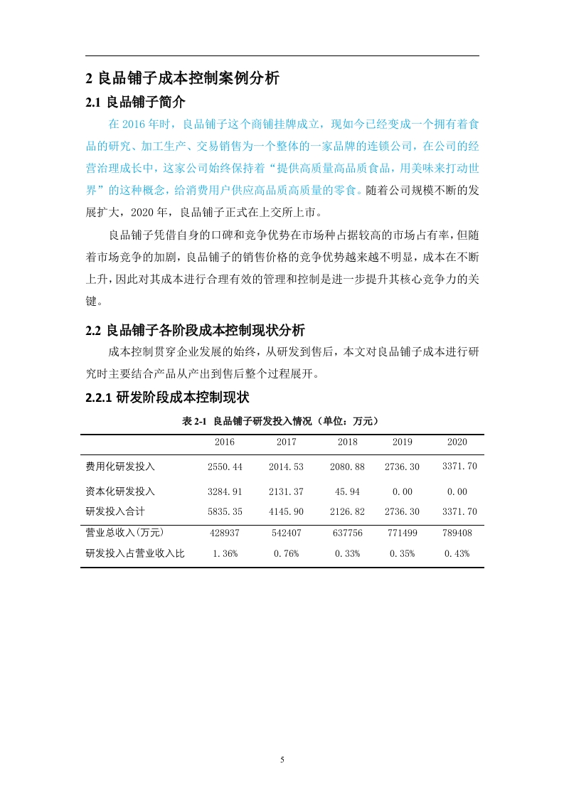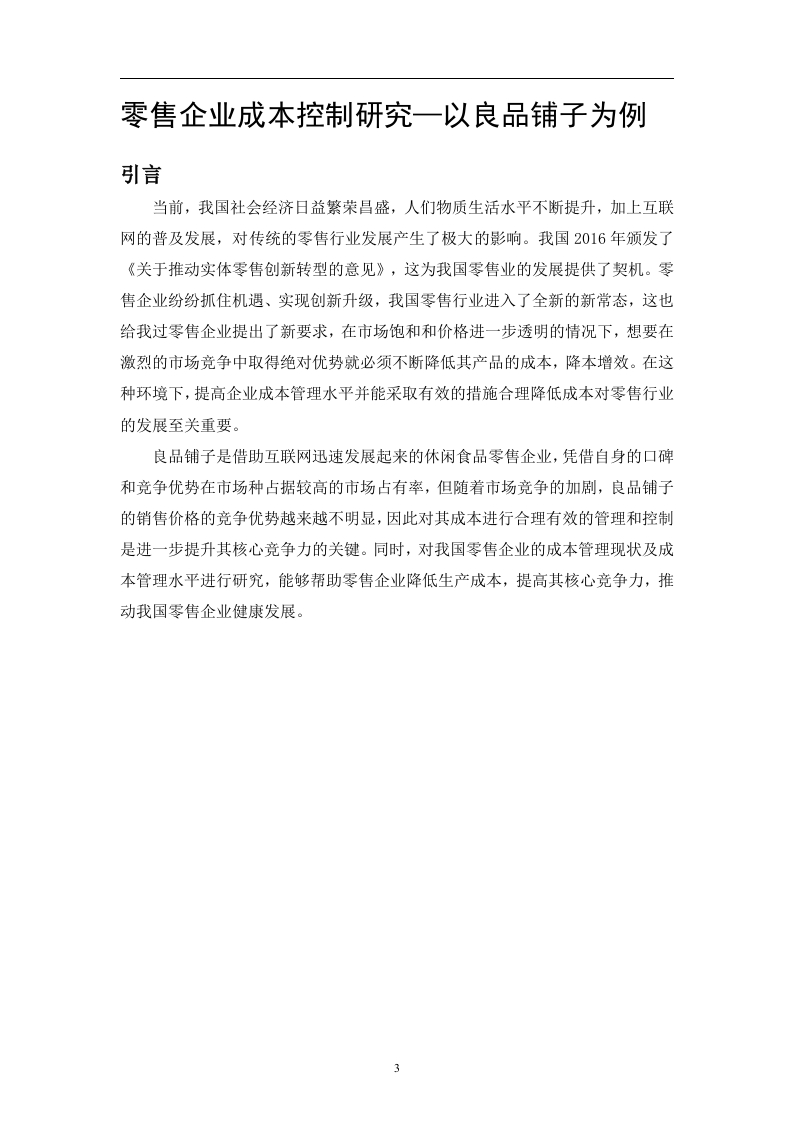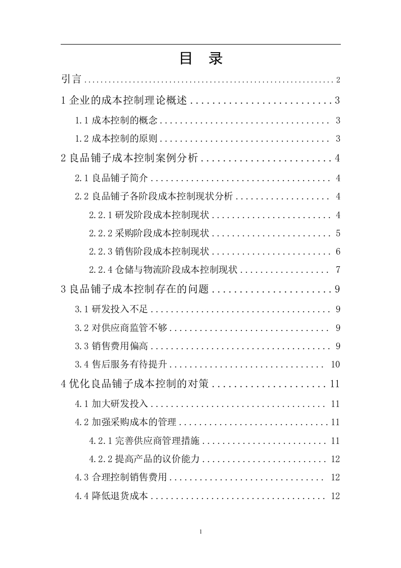 零售企业成本控制研究一以良品铺子为例摘要:随着随着我国经济的发展和人们生活水平的提高,人们的消费能力和消费水平在不断的改善,休闲食品也正以一种新的形式进入了我们的生活,这极大推动了休闲食品行业的快速发展。然而,随着市场竞争越来越激烈,休闲食品企业也进入了白热化的竞争状态,在激烈的竞争市场环境下要想取得持续发展并盈利的一个重要途径就是合理控制成本,这既是企业自身发展的需要也是经济发展过程中的一个必然的要求。本文以休闲食品企业中的良品铺子为例,结合生产成本管理的相关理论,对良品铺子的成本控制进行探究,找出其中存在的问题并提出了针对性的改进措施以期通过这些措施为良品铺子成本控制提供一定的借鉴,提高其竞争力。关键词:成本控制:零售企业:良品铺子目录引言…21企业的成本控制理论概述....1.1成本控制的概念..31.2成本控制的原则...32良品铺子成本控制案例分析..·.42.1良品铺子简介...42.2良品铺子各阶段成本控制现状分析..42.2.1研发阶段成本控制现状..42.2.2采购阶段成本控制现状......52.2.3销售阶段成本控制现状..62.2.4仓储与物流阶段成本控制现状...·3良品铺子成本控制存在的问题.......93.1研发投入不足...93.2对供应商监管不够...o3.3销售费用偏高...93.4售后服务有待提升............104优化良品铺子成本控制的对策114.1加大研发投入........114.2加强采购成本的管理.....114.2.1完善供应商管理措施114.2.2提高产品的议价能力124.3合理控制销售费用......124.4降低退货成本....124.4.1提高售后服务质量....124.4.2定期对售后信息进行反馈........13结束语.14参考文献15致谢............162零售企业成本控制研究一以良品铺子为例引言当前,我国社会经济日益繁荣昌盛,人们物质生活水平不断提升,加上互联网的普及发展,对传统的零售行业发展产生了极大的影响。我国2016年颁发了《关于推动实体零售创新转型的意见》,这为我国零售业的发展提供了契机。零售企业纷纷抓住机遇、实现创新升级,我国零售行业进入了全新的新常态,这也给我过零售企业提出了新要求,在市场饱和和价格进一步透明的情况下,想要在激烈的市场竞争中取得绝对优势就必须不断降低其产品的成本,降本增效。在这种环境下,提高企业成本管理水平并能采取有效的措施合理降低成本对零售行业的发展至关重要。良品铺子是借助互联网迅速发展起来的休闲食品零售企业,凭借自身的口碑和竞争优势在市场种占据较高的市场占有率,但随着市场竞争的加剧,良品铺子的销售价格的竞争优势越来越不明显,因此对其成本进行合理有效的管理和控制是进一步提升其核心竞争力的关键。同时,对我国零售企业的成本管理现状及成本管理水平进行研究,能够帮助零售企业降低生产成本,提高其核心竞争力,推动我国零售企业健康发展。3
