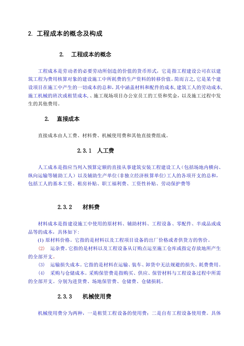 论工程成本的影响因素及控制对策目录1.绪论.4第1章工程成本的概念及构成.51.1工程成本的概念…51.2直接成本1.2.1人工费….51.2.2材料费.51.2.3机械使用费.61.2.4其他直接费.61.3间接成本.….71.3.1施工管理费.7第2章影响工程成本的因素..82.1市场因素..82.2材料因素..82.3人工费用因素82.4施工设备因素92.5管理因素..9第3章工程成本控制的对策.103.1加强材料费用的控制.103.2做好人工费用的管控工作103.3对施工设备进行科学的管理113.4改进成本控制方法结语12参考文献:.13致谢141.绪论随着我国社会的可持续发展和城市化的快速推进,建筑业进入了一个全新的时期。通过对施工项目管理的分析,发现工程质量、工期和成本是施工中比较重要的内容。因此,在项目建设过程中,通过控制建筑项目的工程造价来确保建设工期以及工程质量,满足建筑业经济发展的需要。但是,随着建设项目规模的不断扩大,随之而来的是建设工期的增加,但工期的拉长会给人工费用、设备费用、材料费用等带来不确定性,进而影响工程建设大的成本。为了保证施工项目整体经济效益的提高,必须采取有效措施降低项目成本,这是施工企业在新时期激烈的竞争中取得优势的最有效途径,进而推动建筑施工公司的可持续发展。基于此,本文着重分析、研究建设项目成本控制的影响因素以及对策。2.工程成本的概念及构成2.工程成本的概念工程成本是劳动者的必要劳动所创造的价值的货币形式,它是指工程建设公司在以建筑工程为费用核算对象的建设施工中所耗费的生产资料的转移价值。简而言之,它是某个建设项目在施工中产生的一切成本的总和,其中涵盖材料和配件的成本,建筑工人的劳动成本,施工机械的班次或租赁成本,、施工现场项目办公室员工的工资和奖金,以及施工过程中发生的其他费用。2.直接成本直接成本由人工费、材料费、机械使用费和其他直接费组成。2.3.1人工费人工成本是指应当列入预算定额的直接从事建筑安装工程建设工人(包括场地内横向、纵向运输等辅助工人)以及辅助生产单位(非独立经济核算单位)工人的各项开支的总和,包括工人的基本工资、租房补贴、职工福利费、工资性补贴、劳动保护费等2.3.2材料费材料成本是指建设施工中使用的原材料、辅助材料、工程设备、零配件、半成品或成品等的成本,具体如下:(1)原材料价格。它指的是材料以及工程项目设备的出厂价格或者供货方的售价。(2)运杂费。它指的是材料以及工程设备从订购点运至施工仓库或指定存放地所产生的全部开支。(3)运输损失成本。它指的是材料在运输、装车、卸货中无法规避的损失、耗费费用。(4)采购与仓储成本。采购保管费是指购买、供应、保管材料与工程设备过程中所需的全部开支。分别为进货费、场地保管费、仓储费、仓储损耗。2.3.3机械使用费机械使用费分为两种,一是租赁工程设备的使用费:二是自有工程设备使用费。具体涵盖有折旧与维护费、更换设备工具及配件费、安装拆解费、大修理费、操作人员的基本工资与奖金、动力燃油费、施工设备的养路费、仪器设备使用费等。主要内容有:(1)折旧及维修费用:是指机器计提的折旧基金、大修理基金以及定期修理方面的开支。(2)大修理费用:是指根据规定的大修周期,对施工设备开展必要的大修从而维持其正常功能所需的开支。(3)替换工具、配件费:是指设备使用的更换工具以及配件的分摊费用以及维护成本。(4)安装和拆除费用:是指施工设备(不包括大型设备)在施工地点装卸所需的全部费用,包括人工、材料、设备调试费用,以及机械辅助设施的折旧、安装、拆掉等方面的成本。(5)工资:指机械操作工人的基本工资。(6)燃料及动力费:指机械消耗的燃料、动力成本。(7)运输装卸费:指从项目施工地运出并在项目施工地中挪动设备的运输、安装与调试费。(8)辅助设施费:指为更好地运用施工设备而建造的辅助性设施所产生的开支。(9)养路费:指运输机械设备所要缴纳的养路费以及牌照税。(10)仪器仪表使用费:指的是项目建设过程中使用到的仪器设备的分摊下来的费用以及维修保养成本。2.3.4其他直接费其他直接费是指超出预算定额的项目施工过程中所产生的属于项目直接成本属性的其他开支。具体涵盖如下:(1)冬雨季施工增加成本:指冬、雨季建设施工过程中增添的临时设施、防滑、雨雪清除、人力与建设施工设备工作效率下降的成本。(2)夜间施工增加成本:是指由于工地夜间工作而产生的夜班补贴费、夜间工作效率下降、照明设施摊销、照明用电等方面的成本。(3)生产工具、用具使用费:指工程建设过程中所需的非固定资产的生产设备、检测设备和仪器仪表的采购、摊销、维护费,以及付给建筑工人自带工具的补贴费用。(4)研究试验费用:指的是给建设项目设计与验证设计参数、数据、信息等开展的必需的试验成本和设计规定在在建设过程中一定要开展的试验、验证所产生的费用,包括自行或委托其他部门研究和测试所产生的人工成本、检测设施和仪器的使用成本、材料成本等。(⑤)项目定位、重测、场地清理等开支。(6)异地施工增加成本:指发生在远离基地建设的工作人员的差旅费、工人在途工资、中、周转材料、小型施工设备、工具设备、办公用品、生活用品等的运输费用。