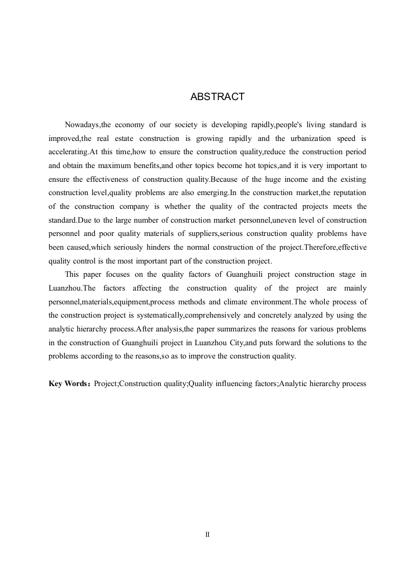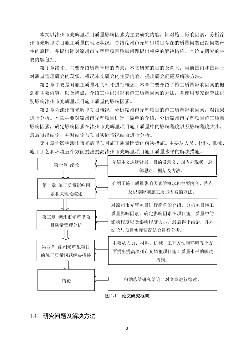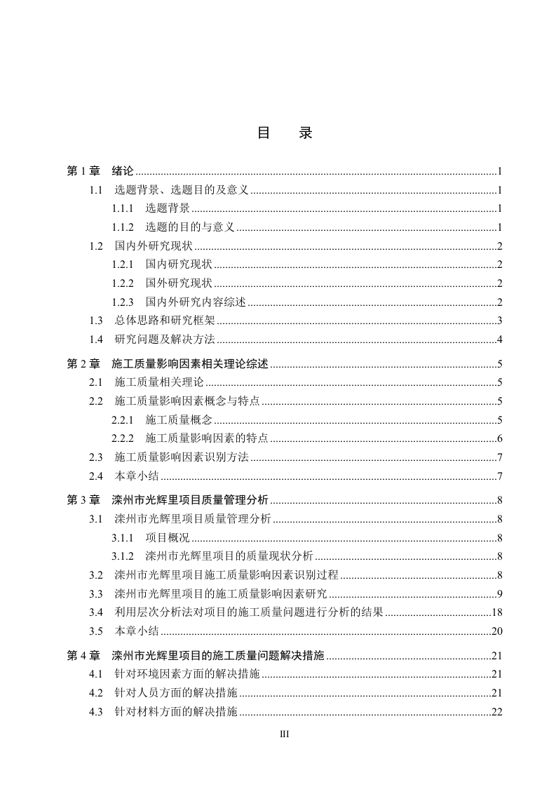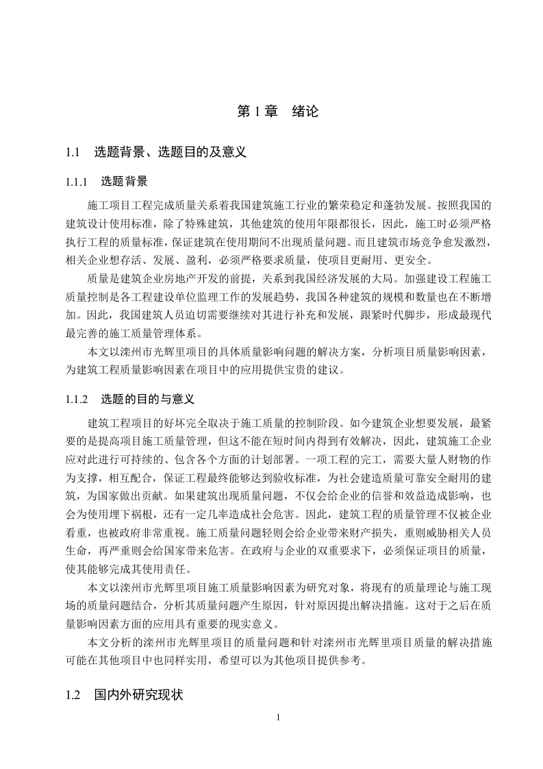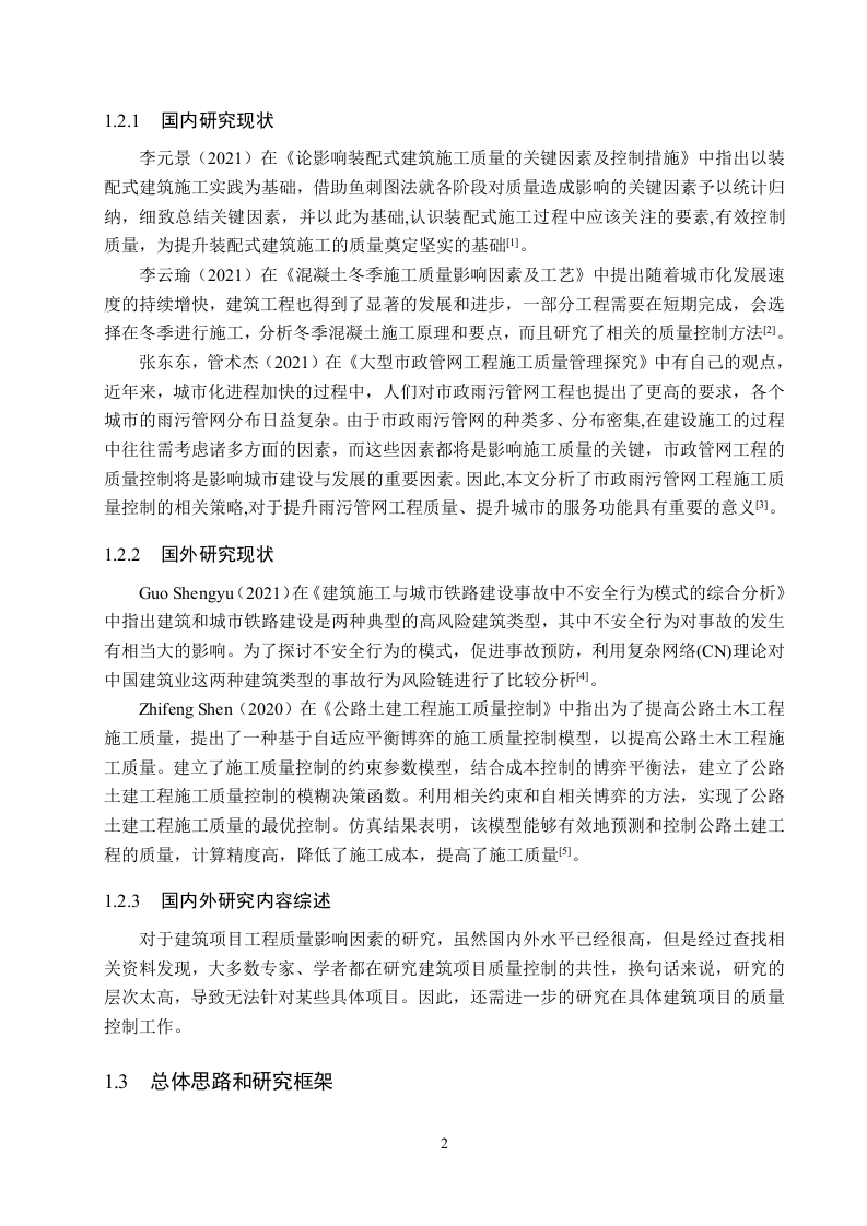 滦州光辉里项目施工质量影响因素讲究摘要当今社会的经济加速发展,人们的生活水平提高,房地产建设的快速增长,城市化速度不断加快。这个时候,如何保证施工质量的同时、减少工期并获得最大收益等话题成为热点,保证施工质量的有效性显得非常重要。因为巨大收益和现有施工水平,质量问题也层出不穷。在如今建筑市场上,建筑公司承包项目质量是否达标关系其名誉。由于建筑市场人员变得较大、施工人员能力层次不齐,以及供应商的劣质材料等原因,造成了严重的施工质量问题,严重阻碍了项目正常施工。因此,对施工项目采取有效的质量控制是重中之重。本文重点研究了滦州市光辉里项目施工阶段的质量影响因素。影响项目施工质量的因素主要有人员、材料、设备、工艺方法、气候环境五个方面,使用学过的层次分析法结合该项目实际情况,对该施工项目的全过程进行系统的、全面的、具体的分析。经过分析,总结出滦州市光辉里项目施工过程中存在的各种问题的原因,并根据原因提出所面对问题的解决措施,使施工质量得到改善。关键词:项目:施工质量:影响因素:层次分析法ABSTRACTNowadays,the economy of our society is developing rapidly,people's living standard isimproved,the real estate construction is growing rapidly and the urbanization speed isaccelerating.At this time,how to ensure the construction quality,reduce the construction periodand obtain the maximum benefits,and other topics become hot topics,and it is very important toensure the effectiveness of construction quality.Because of the huge income and the existingconstruction level,quality problems are also emerging.In the construction market,the reputationof the construction company is whether the quality of the contracted projects meets thestandard.Due to the large number of construction market personnel,uneven level of constructionpersonnel and poor quality materials of suppliers,serious construction quality problems havebeen caused,which seriously hinders the normal construction of the project.Therefore,effectivequality control is the most important part of the construction project.This paper focuses on the quality factors of Guanghuili project construction stage inLuanzhou.The factors affecting the construction quality of the project are mainlypersonnel,materials,equipment,process methods and climate environment.The whole process ofthe construction project is systematically,comprehensively and concretely analyzed by using theanalytic hierarchy process.After analysis,the paper summarizes the reasons for various problemsin the construction of Guanghuili project in Luanzhou City,and puts forward the solutions to theproblems according to the reasons,so as to improve the construction quality.Key Words:Project;Construction quality;Quality influencing factors;Analytic hierarchy process0目录第1章绪论…1.1选题背景、选题目的及意义1.1.1选题背景1.1.2选题的目的与意义1.2国内外研究现状…。.21.2.1国内研究现状..21.2.2国外研究现状21.2.3国内外研究内容综述21.3总体思路和研究框架….31.4研究问题及解决方法.4第2章施工质量影响因素相关理论综述52.1施工质量相关理论….52.2施工质量影响因素概念与特点.52.2.1施工质量概念…52.2.2施工质量影响因素的特点.62.3施工质量影响因素识别方法72.4本章小结.…7第3章滦州市光辉里项目质量管理分析83.1滦州市光辉里项目质量管理分析.8.1项目况.…………3.1.2滦州市光辉里项日的质量现状分析.83.2滦州市光辉里项目施工质量影响因素识别过程.83.3滦州市光辉里项目的施工质量影响因素研究93.4利用层次分析法对项目的施工质量问题进行分析的结果183.5本章小结.20第4章滦州市光辉里项目的施工质量问题解决措施4.1针对环境因素方面的解决措施…214.2针对人员方面的解决措施…2l4.3针对材料方面的解决措施224.4针对设备方面的解决措施.224.5针对工艺方法方面的解决措施234.6本t小结.…23结论24参考文献….25致谢….26V