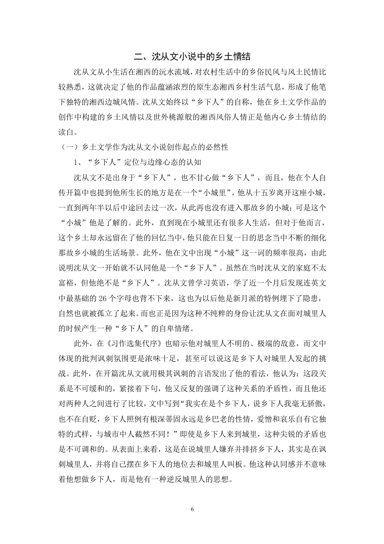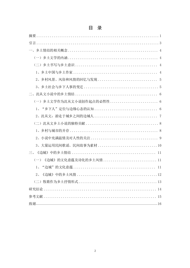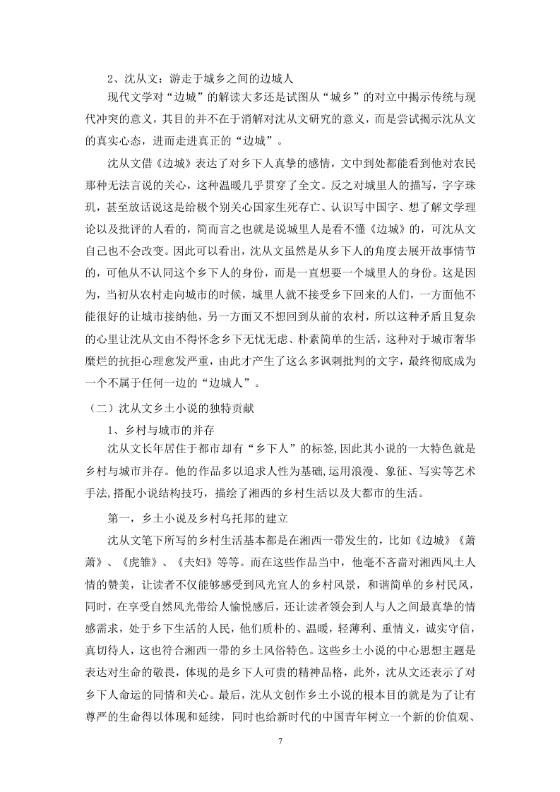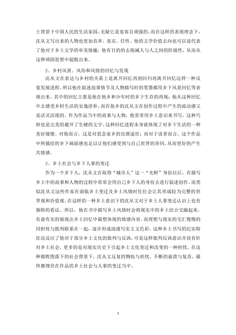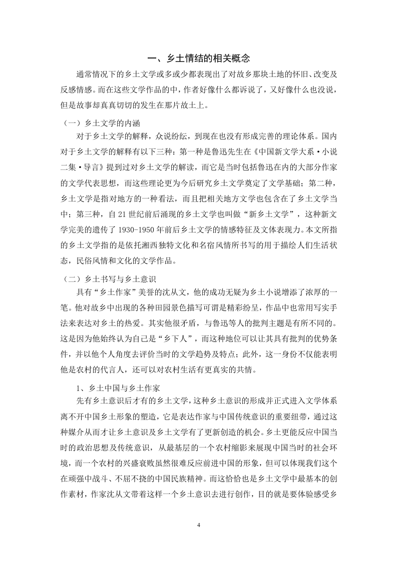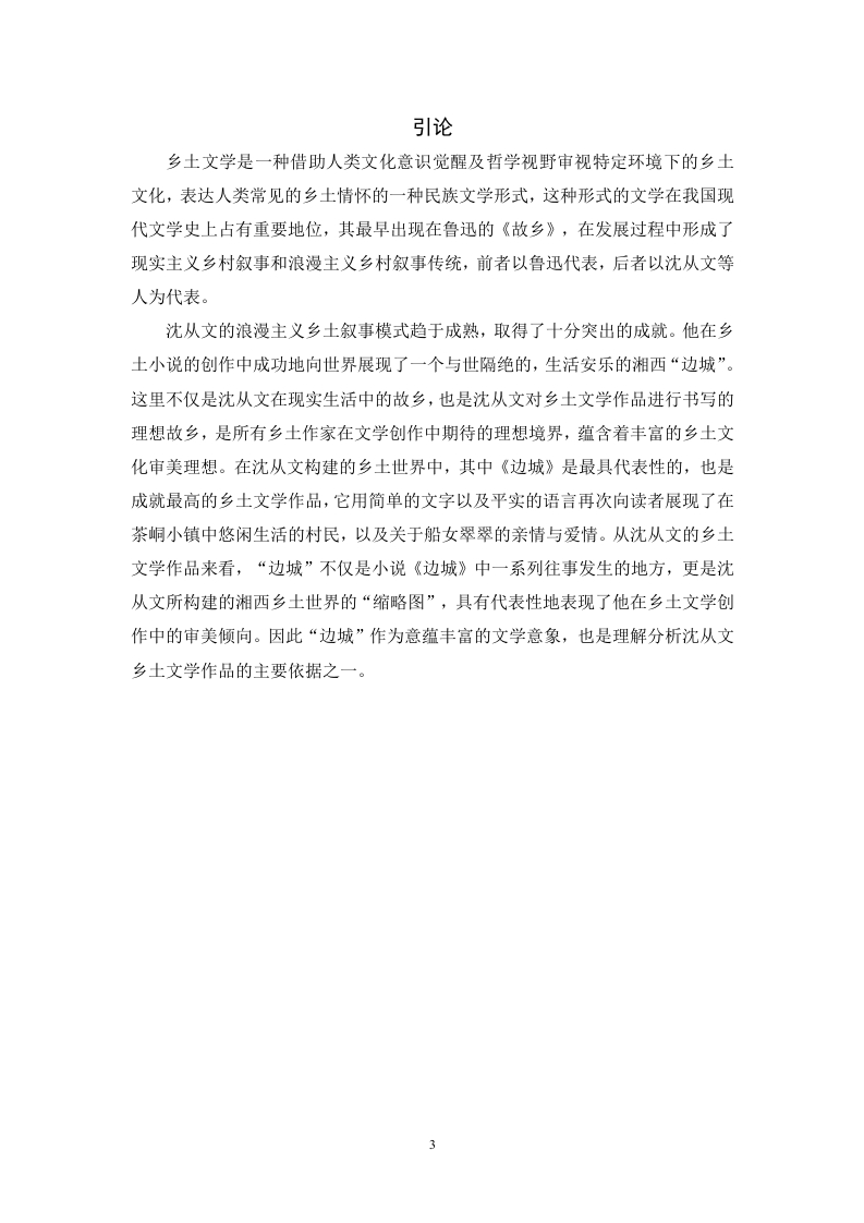 论沈从文小说《边城》中的乡土情结摘要沈从文的《边城》将创作的重心聚焦在对人性的研究上,在乡土文学的发展史中具有重要的地位。《边城》以“乡下人”视角,用兼具小品文和抒情诗的手法勾勒出一幅湘西人民的原始自然生活图景,以翠翠的爱情故事为主线,邻里和睦友爱的生活琐事为次线,从风俗美、风景美、人性美三个角度展现了湘西地区的生活形态,寄托了沈从文的乡土情结。“边城”意象是沈从文文学世界的缩影,在沈从文文学中占有重要的地位,具有地理、文化等多层意蕴。作者用充满诗情画意的语言文字描绘了湘西独特的风土人情,是诗意与神韵的结合,完成了传说与幻想、历史与现实相互融合的“边城”诗意。本文结合乡土文学的相关理论,从沈从文文学作品中总结沈从文的乡土情结,结合对沈从文的介绍以及其对乡土文学的贡献,以其典型的代表作《边城》为例,对《边城》所表达的文化意蕴及其体现的乡土情结进行总结,一次来读懂沈从文,读懂他所倡导自然的人性观以及其构建的引人神往的湘西乡土世界。关键词:边城:乡土情结:人性美:沈从文1目录摘要.…引言…一、乡土情结的相关概念..(一)乡土文学的内涵....4(二)乡土书写与乡土意识.....1、乡土中国与乡土作家..42、乡村风景、风俗和风情的回忆与发现.53、乡土社会与乡下人事的变迁...…5二、沈从文小说中的乡土情结.6(一)乡土文学作为沈从文小说创作起点的必然性..61、“乡下人”定位与边缘心态的认知......62、沈从文:游走于城乡之间的边城人.…7(二)沈从文乡土小说的独特贡献..1、乡村与城市的并存..…·82、小说中充满温情及对人性的关注93、大量运用民间歌谣、民间故事为素材.....10三、《边城》中的乡土情结.11(一)《边城》的文化意蕴及诗化的乡土风情.............111、“边城”的文化意蕴.……112、《边城》中的乡土风情....….12(二)牧歌作为乡土抒情形式。。.13研究结论....….14参考文献……15致谢.162引论乡土文学是一种借助人类文化意识觉醒及哲学视野审视特定环境下的乡土文化,表达人类常见的乡土情怀的一种民族文学形式,这种形式的文学在我国现代文学史上占有重要地位,其最早出现在鲁迅的《故乡》,在发展过程中形成了现实主义乡村叙事和浪漫主义乡村叙事传统,前者以鲁迅代表,后者以沈从文等人为代表。沈从文的浪漫主义乡土叙事模式趋于成熟,取得了十分突出的成就。他在乡土小说的创作中成功地向世界展现了一个与世隔绝的,生活安乐的湘西“边城”。这里不仅是沈从文在现实生活中的故乡,也是沈从文对乡土文学作品进行书写的理想故乡,是所有乡土作家在文学创作中期待的理想境界,蕴含着丰富的乡土文化审美理想。在沈从文构建的乡土世界中,其中《边城》是最具代表性的,也是成就最高的乡土文学作品,它用简单的文字以及平实的语言再次向读者展现了在茶峒小镇中悠闲生活的村民,以及关于船女翠翠的亲情与爱情。从沈从文的乡土文学作品来看,“边城”不仅是小说《边城》中一系列往事发生的地方,更是沈从文所构建的湘西乡土世界的“缩略图”,具有代表性地表现了他在乡土文学创作中的审美倾向。因此“边城”作为意蕴丰富的文学意象,也是理解分析沈从文乡土文学作品的主要依据之一。3一、乡土情结的相关概念通常情况下的乡土文学或多或少都表现出了对故乡那块土地的怀旧、改变及反感情感。而在这些文学作品的中,作者好像什么都诉说了,又好像什么也没说,但是故事却真真切切的发生在那片故土上。(一)乡土文学的内涵对于乡土文学的解释,众说纷纭,到现在也没有形成完善的理论体系。国内对于乡土文学的解释有以下三种:第一种是鲁迅先生在《中国新文学大系·小说二集·导言》提到过对乡土文学的解读,而它是当时包括鲁迅在内的大部分作家的文学代表思想,而这些理论更为今后研究乡土文学奠定了文学基础:第二种,乡土文学是指对地方的一种看法,而且把相关地方文学也包含在了乡土文学当中:第三种,自21世纪前后涌现的乡土文学也叫做“新乡土文学”,这种新文学完美的遗传了19301950年前后乡土文学的情感特征及文体表现力。本文所指的乡土文学指的是依托湘西独特文化和名宿风情所书写的用于描绘人们生活状态,民俗风情和文化的文学作品。(二)乡土书写与乡土意识具有“乡土作家”美誉的沈从文,他的成功无疑为乡土小说增添了浓厚的一笔。他对故乡中出现的各种田园景色描写可谓是精彩纷呈,作品中也常用写实手法来表达对乡土的热爱。其实他很矛盾,与鲁迅等人的批判主题是有所不同的。这是因为他始终认为自己是“乡下人”,而这种地位可以让其具有批判的优势条件,并以他个人角度去评价当时的文学趋势及特点;此外,这一身份不仅能表明他是农村的代言人,还可以对农村生活有更真实的共情。1、乡土中国与乡土作家先有乡土意识后才有的乡土文学,这种乡土意识的形成并正式进入文学体系离不开中国乡土形象的塑造,它是表达作家与中国传统意识的重要纽带,通过这种媒介从而才让乡土意识及乡土文学有了更新创造的机会。乡土更能反应中国当时的政治思想及传统意识,从最基层的一个农村缩影来展现中国当时的社会环境,而一个农村的兴盛衰败虽然很难反应前进中国的形象,但可以体现我
