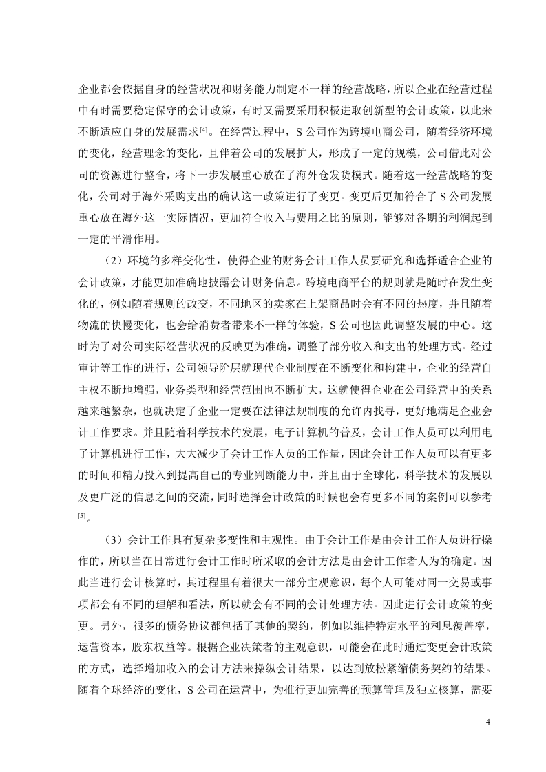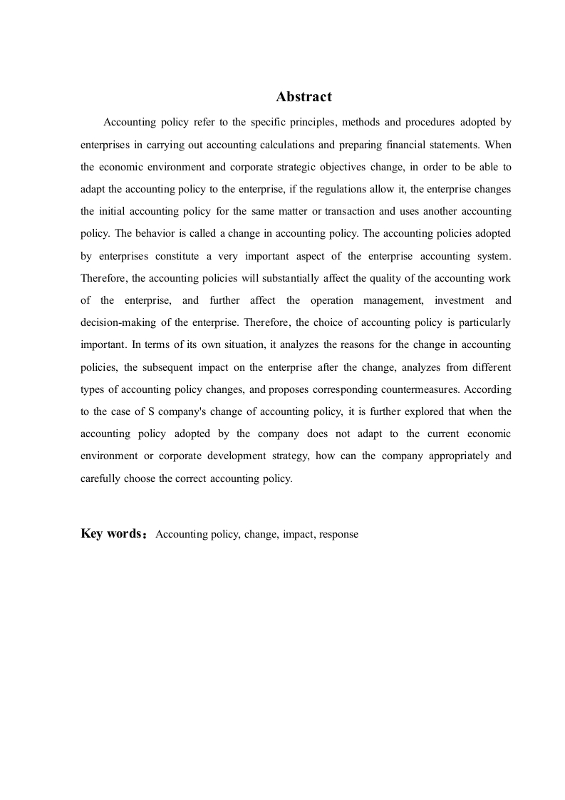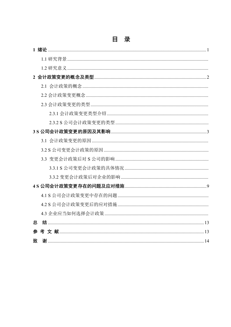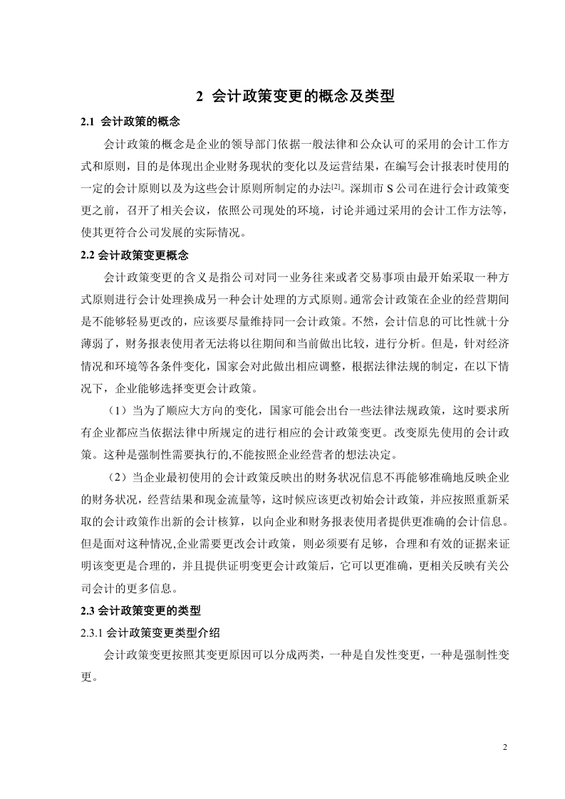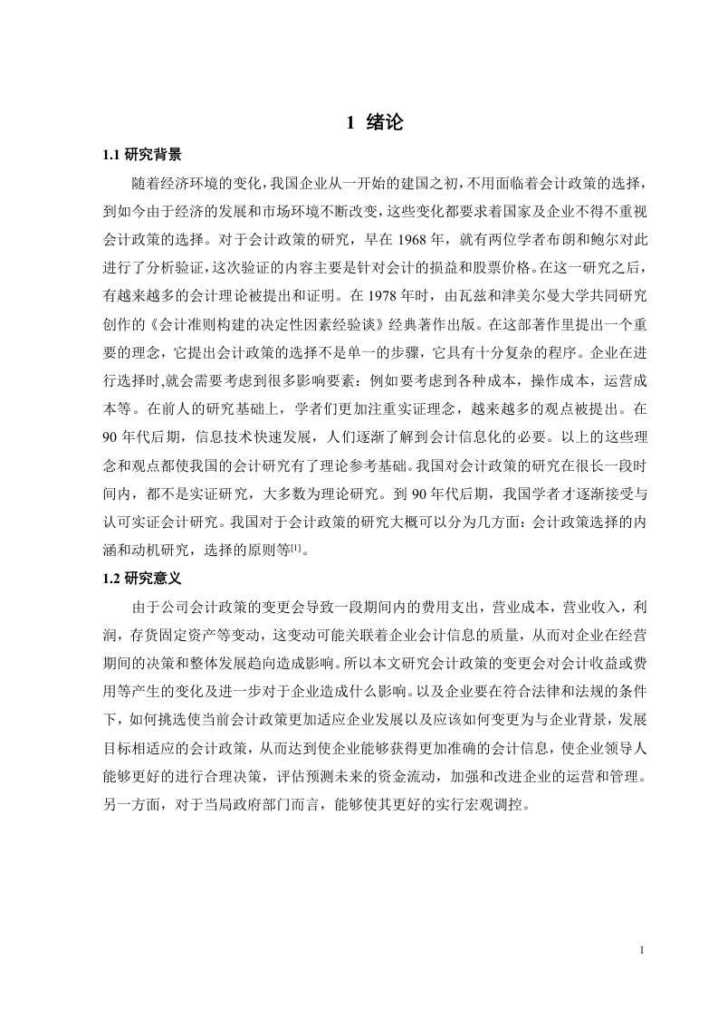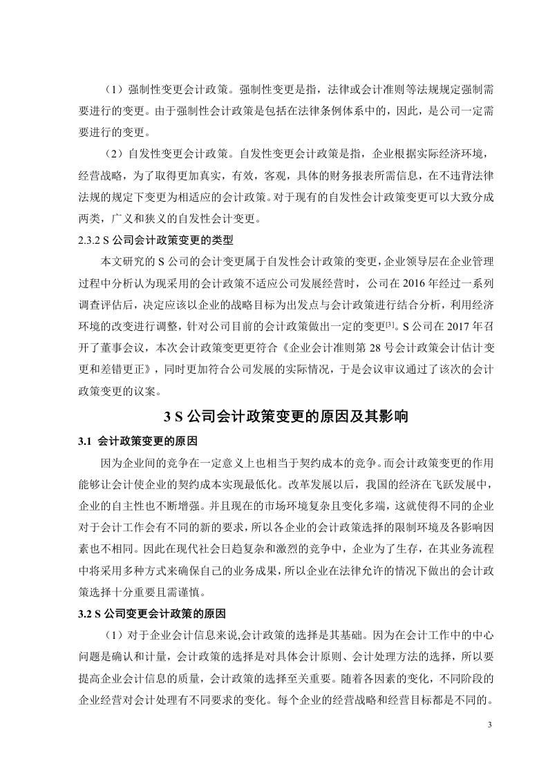 论会计政策变更的选择及对企业的影响以S公司为例摘要会计政策是指企业在进行会计工作时采用的具体的原则、方法和程序。随着经济环境和企业战略目标的变化,为了能够让会计政策适应企业,在法律法规允许的情况下,企业对于相同的交易事项,改变原有的会计政策,使用另一会计政策,该行为被称为会计政策变更。企业采用的会计政策是构成企业会计制度的一个十分重要的方面,所以会计政策在很大程度上会影响到企业会计工作的质量,从而进一步也会影响到企业的运营管理,投资和决策。因此企业在选择会计政策时需要十分谨慎。本篇论文从外部环境和企业本身情况等方面,分析了会计政策变更的原因,变更后对企业的后续影响,从不同类型的会计政策变更进行分析,提出相应的应对措施。再根据S公司的变更会计政策的案例进一步探究,在企业采用的会计政策不适应当前经济环境或企业发展战略时,企业要如何谨慎地正确的选择会计政策。关键词:会计政策,变更,影响,应对举措AbstractAccounting policy refer to the specific principles,methods and procedures adopted byenterprises in carrying out accounting calculations and preparing financial statements.Whenthe economic environment and corporate strategic objectives change,in order to be able toadapt the accounting policy to the enterprise,if the regulations allow it,the enterprise changesthe initial accounting policy for the same matter or transaction and uses another accountingpolicy.The behavior is called a change in accounting policy.The accounting policies adoptedby enterprises constitute a very important aspect of the enterprise accounting system.Therefore,the accounting policies will substantially affect the quality of the accounting workof the enterprise,and further affect the operation management,investment anddecision-making of the enterprise.Therefore,the choice of accounting policy is particularlyimportant.In terms of its own situation,it analyzes the reasons for the change in accountingpolicies,the subsequent impact on the enterprise after the change,analyzes from differenttypes of accounting policy changes,and proposes corresponding countermeasures.Accordingto the case of S company's change of accounting policy,it is further explored that when theaccounting policy adopted by the company does not adapt to the current economicenvironment or corporate development strategy,how can the company appropriately andcarefully choose the correct accounting policy.Key words:Accounting policy,change,impact,response目录1绪论1.1研究背景.1.2研究意义…2会计政策变更的概念及类型.22.1会计政策的概念…2.2会计政策变更概念…2.3会计政策变更的类型.2.3.1会计政策变更类型介绍2.3.2S公司会计政策变更的类型3$公司会计政策变更的原因及其影响.33.1会计政策变更的原因3.2S公司变更会计政策的原因…3.3变更会计政策后对S公司的影响.…3.3.1S公司变更会计政策的具体情况3.3.2变更会计政策后对企业的影响4$公司会计政策变更存在的问题及应对措施..94.1S公司会计政策变更中存在的问题.…4.2S公司会计政策变更后的应对措施4.3企业应当如何选择会计政策总结.13参考文献….13致谢.141绪论1.1研究背景随着经济环境的变化,我国企业从一开始的建国之初,不用面临着会计政策的选择,到如今由于经济的发展和市场环境不断改变,这些变化都要求着国家及企业不得不重视会计政策的选择。对于会计政策的研究,早在1968年,就有两位学者布朗和鲍尔对此进行了分析验证,这次验证的内容主要是针对会计的损益和股票价格。在这一研究之后,有越来越多的会计理论被提出和证明。在1978年时,由瓦兹和津美尔曼大学共同研究创作的《会计准则构建的决定性因素经验谈》经典著作出版。在这部著作里提出一个重要的理念,它提出会计政策的选择不是单一的步骤,它具有十分复杂的程序。企业在进行选择时,就会需要考虑到很多影响要素:例如要考虑到各种成本,操作成本,运营成本等。在前人的研究基础上,学者们更加注重实证理念,越来越多的观点被提出。在90年代后期,信息技术快速发展,人们逐渐了解到会计信息化的必要。以上的这些理念和观点都使我国的会计研究有了理论参考基础。我国对会计政策的研究在很长一段时间内,都不是实证研究,大多数为理论研究。到90年代后期,我国学者才逐渐接受与认可实证会计研究。我国对于会计政策的研究大概可以分为几方面:会计政策选择的内涵和动机研究,选择的原则等山。1.2研究意义由于公司会计政策的变更会导致一段期间内的费用支出,营业成本,营业收入,利润,存货固定资产等变动,这变动可能关联着企业会计信息的质量,从而对企业在经营期间的决策和整体发展趋向造成影响。所以本文研究会计政策的变更会对会计收益或费用等产生的变化及进一步对于企业造成什么影响。以及企业要在符合法律和法规的条件下,如何挑选使当前会计政策更加适应企业发展以及应该如何变更为与企业背景,发展目标相适应的会计政策,从而达到使企业能够获得更加准确的会计信息,使企业领导人能够更好的进行合理决策,评估预测未来的资金流动,加强和改进企