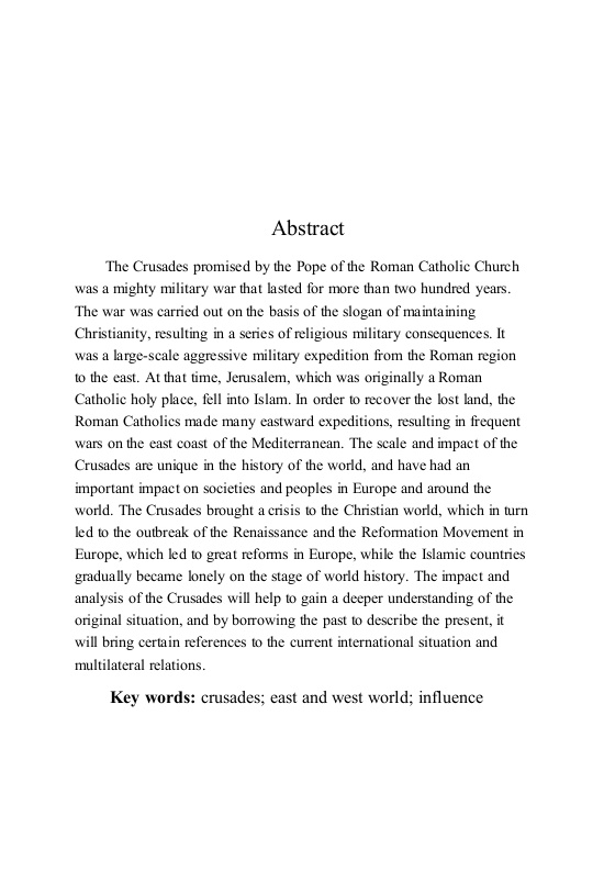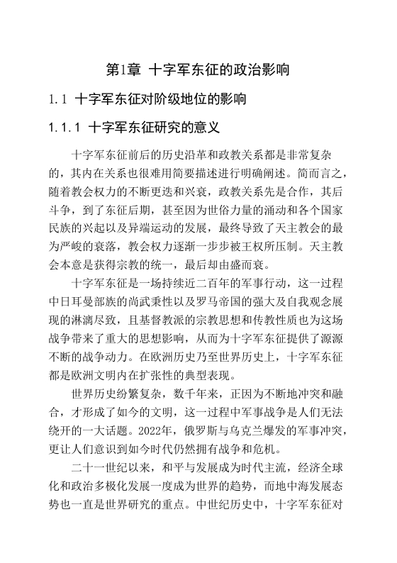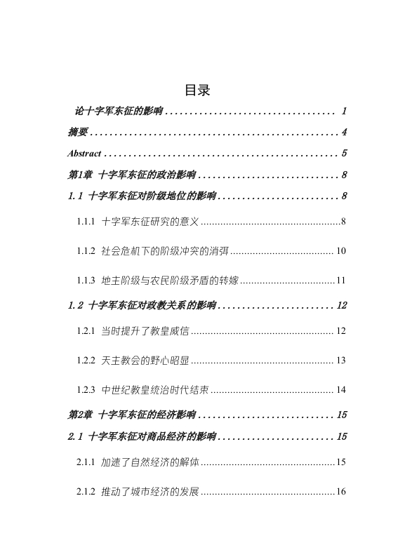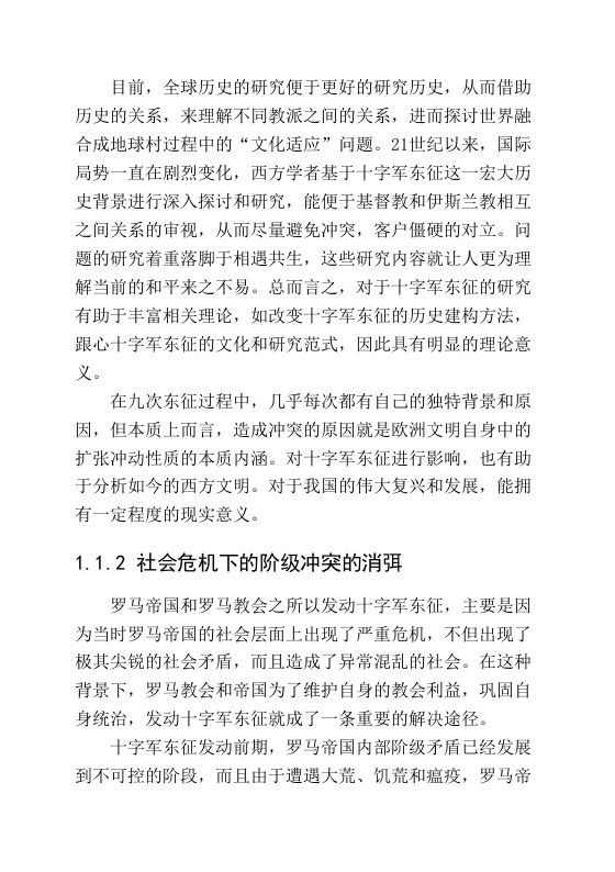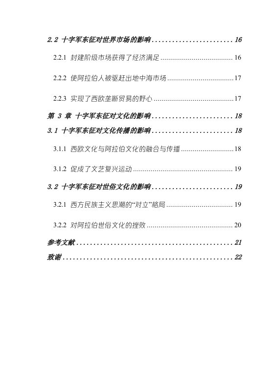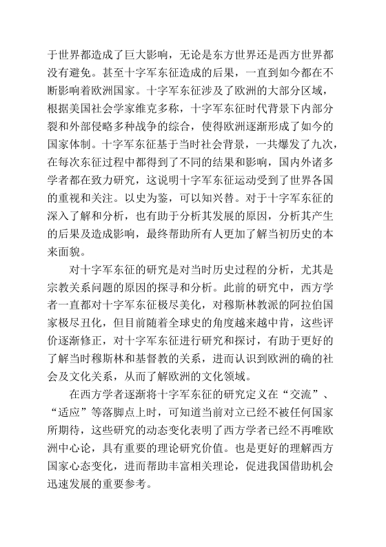 论十字军东征的影响摘要罗马天主教教皇允诺下的十字军东征过程是一场持续二百余年,浩浩荡荡的军事战争。该场战争基于维护基督教的口号进行,造成了一系列的宗教性军事后果,是罗马地区向东部进行了大型侵略性远征军事活动。彼时原属于罗马天主教圣地的耶路撒冷沦丧落入伊斯兰教,为收复失地,罗马天主教多次东征,致使地中海东岸地区遭受频繁战火。十字军东征的规模和影响在世界历史上都是绝无仅有的,对于欧洲地区乃至全球各地的社会和人民都造成了重要的影响。十字军东征使得基督教世界出现了危机,进而导致了欧洲迸发出文艺复兴和宗教改革运动,引发了欧洲的改革巨变,而伊斯兰教国家却逐渐落寞于世界历史舞台。对十字军东征进行影响和分析,有助于更深刻的了解当初局势,并借古喻今,为如今的国际形势和多边关系带来一定的参考。关键词:十字军东征:东西方世界:影响AbstractThe Crusades promised by the Pope of the Roman Catholic Churchwas a mighty military war that lasted for more than two hundred years.The war was carried out on the basis of the slogan of maintainingChristianity,resulting in a series of religious military consequences.Itwas a large-scale aggressive military expedition from the Roman regionto the east.At that time,Jerusalem,which was originally a RomanCatholic holy place,fell into Islam.In order to recover the lost land,theRoman Catholics made many eastward expeditions,resulting in frequentwars on the east coast of the Mediterranean.The scale and impact of theCrusades are unique in the history of the world,and have had animportant impact on societies and peoples in Europe and around theworld.The Crusades brought a crisis to the Christian world,which in turnled to the outbreak of the Renaissance and the Reformation Movement inEurope,which led to great reforms in Europe,while the Islamic countriesgradually became lonely on the stage of world history.The impact andanalysis of the Crusades will help to gain a deeper understanding of theoriginal situation,and by borrowing the past to describe the present,itwill bring certain references to the current international situation andmultilateral relations.Key words:crusades;east and west world;influence目录论十字军东征的影响..…摘要.…g。.......。4Abstract.…··。g ......g5第1章十字军东征的政治影响..1.1十字军东征对阶级地位的影响.........81.11十字军东征研究的意义81.12社会危机下的阶级冲突的消弭…101.13地主阶级与农民阶级矛盾的转嫁111.2十字军东征对政散关系的影响...…1212.1当时提升了教皇威信.…。1212.2天主教会的野心昭显.…13123中世纪教皇统治时代结束.…14第2章十字军东征的经济影响..….....152.1十字军东征对商品经济的影响..152.11加速了自然经济的解体…152.1.2推动了城市经济的发展162.2十字军东征对世界市场的影响....…162.2.1封建阶级市场获得了经济满足…1622.2使阿拉伯人被驱赶出地中海市场..172.2.3实现了西欧垄断贸易的野心.17第3章十字军东征对文化的影响.…183.1十字军东征对文化传播的影响............183.1.1西欧文化与阿拉伯文化的融合与传播183.1.2促成了文艺复兴运动..193.2十字军东征对世俗文化的影响...1932.1西方民族主义思潮的“对立”格局…193.2.2对阿拉伯世俗文化的挫败.。20参考文献...21致谢..22