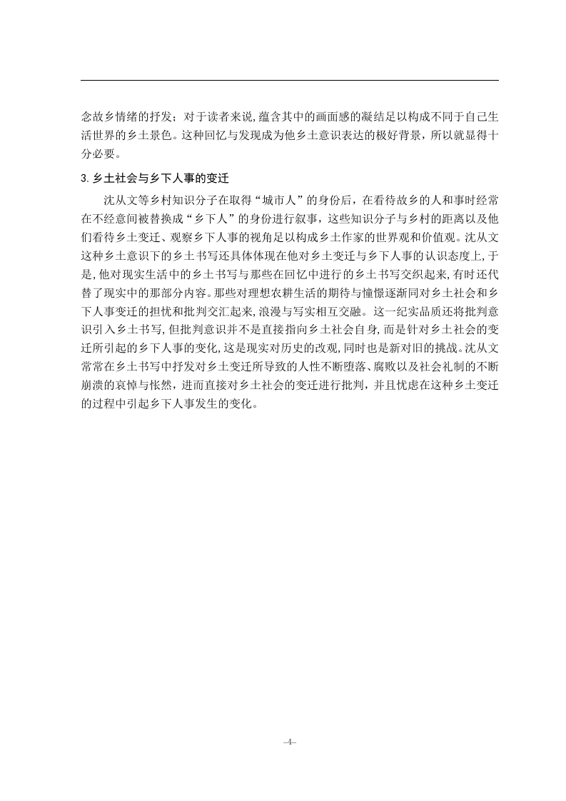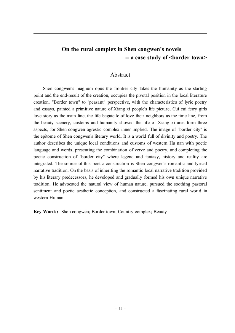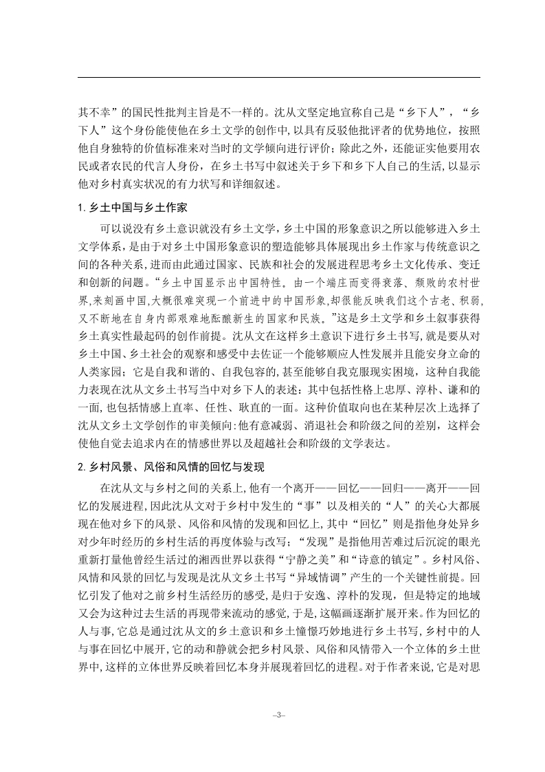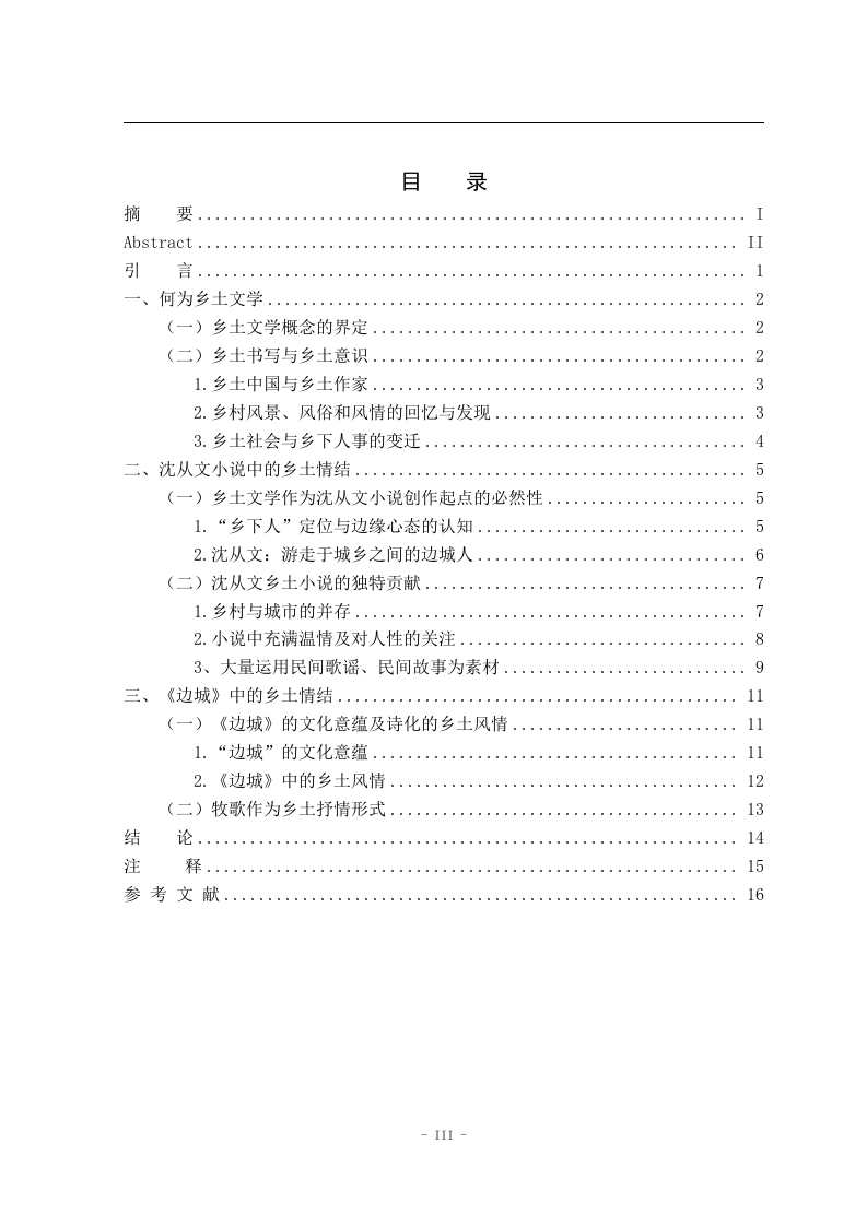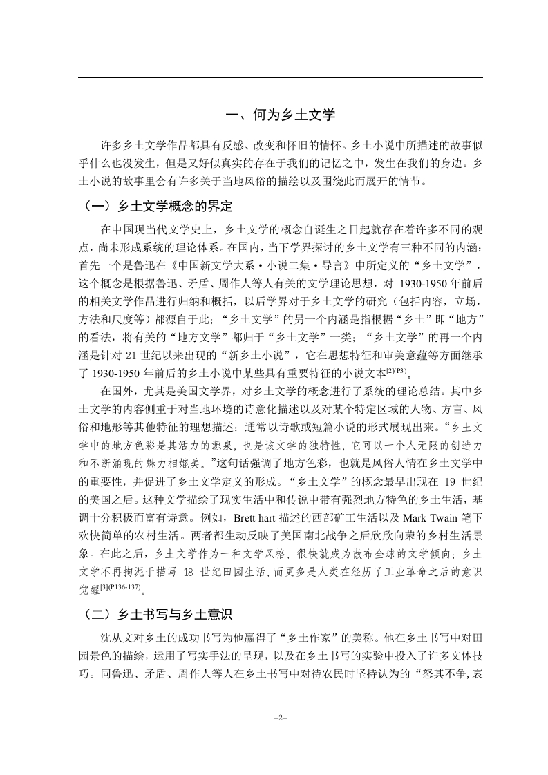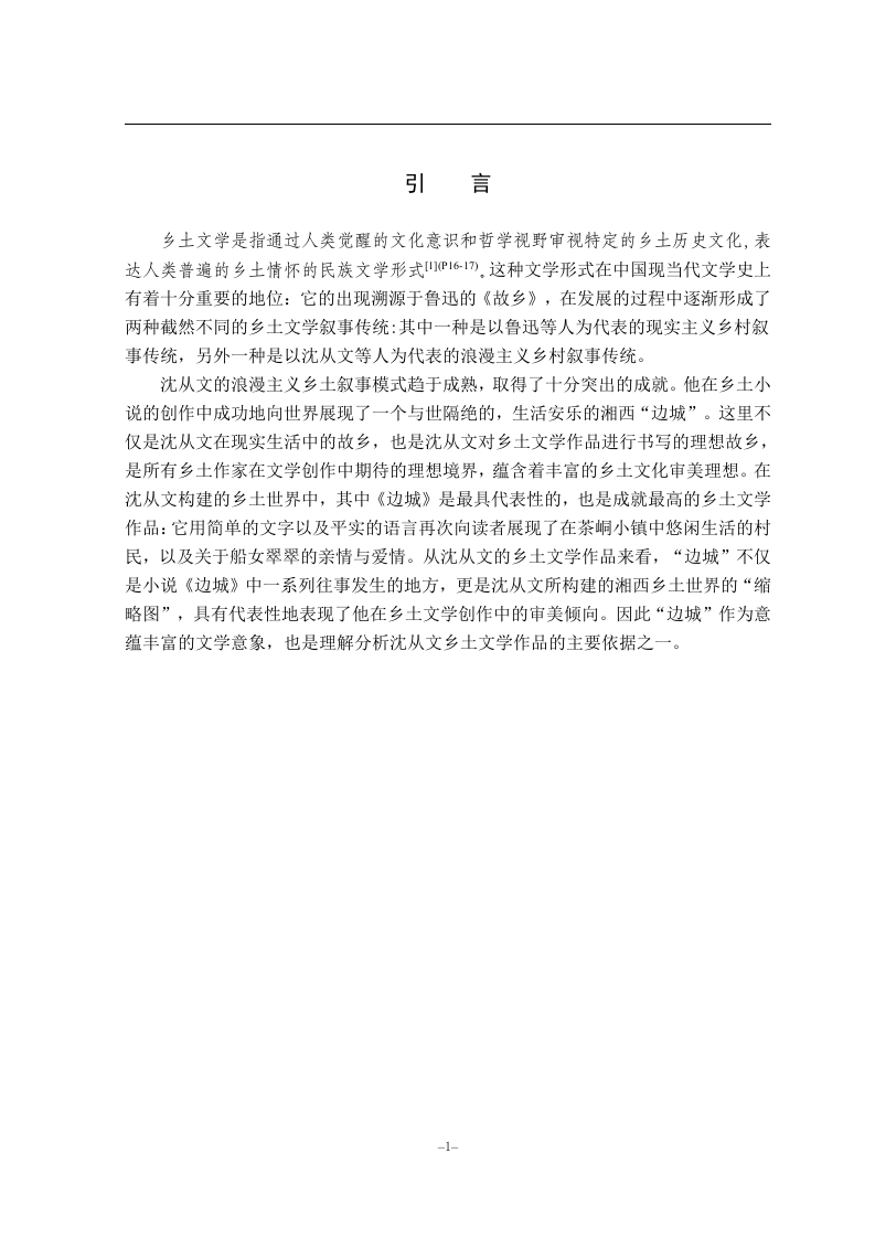论沈从文小说中的乡土情结一以《边城》为例摘要沈从文代表作小说《边城》以人性作为创作的起点和归宿,在乡土文学的创作中占据了举足轻重的地位。《边城》,以“乡下人”视角,用兼具抒情诗和小品文特点的笔触,勾勒出一幅原始自然的湘西人民的生活图景,以摆渡少女翠翠的爱情故事为主线,邻里和睦友爱的生活琐事为次线,从风景美、风俗美、人性美三个方面展现了湘西地区的生活形态,寄托了沈从文内心蕴含的乡土情结。“边城”意象是沈从文文学世界的缩影,具有地理、文化等多层意蕴。它是一个充满神性和诗意的世界,作者用充满诗意的语言文字描绘了湘西独特的风土人情,呈现出神韵与诗意的结合,完成了传说与幻想、历史与现实相互融合的“边城”诗意建构。这一诗意构建的来源是沈从文浪漫抒情的叙事传统,他在继承文学先辈们提供的浪漫主义乡土叙事传统的基础上,发展并逐渐产生形成了自己独特的叙事传统。他倡导自然的人性观,追求舒缓的田园牧歌情调以及具有诗意的审美意境,构建了一个引人神往的湘西乡土世界。关键词:沈从文;边城;乡土情结;人性美-I-On the rural complex in Shen congwen's novels-a case study of AbstractShen congwen's magnum opus the frontier city takes the humanity as the startingpoint and the end-result of the creation,occupies the pivotal position in the local literaturecreation."Border town"to "peasant"perspective,with the characteristics of lyric poetryand essays,painted a primitive nature of Xiang xi people's life picture,Cui cui ferry girlslove story as the main line,the life bagatelle of love their neighbors as the time line,fromthe beauty scenery,customs and humanity showed the life of Xiang xi area form threeaspects,for Shen congwen agrestic complex inner implied.The image of"border city"isthe epitome of Shen congwen's literary world.It is a world full of divinity and poetry.Theauthor describes the unique local conditions and customs of western Hu nan with poeticlanguage and words,presenting the combination of verve and poetry,and completing thepoetic construction of "border city"where legend and fantasy,history and reality areintegrated.The source of this poetic construction is Shen congwen's romantic and lyricalnarrative tradition.On the basis of inheriting the romantic local narrative tradition providedby his literary predecessors,he developed and gradually formed his own unique narrativetradition.He advocated the natural view of human nature,pursued the soothing pastoralsentiment and poetic aesthetic conception,and constructed a fascinating rural world inwestern Hu nan.Key Words:Shen congwen;Border town;Country complex;BeautyII-目录摘要.…Abstract..···II引言…1一、何为乡土文学..…e(一)乡土文学概念的界定....2(二)乡土书写与乡土意识......21.乡土中国与乡土作家.。32.乡村风景、风俗和风情的回忆与发现.....23.乡土社会与乡下人事的变迁......?二、沈从文小说中的乡土情结…。(一)乡土文学作为沈从文小说创作起点的必然性..51.“乡下人”定位与边缘心态的认知...…2.沈从文:游走于城乡之间的边城人.........6>(二)沈从文乡土小说的独特贡献.…·1乡村与城市的并存....72.小说中充满温情及对人性的关注...F3、大量运用民间歌谣、民间故事为素材......9三、《边城》中的乡土情结.……11(一)《边城》的文化意蕴及诗化的乡土风情.…111.“边城”的文化意蕴...112.《边城》中的乡土风情..12(二)牧歌作为乡土抒情形式..13结论…14注释...15参考文献.....…16III引言乡土文学是指通过人类觉醒的文化意识和哲学视野审视特定的乡土历史文化,表达人类普遍的乡土情怀的民族文学形式61切,这种文学形式在中国现当代文学史上有着十分重要的地位:它的出现溯源于鲁迅的《故乡》,在发展的过程中逐渐形成了两种截然不同的乡土文学叙事传统:其中一种是以鲁迅等人为代表的现实主义乡村叙事传统,另外一种是以沈从文等人为代表的浪漫主义乡村叙事传统。沈从文的浪漫主义乡土叙事模式趋于成熟,取得了十分突出的成就。他在乡土小说的创作中成功地向世界展现了一个与世隔绝的,生活安乐的湘西“边城”。这里不仅是沈从文在现实生活中的故乡,也是沈从文对乡土文学作品进行书写的理想故乡,是所有乡土作家在文学创作中期待的理想境界,蕴含着丰富的乡土文化审美理想。在沈从文构建的乡土世界中,其中《边城》是最具代表性的,也是成就最高的乡土文学作品:它用简单的文字以及平实的语言再次向读者展现了在茶峒小镇中悠闲生活的村民,以及关于船女翠翠的亲情与爱情。从沈从文的乡土文学作品来看,“边城”不仅是小说《边城》中一系列往事发生的地方,更是沈从文所构建的湘西乡土世界的“缩略图”,具有代表性地表现了他在乡土文学创作中的审美倾向。因此“边城”作为意蕴丰富的文学意象,也是理解分析沈从文乡土文学作品的主要依据之一。1