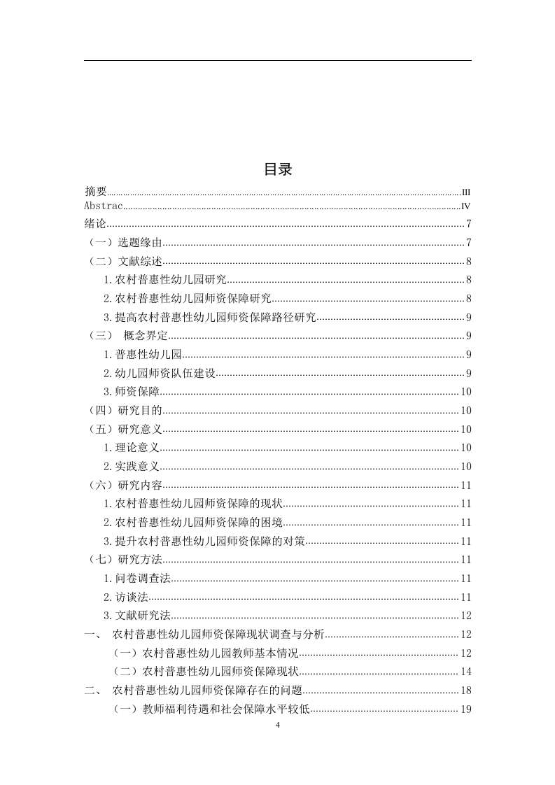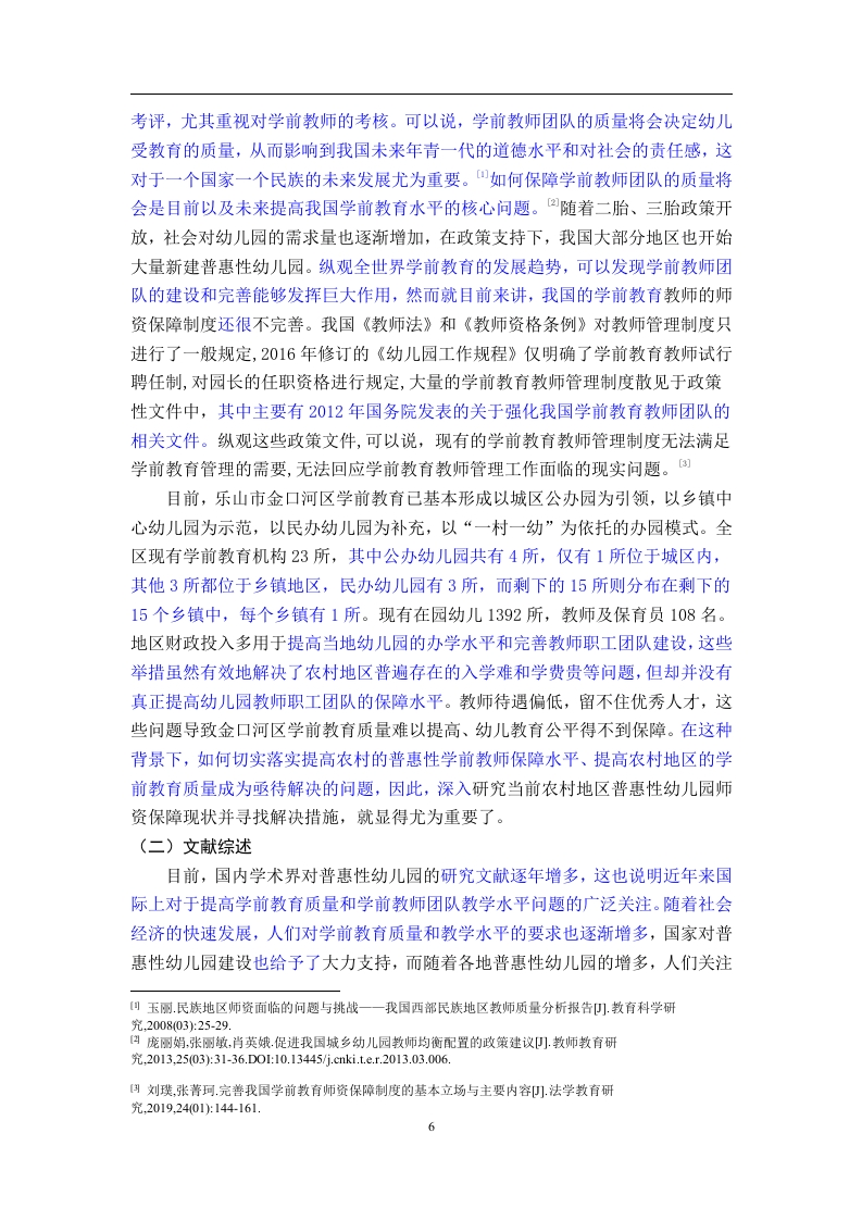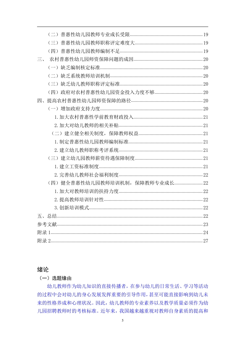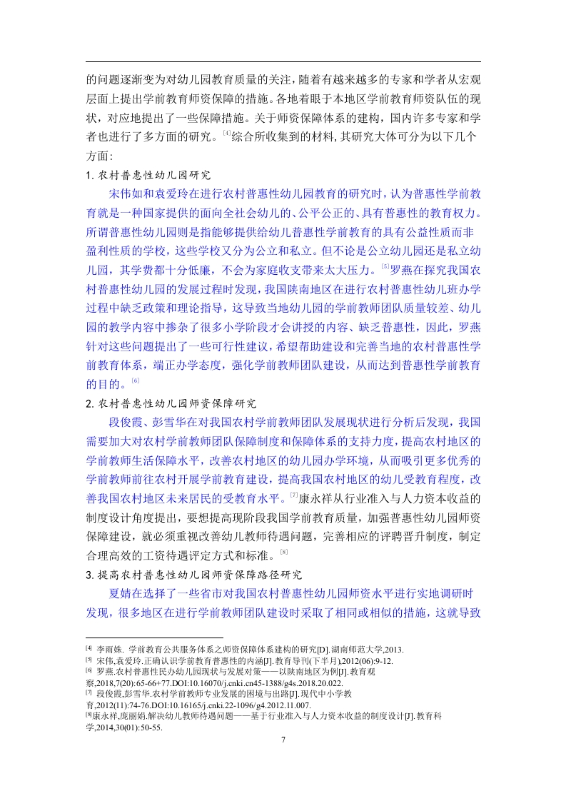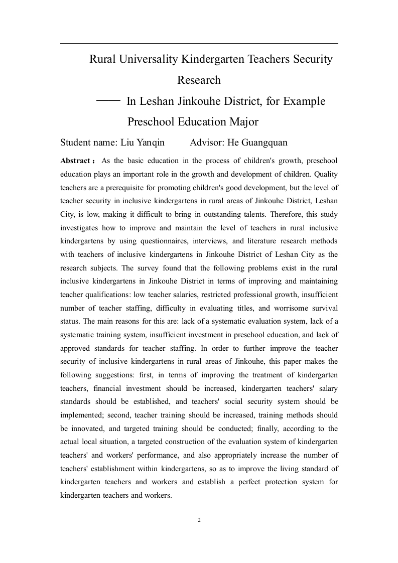 农村普惠性幼儿园师资保障研究一以乐山市金口河区为例摘要:学前教育作为儿童成长过程中的基础教育,对儿童的成长与发展具有重要作用。优质的师资力量是促进儿童良好发展前提,但是,乐山市金口河区农村地区普惠性幼儿园师资保障水平较低,难以引入优秀人才。因此,本研究以乐山市金口河区普惠性幼儿园教师为研究对象,采用问卷调查法、访谈法和文献研究法,探究如何提高和维护农村普惠性幼儿园的师资水平。调查发现,目前金口河区的农村普惠性幼儿园在提高和维持师资水平方面存在以下问题:教师待遇低、专业成长受限、教师编制数量不足、职称评定难、生存现状堪忧等。其产生的主要原因有:缺乏系统的考评制度、缺乏系统的培训制度、学前教育经费投入不足、缺乏教师编制核定标准。为了进一步提高金口河农村地区普惠性幼儿园师资保障,本文提出如下建议:首先,在提高幼儿教师待遇方面,应增加财政投入,建立幼儿教师工资标准,落实教师社会保障制度:其次,应加大教师培训力度,创新培训方式,进行有针对性的培训:最后,根据当地实际情况,有针对性地构建对幼儿园教师职工业绩的评价体系,同时也要适当增加幼儿园内教师编制的数目,从而提高幼儿园教师职工的生活水平,建立完善的幼儿园教师职工保障体系。关键词:农村:普惠性幼儿园:师资保障1Rural Universality Kindergarten Teachers SecurityResearchIn Leshan Jinkouhe District,for ExamplePreschool Education MajorStudent name:Liu YanginAdvisor:He GuangquanAbstract:As the basic education in the process of children's growth,preschooleducation plays an important role in the growth and development of children.Qualityteachers are a prerequisite for promoting children's good development,but the level ofteacher security in inclusive kindergartens in rural areas of Jinkouhe District,LeshanCity,is low,making it difficult to bring in outstanding talents.Therefore,this studyinvestigates how to improve and maintain the level of teachers in rural inclusivekindergartens by using questionnaires,interviews,and literature research methodswith teachers of inclusive kindergartens in Jinkouhe District of Leshan City as theresearch subjects.The survey found that the following problems exist in the ruralinclusive kindergartens in Jinkouhe District in terms of improving and maintainingteacher qualifications:low teacher salaries,restricted professional growth,insufficientnumber of teacher staffing,difficulty in evaluating titles,and worrisome survivalstatus.The main reasons for this are:lack of a systematic evaluation system,lack of asystematic training system,insufficient investment in preschool education,and lack ofapproved standards for teacher staffing.In order to further improve the teachersecurity of inclusive kindergartens in rural areas of Jinkouhe,this paper makes thefollowing suggestions:first,in terms of improving the treatment of kindergartenteachers,financial investment should be increased,kindergarten teachers'salarystandards should be established,and teachers'social security system should beimplemented;second,teacher training should be increased,training methods shouldbe innovated,and targeted training should be conducted;finally,according to theactual local situation,a targeted construction of the evaluation system of kindergartenteachers'and workers'performance,and also appropriately increase the number ofteachers'establishment within kindergartens,so as to improve the living standard ofkindergarten teachers and workers and establish a perfect protection system forkindergarten teachers and workers.2Translated with www.DeepL.com/Translator (free version)Key words:rural;universal kindergarten;teachers guarantee3目录摘要.ΠAbstrac....IV绪论7(一)选题缘由….7(二)文献综述….81.农村普惠性幼儿园研究..82.农村普惠性幼儿园师资保障研究.….83.提高农村普惠性幼儿园师资保障路径研究..9(三)概念界定..91.普