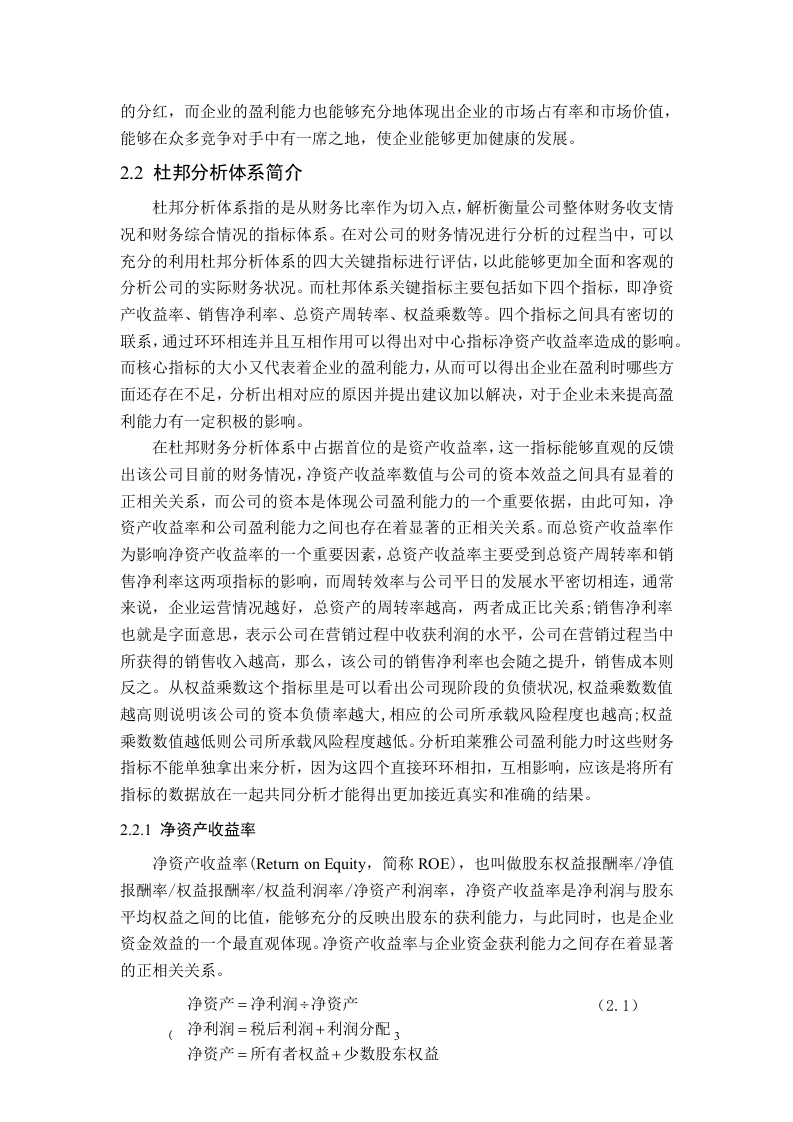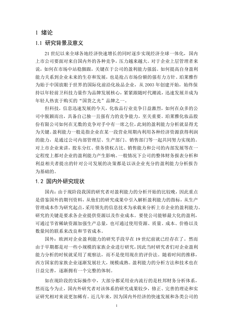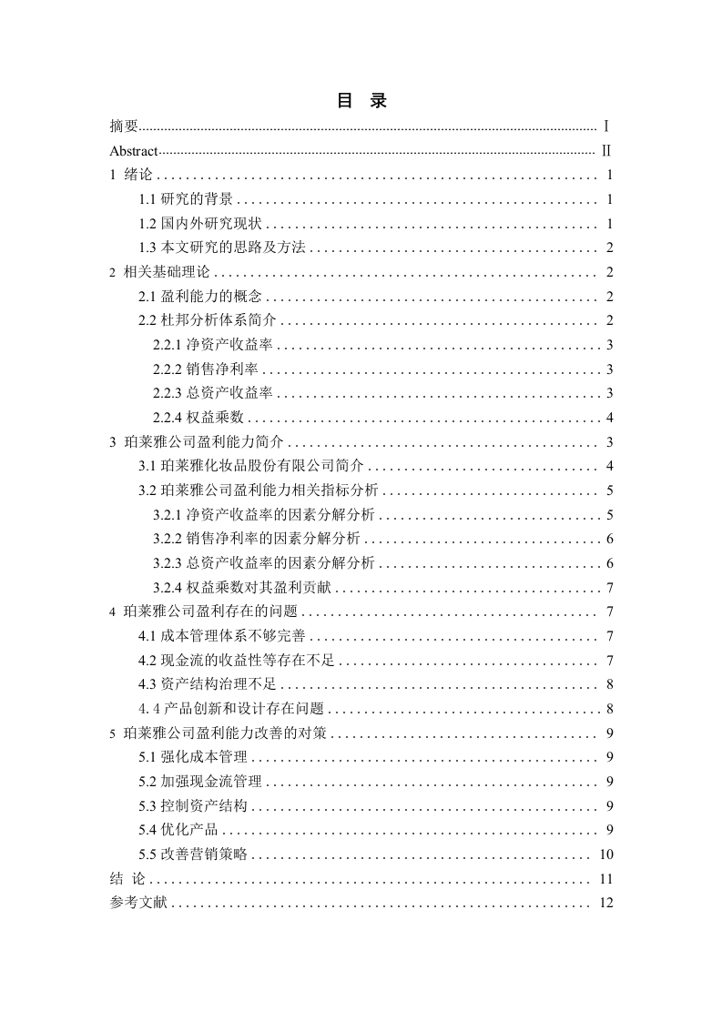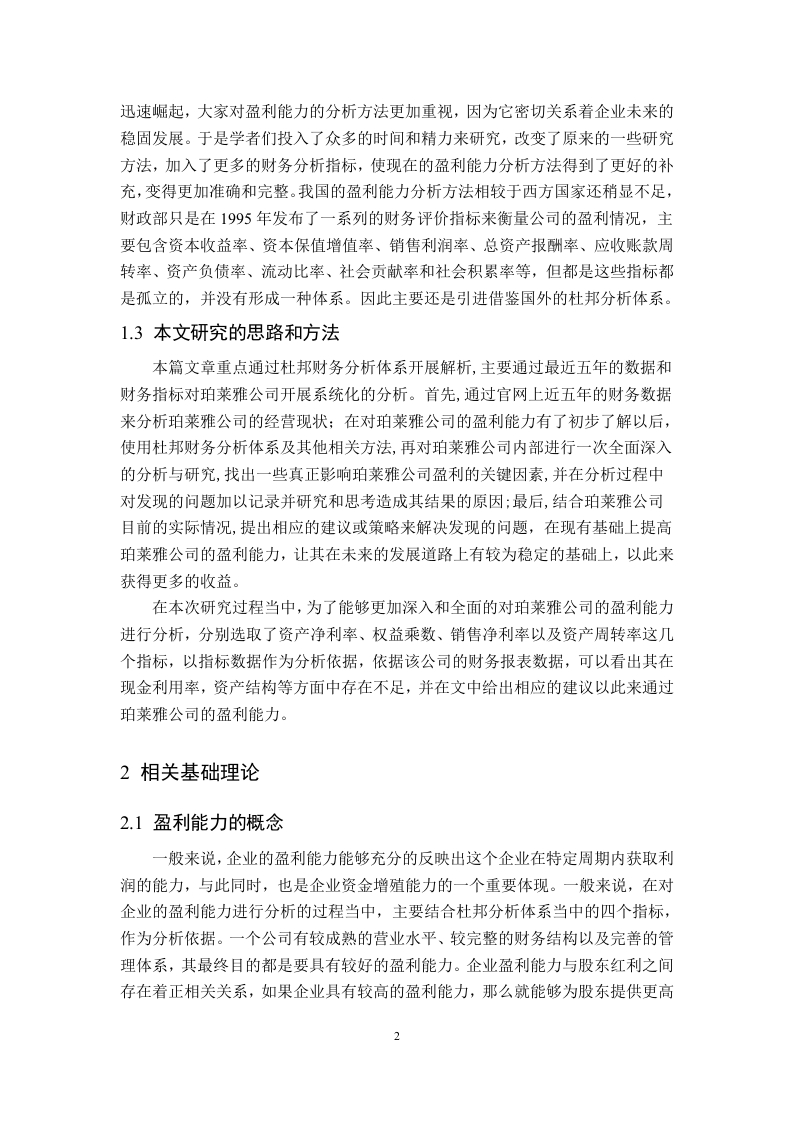 中国化妆品公司盈利能力分析以珀莱雅化妆品股份有限公司为例摘要:随着社会经济的不断发展和人均生活水平的提高以及科技逐步成熟,大家对化妆品的日常需求增多促使化妆品行业飞速发展。市面上有的化妆品其中更是由高科技萃取技术以及多项专利组成的。其受众面更为多样化,不单只是年轻女性,现在男性对化妆品的消费能力也是不容小觑的。上市公司的盈利能力是其持续发展和不断强大的根源,保证公司长久赢取利润的能力是该公司在行业竞争中生存和取胜的关键因素。杜邦分析法经过多数财务指标的勾稽关系全方位反馈公司的财务情况以及发展状况来分析珀莱雅化妆品股份有限公司的盈利能力。本篇文章将珀莱雅公司作为研究对象,采用杜邦分析法对该企业的盈利能力开展解析。在这一过程中,经过对净资产收益率、销售净利率、总资产周转率和权益乘数对其盈利的贡献的几个指标综合研判可以得出:珀莱雅公司成本管理体系不够完普,资产结构不够紧凑,现金流盈利不足,可以通过加强公司管理体系和现金管理,重新治理资产结构来提高公司的盈利能力。关键词:珀莱雅化妆品股份有限公司:杜邦分析体系:盈利能力Profits analysis of cosmetics companies in China-Take Perlaya Cosmetics Co.,Ltd.as an example.Undergraduate:Lai YaoSupervisor:Zhang Shi YunAbstract:With the continuous development of social economy,the improvement ofper capita living standards and the gradual maturity of technology,the increase indaily demand for cosmetics has prompted the rapid development of the cosmeticsindustry.Some cosmetics on the market are composed of high-tech extractiontechnology and a number of patents.Its audience is more diversified,not only youngwomen,but men's ability to consume cosmetics should not be underestimated.Theprofitability of a listed company is the foundation for the development and growth ofa company,and maintaining its sustained profitability is a key factor for a company tosurvive and win in industry competition.The DuPont analysis method analyzes theprofitability of Proya Cosmetics Co.,Ltd.through the cross-checking relationship ofmultiple financial indicators to comprehensively reflect the financial status andoperating conditions of the enterprise.This article takes Proya as the main body of the case and uses DuPont analysis toanalyze the company's profitability.In the process of profit analysis,through theanalysis of the contribution of return on net assets,net sales interest rate,total assetturnover rate and equity multiplier to its profitability,it is found that Proya's costmanagement system is not perfect,the asset structure is not compact enough,and thecash flow is profitable.Insufficiency,the company's profitability can be improved bystrengthening the company's management system and cash management,andre-governing the asset structure.Keywords:Perlea Cosmetics Co.,Ltd.;DuPont analysis system;profitability目录摘要AbstractI1绪论.11.1研究的背景.…11.2国内外研究现状....1.3本文研究的思路及方法22相关基础理论...。22.1盈利能力的概念...22.2杜邦分析体系简介22.2.1净资产收益率…32.2.2销售净利率.32.2.3总资产收益率...32.2.4权益乘数....43珀莱雅公司盈利能力简介..。33.1珀莱雅化妆品股份有限公司简介43.2珀莱雅公司盈利能力相关指标分析53.2.1净资产收益率的因素分解分析53.2.2销售净利率的因素分解分析.3.2.3总资产收益率的因素分解分析3.2.4权益乘数对其盈利贡献...74珀莱雅公司盈利存在的问题...74.1成本管理体系不够完善...74.2现金流的收益性等存在不足74.3资产结构治理不足....84.4产品创新和设计存在问题5珀莱雅公司盈利能力改善的对策95.1强化成本管理...95.2加强现金流管理..95.3控制资产结构..95.4优化产品...95.5改善营销策略.10结论...…11参考文献.....12致谢.…13