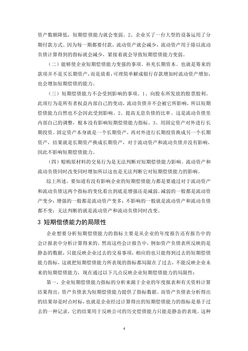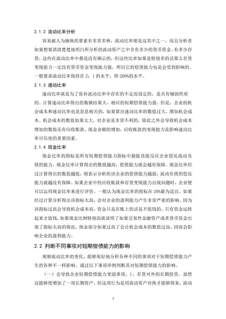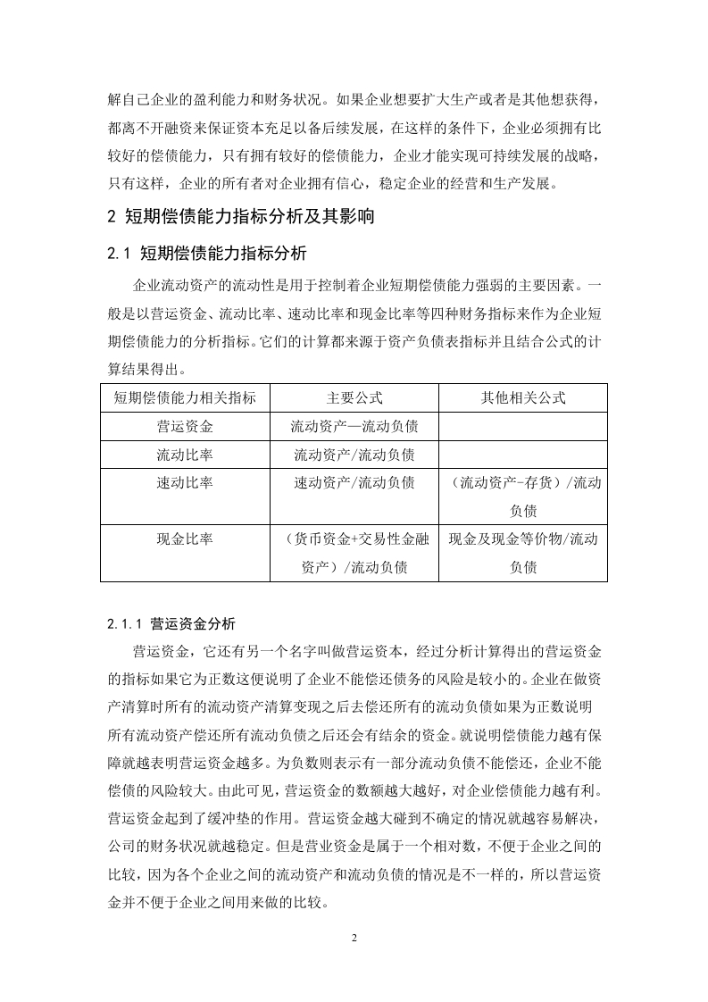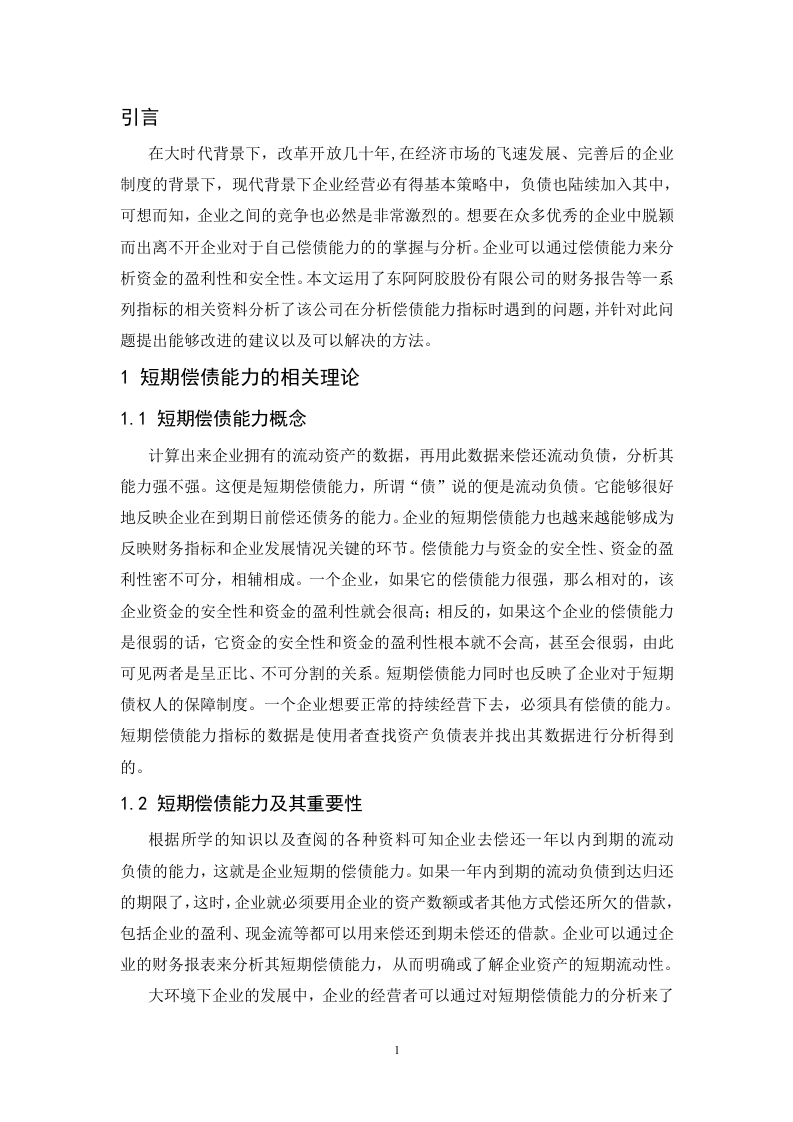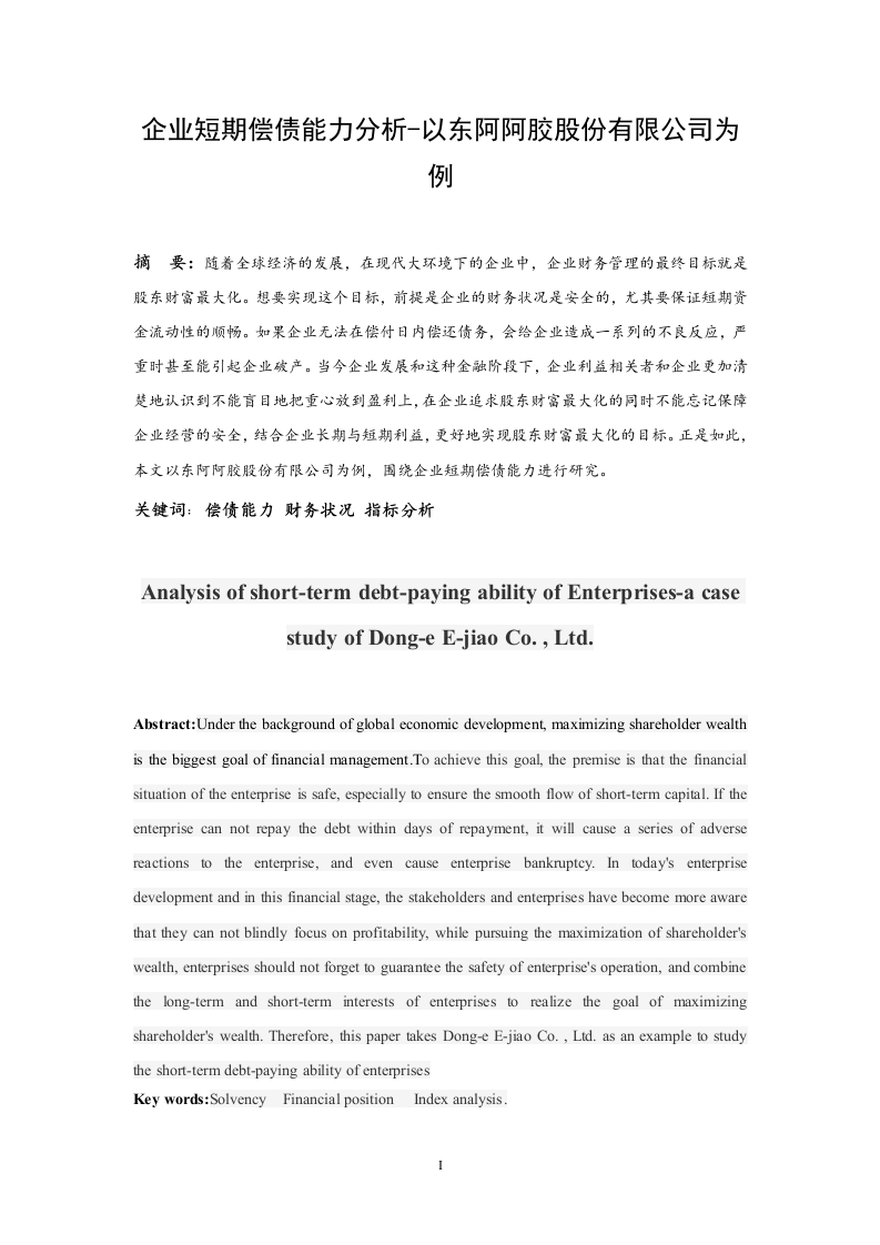目录摘要及关键词...…1短期偿债能力的相关理论...11.1短期偿债能力概念.....11.2短期偿债能力及其重要性12短期偿债能力指标分析及其影响22.1短期偿债能力指标分析22.1.1营运资金分析。。。。22.1.2流动比率分析......32.1.3速动比率.....32.1.4现金比率.…32.2判断不同事项对短期偿债能力的影响.............·33短期偿债能力的局限性...44东阿阿胶股份有限公司的短期偿债能力案例分析.…54.1东阿阿胶股份有限公司及其产品简介.........·54.2短期偿债能力指标..54.2.1营运资金54.2.2流动比率。。。。。。4.2.3速动比率.......64.2.4现金比率.…74.3东阿阿胶短期偿债能力结构分析..74.4与北京同仁堂短期偿债能力比较分析94.4.1营运资金比较94.4.2流动比率比较.............94.4.3速动比率比较.104.4.4现金比率比较.104.5对东阿阿胶股份有限公司短期偿债能力的建议..…105结论.…...............11参考文献.12企业短期偿债能力分析-以东阿阿胶股份有限公司为例摘要:随肴全球经济的发展,在现代大环境下的企业中,企业财务管理的最终目标就是股东财富最大化。想要实现这个目标,前提是企业的财务状况是安全的,尤其要保证短期资金流动性的顺畅。如果企业无法在偿付日内偿还债务,会给企业造成一系列的不良反应,严重时甚至能引起企业破产。当今企业发展和这种金融阶段下,企业利益相关者和企业更加清楚地认识到不能盲目地把重心放到盈利上,在企业追求股东财富最大化的同时不能忘记保障企业经营的安全,结合企业长期与短期利益,更好地实现股东财富最大化的目标。正是如此,本文以东阿阿胶股份有限公司为例,围绕企业短期偿债能力进行研究。关键词:偿债能力财务状况指标分析Analysis of short-term debt-paying ability of Enterprises-a casestudy of Dong-e E-jiao Co.,Ltd.Abstract:Under the background of global economic development,maximizing shareholder wealthis the biggest goal of financial management.To achieve this goal,the premise is that the financialsituation of the enterprise is safe,especially to ensure the smooth flow of short-term capital.If theenterprise can not repay the debt within days of repayment,it will cause a series of adversereactions to the enterprise,and even cause enterprise bankruptcy.In today's enterprisedevelopment and in this financial stage,the stakeholders and enterprises have become more awarethat they can not blindly focus on profitability,while pursuing the maximization of shareholder'swealth,enterprises should not forget to guarantee the safety of enterprise's operation,and combinethe long-term and short-term interests of enterprises to realize the goal of maximizingshareholder's wealth.Therefore,this paper takes Dong-e E-jiao Co.,Ltd.as an example to studythe short-term debt-paying ability of enterprisesKey words:Solvency Financial position Index analysis.I引言在大时代背景下,改革开放几十年,在经济市场的飞速发展、完善后的企业制度的背景下,现代背景下企业经营必有得基本策略中,负债也陆续加入其中,可想而知,企业之间的竞争也必然是非常激烈的。想要在众多优秀的企业中脱颖而出离不开企业对于自己偿债能力的的掌握与分析。企业可以通过偿债能力来分析资金的盈利性和安全性。本文运用了东阿阿胶股份有限公司的财务报告等一系列指标的相关资料分析了该公司在分析偿债能力指标时遇到的问题,并针对此问题提出能够改进的建议以及可以解决的方法。1短期偿债能力的相关理论1.1短期偿债能力概念计算出来企业拥有的流动资产的数据,再用此数据来偿还流动负债,分析其能力强不强。这便是短期偿债能力,所谓“债”说的便是流动负债。它能够很好地反映企业在到期日前偿还债务的能力。企业的短期偿债能力也越来越能够成为反映财务指标和企业发展情况关键的环节。偿债能力与资金的安全性、资金的盈利性密不可分,相辅相成。一个企业,如果它的偿债能力很强,那么相对的,该企业资金的安全性和资金的盈利性就会很高:相反的,如果这个企业的偿债能力是很弱的话,它资金的安全性和资金的盈利性根本就不会高,甚至会很弱,由此可见两者是呈正比、不可分割的关系。短期偿债能力同时也反映了企业对于短期债权人的保障制度。一个企业想要正常的持续经营下去,必须具有偿债的能力。短期偿债能力指标的数据是使用者查找资产负债表并找出其数据进行分析得到的。1.2短期偿债能力及其重要性根据所学的知识以及查阅的各种资料可知企业去偿还一年以内到期的流动负债的能力,这就是企业短期的偿债能力。如果一年内到期的流动负债到达归还的期限了,这时,企业就必须要用企业的资产数额或者其他方式偿还所欠的借款,包括企业的盈利、现金流等都可以用来偿还到期未偿还的借款。企业可以通过企业的财务报表来分析其短期偿债能力,从而明确或了解企业资产的短期流动性。大环境下企业的发展中,企业的经营者可以通过对短期偿债能力的分析来了