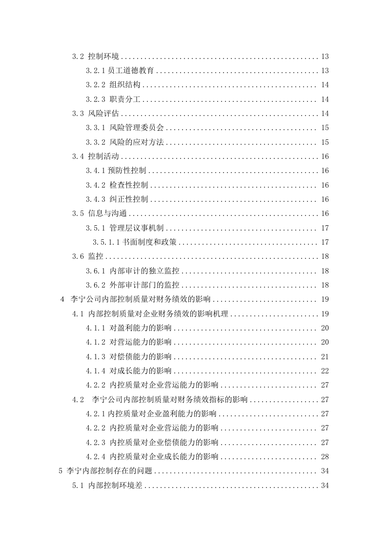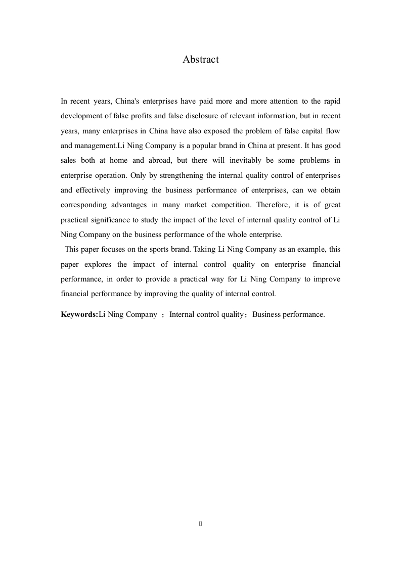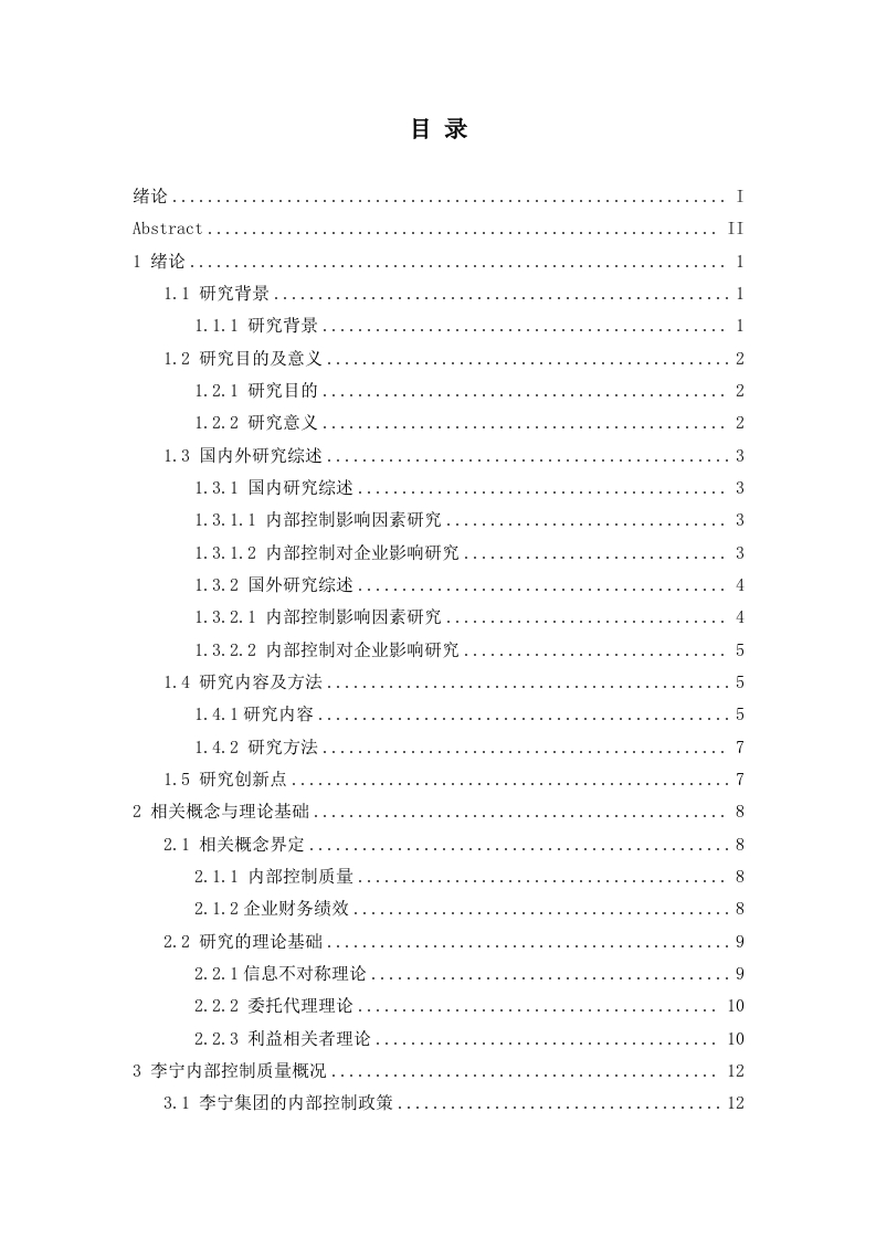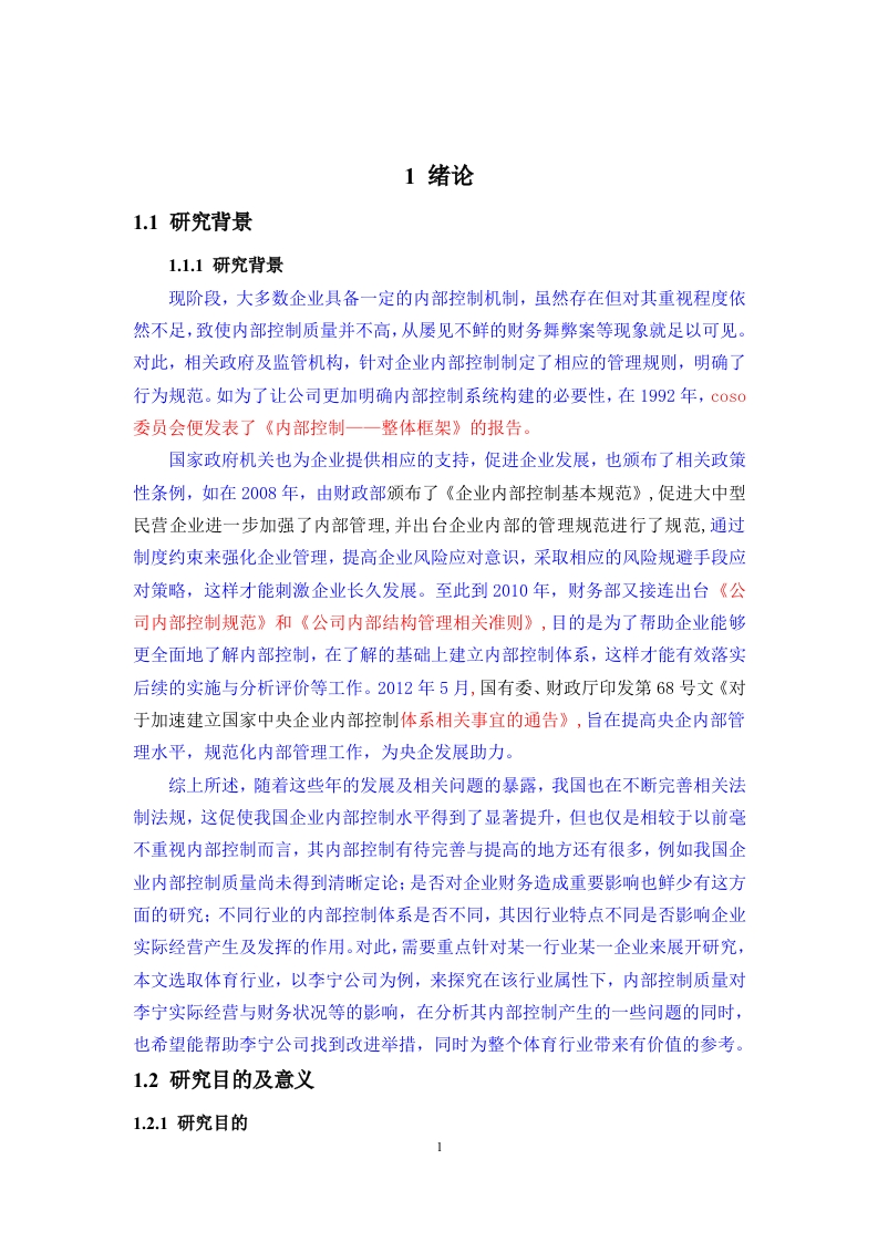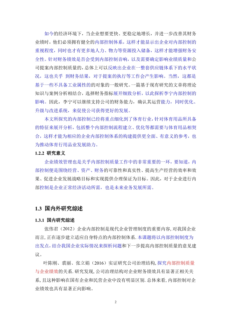 内部控制质量对李宁公司经营绩效的影响摘要随着我国科技进步,经济实力不断提升,我国企业也获得了快速成长的机会,但在此过程中,企业发展壮大的同时,也暴露出诸多问题,例如虚报、谎报财务信息,利润造假等等,这些现象的出现实质暴露出了企业内部控制与管理的问题。李宁公司是目前国内比较火热的品牌,不管在国内还是国外都有比较好的销售量,但企业经营难免会出现一些问题。只有从加强企业内部的质量控制入手,有力改善企业经营情况,争取最大化经营效益,才能在竞争激烈的市场中占据一部分优势。对此,本文将以李宁公司为例,探究其内部控制水平对企业经营状况的影响,以此希望为其它企业带去有价值的参考。本文将选择体育行业,重点针对体育运动品牌,在分析内部控制质量的基础上,来探究李宁企业相关品牌项目的发展情况,希望能针对现存不足,提供可行性举措。研究结论:目前李宁公司已形成了比较完善的内部管理体系,利用内部控制规范完善了组织架构,并对内部生产安全规范也具有了较为完善的管理体系,但由于李宁公司内部系统对消息渠道的封闭,内部信息管理管理水平并不高,同时外界消息也对内部管理质量不开放,无法满足有关方的要求:改善内部管理质量将增强提案的获利能力,通过提供提案的运作能力,增加提案的资本充足率,并通过有效的内部控制措施,提升偿付能力,通过帮助提交建议,加强企业并购:基于李宁的研究,为进一步促进企业内部控制发展,将结合行业情况健全企业内部控制,进一步完善企业内部管理,增加信息与反馈的频次,开放企业内部信息反馈控制渠道以提升评估效果,并增加了对企业内部管理情况实施评估的力量。关键词:李宁公司:内部控制质量:企业经营绩效AbstractIn recent years,China's enterprises have paid more and more attention to the rapiddevelopment of false profits and false disclosure of relevant information,but in recentyears,many enterprises in China have also exposed the problem of false capital flowand management.Li Ning Company is a popular brand in China at present.It has goodsales both at home and abroad,but there will inevitably be some problems inenterprise operation.Only by strengthening the internal quality control of enterprisesand effectively improving the business performance of enterprises,can we obtaincorresponding advantages in many market competition.Therefore,it is of greatpractical significance to study the impact of the level of internal quality control of LiNing Company on the business performance of the whole enterprise.This paper focuses on the sports brand.Taking Li Ning Company as an example,thispaper explores the impact of internal control quality on enterprisefinancialperformance,in order to provide a practical way for Li Ning Company to improvefinancial performance by improving the quality of internal control.Keywords:Li Ning Company Internal control quality:Business performance.目录绪论Abstract ...................II1绪论.......1.1研究背景.…1.1.1研究背景..11.2研究目的及意义...……21.2.1研究目的21.2.2研究意义..21.3国内外研究综述……31.3.1国内研究综述.....31.3.1.1内部控制影响因素研究.....31.3.1.2内部控制对企业影响研究.31.3.2国外研究综述.....41.3.2.1内部控制影响因素研究..41.3.2.2内部控制对企业影响研究...51.4研究内容及方法.......51.4.1研究内容1.4.2研究方法...71.5研究创新点..72相关概念与理论基础..82.1相关概念界定...2.1.1内部控制质量82.1.2企业财务绩效..2.2研究的理论基础....2.2.1信息不对称理论...2.2.2委托代理理论.102.2.3利益相关者理论.....103李宁内部控制质量概况.....123.1李宁集团的内部控制政策..3.2控制环境.……133.2.1员工道德教育...133.2.2组织结构..143.2.3职责分工....143.3风险评估..143.3.1风险管理委员会153.3.2风险的应对方法153.4控制活动......163.4.1预防性控制.·163.4.2检查性控制....163.4.3纠正性控制...163.5信息与沟通.....163.5.1管理层议事机制..173.5.1.1书面制度和政策..173.6监控..183.6.1内部审计的独立监控183.6.2外部审计部门的监控....184李宁公司内部控制质量对财务绩效的影响194.1内部控制质量对企业财务绩效的影响机理..........·194.1.1对盈利能力的影响......204.1.2对营运能力的影响....204.1.3对偿债能力的影响......214.1.4对成长能力的影响.224.2.2内控质量对企业营运能力的影响.....·274.2李宁公司内部控制质量对财务绩效指标的影响.........274.2.1内控质量对企业盈利能力的影响............274.2.2内控质量对企业营运能力的影响.…274.2.3内控质量对企业偿债能力的影响..........274.2.4内控质量对企业成长能力的影响..............285李宁内部控制存在的问题......345.1内部控制环境差......….34