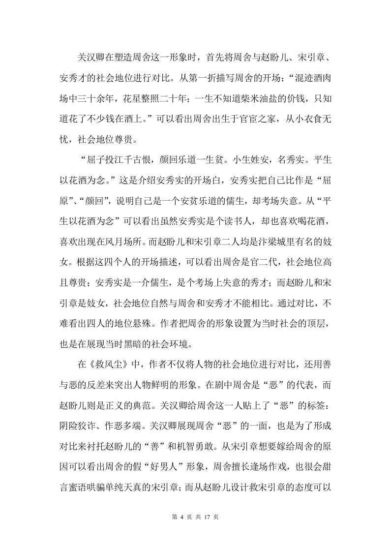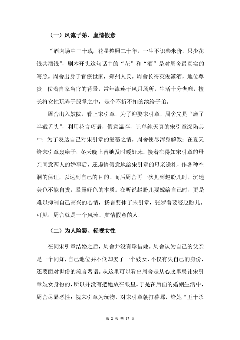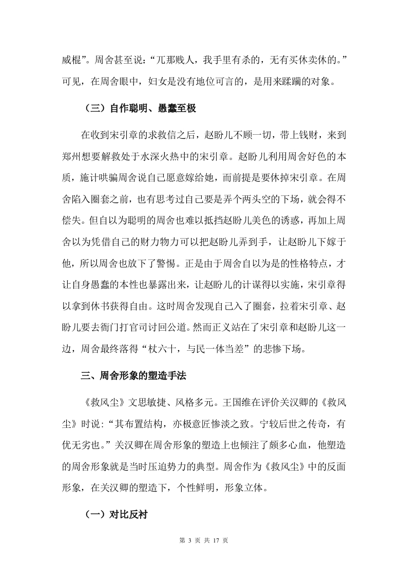 浅析关汉卿《救风尘》中周舍形象摘要《救风尘》不仅浓墨重彩地刻画了敢于斗争的女性形象,还细致地描绘了作恶多端的反面角色。关汉卿塑造的周舍“恶少”形象,是他作品中反面形象的其中一类。剧中周舍是虚伪狡诈、作恶多端、三心二意、愚蠢至极的形象。关汉卿塑造的周舍形象是当时社会生活的真实映像,不仅抨击了封建时期的男权文化,还揭露了黑暗统治阶级的恶行,同时也赞扬了底层女子的智慧和敢于反抗斗争的精神。关键词:《救风尘》:人物形象:周舍一、引言关汉卿是元代四大家的代表人物之一,在中国古典戏剧方面有很高的成就。《救风尘》全名《赵盼儿风月救风尘》,是关汉卿创作的著名的杂剧剧本,全剧共四折。《救风尘》主要写妓女宋引章与安分老实的秀才安秀实订下婚约后,由于自身的单纯天真、爱慕虚荣,被恶少周舍用甜言蜜语引诱,不顾朋友、家人的劝告和反对,执意下嫁周舍,两人成婚后周舍对宋引章加以虐待,朝打暮骂,最后宋引章不再忍耐,向她的姐妹赵盼儿寻求帮助,两人施计骗周舍写下休书的故事。《救风尘》巧妙地利用戏剧冲突、生动的语言,使情节一波三折,引人入胜,鲜明地展现了剧中各个人物的性格特点。关汉卿通过对周舍这一“恶少”形象的塑造,给予反派人物以无情的嘲讽,给正面人物以高度的赞扬。该作品不仅表达了对处在社会底层的妓女和儒生的同情,揭露官商的残暴行径,还赞扬了女性敢于与黑暗势力作斗争的勇气和精神。二、周舍形象的主要特征金灭亡后,关汉卿为了谋生,来到元大都,开始了创作戏剧之路。关汉卿为了创作更好的作品,亲自进入娱乐场所观察百姓。从事杂剧创作活动,让关汉卿对黑暗的社会和女性的不幸遭遇有着深刻的体会。他以强烈的社会责任感,借助《救风尘》中“恶少”周舍这一反面形象,揭露当时社会的不公现象,从而传递自己的政治理念。周舍的形象特征主要如下:第1页共17页(一)风流子弟、虚情假意“酒肉场中三十载,花星整照二十年,一生不识柴米价,只少花钱共酒钱”,剧本开头这句话中的“花”和“酒”是对周舍最真实的写照。周舍出身于官僚世家,郑州人氏。周舍长得英俊潇酒,地位尊贵,仗着自家当官的背景,常年流连于风月场所,生活十分奢靡,擅长将女性玩弄于股掌之中,是个不折不扣的纨绔子弟。周舍出入妓院,看上宋引章。为了迎娶宋引章,周舍先是“磨了半截舌头”,利用花言巧语,假意温存,让单纯天真的宋引章深陷其中:为了表达自己对宋引章的爱慕之情,周舍使尽浑身解数:在夏天给宋引章扇扇子,冬天晚上替她及时暖好床。接着在得知宋引章的母亲同意两人的婚事后,还虚情假意地给宋引章的母亲送礼,作各种空洞的保证,以达到自己的目的。而后周舍再一次见到赵盼儿时,沉迷美色不能自拔,暴露好色的本质。在听说赵盼儿要嫁给自己时,更是难以抑制自己高兴的心情,扬言要休了宋引章,张罗着要娶赵盼儿。可见,周舍就是一个风流、虚情假意的人。(二)为人险恶、轻视女性在同宋引章结婚之后,周舍并没有珍惜她。周舍认为自己的父亲是一个同知,自己地位并不低却娶了一个妓女,不仅有失自己的身份,还要面对世俗的流言蜚语。从这里可以看出周舍是从心底里忌讳宋引章妓女身份的,所以并没有把她放在眼里。于是在后面的婚姻生活中,周舍尽显恶性:视宋引章为玩物,对宋引章朝打暮骂,给她“五十杀第2页共17页威棍”。周舍甚至说:“兀那贱人,我手里有杀的,无有买休卖休的。”可见,在周舍眼中,妇女是没有地位可言的,是用来蹂躏的对象。(三)自作聪明、愚蠢至极在收到宋引章的求救信之后,赵盼儿不顾一切,带上钱财,来到郑州想要解救处于水深火热中的宋引章。赵盼儿利用周舍好色的本质,施计哄骗周舍说自己愿意嫁给她,而前提是要休掉宋引章。在周舍陷入圈套之前,也有思考过自己要是弄个两头空的下场,就会得不偿失。但自以为聪明的周舍也难以抵挡赵盼儿美色的诱惑,再加上周舍以为凭借自己的财力物力可以把赵盼儿弄到手,让赵盼儿下嫁于他,所以周舍也放下了警惕。正是由于周舍自以为是的性格特点,才让自身愚蠢的本性也暴露出来,让赵盼儿的计谋得以实施,宋引章得以拿到休书获得自由。这时周舍发现自己入了圈套,拉着宋引章、赵盼儿要去衙门打官司讨回公道。然而正义站在了宋引章和赵盼儿这一边,周舍最终落得“杖六十,与民一体当差”的悲惨下场。三、周舍形象的塑造手法《救风尘》文思敏捷、风格多元。王国维在评价关汉卿的《救风尘》时说:“其布置结构,亦极意匠惨淡之致。宁较后世之传奇,有优无劣也。”关汉卿在周舍形象的塑造上也倾注了频多心血,他塑造的周舍形象就是当时压迫势力的典型。周舍作为《救风尘》中的反面形象,在关汉卿的塑造下,个性鲜明,形象立体。(一)对比反衬第3页共17页