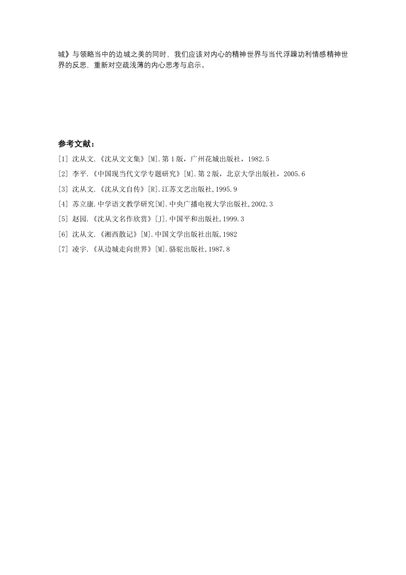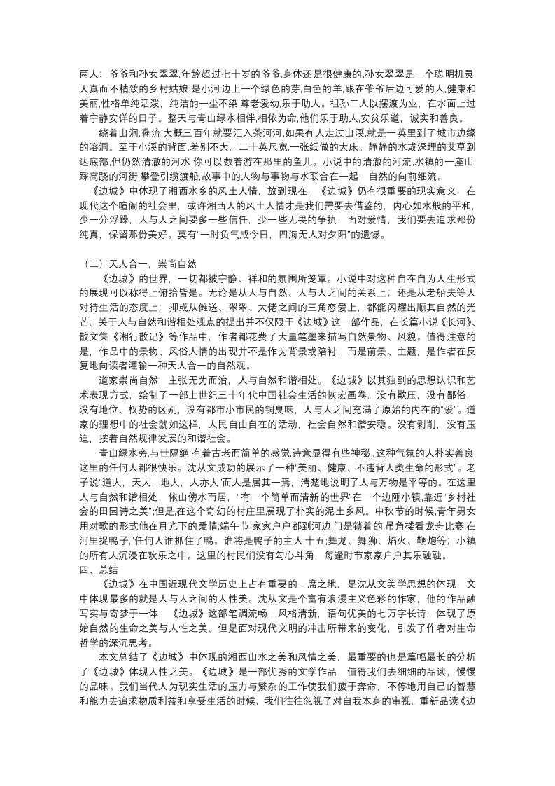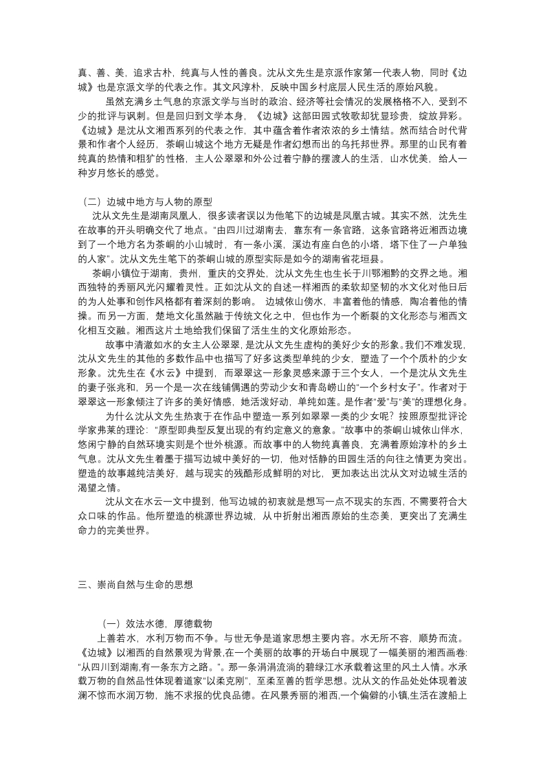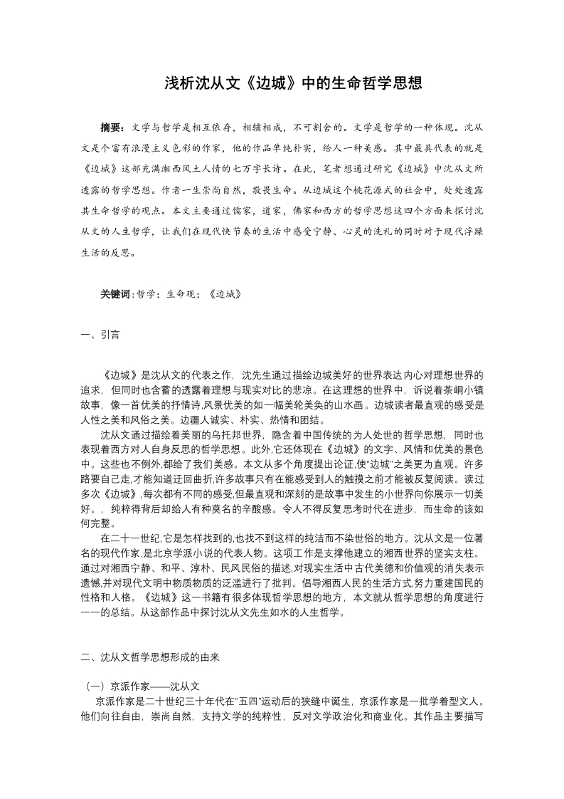 哈尔滨师范大学课程论文学年学期20-20学年第学期课程名称题目姓名学号学院任课教师论文评语(由任课教师填写)成绩:说明1.课程论文应包括论文题目、目录、摘要、关键词、论文主体部分、参考文献等。2.课程论文字数各专业可根据专业特点自行拟定。3.课程论文成绩实行百分制,评阅论文应填写评语。目录、引言1二、沈从文哲学思想形成的由来.2(一)京派作家一一沈从文.2(二)边城中地方与人物的原型.2三、崇尚自然与生命的思想…31.效法水德,厚德载物。32.天人合一,崇尚自然….3四、总结.4浅析沈从文《边城》中的生命哲学思想摘要:文学与哲学是相互依存,相辅相成,不可割舍的。文学是哲学的一种体现。沈从文是个富有浪漫主义色彩的作家,他的作品单纯朴实,给人一种美感。其中最具代表的就是《边城》这部充满湘西风土人情的七万字长诗。在此,笔者想通过研究《边城》中沈从文所透露的哲学思想。作者一生崇尚自然,敬畏生命。从边城这个桃花源式的社会中,处处透露其生命哲学的观,点。本文主要通过儒家,道家,佛家和西方的哲学思想这四个方面来探讨沈从文的人生哲学,让我们在现代快节奏的生活中感受宁静、心灵的洗礼的同时对于现代浮躁生活的反思。关键词:哲学:生命观:《边城》一、引言《边城》是沈从文的代表之作,沈先生通过描绘边城美好的世界表达内心对理想世界的追求,但同时也含蓄的透露着理想与现实对比的悲凉。在这理想的世界中,诉说着茶峒小镇故事,像一首优美的抒情诗,风景优美的如一幅美轮美奂的山水画。边城读者最直观的感受是人性之美和风俗之美。边疆人诚实、朴实、热情和团结。沈从文通过描绘着美丽的乌托邦世界,隐含着中国传统的为人处世的哲学思想,同时也表现着西方对人自身反思的哲学思想。此外,它还体现在《边城》的文字、风情和优美的景色中。这些也不例外都给了我们美感。本文从多个角度提出论证,使"边城”之美更为直观。许多路要自己走,才能知道迂回曲折,许多故事只有在能感受到人的触摸之前才能被反复阅读。读过多次《边城》,每次都有不同的感受,但最直观和深刻的是故事中发生的小世界向你展示一切美好。,纯粹得背后却给人有种莫名的辛酸感。令人不得反复思考时代在进步,而生命的该如何完整。在二十一世纪,它是怎样找到的也找不到这样的纯洁而不染世俗的地方。沈从文是一位著名的现代作家,是北京学派小说的代表人物。这项工作是支撑他建立的湘西世界的坚实支柱。通过对湘西宁静、和平、淳朴、民风民俗的描述,对现实生活中古代美德和价值观的消失表示遗憾,并对现代文明中物质物质的泛滥进行了批判。倡导湘西人民的生活方式,努力重建国民的性格和人格。《边城》这一书籍有很多体现哲学思想的地方,本文就从哲学思想的角度进行的总结。从这部作品中探讨沈从文先生如水的人生哲学。二、沈从文哲学思想形成的由来(一)京派作家—沈从文京派作家是二十世纪三十年代在“五四"运动后的狭缝中诞生,京派作家是一批学着型文人。他们向往自由,崇尚自然,支持文学的纯粹性,反对文学政治化和商业化。其作品主要描写