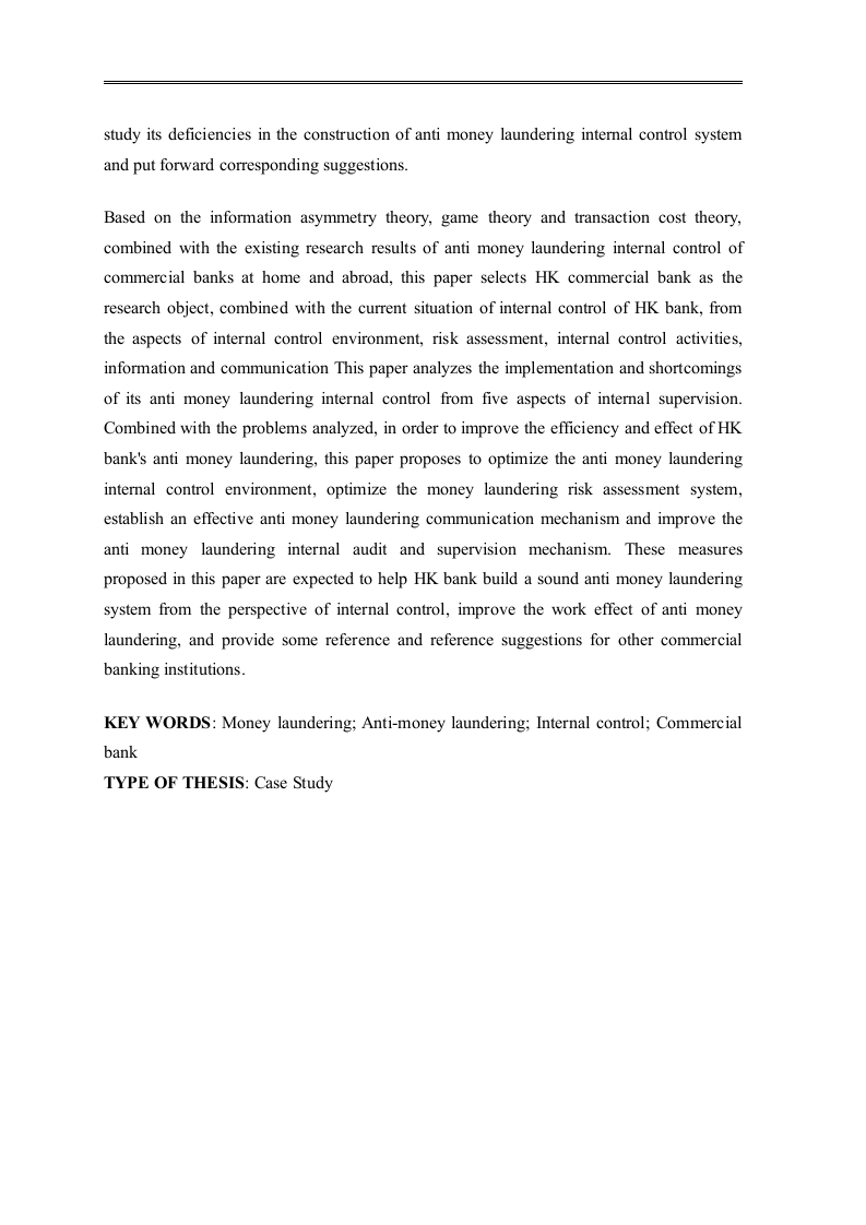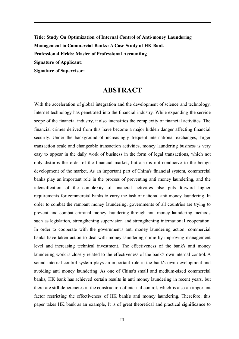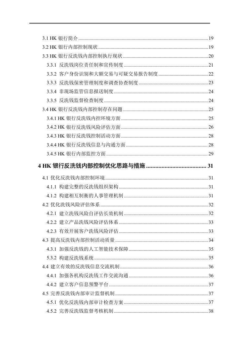 摘要商业银行反洗钱内部控制优化研究一以K银行为例摘要随着全球一体化进程的加快及科技的发展,互联网技术渗透到金融行业在扩大金融行业服务范围的同时也加剧了金融活动的复杂性,以此衍生的金融犯罪成为影响金融安全的重大隐患。在国际交流日益频繁、交易规模变大、交易活动多变的背景下,洗钱业务极易以合法交易形式出现在商活动中,这既扰乱了金融市场的秩序又不利于市场的良性发展。商业银行作为我国金融体系的重要组成部分,在防范反洗钱的过程中扮演重要的角色,而金融活动复杂性的加剧也对商业银行承载国家反洗钱的任务提出了更高的要求。为了打击猖獗的洗钱行为,各国政府都在试图通过立法、加强监管以及加强国际合作等反洗钱方式来防止和打击犯罪洗钱行为。为配合政府的反洗钱行动,各商业银行纷纷采取行动配合,通过提升管理水平和加大技术投入来应对洗钱犯罪活动。银行反洗钱工作的成效与银行自身内部控制的有效性密切相关,健全的内部控制制度对银行自身的发展以及规避反洗钱发挥着重要的作用,是规避反洗钱最重要的一环。HK银行作为我国中小商业银行之一,近年来在反洗钱工作中取得了一定的成效,但在内部控制建设方面仍存在不足的地方,这也是制约HK银行反洗钱成效的重要影响因素,因此,本文以HK银行为例,研究其在反洗钱内部控制制度建设方面存在的不足并提出相应的建议具有重要的理论和实际意义。本文建立在信息不对称理论、博弈论以及交易成本理论的基础上,结合国内外现有的有关商业银行反洗钱内部控制的研究成果,选取了HK商业银行为研究对象,结合HK银行内部控制现状从内部控制环境、风险评估、内部控制活动、信息与沟通、内部监督五个方面分析了其反洗钱内部控制执行情况及存在的不足。结合分析出的问题,为提升HK银行反洗钱的效率和效果,本文提出优化反洗钱内部控制环境,优化洗钱风险评估体系,建立有效的反洗钱交流机制以及完善反洗钱内部审计监督机制。以期通过本文提出的这些措施帮助HK银行从内部控制视角构建健全的反洗钱制度体系,提升反洗钱的工作效果,同时也为其他商业银行业等机构提供些可参考和借鉴的建议。关键词:洗钱:反洗钱;内部控制;商业银行论文类型:案例分析Title:Study On Optimization of Internal Control of Anti-money LaunderingManagement in Commercial Banks:A Case Study of HK BankProfessional Fields:Master of Professional AccountingSignature of Applicant:Signature of Supervisor:ABSTRACTWith the acceleration of global integration and the development of science and technology,Internet technology has penetrated into the financial industry.While expanding the servicescope of the financial industry,it also intensifies the complexity of financial activities.Thefinancial crimes derived from this have become a major hidden danger affecting financialsecurity.Under the background of increasingly frequent international exchanges,largertransaction scale and changeable transaction activities,money laundering business is veryeasy to appear in the daily work of business in the form of legal transactions,which notonly disturbs the order of the financial market,but also is not conducive to the benigndevelopment of the market.As an important part of China's financial system,commercialbanks play an important role in the process of preventing anti money laundering,and theintensification of the complexity of financial activities also puts forward higherrequirements for commercial banks to carry the task of national anti money laundering.Inorder to combat the rampant money laundering,governments of all countries are trying toprevent and combat criminal money laundering through anti money laundering methodssuch as legislation,strengthening supervision and strengthening international cooperation.In order to cooperate with the government's anti money laundering action,commercialbanks have taken action to deal with money laundering crime by improving managementlevel and increasing technical investment.The effectiveness of the bank's anti moneylaundering work is closely related to the effectiveness of the bank's own internal control.Asound internal control system plays an important role in the bank's own development andavoiding anti money laundering.As one of China's small and medium-sized commercialbanks,HK bank has achieved certain results in ant