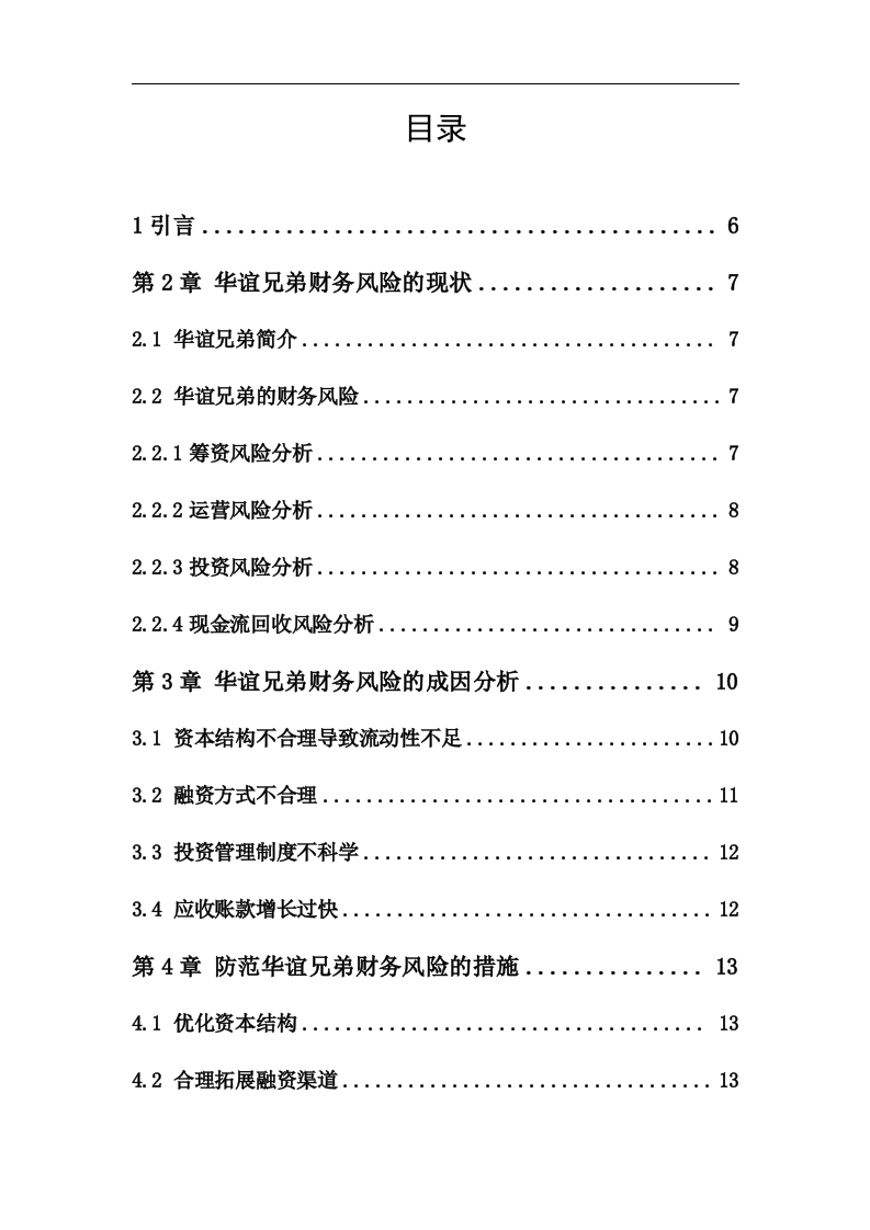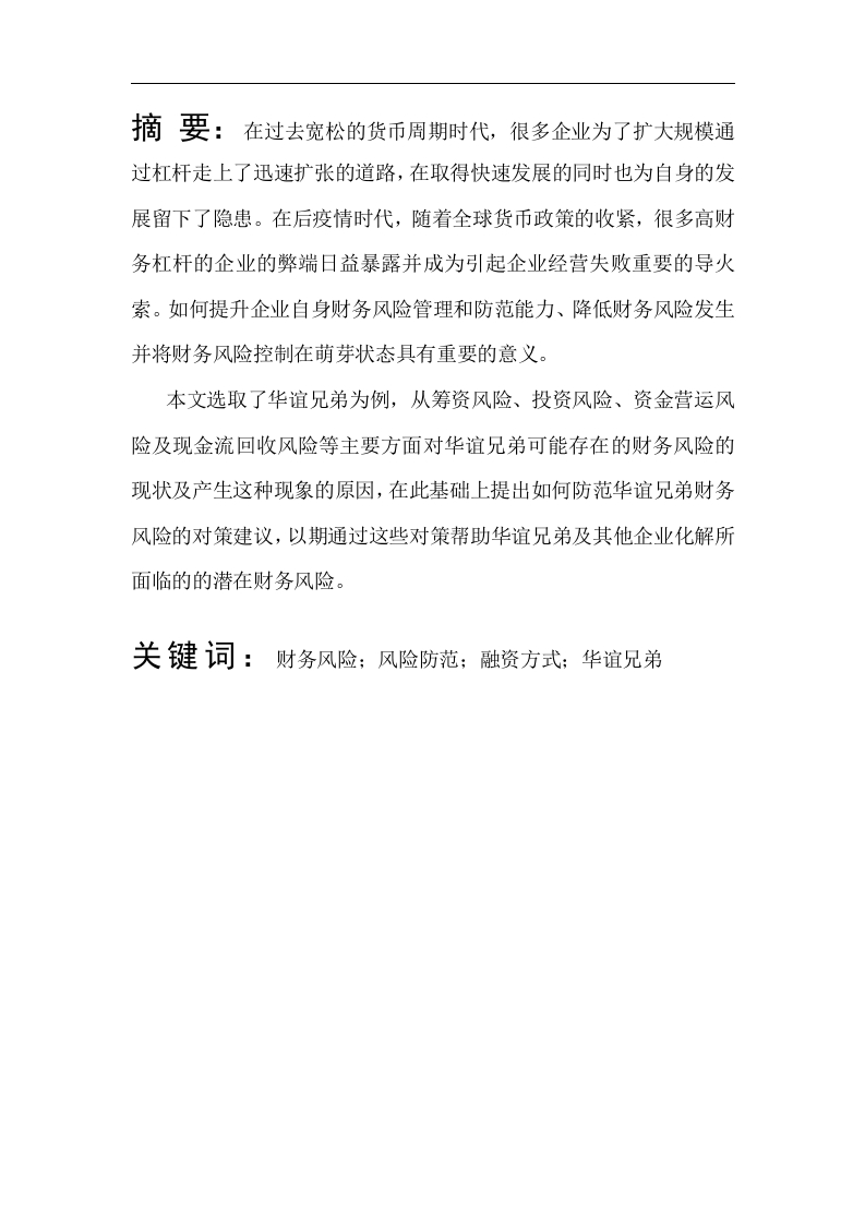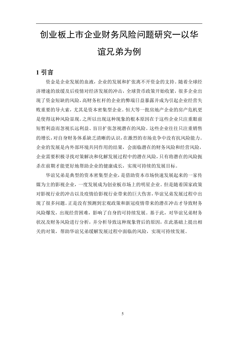 摘要:在过去宽松的货币周期时代,很多企业为了扩大规模通过杠杆走上了迅速扩张的道路,在取得快速发展的同时也为自身的发展留下了隐患。在后疫情时代,随着全球货币政策的收紧,很多高财务杠杆的企业的弊端日益暴露并成为引起企业经营失败重要的导火索。如何提升企业自身财务风险管理和防范能力、降低财务风险发生并将财务风险控制在萌芽状态具有重要的意义。本文选取了华谊兄弟为例,从筹资风险、投资风险、资金营运风险及现金流回收风险等主要方面对华谊兄弟可能存在的财务风险的现状及产生这种现象的原因,在此基础上提出如何防范华谊兄弟财务风险的对策建议,以期通过这些对策帮助华谊兄弟及其他企业化解所面临的的潜在财务风险。关键词:财务风险:风险防范:融资方式:华谊兄弟目录1引言.….................6第2章华谊兄弟财务风险的现状...·.72.1华谊兄弟简介..72.2华谊兄弟的财务风险..72.2.1筹资风险分析....72.2.2运营风险分析...。P2.2.3投资风险分析....82.2.4现金流回收风险分析..·第3章华谊兄弟财务风险的成因分析.........103.1资本结构不合理导致流动性不足....103.2融资方式不合理..........113.3投资管理制度不科学....123.4应收账款增长过快...第4章防范华谊兄弟财务风险的措施.........·134.1优化资本结构...134.2合理拓展融资渠道..134.3加强投资风险的控制.·..1443加强应收账款管理.....14结束语..….1参考文献...……….17致谢.....18