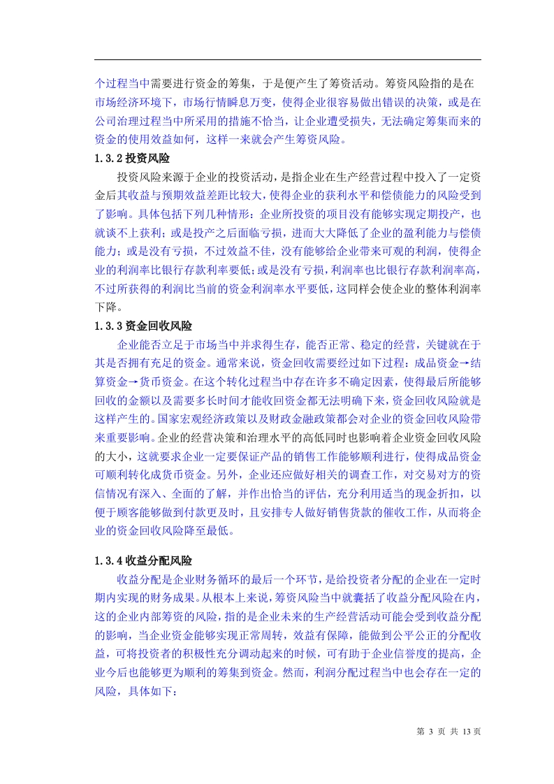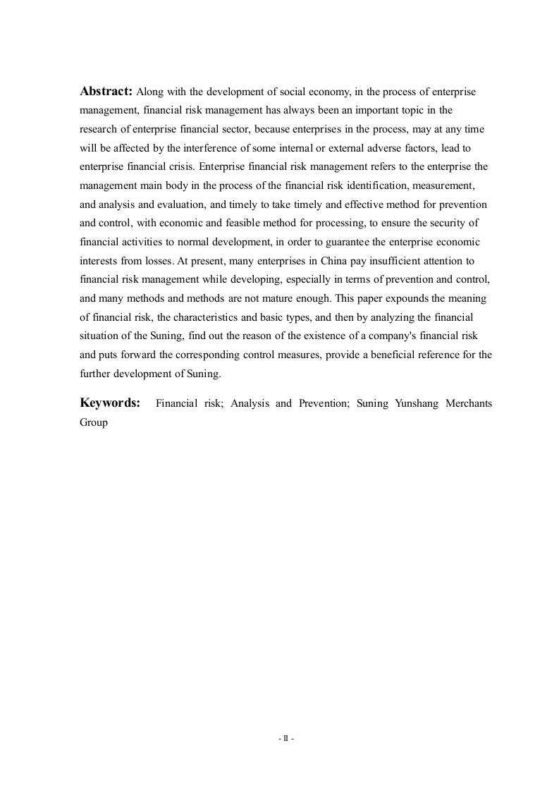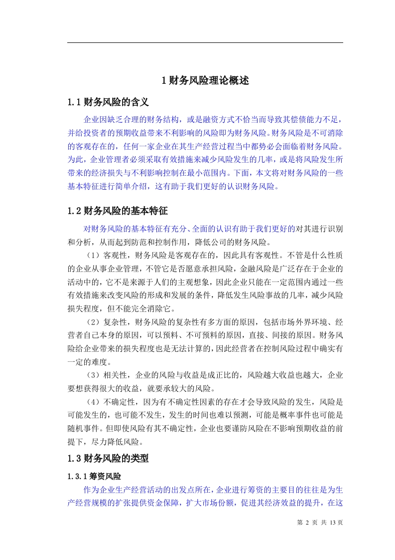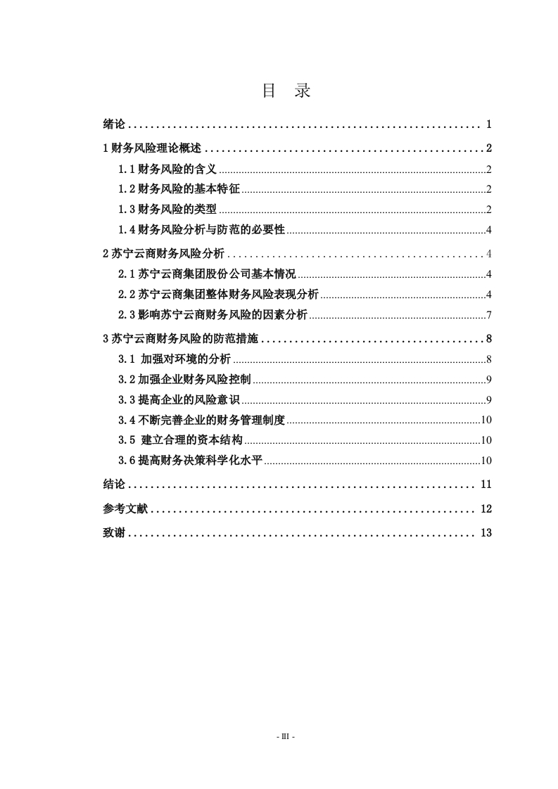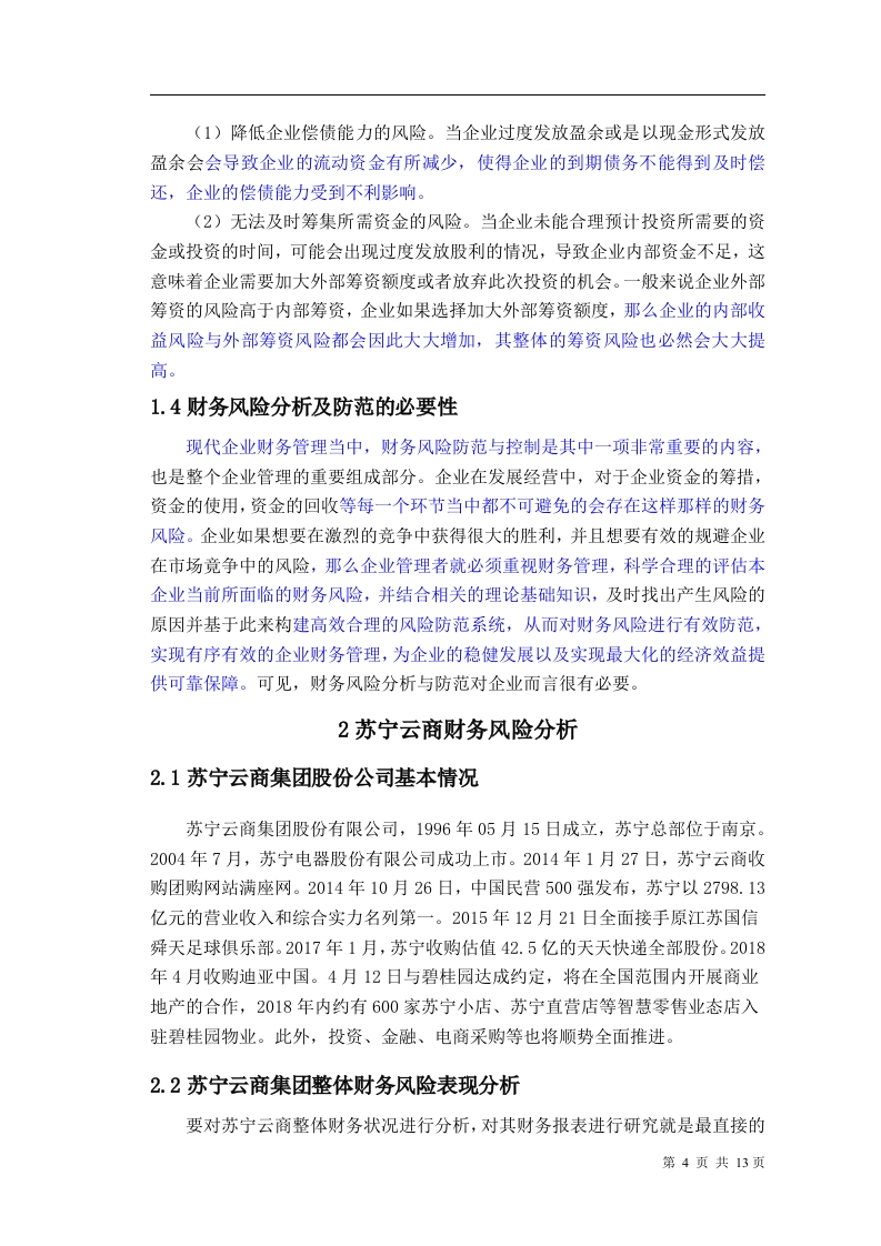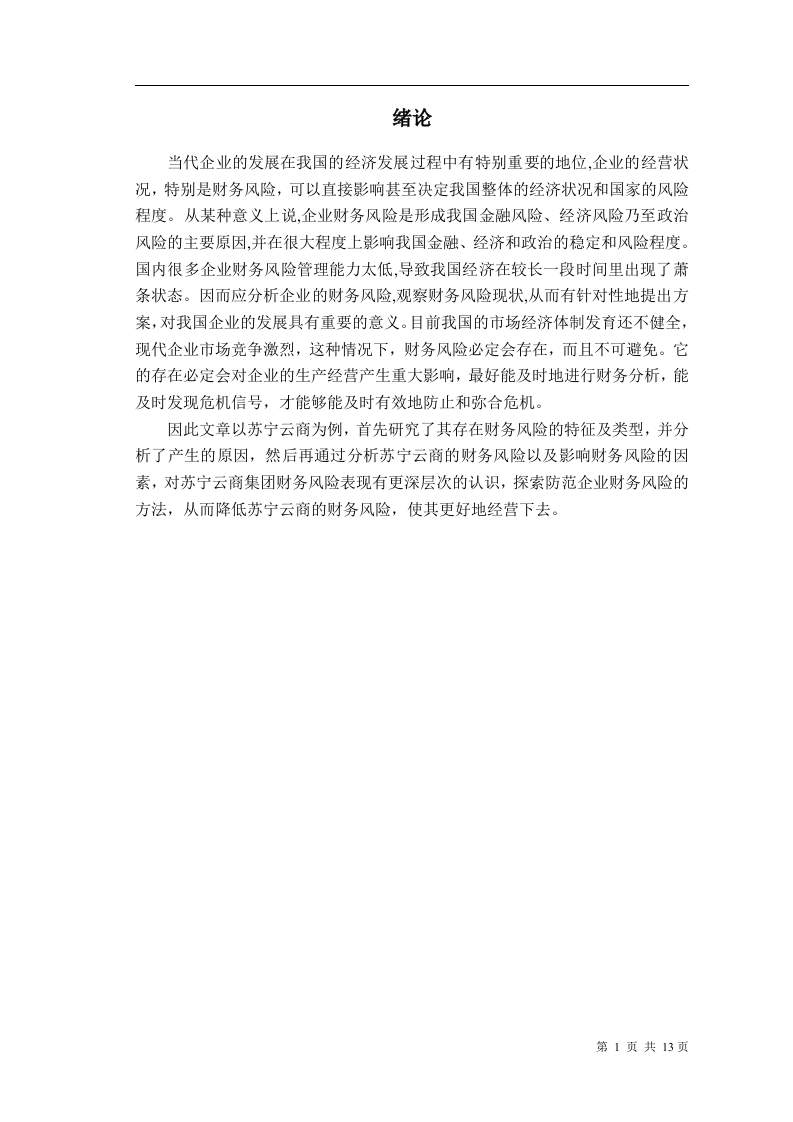 上市公司财务风险分析与防范以苏宁云商为例摘要:随着社会经济的发展,市场经济环境瞬息万变,这使得财务风险管理的重要性也越来越突出,因为企业在这个过程中可能随时会受到一些内部或外部不利因素的干扰,导致企业发生财务危机。企业财务风险管理是指企业的经营主体识别、度量以及分析评价其理财过程中可能存在的各项风险,在此基础上及时采取针对性措施来防范风险的发生,借助多种合理的、经济性和可行性都比较强的方法来处理各项风险因素,为理财活动安全、顺利的开展提供可靠保障,以免损害到企业的经济利益。目前在我国,有很多企业在发展的同时对财务风险管理不够重视,特别是在预防和控制上相对薄弱,并且很多的方式方法不够成熟。本文首先阐述了财务风险的含义,特征和基本类型,然后通过分析对苏宁云商的财务状况,找出该公司存在财务风险的原因并提出相应的的控制措施,为苏宁云商的进一步发展提供有益的参考。关键词:财务风险:分析与防范;苏宁云商集团-1-Abstract:Along with the development of social economy,in the process of enterprisemanagement,financial risk management has always been an important topic in theresearch of enterprise financial sector,because enterprises in the process,may at any timewill be affected by the interference of some internal or external adverse factors,lead toenterprise financial crisis.Enterprise financial risk management refers to the enterprise themanagement main body in the process of the financial risk identification,measurement,and analysis and evaluation,and timely to take timely and effective method for preventionand control,with economic and feasible method for processing,to ensure the security offinancial activities to normal development,in order to guarantee the enterprise economicinterests from losses.At present,many enterprises in China pay insufficient attention tofinancial risk management while developing,especially in terms of prevention and control,and many methods and methods are not mature enough.This paper expounds the meaningof financial risk,the characteristics and basic types,and then by analyzing the financialsituation of the Suning,find out the reason of the existence of a company's financial riskand puts forward the corresponding control measures,provide a beneficial reference for thefurther development of Suning.Keywords:Financial risk;Analysis and Prevention;Suning Yunshang MerchantsGroup-Ⅱ-目录绪论.…1财务风险理论概述.21.1财务风险的含义…21.2财务风险的基本特征21.3财务风险的类型21.4财务风险分析与防范的必要性2苏宁云商财务风险分析.....2.1苏宁云商集团股份公司基本情况42.2苏宁云商集团整体财务风险表现分析.42.3影响苏宁云商财务风险的因素分析.73苏宁云商财务风险的防范措施.…83.1加强对环境的分析83.2加强企业财务风险控制。93.3提高企业的风险意识.93.4不断完普企业的财务管理制度.103.5建立合理的资本结构.103.6提高财务决策科学化水平10结论.11参考文献.…12致谢.…13--绪论当代企业的发展在我国的经济发展过程中有特别重要的地位,企业的经营状况,特别是财务风险,可以直接影响甚至决定我国整体的经济状况和国家的风险程度。从某种意义上说,企业财务风险是形成我国金融风险、经济风险乃至政治风险的主要原因,并在很大程度上影响我国金融、经济和政治的稳定和风险程度。国内很多企业财务风险管理能力太低,导致我国经济在较长一段时间里出现了萧条状态。因而应分析企业的财务风险,观察财务风险现状,从而有针对性地提出方案,对我国企业的发展具有重要的意义。目前我国的市场经济体制发育还不健全,现代企业市场竞争激烈,这种情况下,财务风险必定会存在,而且不可避免。它的存在必定会对企业的生产经营产生重大影响,最好能及时地进行财务分析,能及时发现危机信号,才能够能及时有效地防止和弥合危机。因此文章以苏宁云商为例,首先研究了其存在财务风险的特征及类型,并分析了产生的原因,然后再通过分析苏宁云商的财务风险以及影响财务风险的因素,对苏宁云商集团财务风险表现有更深层次的认识,探索防范企业财务风险的方法,从而降低苏宁云商的财务风险,使其更好地经营下去。第1页共13页
