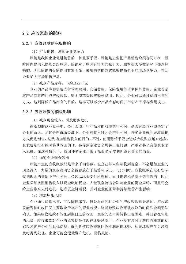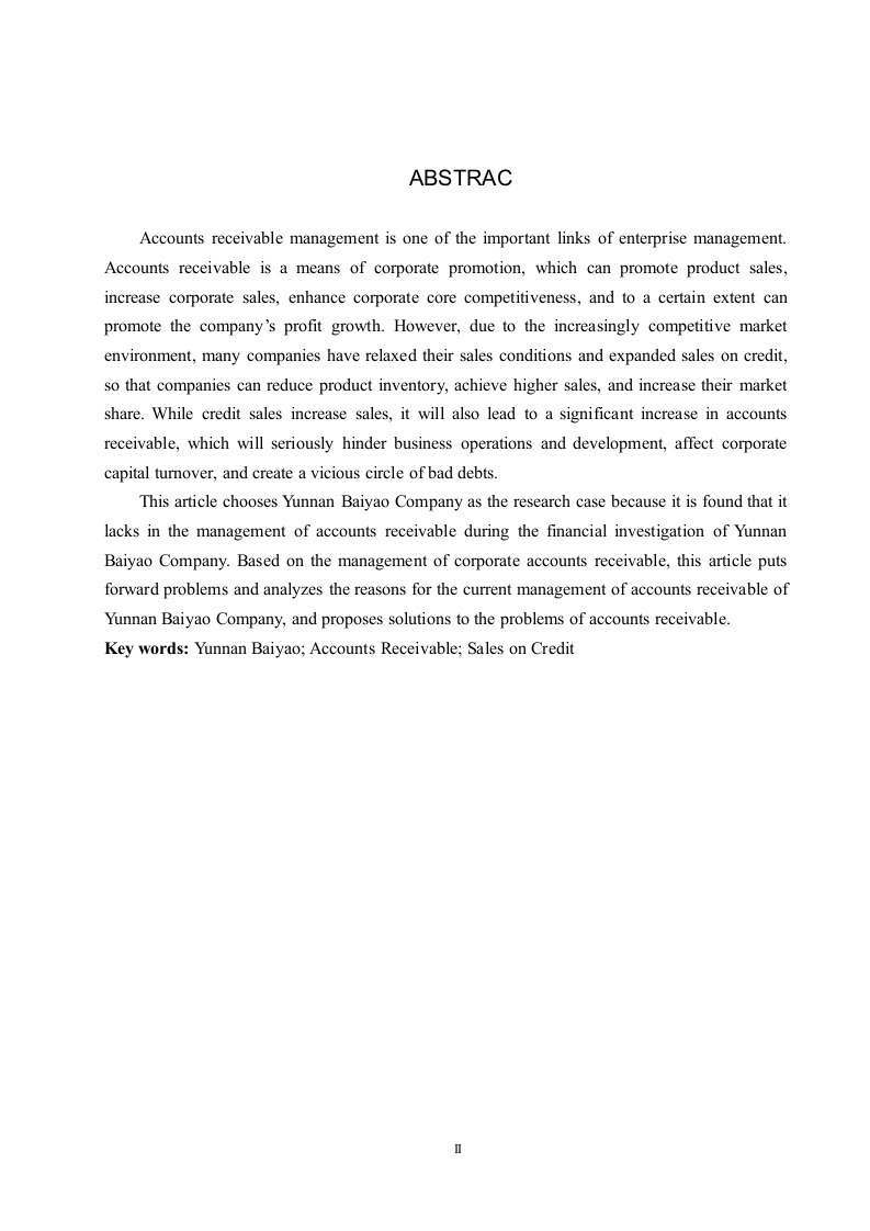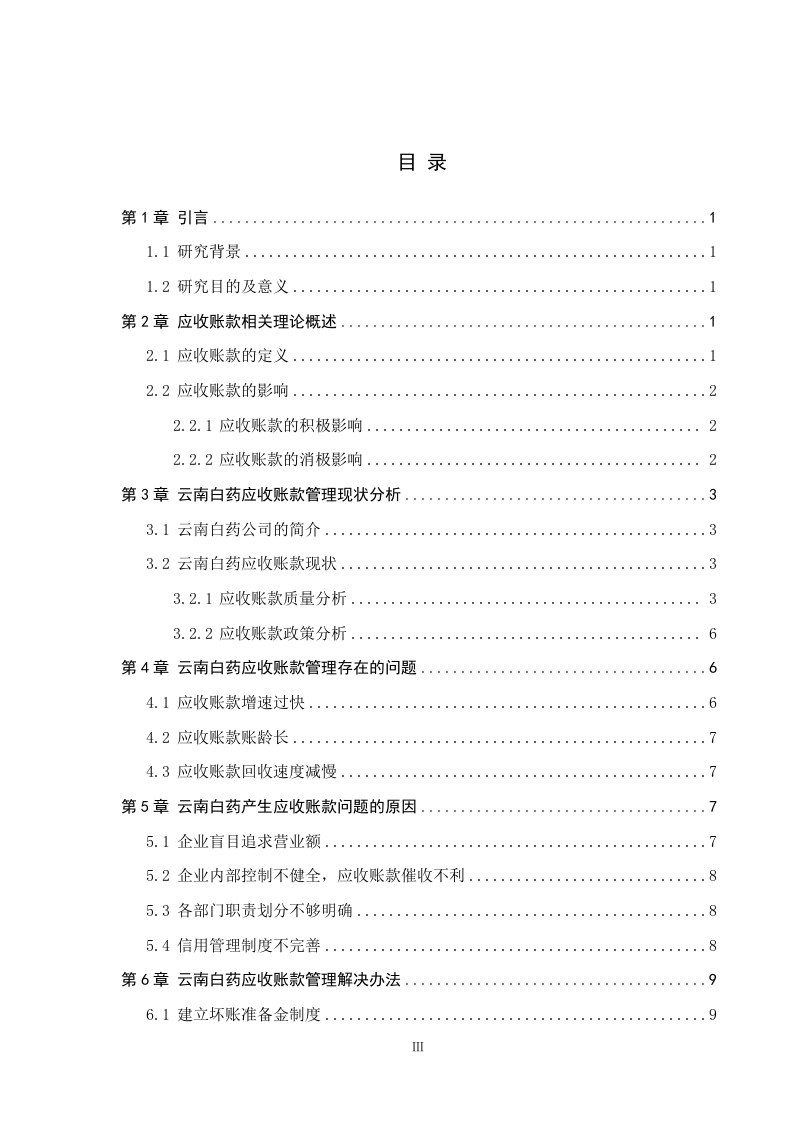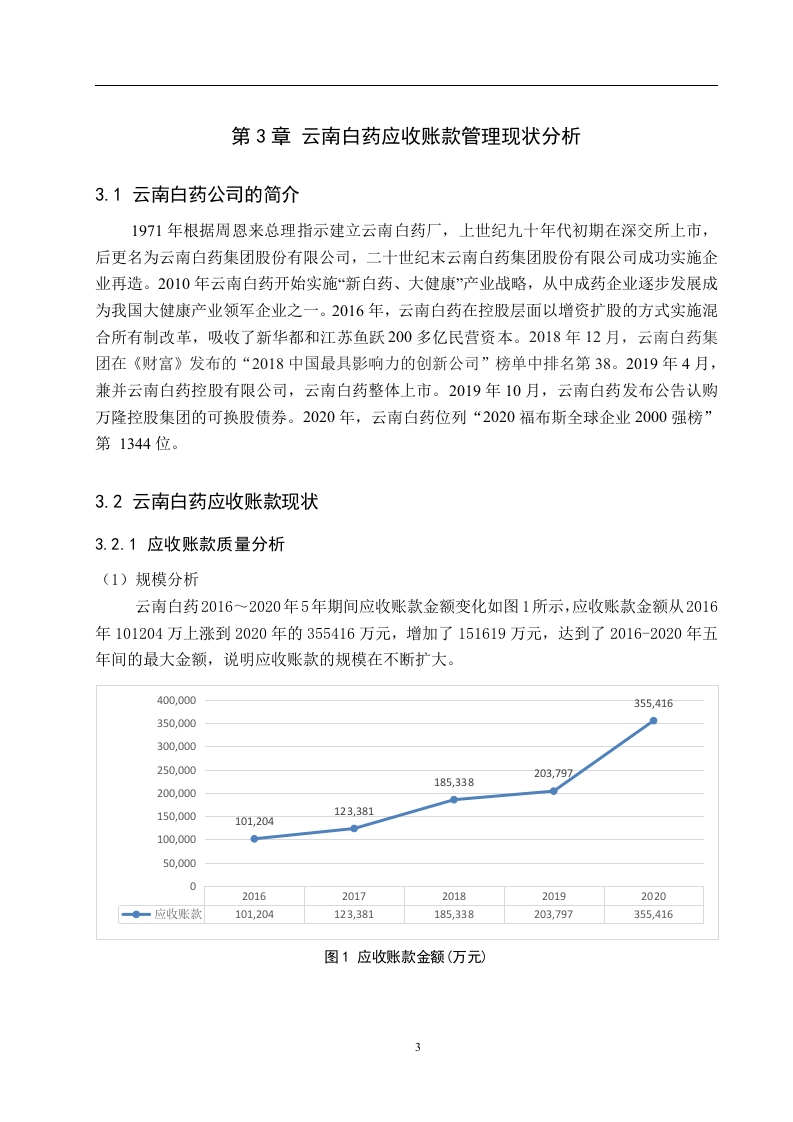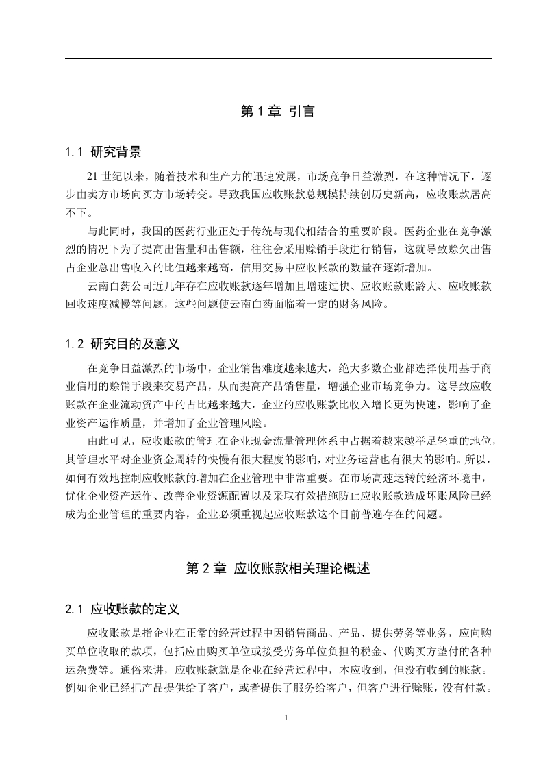 云南白药应收账款管理研究摘要应收账款管理是企业管理的重要环节之一。应收账款是企业促销的一种手段,能促进产品销量,提高企业销售额,增强企业核心竞争力,在一定程度上可以促进公司的利润增长。但是迫于竞争日益激烈的市场环境,许多企业放宽了销售条件,并扩大了赊销销售量,以便企业降低产品库存,更高的实现销售额,增加企业市场占有率。赊销增加了销售额的同时,也会导致应收帐款显著增加,这会严重阻碍业务运营和发展,影响企业资金周转,并造成不良坏账恶性循环。本文选用云南白药公司为研究案例,是因为在针对云南白药公司财务调查过程中发现其对于应收账款的管理有所欠缺。本文以企业应收账款管理为背景,针对目前云南白药公司应收账款的管理提出问题及分析原因,并为应收账款的问题提出解决方案。关键词:云南白药:应收账款:赊销1ABSTRACAccounts receivable management is one of the important links of enterprise management.Accounts receivable is a means of corporate promotion,which can promote product sales,increase corporate sales,enhance corporate core competitiveness,and to a certain extent canpromote the company's profit growth.However,due to the increasingly competitive marketenvironment,many companies have relaxed their sales conditions and expanded sales on credit,so that companies can reduce product inventory,achieve higher sales,and increase their marketshare.While credit sales increase sales,it will also lead to a significant increase in accountsreceivable,which will seriously hinder business operations and development,affect corporatecapital turnover,and create a vicious circle of bad debts.This article chooses Yunnan Baiyao Company as the research case because it is found that itlacks in the management of accounts receivable during the financial investigation of YunnanBaiyao Company.Based on the management of corporate accounts receivable,this article putsforward problems and analyzes the reasons for the current management of accounts receivable ofYunnan Baiyao Company,and proposes solutions to the problems of accounts receivable.Key words:Yunnan Baiyao;Accounts Receivable;Sales on Credit目录第1章引言...1.1研究背景1.2研究目的及意义....第2章应收账款相关理论概述..12.1应收账款的定义...2.2应收账款的影响......22.2.1应收账款的积极影响.22.2.2应收账款的消极影响..2第3章云南白药应收账款管理现状分析.33.1云南白药公司的简介.....33.2云南白药应收账款现状...33.2.1应收账款质量分析....。3.2.2应收账款政策分析...。。。。。。。6第4章云南白药应收账款管理存在的问题….64.1应收账款增速过快....4.2应收账款账龄长...…74.3应收账款回收速度减慢....7第5章云南白药产生应收账款问题的原因..·5.1企业盲目追求营业额....…5.2企业内部控制不健全,应收账款催收不利..……85.3各部门职责划分不够明确...。….85.4信用管理制度不完善第6章云南白药应收账款管理解决办法….96.1建立坏账准备金制度...·96.2加强内部控制,完善应收账款催收制度..96.3明确各个部门的职责,相互协作..….106.4完善应收账款信用管理制度.....……10...12参考文献...13致谢..…….14