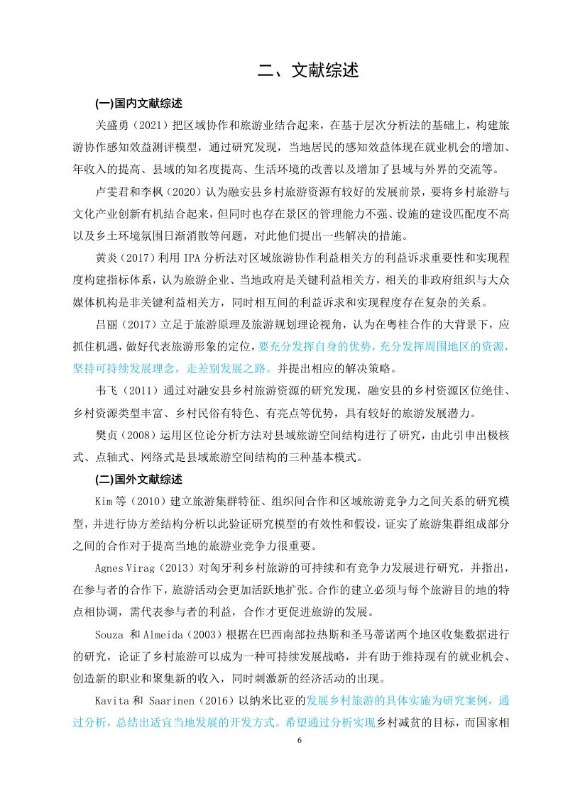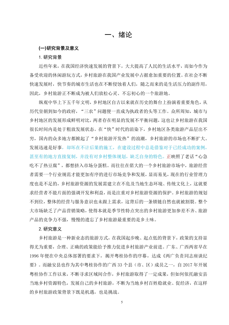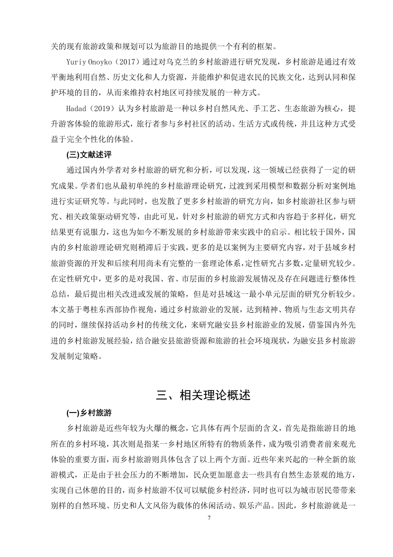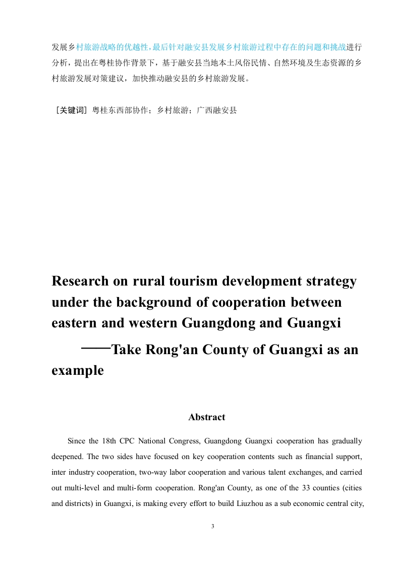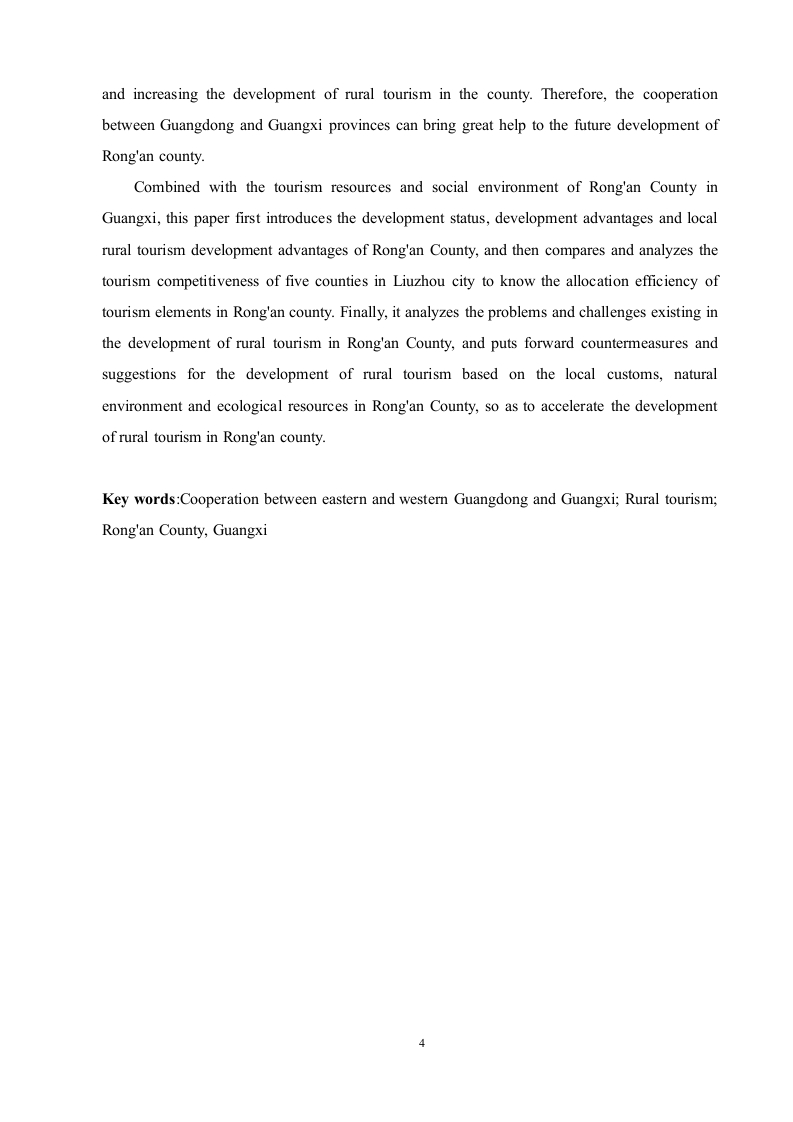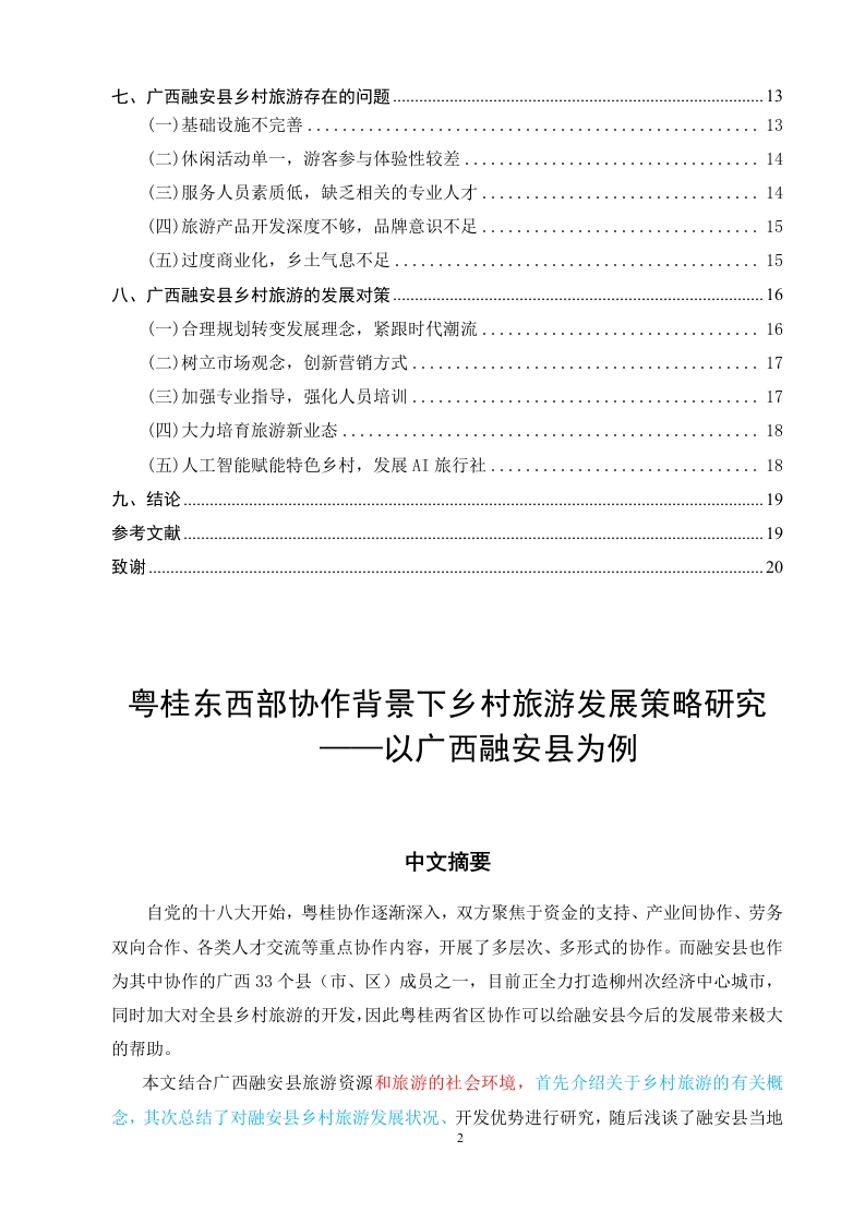 粤桂东西部协作背景下乡村旅游发展策略研究以广西融安县为例目录中文摘要2Abstract.一、绪论3.25(一)研究背景及意义51.研究背景.………分2.研究意义…5二、文献综述….6(一)国内文献综述....6(二)国外文献综述.·6(三)文献述评三、相关理论概述.7(一)乡村旅游..……>(二)粤桂东西部协作内容...·8(三)体验旅游理论........·.(四)旅游可持续发展理论四、广西融安县乡村旅游开发优势9()自然环境...........91.优越的地理位置..92.丰富的旅游资源93.便利的交通条件10(二)经济环境........101.日渐完善的基础设施102.优良的投资环境...……。10(三)人文环境11(四)政策环境.……11五、广西融安县乡村旅游发展现状.11(一)积极推进旅游项目.....·.11(二)开发民宿项目.…12(三)带动就业创业12六、广西融安县发展乡村旅游的优势.12(一)政府政策的大力扶持12(二)便捷的交通.………13(三)广阔的客源市场..·13(四)当地民众发展乡村旅游的意愿强烈.…13(五)丰富的乡村旅游资源.………14七、广西融安县乡村旅游存在的问题13(一)基础设施不完善....……13(二)休闲活动单一,游客参与体验性较差..14(三)服务人员素质低,缺乏相关的专业人才14(四)旅游产品开发深度不够,品牌意识不足15(五)过度商业化,乡土气息不足..15八、广西融安县乡村旅游的发展对策.16(一)合理规划转变发展理念,紧跟时代潮流..·..16(二)树立市场观念,创新营销方式.....17(三)加强专业指导,强化人员培训..·17(四)大力培育旅游新业态......18(五)人工智能赋能特色乡村,发展AI旅行社18九、结论19参考文献.19致谢….20粤桂东西部协作背景下乡村旅游发展策略研究以广西融安县为例中文摘要自党的十八大开始,粤桂协作逐渐深入,双方聚焦于资金的支持、产业间协作、劳务双向合作、各类人才交流等重点协作内容,开展了多层次、多形式的协作。而融安县也作为其中协作的广西33个县(市、区)成员之一,目前正全力打造柳州次经济中心城市,同时加大对全县乡村旅游的开发,因此粤桂两省区协作可以给融安县今后的发展带来极大的帮助。本文结合广西融安县旅游资源和旅游的社会环境,首先介绍关于乡村旅游的有关概念,其次总结了对融安县乡村旅游发展状况、开发优势进行研究,随后浅谈了融安县当地发展乡村旅游战略的优越性,最后针对融安县发展乡村旅游过程中存在的问题和挑战进行分析,提出在粤桂协作背景下,基于融安县当地本土风俗民情、自然环境及生态资源的乡村旅游发展对策建议,加快推动融安县的乡村旅游发展。[关键词]粤桂东西部协作:乡村旅游:广西融安县Research on rural tourism development strategyunder the background of cooperation betweeneastern and western Guangdong and Guangxi-Take Rong'an County of Guangxi as anexampleAbstractSince the 18th CPC National Congress,Guangdong Guangxi cooperation has graduallydeepened.The two sides have focused on key cooperation contents such as financial support,inter industry cooperation,two-way labor cooperation and various talent exchanges,and carriedout multi-level and multi-form cooperation.Rong'an County,as one of the 33 counties (citiesand districts)in Guangxi,is making every effort to build Liuzhou as a sub economic central city,3and increasing the development of rural tourism in the county.Therefore,the cooperationbetween Guangdong and Guangxi provinces can bring great help to the future development ofRong'an county.Combined with the tourism resources and social environment of Rong'an County inGuangxi,this paper first introduces the development status,development advantages and localrural tourism development advantages of Rong'an County,and then compares and analyzes thetourism competitiveness of five counties in Liuzhou city to know the allocation efficiency oftourism elements in Rong'an county.Finally,it analyzes the problems and challenges existing inthe development of rural tourism in Rong'an County,and puts forward countermeasures andsuggestions for the development of rural tourism based on the local customs,naturalenvironment and ecological resources in Rong'an County,so as to accelerate the developmentof rural tourism in Rong'an county.Key words:Cooperation between eastern and western Guangdong and Guangxi;Rural tourism;Rong'an County,Guangxi4