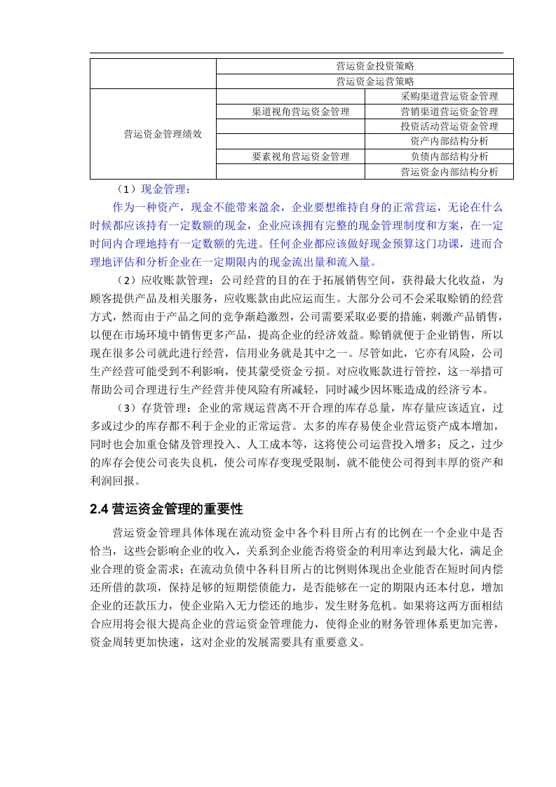 制造企业营运资金管理研究一以海尔为例目录目录1绪论…2营运资金管理概述…2.1营运资金的含义12.2营运资金管理的含义…2.3营运资金管理的内容..12.4营运资金管理的重要性.…。23海尔集团营运资金管理的现状及存在的问题33.1海尔集团简介….332海尔集团营运资金管理的现状分析….333海尔集团营运资金管理存在的问题…。.64海尔集团营运资金管理的对策及建议.84.1寻找新的投资途径、合理安排资金持有量.84.2合理加强应收账款管理..84.3健全存货的控制与管理…94.4建立新的营运资金管理业绩评价体系10研究结论…致谢…2参考文献…131绪论随着我国电器产业的逐渐增多,电器行业之间的相互竞争也变得越来越激烈,财务管理在企业经营过程中的地位越来越重要,其中最重要的便是营运资金的管理。过去几年各企业都加大了生产导致很多企业存在存货滞留,为扩大销售企业会通过赊销的形式进行销售,大额的赊销账款,应收账款回收不易,且极易产生呆账坏账情形,较长的回收周期以及日益增长的债务规模成为增加企业资金流转难度的重要因素,影响了企业资金的使用和资金的流动性。货币资金、存货、应收账款构成了企业营运资金最重要的组成部分,要想提高企业的营运资金管理能力,企业拥有合理的营运资金也就必不可少,并且提高营运资金的周转率和资金使用效率是十分必要。海尔集团是一家主营家电的生产企业,随着近几年家电行业的不景气,海尔集团在资金管理、存货管理及应收账款管理方面都存在一定的不足,如何提升自身的营运资金管理是海尔必须解决的问题,因此本文的研究具有重要的意义。2营运资金管理概述2.1营运资金的含义营运资金又被叫作营运资本,企业必须运用这些资金来维持自身的正常生产经营管理活动。营运资金指的是流动资产刨除流动负债后的差额,如果营运资金的数额为正数则意味着长期负债提供了流动资产中的一些资金,短时间内不必偿还这些资金,营运资金本身的数额越多企业的财务水平也就稳定,它的财务风险也就越小。2.2营运资金管理的含义本文涉及的营运资金管理,事实上是采取科学的方法方式科学地调整和优化使用营运资金的方法和方向的管理活动。营运资金管理旨在强化对流动负债以及流动资产部分的管理,调整重点指的是加快应收账款、存货、现金的周转速度,尽可能地降低过分占用资金的情况,削减占用资金的成本,凭借本身的商业信用破解短时间内资金周转困难的问题,而且适时从银行获得信用贷款,通过财务杠杆增加自身的权益资本报酬率。2.3营运资金管理的内容营运资金是企业重要的组成部分,对营运资金的管理也有不同的观点和内容,不同角度得出的结果是不一样的,下表统计了营运资金管理的主要内容:表1营运资金管理主要内容现金管理营运资金管理内容存货管理应收账款管理营运资金管理策略营运资金筹资策略营运资金投资策略营运资金运营策略采购渠道营运资金管理渠道视角营运资金管理营销渠道营运资金管理投资活动营运资金管理营运资金管理绩效资产内部结构分析要素视角营运资金管理负债内部结构分析营运资金内部结构分析(1)现金管理:作为一种资产,现金不能带来盈余,企业要想维持自身的正常营运,无论在什么时候都应该持有一定数额的现金,企业应该拥有完整的现金管理制度和方案,在一定时间内合理地持有一定数额的先进。任何企业都应该做好现金预算这门功课,进而合理地评估和分析企业在一定期限内的现金流出量和流入量。(2)应收账款管理:公司经营的目的在于拓展销售空间,获得最大化收益,为顾客提供产品及相关服务,应收账款由此应运而生。大部分公司不会采取赊销的经营方式,然而由于产品之间的竞争渐趋激烈,公司需要采取必要的措施,刺激产品销售,以便在市场环境中销售更多产品,提高企业的经济效益。赊销就便于企业销售,所以现在很多公司就此进行经营,信用业务就是其中之一。尽管如此,它亦有风险,公司生产经营可能受到不利影响,使其蒙受资金亏损。对应收账款进行管控,这一举措可帮助公司合理进行生产经营并使风险有所减轻,同时减少因坏账造成的经济亏本。(3)存货管理:企业的常规运营离不开合理的库存总量,库存量应该适宜,过多或过少的库存都不利于企业的正常运营。太多的库存易使企业营运资产成本增加,同时也会加重仓储及管理投入、人工成本等,这将使公司运营投入增多:反之,过少的库存会使公司丧失良机,使公司库存变现受限制,就不能使公司得到丰厚的资产和利润回报。2.4营运资金管理的重要性营运资金管理具体体现在流动资金中各个科目所占有的比例在一个企业中是否恰当,这些会影响企业的收入,关系到企业能否将资金的利用率达到最大化,满足企业合理的资金需求:在流动负债中各科目所占的比例则体现出企业能否在短时间内偿还所借的款项,保持足够的短期偿债能力,是否能够在一定的期限内还本付息,增加企业的还款压力,使企业陷入无力偿还的地步,发生财务危机。如果将这两方面相结合应用将会很大提高企业的营运资金管理能力,使得企业的财务管理体系更加完善,资金周转更加快速,这对企业的发展需要具有重要意义。3海尔集团营运资金管理的现状及存在的问题3.1海尔集团简介海尔集团成立于1984年,主营家电