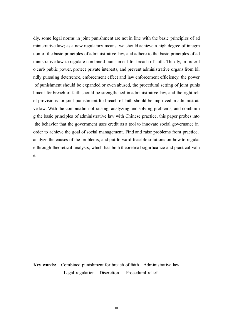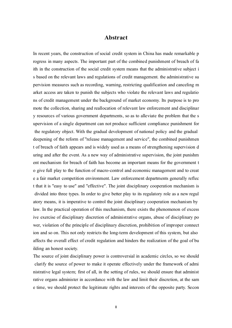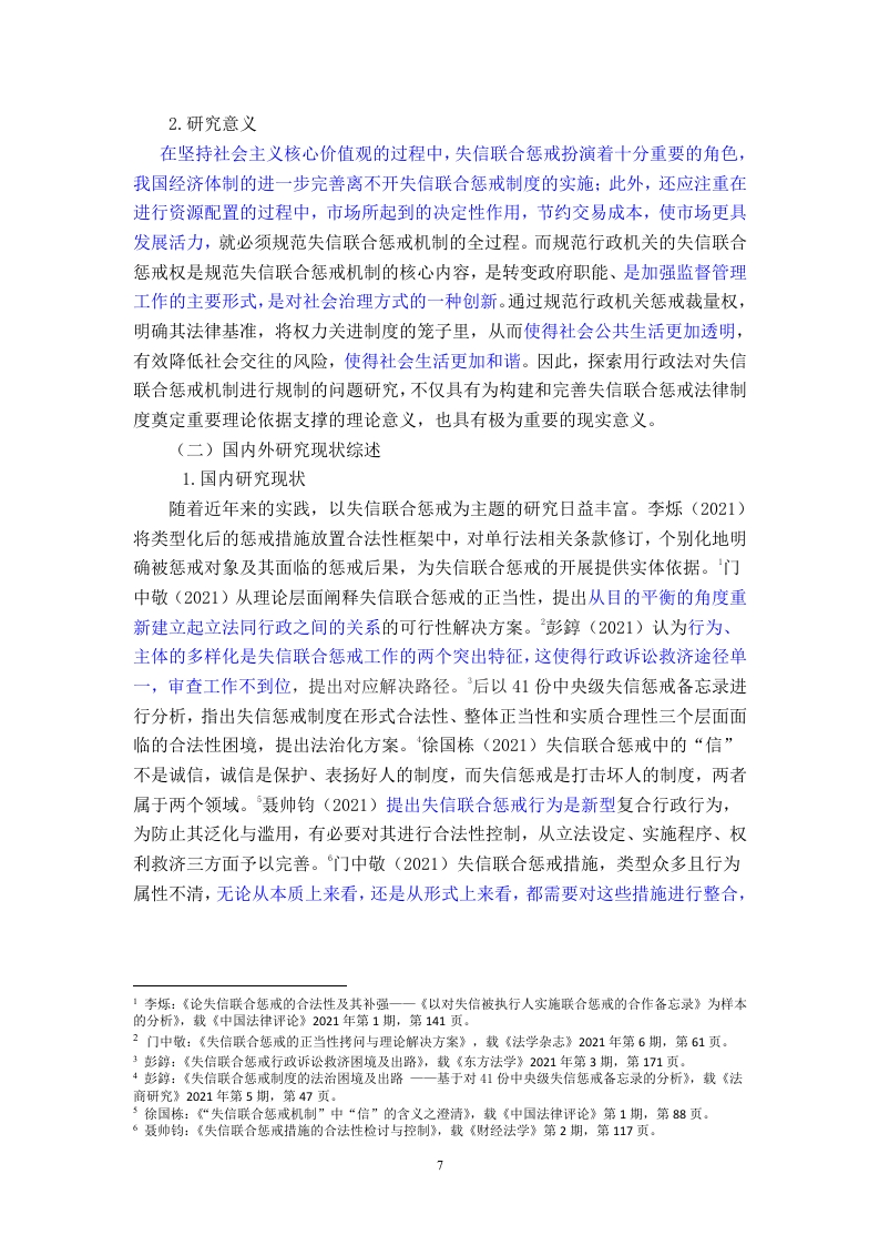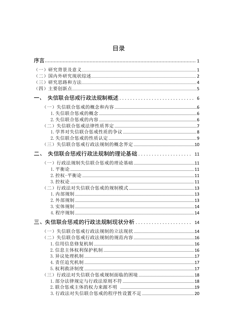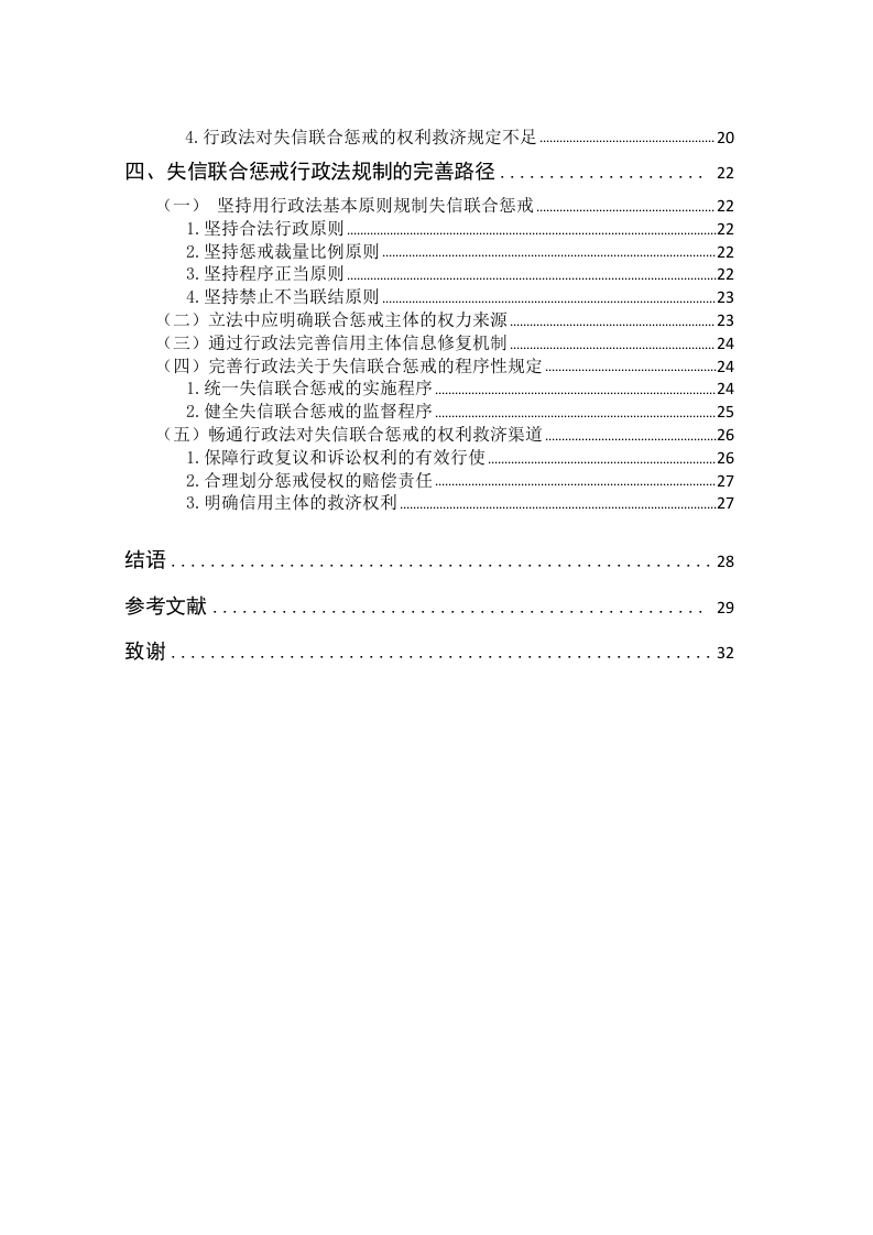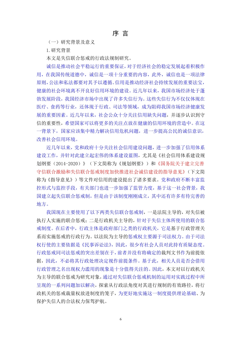 中文摘要近年来,我国社会信用体系建设在诸多方面取得了显著进步。在该体系中,失信联合惩戒是其重要的内容之一,所谓失信联合惩戒,指的是行政部门依照信用管理法,针对于违法行为进行记录并予以警告,基于市场经济环境,如果出现了违反相关规定的行为,需要对其做出惩罚。其目的是促进政府各部门相关执法和惩戒资源的汇总、共享和重新配置,以此来缓解单个部门监管无法对规制对象产生足够合规惩戒的问题。随着国家政策的层层递进,“放管服”改革的逐步深入,失信联合惩戒作为加强事中、事后监管手段出现并被广泛运用。失信联合惩戒机制作为行政监管的新方式,已经成为了政府发挥宏观调控经济管理职能,创造公正市场竞争环境的重要手段,执法部门普遍反映其“好用”“管用”。联合惩戒合作机制分为三种,为更好发挥其作为新型监管手段的规制作用,对联合惩戒合作机制进行法律控制势在必行。在该机制的实践运作中,存在行政机关的惩戒裁量权过度行使,惩戒权被滥用的现象,违反了惩戒裁量原则、禁止不当联结原则等。这不仅制约这一制度的长远发展,而且会影响信用规制的整体效果,阻滞诚信社会建设目标的实现,需要引起高度关注。联合惩戒权力的来源在学界有一定争议,应明确权力来源,使其在行政法制框架下有效运行:第一,设置相关规则时,行政部门应坚持依法行政原则,对自由裁量权加以限制,并采取相关措施对相对人权益加以保障。第二,联合惩戒中的部分法律规范与行政法基本原则不符:作为新兴手段,联合惩戒权力应该同行政法的基本原则相统一,坚持用行政法基本原则规制失信联合惩戒。再次,为了遏制公权、保护私益,防止行政机关一味追求威慑力、施行效果、执法效率而扩大甚至滥用惩戒权,应加强行政法对失信联合惩戒的程序性设置,完善行政法对失信联合惩戒的权利教济规定。将提出问题、分析问题与解决问题相结合,行政法基本原理与中国实践相结合,对政府运用信用这一工具进行创新社会治理以实现社会管理的目标这一行为进行详细探究。从实践中发现问题、提出问题,分析其中出现问题的原因,并通过理论上的分析对如何进行规制提出可行的解决方案,既有理论意义又有实践价值。关键词:失信联合惩戒行政法法律规制裁量权程序救济AbstractIn recent years,the construction of social credit system in China has made remarkable progress in many aspects.The important part of the combined punishment of breach of faith in the construction of the social credit system means that the administrative subject is based on the relevant laws and regulations of credit management.the administrative supervision measures such as recording,warning,restricting qualification and canceling market access are taken to punish the subjects who violate the relevant laws and regulations of credit management under the background of market economy.Its purpose is to promote the collection,sharing and reallocation of relevant law enforcement and disciplinary resources of various government departments,so as to alleviate the problem that the supervision of a single department can not produce sufficient compliance punishment forthe regulatory object.With the gradual development of national policy and the gradualdeepening of the reform of"release management and service",the combined punishment of breach of faith appears and is widely used as a means of strengthening supervision during and after the event.As a new way of administrative supervision,the joint punishment mechanism for breach of faith has become an important means for the government to give full play to the function of macro-control and economic management and to create a fair market competition environment.Law enforcement departments generally reflect that it is "easy to use"and "effective".The joint disciplinary cooperation mechanism isdivided into three types.In order to give better play to its regulatory role as a new regulatory means,it is imperative to control the joint disciplinary cooperation mechanism bylaw.In the practical operation of this mechanism,there exists the phenomenon of excessive exercise of disciplinary discretion of administrative organs,abuse of disciplinary power,violation of the principle of disciplinary discretion,prohibition of improper connection and so on.This not only restricts the long-term development of this system,but alsoaffects t