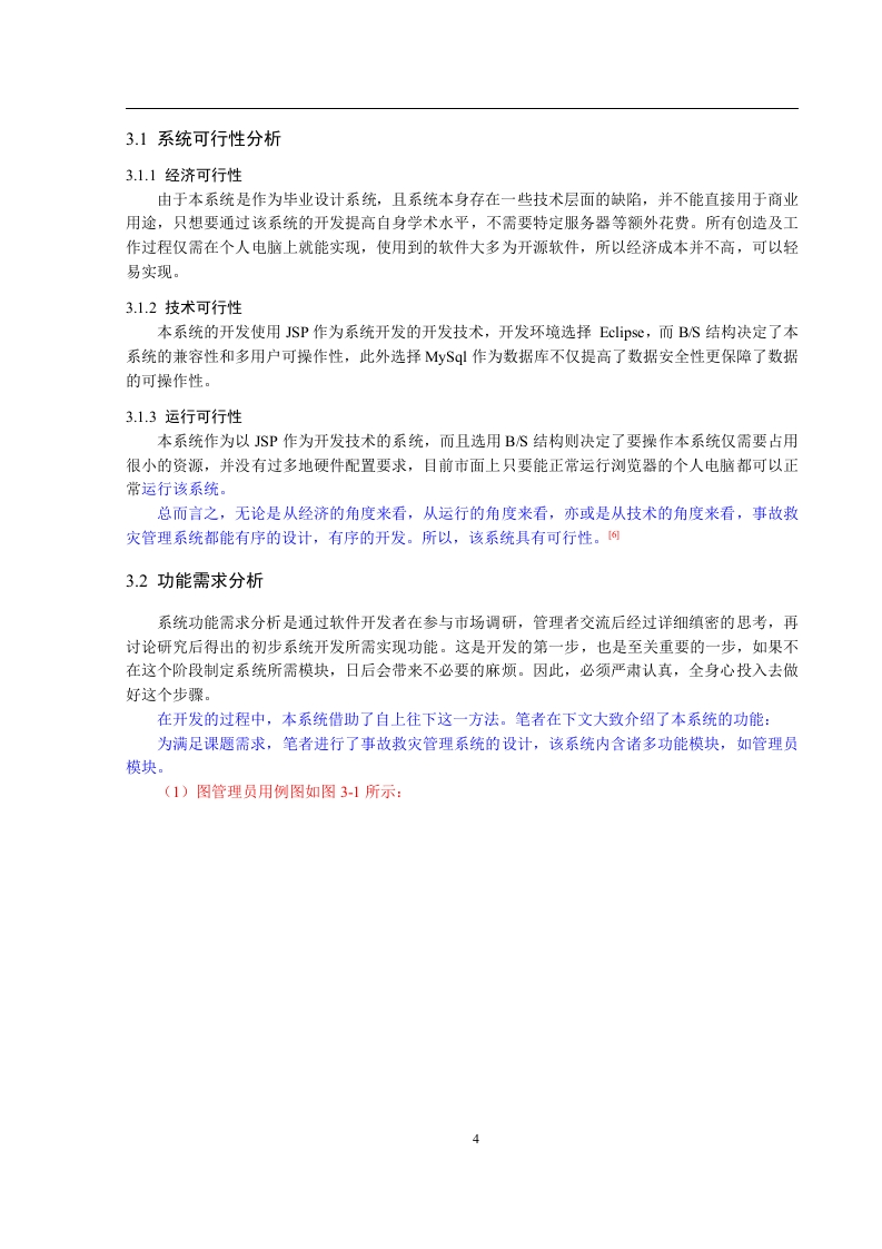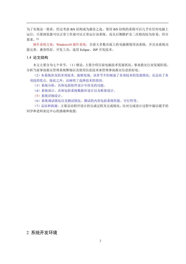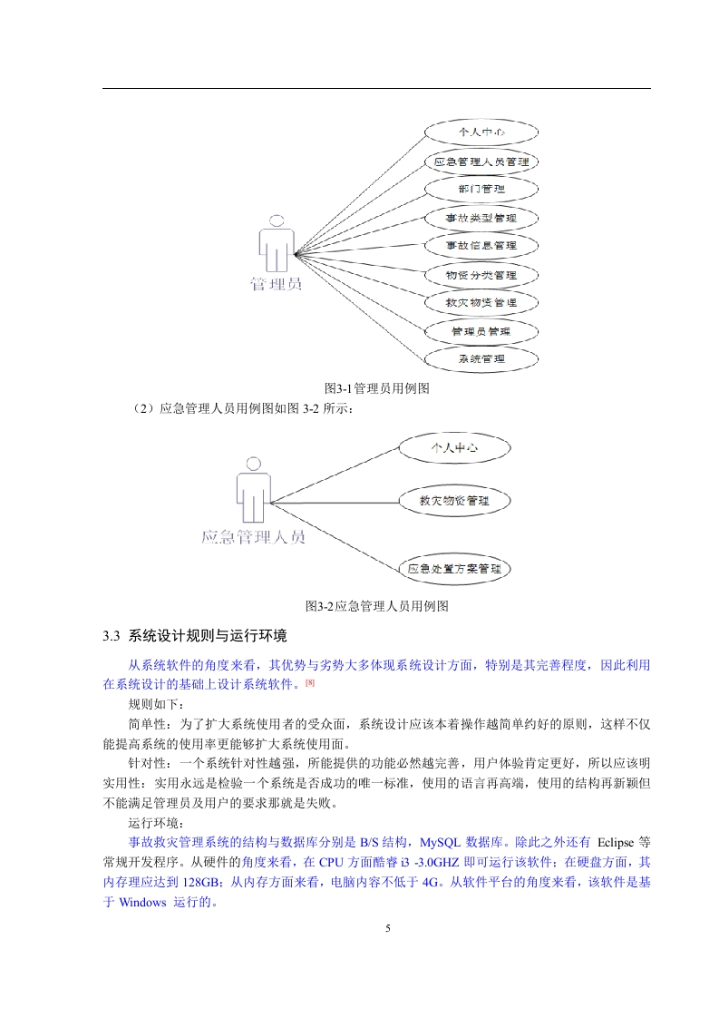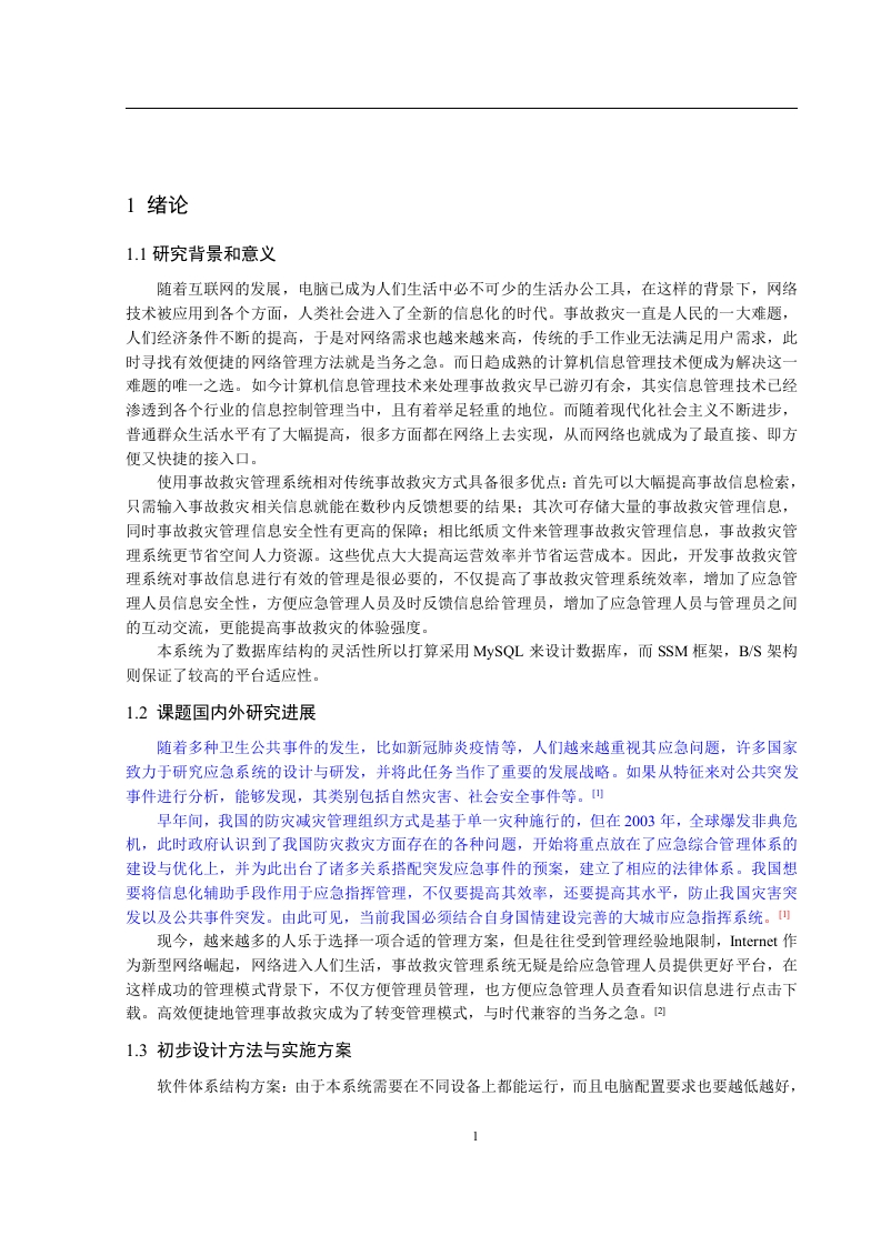 事故救灾管理系统的设计与实现【摘要】随我国的经济与科技迅速发展,城市化建设也越发深入,随之而来的是城市安全问题的加剧,能够发现,当前我国各类安全事故的出现频率依旧很高,如2020年3月在泉州发生的酒店坍塌事件。若在发生此类重大事故后,迅速传达事故信息,合理安排效助人员和物资,可以诚少事故对生命、对产和环境的危害。任何系统都要遵循系统设计的基本流程,本系统也不例外,同样需要经过市场调研,需求分析,概要设计,详细设计,编码,测试这些步骤,基于JSP技术设计并实现了事故数灾管理系统的基础是B/S即所谓浏览器/服务器模式,该系统包含了SSM框架,其后台数据库为ySQL。事故数灾系统由多个部分构成,包括个人中心、应急管理人员管理、部门管理、事故类型管理、事故信息管理、物资分类管理、效灾物资管理、应急处置方案管理、系统管理等功能模块。提高了事故效灾物资分配、人员管理以及信息传递的效率。【关键词】事故数灾管理系统:JSP技术:ySQL数据库:SSM框架1绪论1.1研究背景和意义随着互联网的发展,电脑己成为人们生活中必不可少的生活办公工具,在这样的背景下,网络技术被应用到各个方面,人类社会进入了全新的信息化的时代。事故救灾一直是人民的一大难题,人们经济条件不断的提高,于是对网络需求也越来越来高,传统的手工作业无法满足用户需求,此时寻找有效便捷的网络管理方法就是当务之急。而日趋成熟的计算机信息管理技术便成为解决这难题的唯一之选。如今计算机信息管理技术来处理事故救灾早已游刃有余,其实信息管理技术已经渗透到各个行业的信息控制管理当中,且有着举足轻重的地位。而随着现代化社会主义不断进步,普通群众生活水平有了大幅提高,很多方面都在网络上去实现,从而网络也就成为了最直接、即方便又快捷的接入口。使用事故救灾管理系统相对传统事故救灾方式具备很多优点:首先可以大幅提高事故信息检索,只需输入事故救灾相关信息就能在数秒内反馈想要的结果:其次可存储大量的事故救灾管理信息,同时事故救灾管理信息安全性有更高的保障:相比纸质文件来管理事故救灾管理信息,事故救灾管理系统更节省空间人力资源。这些优点大大提高运营效率并节省运营成本。因此,开发事故救灾管理系统对事故信总进行有效的管理是很必要的,不仅提高了事故救灾管理系统效率,增加了应急管理人员信息安全性,方便应急管理人员及时反馈信息给管理员,增加了应急管理人员与管理员之间的互动交流,更能提高事故救灾的体验强度。本系统为了数据库结构的灵活性所以打算采用MySQL来设计数据库,而SSM框架,B/S架构则保证了较高的平台适应性。1.2课题国内外研究进展随着多种卫生公共事件的发生,比如新冠肺炎疫情等,人们越来越重视其应急问题,许多国家致力于研究应急系统的设计与研发,并将此任务当作了重要的发展战略。如果从特征来对公共突发事件进行分析,能够发现,其类别包括自然灾害、社会安全事件等。山早年间,我国的防灾减灾管理组织方式是基于单一灾种施行的,但在2003年,全球爆发非典危机,此时政府认识到了我国防灾救灾方面存在的各种问题,开始将重点放在了应急综合管理体系的建设与优化上,并为此出台了诸多关系搭配突发应急事件的预案,建立了相应的法律体系。我国想要将信息化辅助手段作用于应急指挥管理,不仅要提高其效率,还要提高其水平,防止我国灾害突发以及公共事件突发。由此可见,当前我国必须结合自身国情建设完善的大城市应急指挥系统。现今,越来越多的人乐于选择一项合适的管理方案,但是往往受到管理经验地限制,Internet作为新型网络崛起,网络进入人们生活,事故救灾管理系统无疑是给应急管理人员提供更好平台,在这样成功的管理模式背景下,不仅方便管理员管理,也方便应急管理人员查看知识信息进行点击下载。高效便捷地管理事故救灾成为了转变管理模式,与时代兼容的当务之急。冈1.3初步设计方法与实施方案软件体系结构方案:由于本系统需要在不同设备上都能运行,而且电脑配置要求也要越低越好,为了实现这一要求,经过考虑BS结构成为最佳之选。使用BS结构的系统可以几乎在任何电脑上运行,只要浏览器可以正常工作就可以正常运行该系统,而且后期维护及二次修改较为容易,符合要求。操作系统方案:Windows10操作系统,目前大多数市面上的电脑都使用该系统,并且该系统功能完善,兼容性好。开发工具:选用Eclipse、JSP开发技术。1.4论文结构本文主要分为七个章节,(1)绪论,主要介绍目前电脑技术发展状况、事故救灾行业发展阶段,分析当前事故救灾管理系统弊端以及使用信息技术来管理事故救灾信息的好处。(2)本系统涉及的多项技术。能够发现,该章节不但阐述了各项技术的发展情况,还总结了各项技的优点。除此之外,还阐明了选择技术的原因。(3)系统分析,具体包括软件设计中涉及的功能。(4)系统设计,具体包括系统数据库设计以及框架设计。(5)系统详细设计。(6)系统调试情况以及测试情况,测试的内容包括系统性能、可行性等。(7)总结和致谢。主要总结程序设计的完成过程及完成情况,比对完成设计过程中施以援手的同学和老师表达中心的感谢和祝愿。2系统开发环境22.1JSP技术介绍翻阅相关资料可知,JSP技术来源于Sun