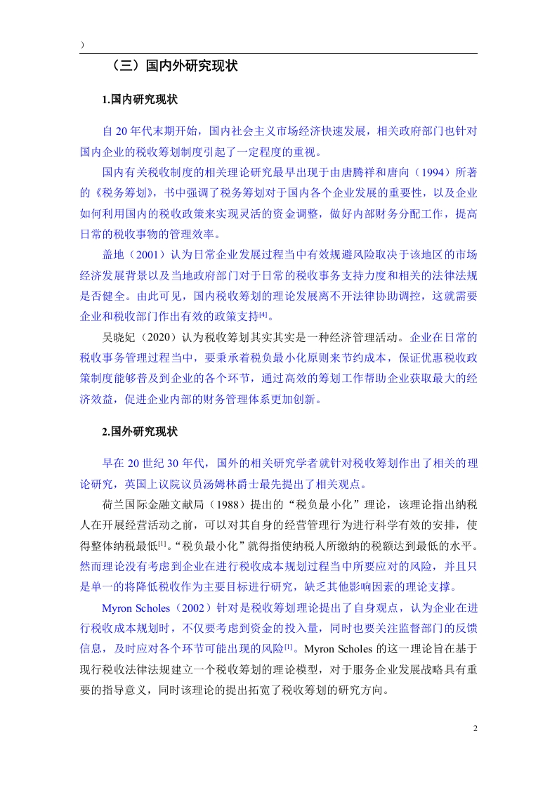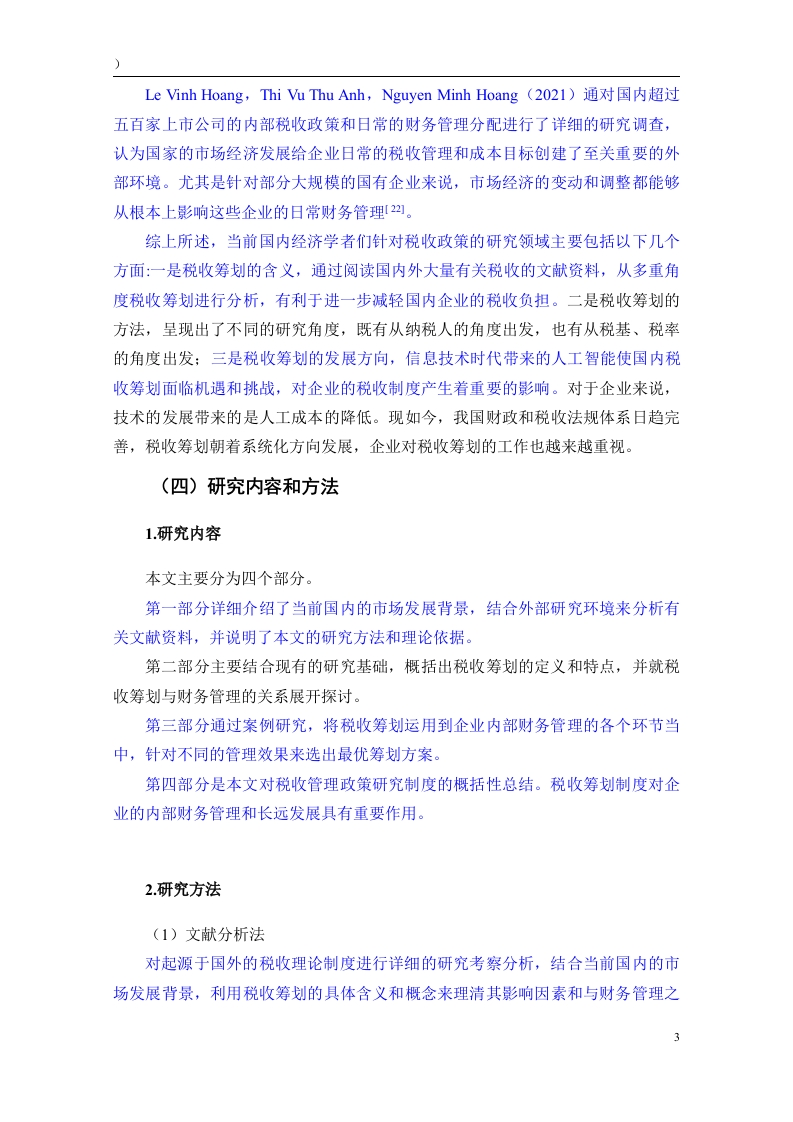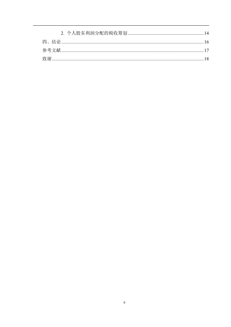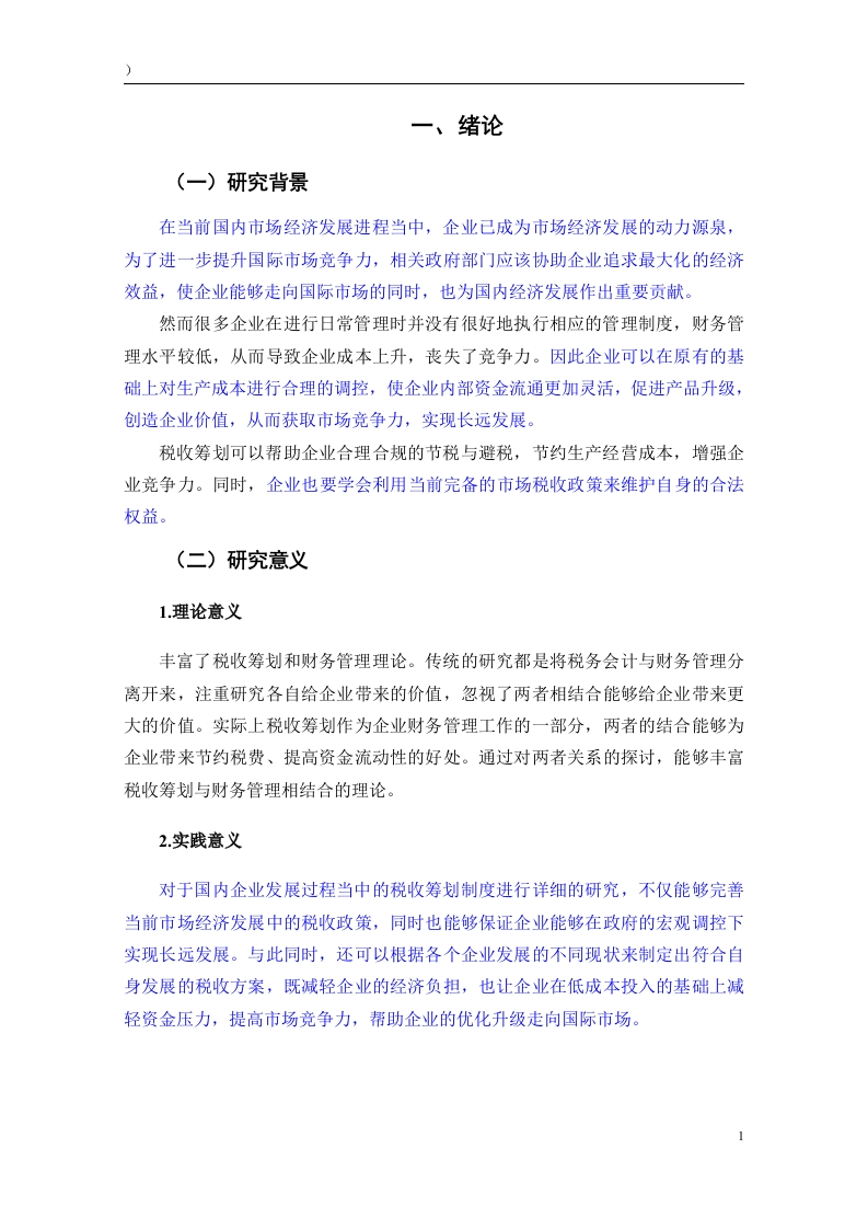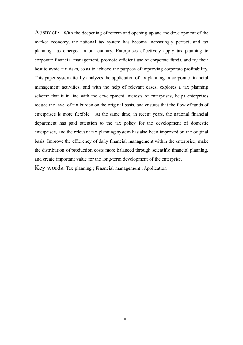 税收筹划在企业财务管理中的应用研究摘要:随着改革开放的深入推进和市场经济的发展,国家税收制度日益完善,税收筹划在我国应运而生。企业将税收筹划有效运用到企业财务管理工作之中,促使企业资金得到高效利用,并尽力规避税收风险,以达到提升企业盈利水平的目的。本文通过系统分析税收筹划在企业财务管理活动中的应用,并借助相关案例,探索出符合企业发展利益的税收筹划方案,帮助企业在原有的基础上降低税负水平,保证企业的资金流通更加灵活。与此同时,近年来国家财政部门已经对国内企业发展的税收政策引起了重视,相关税收筹划制度也在原有的基础上更加完善,企业要结合良好的市场发展背景和政府的税收财务政策来有效提升企业内部财务管理效率,通过科学的税收筹划使企业生产成本分配更加均衡,为企业的长远发展创造重要价值。关键词:税收筹划:财务管理:应用IAbstract:With the deepening of reform and opening up and the development of themarket economy,the national tax system has become increasingly perfect,and taxplanning has emerged in our country.Enterprises effectively apply tax planning tocorporate financial management,promote efficient use of corporate funds,and try theirbest to avoid tax risks,so as to achieve the purpose of improving corporate profitability.This paper systematically analyzes the application of tax planning in corporate financialmanagement activities,and with the help of relevant cases,explores a tax planningscheme that is in line with the development interests of enterprises,helps enterprisesreduce the level of tax burden on the original basis,and ensures that the flow of funds ofenterprises is more flexible..At the same time,in recent years,the national financialdepartment has paid attention to the tax policy for the development of domesticenterprises,and the relevant tax planning system has also been improved on the originalbasis.Improve the efficiency of daily financial management within the enterprise,makethe distribution of production costs more balanced through scientific financial planning,and create important value for the long-term development of the enterprise.Key words:Tax planning Financial management Application目录一、绪论n(一)研究背景(二)研究意义…1.理论意义。2.实践意义…(三)国内外研究现状1.国内研究现状2.国外研究现状…2(四)研究内容和方法.31.研究内容2.研究方法.…3二、税收筹划与企业财务管理概述.5(一)税收筹划概述…。51.税收筹划的定义.52.税收筹划的特点…53.税收筹划的基本方法5(二)税收筹划与企业财务管理的关系1.税收筹划与企业财务管理目标的关系.62税收筹划与企业财务管理职能的关系6三、税收筹划在企业财务管理中的应用.8(一)筹资活动中的税收筹划.8(二)投资活动中的税收筹划..101.投资地点选择的税收筹划….102.投资方法选择的税收筹划...10(三)经营活动中的税收筹划.121.生产活动中的税收筹划……122.销售活动中的税收筹划..13(四)分配活动中的税收筹划...141.法人股东利润分配的税收筹划..142.个人股东利润分配的税收筹划0000000000000000000000四、结论….16参考文献.171j。a4n4444444444444444444444444444444444444444444444444444444484X