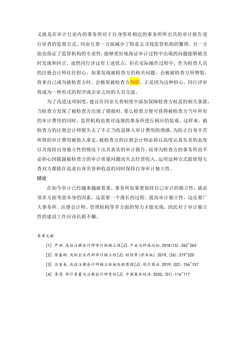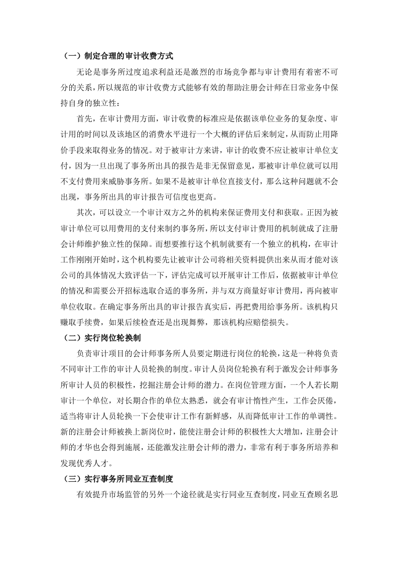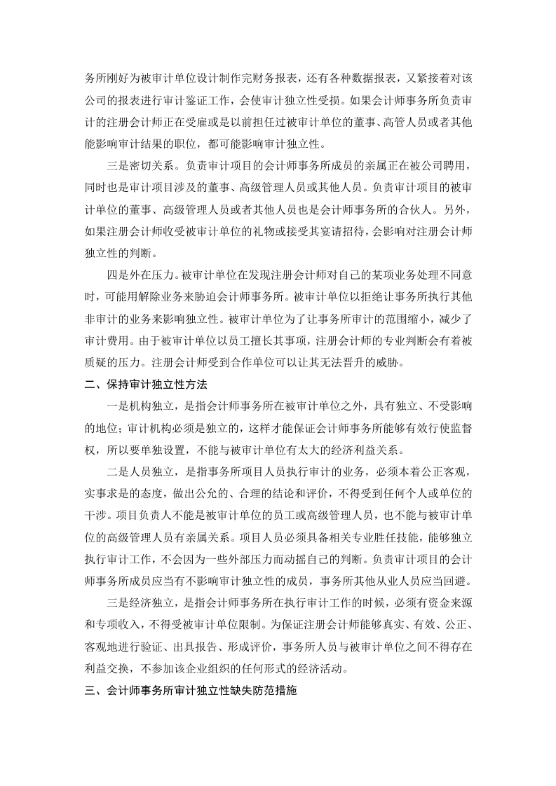 探究会计师事务所审计的独立性湖州新力会计师事务所朱向东摘要:审计独立性作为会计师事务所注册会计师必须具备的核心素质,从审计出现的时候开始,独立性便贯穿在审计业务之中。不管是投资者还是债权人等报表的使用者都会通过查看审计报告了解、改善、监督被审计公司的经营情况。如果事务所因为审计独立性的缺失出具了不可信的审计报告,这会给被审计单位带来很大的损失,过多的失败案例还会使注册会计师的公信力受损,同时还会影响该注册会计师所在事务所的信誉。为了审计可以市场中健康发展,审计独立性的提高就是首要问题。关键词:审计独立性:注册会计师:会计师事务所事务所在审计的过程中保持独立性以及真实性是其立身之所,同时也是每一个注册会计师最为重要的职业素养。因此,对于每一份报告的独立性都会影响注册会计师以及所审计工作质量的可信度,是对审计事件中相关利益人员利益的最佳保证。因此这就需要注册会计师在审计工作过程中要保持绝对的独立性,这也是审计工作需要遵守的一项准则。精神上独立就是指注册会计师在进行对某一被审计单位展开工作时,要保证自己的独立姿态,一定要从公正客观的角度出发帮助委托单位收集审计证据,坚定自己的内心,坚持恪守审计准则,不能因惧怕各方面的压力而出具虚假的报告,合理的谨慎的对被审计单位进行评价。实质上独立就是指注册会计师自己身份要保持独立,与客户不可以有经济、利益等会损害审计独立性的联系,比如直系的亲属关系等。一、影响会计师事务所审计独立性主要因素一是自身利益。如果会计师事务所负责审计项目的成员在其负责项目的被审计单位之中有直接利益关系,那么审计独立性便会受到影响。会计师事务所一般都会有长时间合作的客户,这种客户合作时间长,事务所的利润也高,如果事务所依赖收入,害怕失去重要合伙人,也会影响审计独立性。还有负责审计工作项目的会计师事务所成员恰好与被审计企业有业务联系。这种业务联系会影响项目成员的利益,也会影响审计的独立性。会计师事务所没有和被审计单位签订费用协议,因为事务所害怕收不到审计费用,这些最后都会影响审计的独立性。二是自我评价。会计师事务所的业务不只是审计,还有制作报表等,如果事务所刚好为被审计单位设计制作完财务报表,还有各种数据报表,又紧接着对该公司的报表进行审计鉴证工作,会使审计独立性受损。如果会计师事务所负责审计的注册会计师正在受雇或是以前担任过被审计单位的董事、高管人员或者其他能影响审计结果的职位,都可能影响审计独立性。三是密切关系。负责审计项目的会计师事务所成员的亲属正在被公司聘用,同时也是审计项目涉及的董事、高级管理人员或其他人员。负责审计项目的被审计单位的董事、高级管理人员或者其他人员也是会计师事务所的合伙人。另外,如果注册会计师收受被审计单位的礼物或接受其宴请招待,会影响对注册会计师独立性的判断。四是外在压力。被审计单位在发现注册会计师对自己的某项业务处理不同意时,可能用解除业务来胁迫会计师事务所。被审计单位以拒绝让事务所执行其他非审计的业务来影响独立性。被审计单位为了让事务所审计的范围缩小,减少了审计费用。由于被审计单位以员工擅长其事项,注册会计师的专业判断会有着被质疑的压力。注册会计师受到合作单位可以让其无法晋升的威胁。二、保持审计独立性方法一是机构独立,是指会计师事务所在被审计单位之外,具有独立、不受影响的地位:审计机构必须是独立的,这样才能保证会计师事务所能够有效行使监督权,所以要单独设置,不能与被审计单位有太大的经济利益关系。二是人员独立,是指事务所项目人员执行审计的业务,必须本着公正客观,实事求是的态度,做出公允的、合理的结论和评价,不得受到任何个人或单位的干涉。项目负责人不能是被审计单位的员工或高级管理人员,也不能与被审计单位的高级管理人员有亲属关系。项目人员必须具备相关专业胜任技能,能够独立执行审计工作,不会因为一些外部压力而动摇自己的判断。负责审计项目的会计师事务所成员应当有不影响审计独立性的成员,事务所其他从业人员应当回避。三是经济独立,是指会计师事务所在执行审计工作的时候,必须有资金来源和专项收入,不得受被审计单位限制。为保证注册会计师能够真实、有效、公正、客观地进行验证、出具报告、形成评价,事务所人员与被审计单位之间不得存在利益交换,不参加该企业组织的任何形式的经济活动。三、会计师事务所审计独立性缺失防范措施(一)制定合理的审计收费方式无论是事务所过度追求利益还是激烈的市场竞争都与审计费用有着密不可分的关系,所以规范的审计收费方式能够有效的帮助注册会计师在日常业务中保持自身的独立性:首先,在审计费用方面,审计收费的标准应是依据该单位业务的复杂度、审计用的时间以及该地区的消费水平进行一个大概的评估后来制定,从而防止用降价手段来取得业务的情况。对于被审计方来讲,审计的收费不应让被审计单位支付,因为一旦出现了事务所出具的报告是非无保留意见,那被审计单位就可以用不支付费用来威胁事务所。如果不是被审计单位直接支付,那
