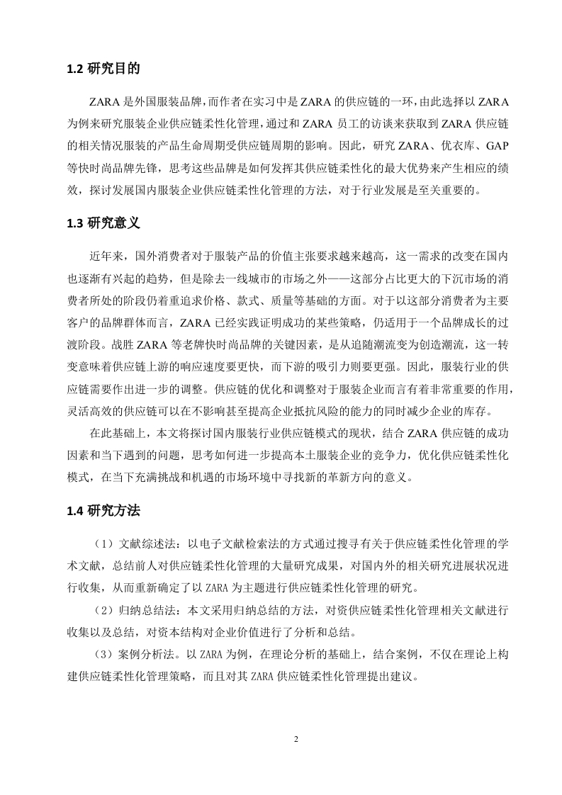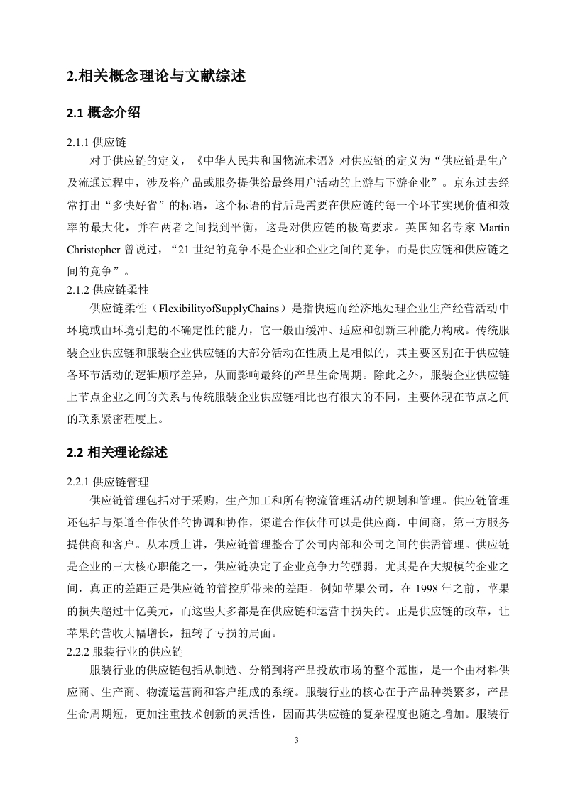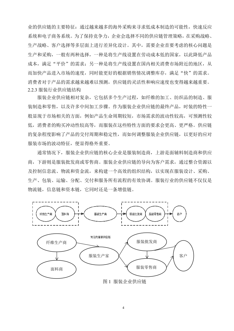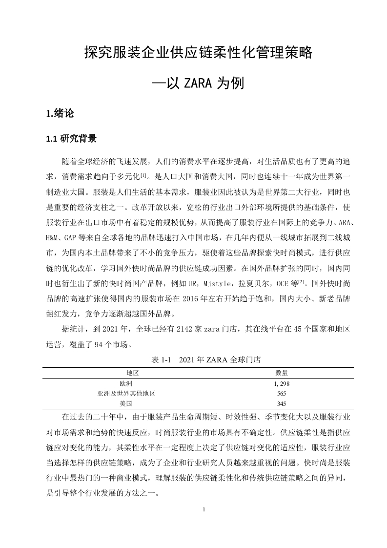 探究服装企业供应链柔性化管理策略一以ZA【A为例摘要:随着市场的扩大,服装产业在快速发展,同时也遇到了产能过剩、反应滞后等诸多挑战,主要的原因是大多数服装企业没有一套成熟的供应链管理模式,因此服装企业供应链模式的发展与转型需要得到更多的关注。供应链柔性是服装企业供应链处理变化的能力,其柔性水平在一定程度上决定了供应链面对变化时的适应性。因此,研究时尚服装企业供应链柔性显得尤为重要,良好的供应链是服装企业在激烈的市场竞争脱颖而出的基础。本文采用文献综述法以及案例分析法,以电子文献检索法的方式通过搜寻有关于供应链柔性化管理的学术文献,从而重新确定了以ZARA为主题进行供应链柔性化管理的研究。在理论分析的基础上,对ZARA的现状以及供应链模式进行分析,通过与优衣库供应链管理模式进行对比,得出ZARA的供应链柔性化管理模式的优势,对此提出完善服装企业柔性化供应链管理、提高服装企业供应链风险管理、加强服装企业供应链信息共享以及用联合补货机制的优化策略,由此来为服装企业打造协同柔性供应链提供思路。关键词:供应链:服装:柔性化:快速响应目录1.绪论.11.1研究背景0…11.2研究目的21.3研究意义.21.4研究方法022.相关概念理论与文献综述32.1概念介绍.…32.2相关理论综述32.3文献综述.53.ZARA的供应链柔性化管理模式,63.1ZARA的现状分析..63.2ZARA供应链模式分析.73.3Zara与优衣库供应链管理模式的对比....104.ZARA的供应链柔性化管理对于服装业的结论.…134.1促进服装业供应链的发展.134.3优化服装企业的供应链135.服装企业供应链柔性化管理的优化对策.….155.1完善服装企业柔性化供应链管理...155.2提高服装企业供应链风险管理..1553加强服装企业供应链信息共享..165.4采用联合补货机制.….165结论..17参考文献…18致谢.19探究服装企业供应链柔性化管理策略一以ZARA为例1.绪论1.1研究背景随着全球经济的飞速发展,人们的消费水平在逐步提高,对生活品质也有了更高的追求,消费需求趋向于多元化山。是人口大国和消费大国,同时也连续十一年成为世界第一制造业大国。服装是人们生活的基本需求,服装业因此被认为是世界第二大行业,同时也是重要的经济支柱之一。改革开放以来,宽松的行业出口外部环境所提供的基础条件,使服装行业在出口市场中有着稳定的规模优势,从而提高了服装行业在国际上的竞争力。ARA、H&M、GP等来自全球各地的品牌迅速打入中国市场,在几年内便从一线城市拓展到二线城市,为国内本土品牌带来了不小的竞争压力,驱使着这些品牌探索快时尚模式,进行供应链的优化改革,学习国外快时尚品牌的供应链成功因素。在国外品牌扩张的同时,国内同时也衍生出了新的快时尚国产品牌,例如UR,Mjstyle,拉夏贝尔,OCE等2。国外快时尚品牌的高速扩张使得国内的服装市场在2016年左右开始趋于饱和,国内大小、新老品牌翻红发力,竞争力逐渐超越国外品牌。据统计,到2021年,全球已经有2142家zara门店,其在线平台在45个国家和地区运营,覆盖了94个市场。表1-12021年ZARA全球门店地区数量欧洲1,298亚洲及世界其他地区565美国345在过去的二十年中,由于服装产品生命周期短、时效性强、季节变化大以及服装行业对市场需求和趋势的快速反应,时尚服装行业的市场具有不确定性。供应链柔性是指供应链应对变化的能力,其柔性水平在一定程度上决定了供应链对变化的适应性,服装行业应当选择怎样的供应链策略,成为了企业和行业研究人员越来越重视的问题。快时尚是服装行业中最热门的一种商业模式,理解服装的供应链柔性化和传统供应链策略之间的异同,是引导整个行业发展的方法之一。