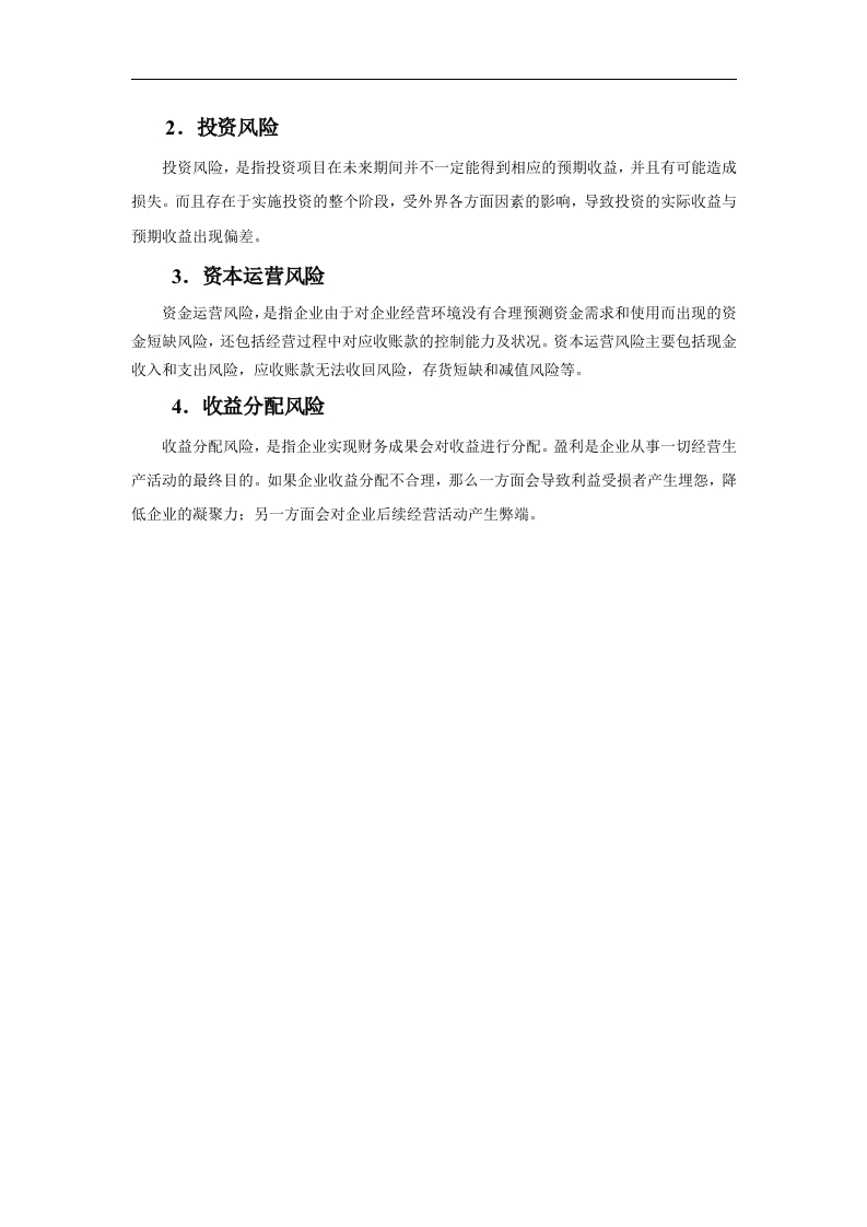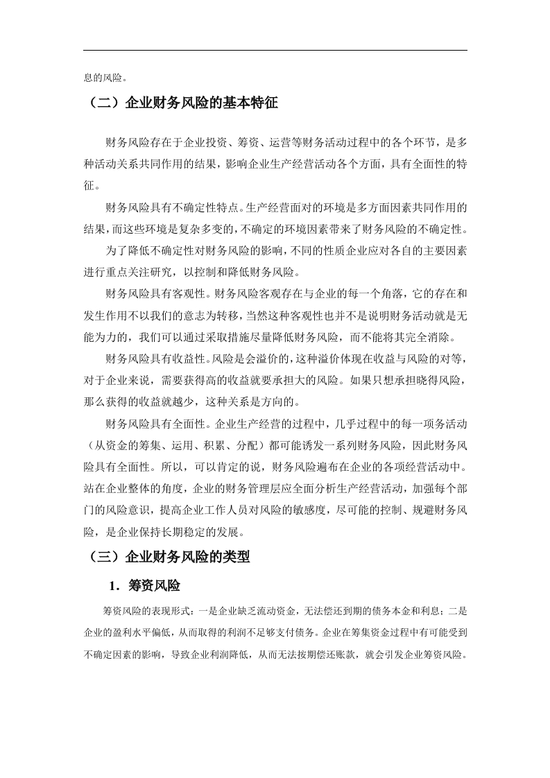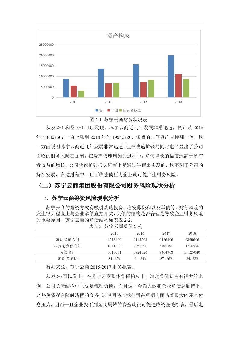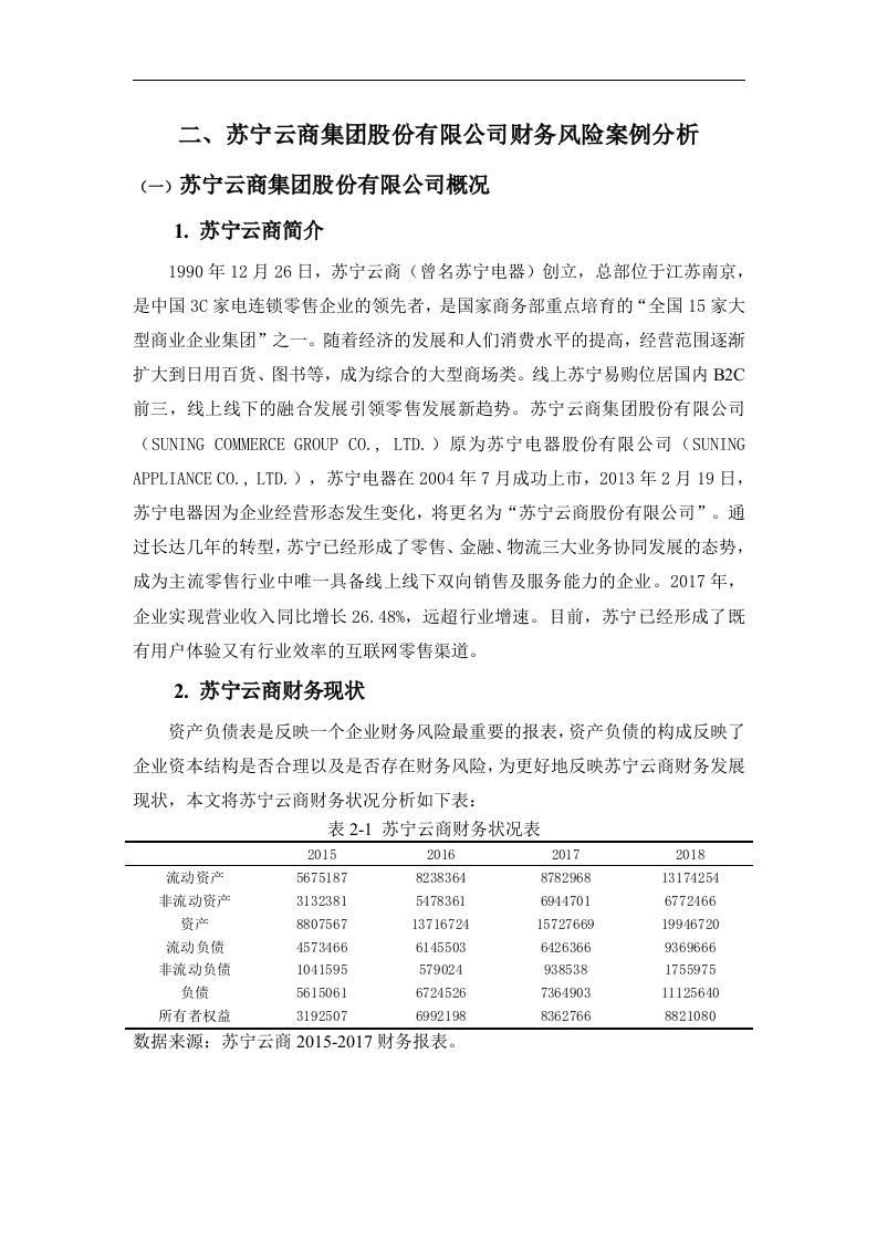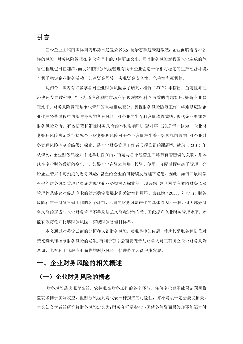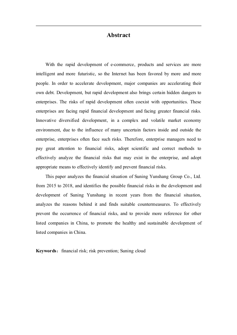 摘要随着电商的迅猛发展,产品与服务呈现出更为智能、更具有未来化的特点,因此互联网受到了越来越多人的青睐,各大企业为了快速发展都在通过举债来加速自己的发展,但快速发展的同时也给企业带来了一定的隐患,快速发展的风险往往与机遇并存,这些企业在快速发展的同时也面临着较大的财务风险在竞争态势越来越激烈,追求创新多元化发展,复杂多变的市场经济环境下,由于企业内外部诸多不确定因素的影响,常会导致企业面临这种风险。因此,企业管理者需要大力重视财务风险,采用科学、正确的方法对企业自身可能存在的财务风险进行有效分析,采取恰当的手段有效地识别并防范财务风险。本文通过对苏宁云商集团股份有限公司2015年至2018财务状况进行分析,从财务状况识别苏宁云商近几年发展发展过程中可能存在的财务风险问题,分析其背后的原因并寻找合适的对策来有效防范财务风险的发生,同时为我国其他上市企业提供更多的参考,促进我国上市公司健康持续地发展。关键词:财务风险:风险防范:苏宁云商AbstractWith the rapid development of e-commerce,products and services are moreintelligent and more futuristic,so the Internet has been favored by more and morepeople.In order to accelerate development,major companies are accelerating theirown debt.Development,but rapid development also brings certain hidden dangers toenterprises.The risks of rapid development often coexist with opportunities.Theseenterprises are facing rapid financial development and facing greater financial risks.Innovative diversified development,in a complex and volatile market economyenvironment,due to the influence of many uncertain factors inside and outside theenterprise,enterprises often face such risks.Therefore,enterprise managers need topay great attention to financial risks,adopt scientific and correct methods toeffectively analyze the financial risks that may exist in the enterprise,and adoptappropriate means to effectively identify and prevent financial risks.This paper analyzes the financial situation of Suning Yunshang Group Co.,Ltd.from 2015 to 2018,and identifies the possible financial risks in the development anddevelopment of Suning Yunshang in recent years from the financial situation,analyzes the reasons behind it and finds suitable countermeasures.To effectivelyprevent the occurrence of financial risks,and to provide more reference for otherlisted companies in China,to promote the healthy and sustainable development oflisted companies in China.Keywords:financial risk;risk prevention;Suning cloud引言当今企业面临的国际国内形势日趋复杂多变,竞争态势越来越激烈,企业面临着各种各样的风险。财务风险管理在企业管理中的地位更加突出,同时财务风险对我国企业造成的危害性程度也日益加深。而良好的财务风险管理有助于企业创造一个相对稳定的生产经济环境,有利于稳定企业财务活动,加速资金周转,实现资金安全性、完整性和赢利性。现如今,国内有许多学者对企业财务风险做了研究,程竹(2017)年指出,当前世界经济快速发展过程中,企业为适应激烈的市场竞争必须依托科学有效的内部管理,提高企业管理水平。财务风险管理是企业管理的重要组成部分,忽视财务风险防范工作,将难以应对企业生产经营过程中内部与外部的各种风险,对企业的生存和发展造成威胁。现代企业要加强财务风险分析,有效防范和消除财务风险的不利影响)。彭湘萍(2017年)认为,企业财务管理风险防范路径探究企业财务管理风险对于企业发展产生着不容忽视的影响,对企业财务管理风险控制策略做出探索,是企业财务管理工作者必须重视的课题阿。熊玮(2016)年认识到,企业财务风险并不是单独存在的,而是与各个经营生产环节有着密切的关联,并体现在企业财务数据的变化上。如果企业在资本筹集、投资、使用、分配过程中疏于管理,会给企业带来不可预期的财务风险,甚至给企业的可持续发展埋下隐患。因此,如何开展科学有效的财务风险管理已经成为现代企业必须深入探索的一项课题,建立科学有效的财务风险管理体系能够对促进企业的健康稳定发展起到关键性作用。秦红梅(2015)年指出,财务风险存在于财务管理工作的各个环节,不同的财务风险产生的具体原因不一样。但大部分财务风险的形成与企业财务管理不善及缺乏风险意识等有关。因此提升企业财务管理水平,才能有效防范并化解财务风险,实现财务管理目标网。本文通过对苏宁云商的分析和认识财务风险,发现其中的问题,并就其采取各种防范对策来避免和控制财务风险的发生。有利于苏宁云商管理者与财务人员正确树立企业财务风险意识,也有利于化解企业面临的财务风险,促进苏宁云商健康发展。一、企业财务风险的相关概述(一)企业财务风险的概念财务风险是客观存在的,它体现在财务工作的各个环节,任何企业都不能保证预期收益就等同于实际收益,但财务风险只是代表一种损失的可能性,并不是说一定会蒙受损失。本文结合学者的研究将财务风险定义为:财务分析是指企业因债务筹资而最终却不能还本付息的风险。(二)企业财务风险的基本特征财务风险存在于企业投资、筹资、运营等财务活动过程中的各个环节,是多种活动关系共同作用的结果,影响企业生产经营活动