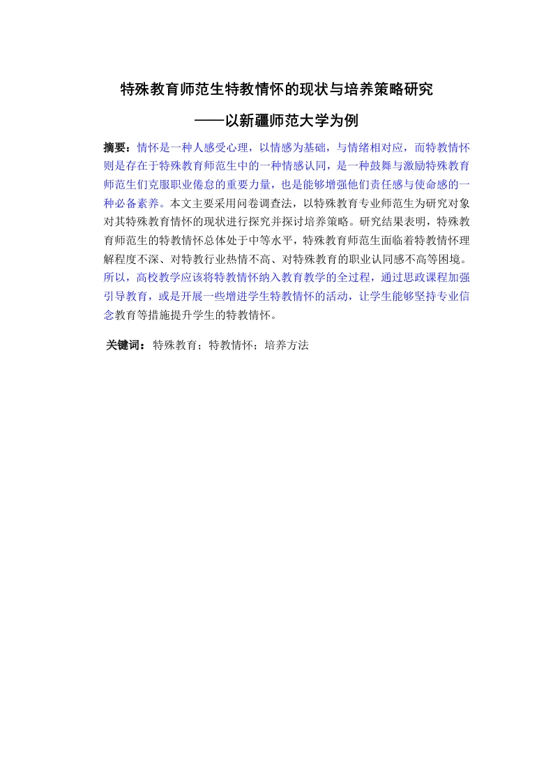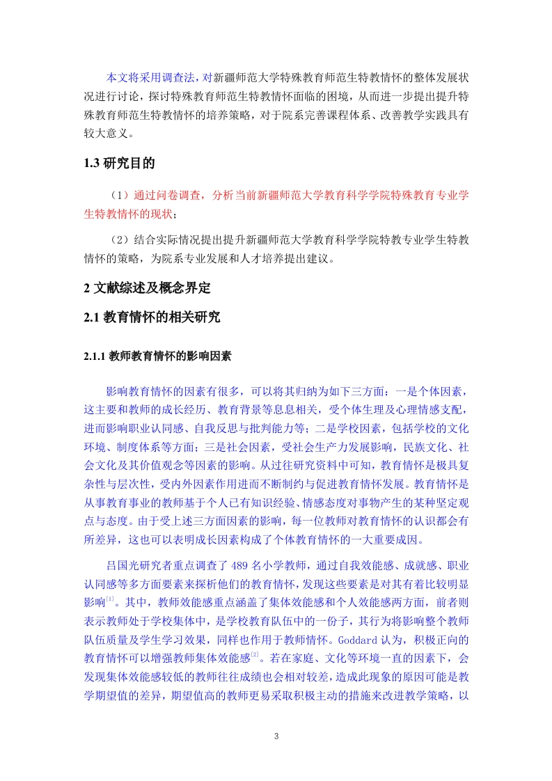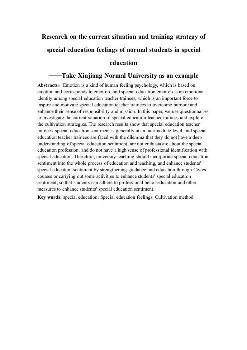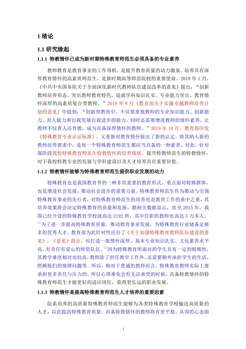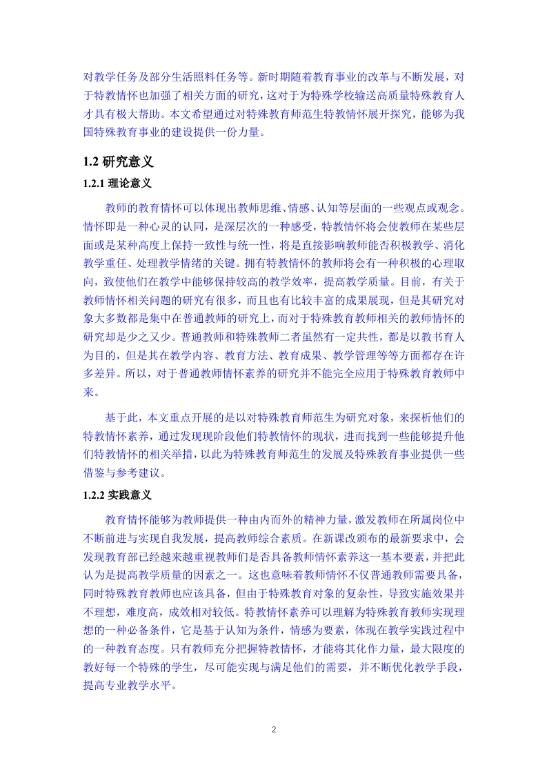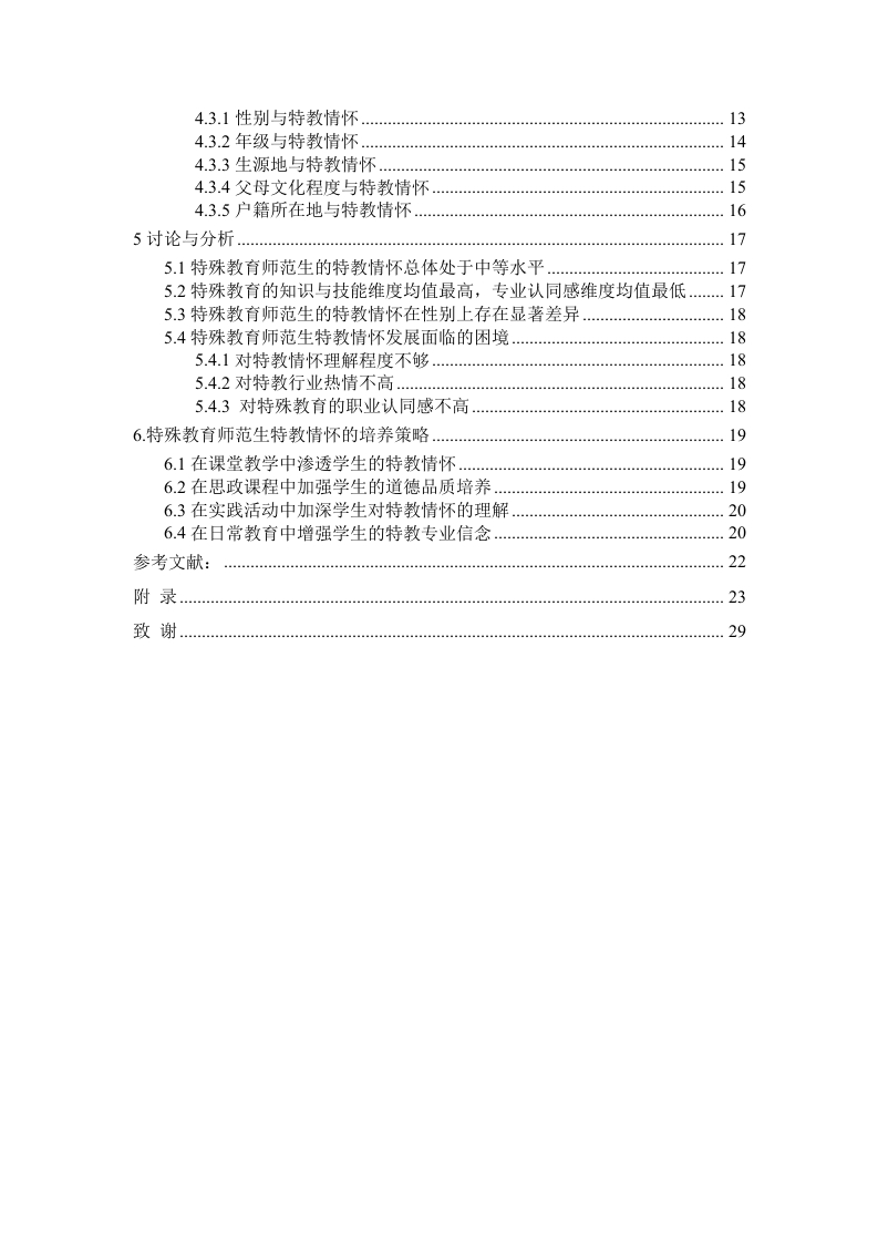 特殊教育师范生特教情怀的现状与培养策略研究目录1绪论.11.1计究缘记.11.1.1特教情怀已成为新时期特殊教育师范生必须具备的专业素养…11.1.2特教情怀能够为特殊教育师范生提供职业发展的动力…11.1.3特教情怀是提高特殊教育师范生人才培养的重要因素…11.2研究意义…21.2.1理论意义.21.2.2实践意义21.3研究目的...32文献综述及概念界定….32.1教育情怀的相关研究.32.1.1教师教育情怀的影响因素32.1.2教师教育情怀的形成52.2特殊教育情怀的概念62.3特教情怀的维度构成62.3.1对特殊儿童的态度62.3.2特殊教育的专业认同感>2.3.3特殊教育的知识与技能2.3.4对特殊教育的职业热情>2.3.5对特殊教育的职业选择.73计究设计.3.1研究对象83.2研究内容4004040404004083.3研究方法83.3.1文献法3.3.2问卷调查法93.4研究工具…94调查结果与分析.104.1调查对象基本情况分析104.2特殊教育师范生特教情怀的现状分析.114.2.1特殊教育师范生特教情怀现状的总体分析114.2.2对特殊儿童的态度维度的现状分析114.2.3特殊教育专业认同感维度的现状分析124.2.4特殊教育的知识与技能维度的现状分析…124.2.5对特殊教育的职业热情维度的现状分析…134.2.6对特殊教育的职业选择维度的现状分析…4.3特殊教育师范生特教情怀在人口学变量上的差异..134.3.1性别与特教情怀134.3.2年级与特教情怀…144.3.3生源地与特教情怀154.3.4父母文化程度与特教情怀…154.3.5户籍所在地与特教情怀165讨论与分析.175.1特殊教育师范生的特教情怀总体处于中等水平.……175.2特殊教育的知识与技能维度均值最高,专业认同感维度均值最低…175.3特殊教育师范生的特教情怀在性别上存在显著差异185.4特殊教育师范生特教情怀发展面临的困境…185.4.1对特教情怀理解程度不够..185.4.2对特教行业热情不高…185.4.3对特殊教育的职业认同感不高.…186.特殊教育师范生特教情怀的培养策略…196.1在课堂教学中渗透学生的特教情怀…196.2在思政课程中加强学生的道德品质培养…196.3在实践活动中加深学生对特教情怀的理解.206.4在日常教育中增强学生的特教专业信念20参考文献:.22附录.23致谢.….29特殊教育师范生特教情怀的现状与培养策略研究一以新疆师范大学为例摘要:情怀是一种人感受心理,以情感为基础,与情绪相对应,而特教情怀则是存在于特殊教育师范生中的一种情感认同,是一种鼓舞与激励特殊教育师范生们克服职业倦怠的重要力量,也是能够增强他们责任感与使命感的一种必备素养。本文主要采用问卷调查法,以特殊教育专业师范生为研究对象对其特殊教育情怀的现状进行探究并探讨培养策略。研究结果表明,特殊教育师范生的特教情怀总体处于中等水平,特殊教育师范生面临着特教情怀理解程度不深、对特教行业热情不高、对特殊教育的职业认同感不高等困境。所以,高校教学应该将特教情怀纳入教育教学的全过程,通过思政课程加强引导教育,或是开展一些增进学生特教情怀的活动,让学生能够坚持专业信念教育等措施提升学生的特教情怀。关键词:特殊教育:特教情怀:培养方法Research on the current situation and training strategy ofspecial education feelings of normal students in specialeducation-Take Xinjiang Normal University as an exampleAbstracts:Emotion is a kind of human feeling psychology,which is based onemotion and corresponds to emotion,and special education emotion is an emotionalidentity among special education teacher trainees,which is an important force toinspire and motivate special education teacher trainees to overcome burnout andenhance their sense of responsibility and mission.In this paper,we use questionnairesto investigate the current situation of special education teacher trainees and explorethe cultivation strategies.The research results show that special education teachertrainees'special education sentiment is generally at an intermediate level,and specialeducation teacher trainees are faced with the dilemma that they do not have a deepunderstanding of special education sentiment,are not enthusiastic about the specialeducation profession,and do not have a high sense of professional identification withspecial education.Therefore,university teaching should incorporate special educationsentiment into the whole process of education and teaching,and enhance students'special education sentiment by strengthening guidance and education through Civicscourses or carrying out some activities to enhance students'special educationsentiment,so that students can adhere to professional belief education and othermeasures to enhance students'special education sentiment.Key words:special education;Special education feelings;Cultivation method
