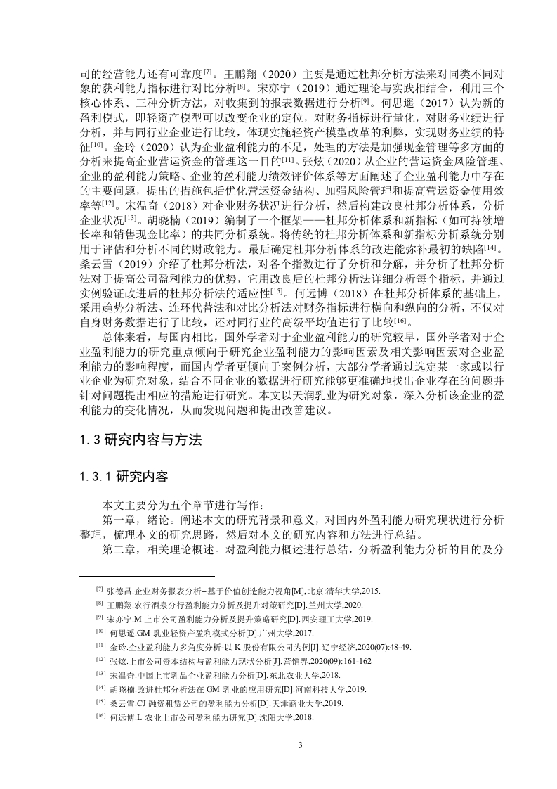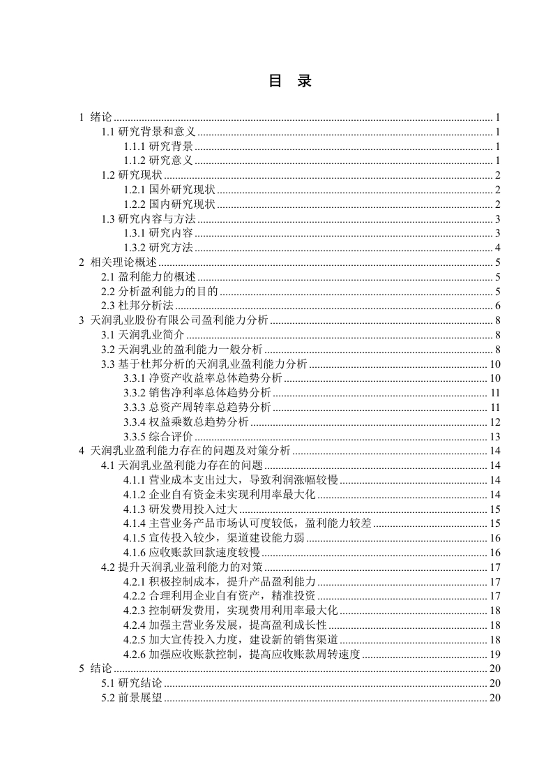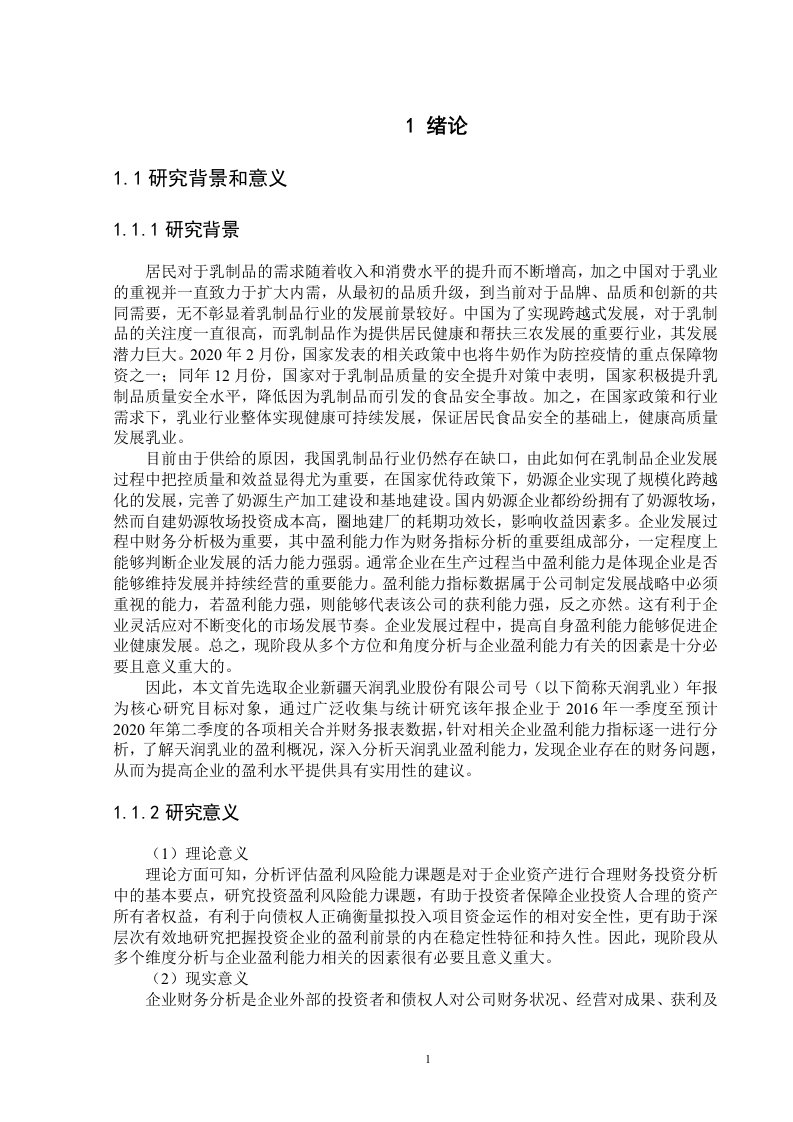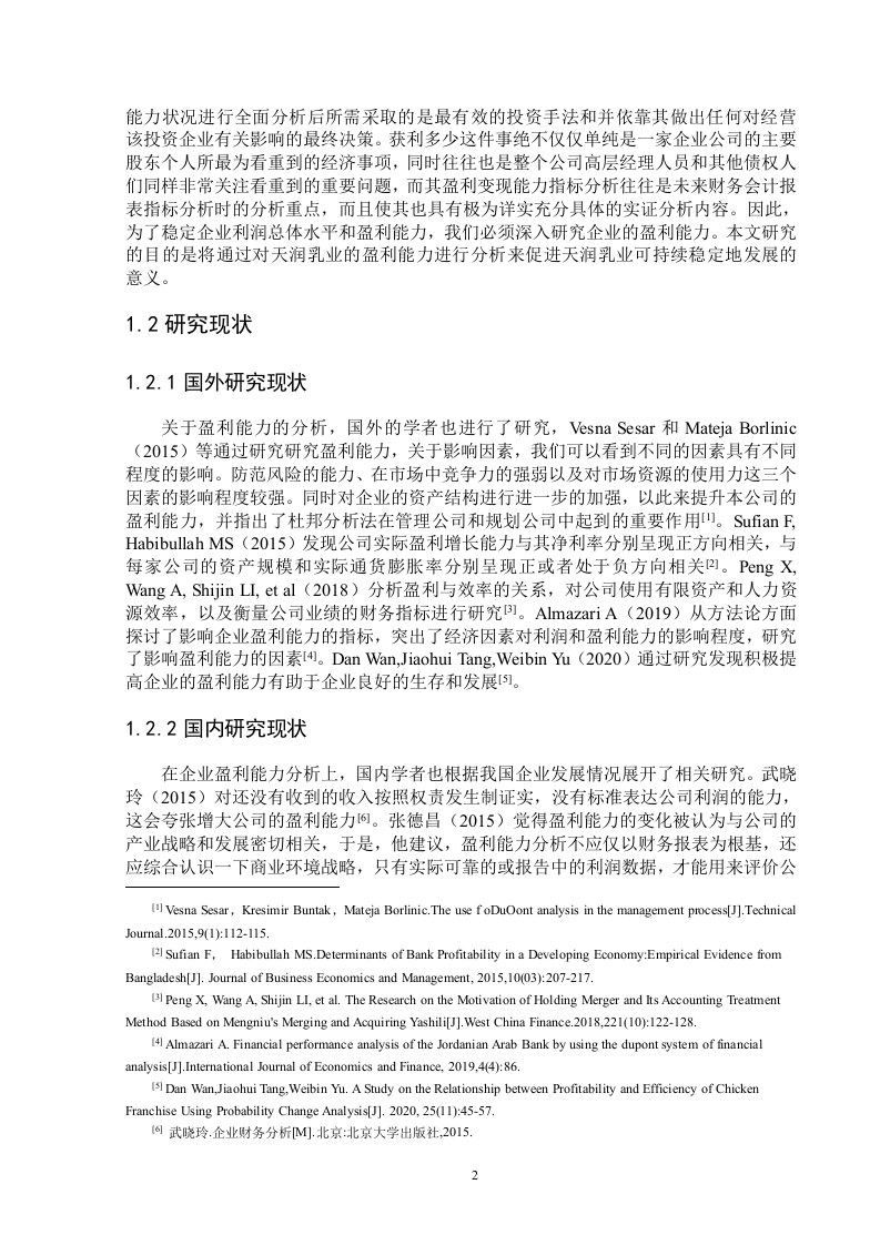 天润乳业盈利能力分析摘要:随着人民生活水平的提高,人们对乳制品的需求量加大,乳制品行业发展潜力巨大,但是居民对乳制品的要求也不断提高,由于乳制品行业集中度偏高,消费者品牌意识强烈,区域发展不平衡,行业竞争也越来越激烈,乳制品企业所面临的压力也前所未有。盈利能力对于任何企业来说一直是经营管理的首要问题,而全面、客观地评价企业自身的盈利能力,对于企业明晰自身盈利水平,发现管理漏洞,而后提高盈利能力具有重大意义。本文选择天润乳业作为研究对象,运用杜邦分析法从五个方面对天润乳业的盈利能力进行深入分析,研究发现天润乳业的营业成本支出过大,企业自有资金未实现利用率最大化,研发费用投入过大,主营业务产品市场认可度较低,宣传投入较少,渠道建设能力弱,应收账款回款速度较慢的问题。针对天润企业盈利能力存在的问题,本文提出了针对性地解决对策。关键词:天润乳业:盈利能力:杜邦分析Analysis of affecting profitability of Tianrun Dairy industryAbstract:With the rapid development of China's commercial economy,profitability isone of the most important indicators of whether an enterprise can survive in the hugeeconomic competition,and also an important way to achieve financial goals.In recent years,China's rapid economic development,the dairy industry has also entered a thriving stage ofdevelopment,at the same time,the competition in the dairy industry is also fierce,manyenterprises in the production and operation stage due to management factors lead to capitalchain fracture,resulting in financial crisis affecting production,sales and enterprise operation.This article choose tianrun dairy industry as the research object,using the du pont analysismethod from five respects to tianrun dairy industry,analyzing the profitability of the studyfound that the tianrun dairy business cost is too large,the enterprise own capital did notrealize the maximization of the utilization rate of r&d input is too big,main business productmarket recognition is low,less on publicity,channel construction ability is weak,Slowcollection of accounts receivable.In view of the problems existing in the profitability ofTianrun enterprises,this paper puts forward targeted solutions.Key words:Tianrun Dairy;Profitability;Dupont analysis目录1绪论1.1研究背景和意义1.1.1研究背景1.1.2研究意义1.2研究现状.21.2.1国外研究现状.21.2.2国内研究现状…21.3研究内容与方法31.3.1研究内容.31.3.2研究方法.42相关理论概述.52.1盈利能力的概述.52.2分析盈利能力的目的52.3杜邦分析法…63天润乳业股份有限公司盈利能力分析83.1天润乳业简介.83.2天润乳业的盈利能力一般分析83.3基于杜邦分析的天润乳业盈利能力分析.103.3.1净资产收益率总体趋势分析.…103.3.2销售净利率总体趋势分析…3.3.3总资产周转率总趋势分析……113.3.4权益乘数总趋势分析….123.3.5综合评价134天润乳业盈利能力存在的问题及对策分析.144.1天润乳业盈利能力存在的问题.….144.1.1营业成本支出过大,导致利润涨幅较慢.144.1.2企业自有资金未实现利用率最大化.144.1.3研发费用投入过大154.1.4主营业务产品市场认可度较低,盈利能力较差.154.1.5宣传投入较少,渠道建设能力弱.164.1.6应收账款回款速度较慢.…164.2提升天润乳业盈利能力的对策.…174.2.1积极控制成本,提升产品盈利能力.174.2.2合理利用企业自有资产,精准投资。.174.2.3控制研发费用,实现费用利用率最大化184.2.4加强主营业务发展,提高盈利成长性.184.2.5加大宣传投入力度,建设新的销售渠道184.2.6加强应收账款控制,提高应收账款周转速度.195结论205.1研究结论.205.2前景展望.20致谢.21参考文献.221绪论1.1研究背景和意义1.1.1研究背景居民对于乳制品的需求随着收入和消费水平的提升而不断增高,加之中国对于乳业的重视并一直致力于扩大内需,从最初的品质升级,到当前对于品牌、品质和创新的共同需要,无不彰显着乳制品行业的发展前景较好。中国为了实现跨越式发展,对于乳制品的关注度一直很高,而乳制品作为提供居民健康和帮扶三农发展的重要行业,其发展潜力巨大。2020年2月份,国家发表的相关政策中也将牛奶作为防控疫情的重点保障物资之一:同年12月份,国家对于乳制品质量的安全提升对策中表明,国家积极提升乳制品质量安全水平,降低因为乳制品而引发的食品安全事故。加之,在国家政策和行业需求下,乳业行业整体实现健康可持续发展,保证居民食品安全的基础上,健康高质量发展乳业。目前由于供给的原因,我国乳制品行业仍然存在缺口,由此如何在乳制品企业发展过程中把控质量和效益显得尤为重要,在国家优待政策下,奶源企业实现了规模化跨越化的发展,完善了奶源生产加工建设和基地建设。国内奶源企业都纷纷拥有了奶源牧场,然而自建奶源牧场投资成本高,圈地建厂的耗期功效长,影响收益因素多。企业发展过程中财务分析极为重要,其中盈利能力作为财务指标分析的重要组成部分,一定程度上能够判断企业发展的活力能力强弱。通常企业在生产过程当中盈利能力是体现企业是否能够维持发展并持续经营的重要能力。盈利能力指标数据属于公司制定发展战略中必须重