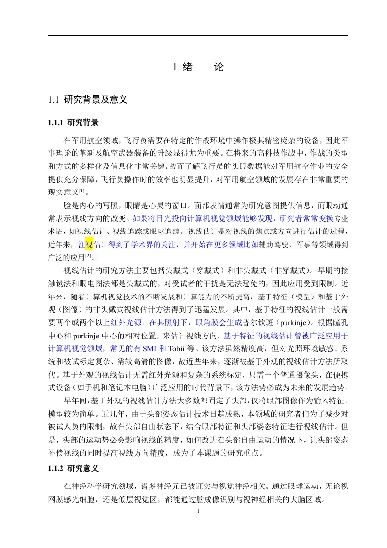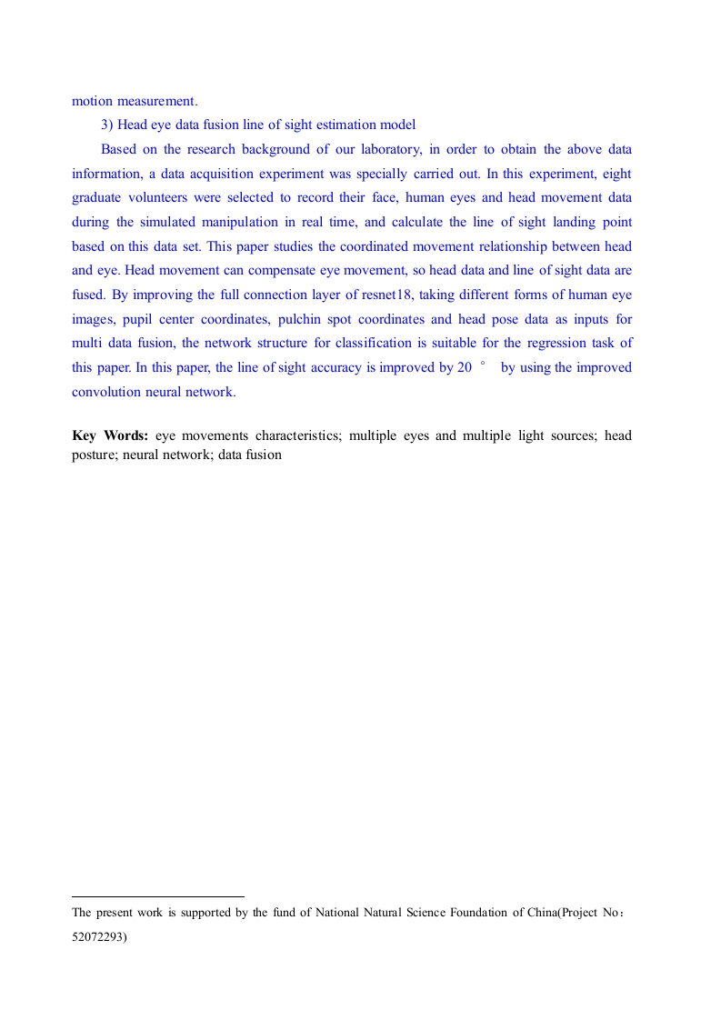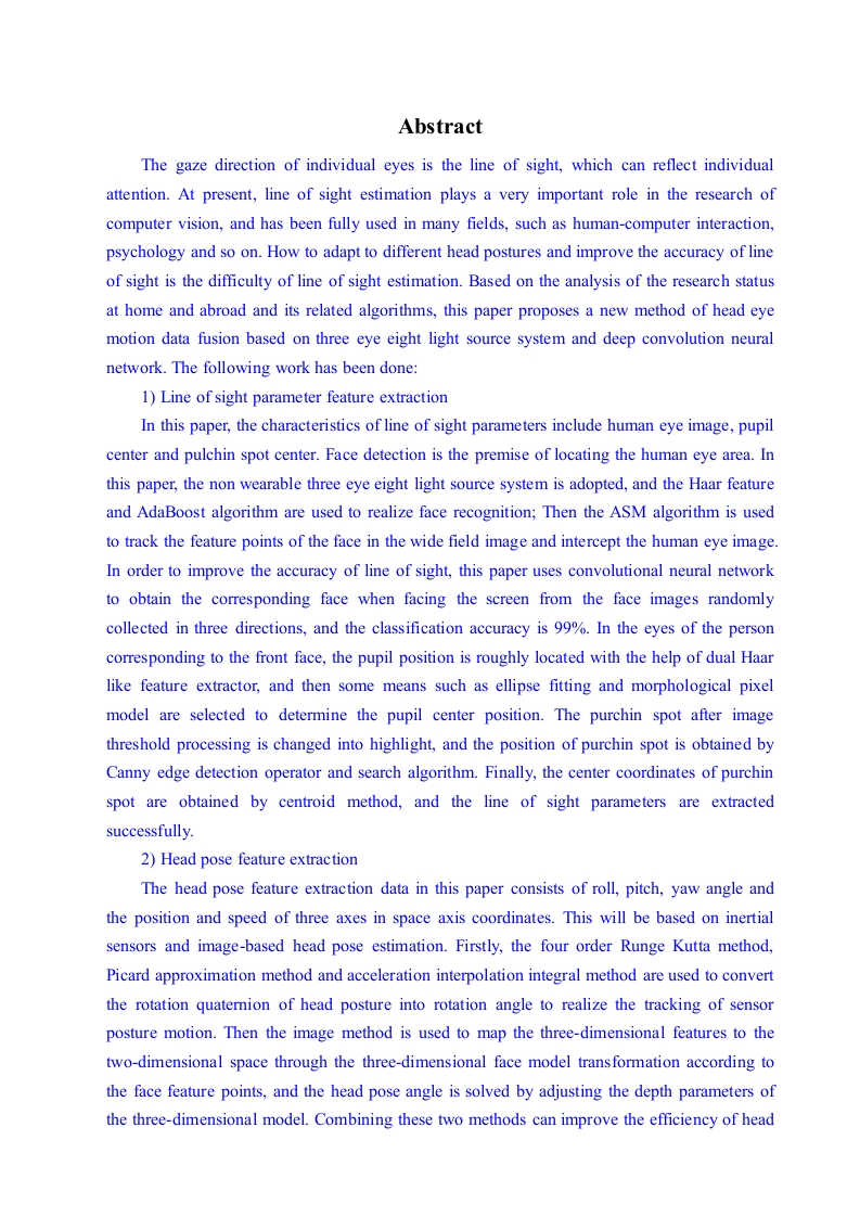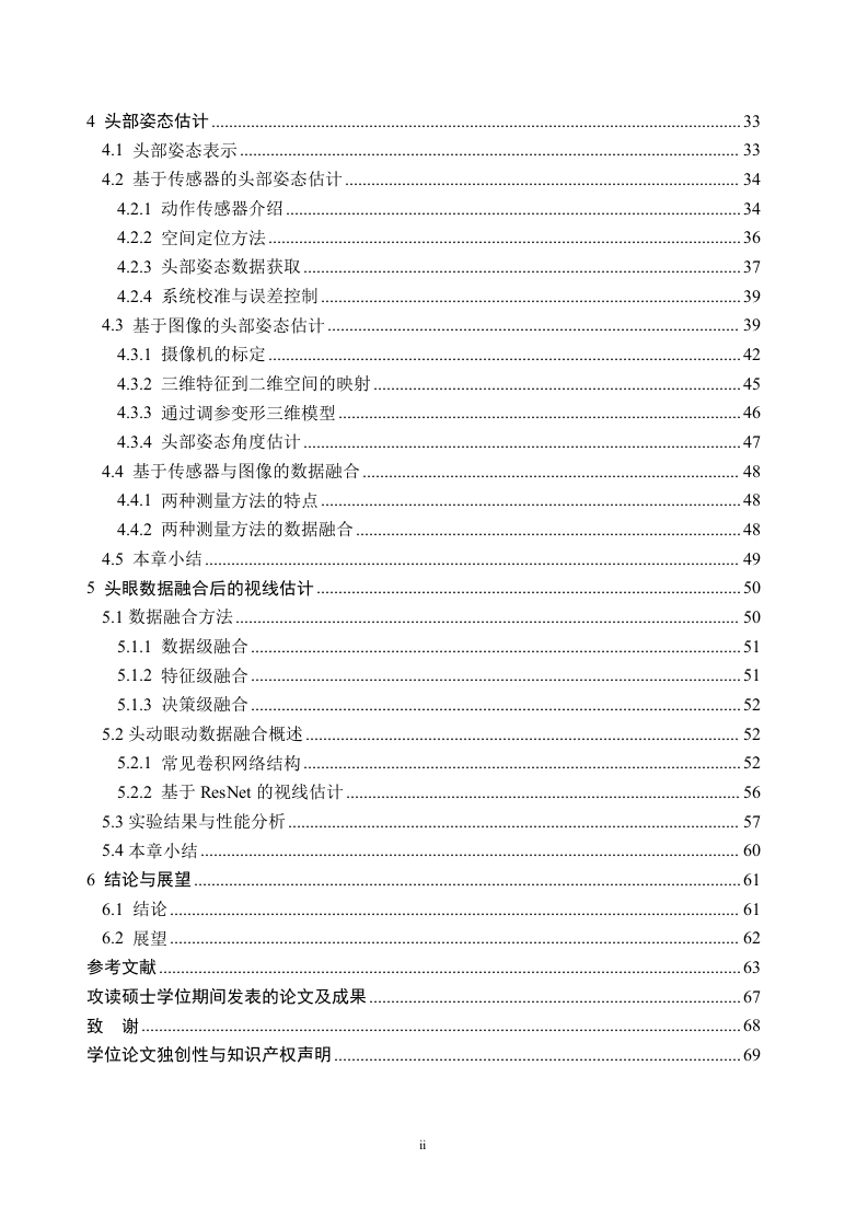 头动眼动数据融合的视线方向算法研究与应用摘要个体眼睛的注视方向便是视线,视线能够体现个体的注意力。当前在计算机视觉研究中,视线估计扮演着十分重要的角色,在许多领域比如人机交互领域、心理学领域等得到了充分运用。如何适应不同的头部姿势,提高视线的精确度,是目前视线估计的难点。本文在分析国内外研究现状及其相关算法的基础上,提出一种基于三目八光源系统,利用深度卷积神经网络将头眼运动数据融合起来的新方法。主要做了以下几方面的工作:1)视线参数特征提取本文视线参数特征包括人眼图像、瞳孔中心和普尔软斑中心。人脸检测是定位人眼区域的前提,本文采用非穿戴式三目八光源系统,使用Haar特征和Adaboost算法实现人脸的识别:然后利用ASM算法对宽视野图像中的人脸实现特征点跟踪并截取人眼图像。为提高视线精度,本文利用卷积神经网络从三个方向随机采集的人脸图像中获取正视屏幕时所对应正脸,分类准确率达99%。在正脸对应的人眼中,借助双重Haar-like特征提取器来对瞳孔位置进行大致定位,接着选用一些手段比如椭圆拟合、形态学像素模型等来将瞳孔中心位置确定下来。将图像阈值处理后的普尔软斑变为高亮点,利用Canny边缘检测算子及查找算法得到普尔软斑位置,最后通过质心法得到普尔软斑中心坐标,视线参数提取成功。2)头部姿态特征提取本文中的头部姿态特征提取数据由横滚、俯仰、偏航角以及空间轴坐标中三轴的位置、速度等构成。此次将以惯性传感器为基础,基于图像的头部姿态估计相结合。首先,采用四阶龙格库塔法、毕卡逼近法和加速度插值积分法将头部姿态的旋转四元数转化为旋转角度,实现传感器姿态运动的跟踪。然后利用图像法根据人脸特征点通过三维人脸模型变换将三维特征映射到二维空间,并通过调整三维模型的深度参数来解算头部姿态角度问题。将这两种方法结合起来,可以提高头部运动测量的效率。3)头眼数据融合视线估计模型基于本实验室研究背景,为了得到以上数据信息,专门展开了数据采集实验,此次实验挑选了研究生志愿者八名,实时记录其在模拟操控期间的人脸、人眼和头动数据,并以此数据集为基础计算出视线落点。本课题研究了头眼的协调运动关系,头部运动能补偿眼部运动,故将头部数据与视线数据相融合。通过改进ResNet18的全连接层,将不同形态的人眼图像、瞳孔中心坐标、普尔钦斑坐标和头部姿态数据作为输入,进行多数据融合,将分类用的网络结构适用于本文的回归任务。本文通过采用改进的卷积神经网络将视线精度提高了20°。关键词:眼动特征:多目多光源:头部姿态:神经网络:数据融合本研究得到国家自然基金(编号:52072293)资助。AbstractThe gaze direction of individual eyes is the line of sight,which can reflect individualattention.At present,line of sight estimation plays a very important role in the research ofcomputer vision,and has been fully used in many fields,such as human-computer interaction,psychology and so on.How to adapt to different head postures and improve the accuracy of lineof sight is the difficulty of line of sight estimation.Based on the analysis of the research statusat home and abroad and its related algorithms,this paper proposes a new method of head eyemotion data fusion based on three eye eight light source system and deep convolution neuralnetwork.The following work has been done:1)Line of sight parameter feature extractionIn this paper,the characteristics of line of sight parameters include human eye image,pupilcenter and pulchin spot center.Face detection is the premise of locating the human eye area.Inthis paper,the non wearable three eye eight light source system is adopted,and the Haar featureand AdaBoost algorithm are used to realize face recognition;Then the ASM algorithm is usedto track the feature points of the face in the wide field image and intercept the human eye image.In order to improve the accuracy of line of sight,this paper uses convolutional neural networkto obtain the corresponding face when facing the screen from the face images randomlycollected in three directions,and the classification accuracy is 99%.In the eyes of the personcorresponding to the front face,the pupil position is roughly located with the help of dual Haarlike feature extractor,and then some means such as ellipse fitting and morphological pixelmodel are selected to determine the pupil center position.The purchin spot after imagethreshold processing is changed into highlight,and the position of purchin spot is obtained byCanny edge detection operator and search algorithm.Finally,the center
