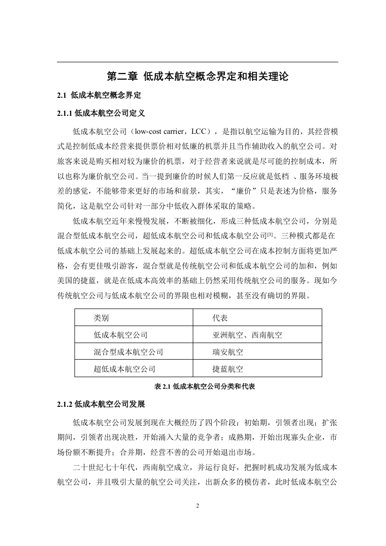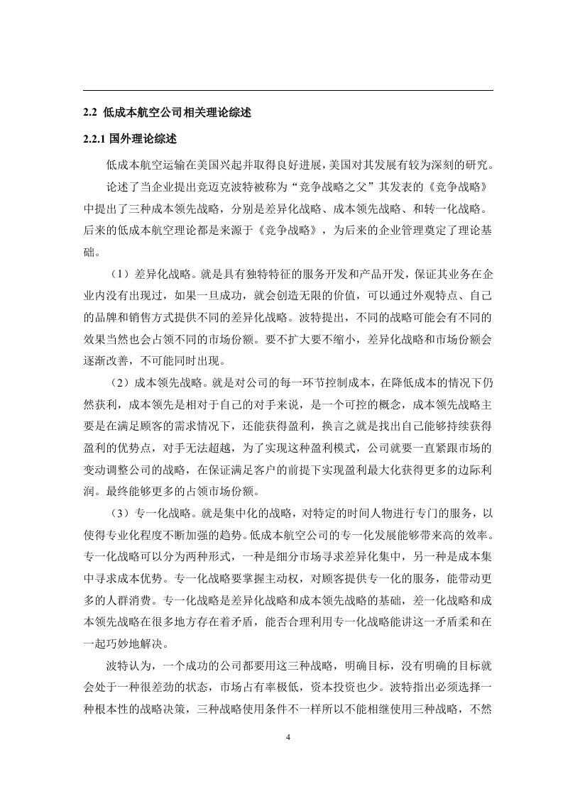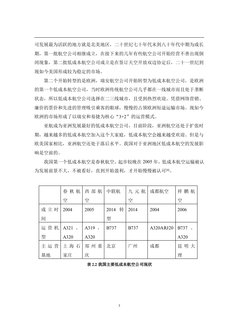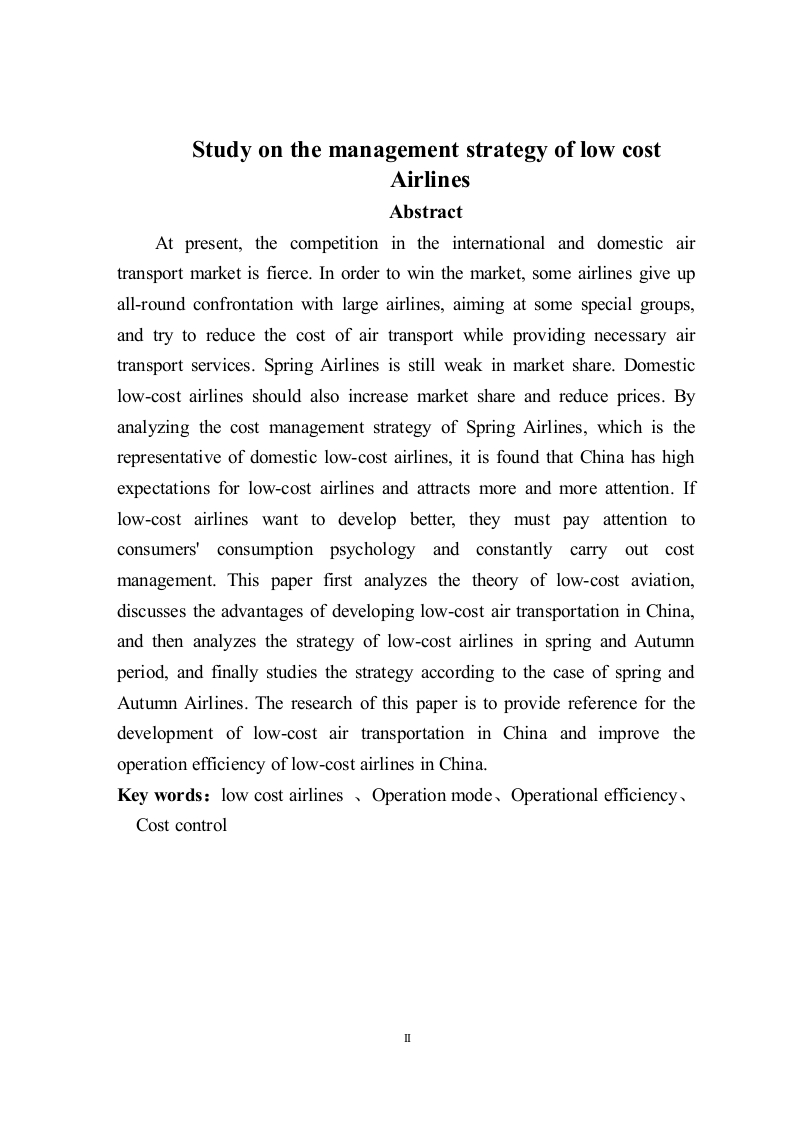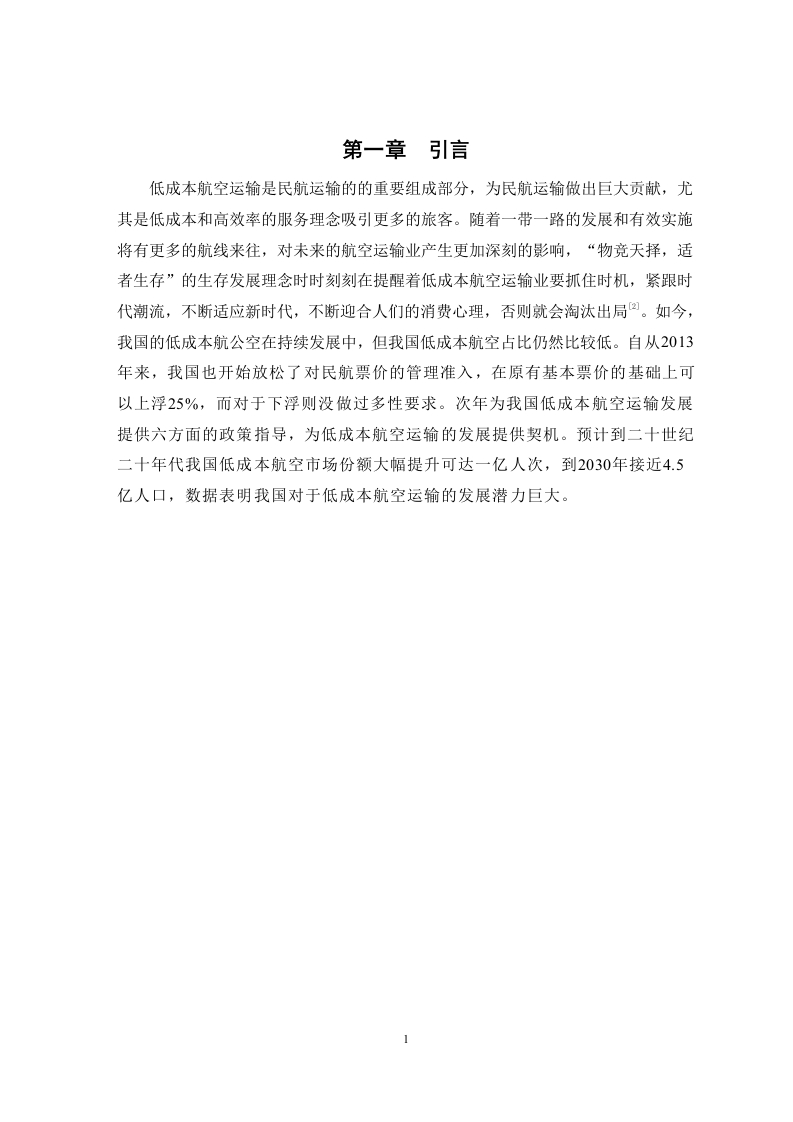 我国低成本航空公司成本管理策略研究-以春秋航空公司为例摘要目前国际国内航空运输市场竞争激烈,部分航空公司为了赢得市场,放弃和大型航空公司全面对抗,瞄准某些特殊群体,通过提供必要的航空运输服务的同时努力降低航空运输成本。春秋航空在市场占有率方面还较为薄弱,国内低成本航空公司也应该在增加市场占有率的基础上再降低价格山。通过分析国内低成本航空公司的代表春秋航空的成本管理策略发现我国对低成本航空也寄予厚望,吸引着越来越多的关注。低成本航空公司如果想更好的发展必须抓牢消费者的消费心理,不断进行成本管理。论文首先分析低成本航空相关理论,论述在我国发展低成本航空运输的优势,进行策略分析,然后选取我国低成本航空公司春秋航空成本策略进行问题分析,最后根据春秋航空公司的案例问题进行策略研究。论文研究,是为我国低成本航空运输发展提供借鉴意义,为提高我国低成本航空公司运营效率。关键词:低成本航空、运营模式、运营效率、成本控制Study on the management strategy of low costAirlinesAbstractAt present,the competition in the international and domestic airtransport market is fierce.In order to win the market,some airlines give upall-round confrontation with large airlines,aiming at some special groups,and try to reduce the cost of air transport while providing necessary airtransport services.Spring Airlines is still weak in market share.Domesticlow-cost airlines should also increase market share and reduce prices.Byanalyzing the cost management strategy of Spring Airlines,which is therepresentative of domestic low-cost airlines,it is found that China has highexpectations for low-cost airlines and attracts more and more attention.Iflow-cost airlines want to develop better,they must pay attention toconsumers'consumption psychology and constantly carry out costmanagement.This paper first analyzes the theory of low-cost aviation,discusses the advantages of developing low-cost air transportation in China,and then analyzes the strategy of low-cost airlines in spring and Autumnperiod,and finally studies the strategy according to the case of spring andAutumn Airlines.The research of this paper is to provide reference for thedevelopment of low-cost air transportation in China and improve theoperation efficiency of low-cost airlines in China.Key words:low cost airlines Operation mode Operational efficiency.Cost control目录摘要ABSTRACT目录,Ⅲ第一章引言第二章低成本航空概念界定和相关理论.22.1低成本航空概念界定.22.2低成本航空公司相关理论综述,.42.3春秋航空公司简介0.6第三章春秋航空公司现有成本管理存在的问题73.1春秋航空公司现有成本管理策略分析.73.2春秋航空公司现有成本管理不足分析.8第四章我国低成本航空公司成本管理存在的问题原因分析。10第五章我国低成本航空公司现有成本管理效果策略建议..12参考文南状.15谢辞…17m第一章引言低成本航空运输是民航运输的的重要组成部分,为民航运输做出巨大贡献,尤其是低成本和高效率的服务理念吸引更多的旅客。随着一带一路的发展和有效实施将有更多的航线来往,对未来的航空运输业产生更加深刻的影响,“物竞天择,适者生存”的生存发展理念时时刻刻在提醒着低成本航空运输业要抓住时机,紧跟时代潮流,不断适应新时代,不断迎合人们的消费心理,否则就会淘汰出局。如今,我国的低成本航公空在持续发展中,但我国低成本航空占比仍然比较低。自从2013年来,我国也开始放松了对民航票价的管理准入,在原有基本票价的基础上可以上浮25%,而对于下浮则没做过多性要求。次年为我国低成本航空运输发展提供六方面的政策指导,为低成本航空运输的发展提供契机。预计到二十世纪二十年代我国低成本航空市场份额大幅提升可达一亿人次,到2030年接近4.5亿人口,数据表明我国对于低成本航空运输的发展潜力巨大。