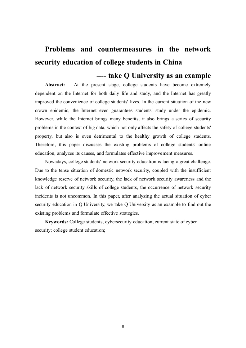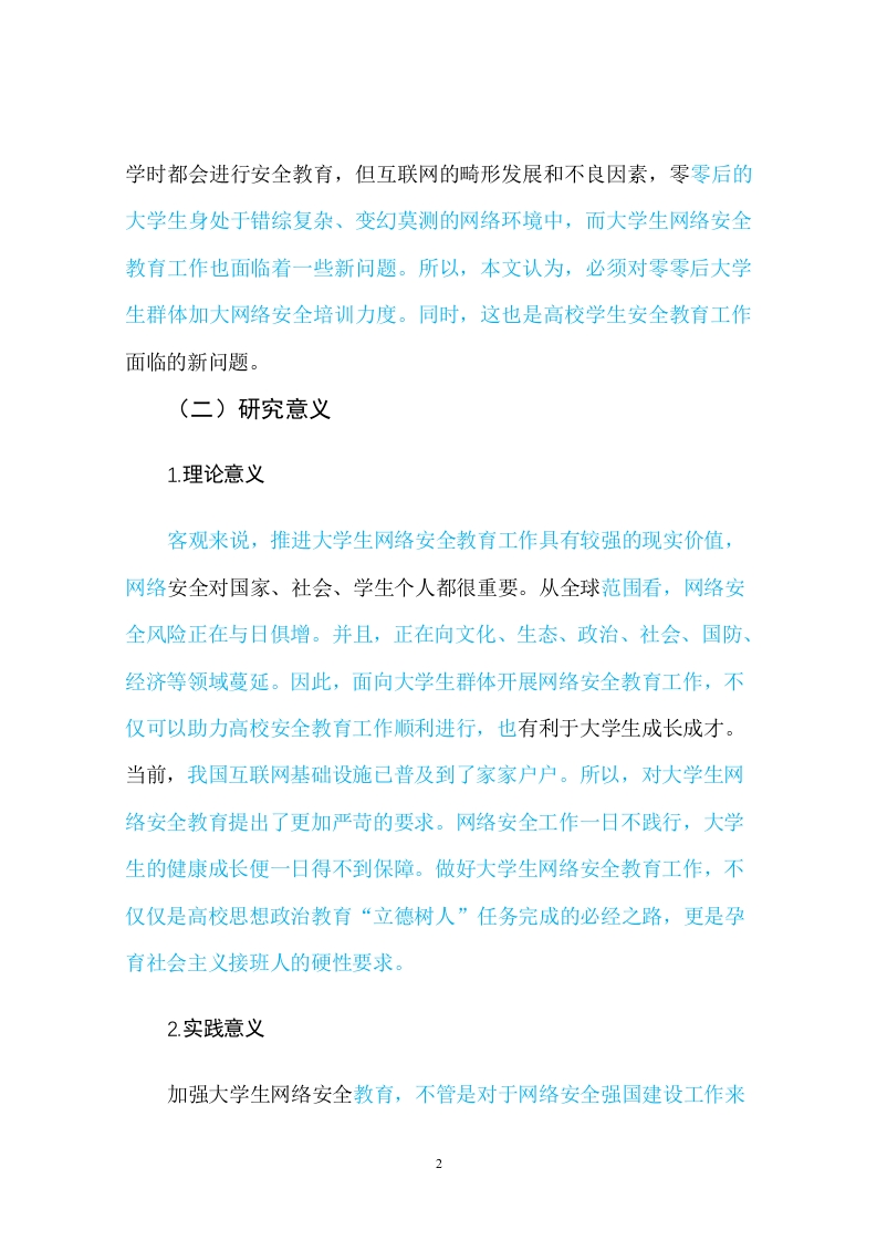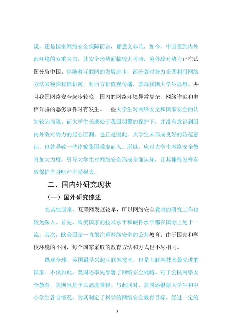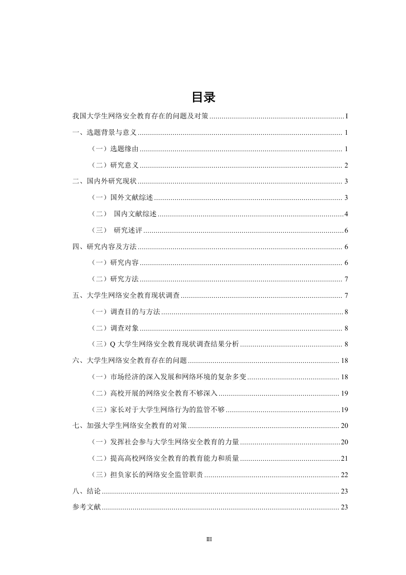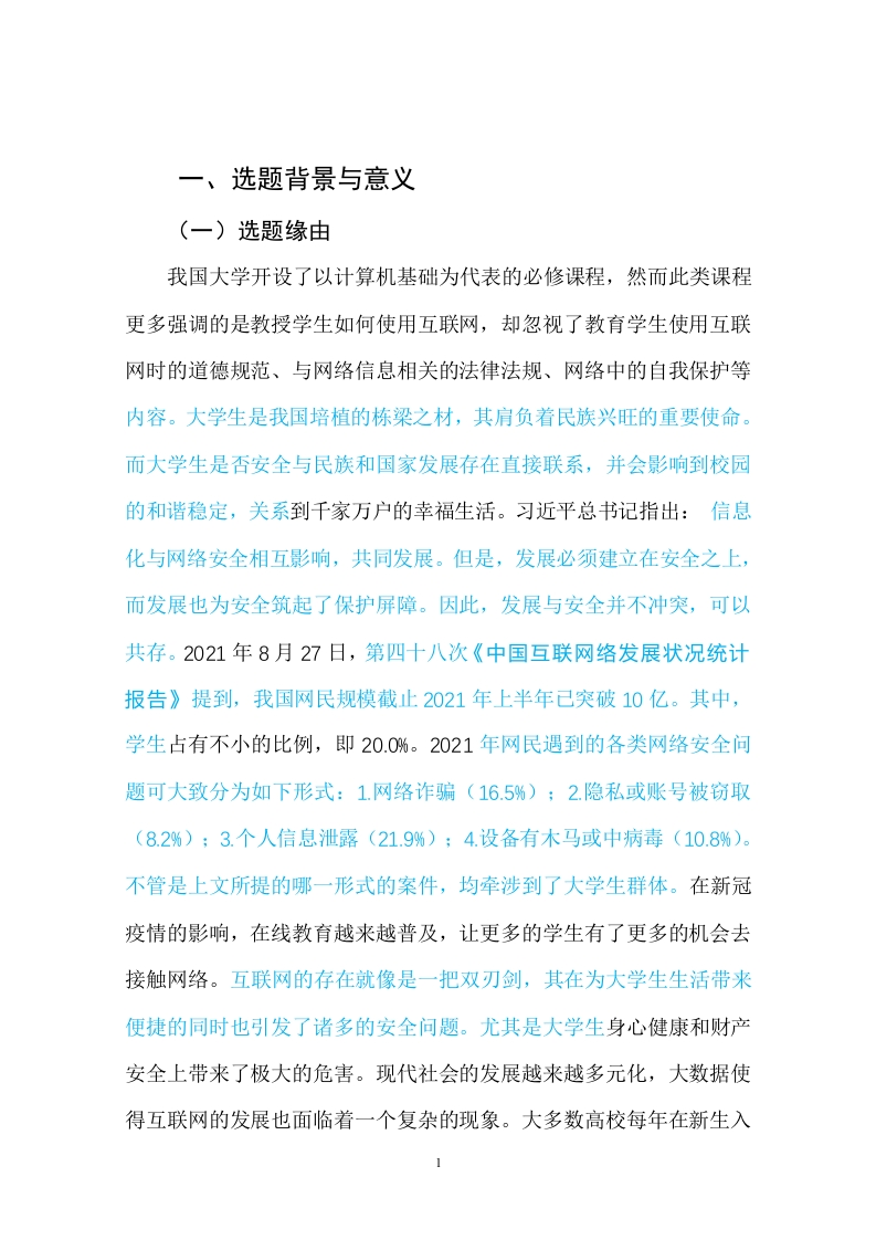 我国大学生网络安全教育存在的问题及对策--以Q大学为例摘要:现阶段,大学生不管是日常生活还是学习,均对网络产生了极强的依赖,而网络也大大提高了大学生生活的便捷性。在新冠疫情的当下,互联网更是保障了学生在疫情下的学习。但是,互联网带来很多好处的同时,在大数据背景下也带来了一连串的安全问题,不仅对大学生财产安全造成影响,甚至不利于大学生的健康成长。因此,本文深入探讨大学生网络教育现存问题,对其成因剖析,并制定有效改善措施。如今,大学生网络安全教育而临着很大的挑战。由于国内网络安全形势较为紧张,再加上大学生网络安全知识储备不足、网络安全意识欠缺及网络安全技能不过关等因素,网络安全事件的发生屡见不鲜。本文在对Q大学网络安全教育的实际情况分析后,以Q大学为例找出现存问题,并制定有效策略。关键词:大学生:网络安全教育:网络安全现状:大学生教育:Problems and countermeasures in the networksecurity education of college students in China---take Q University as an exampleAbstract:At the present stage,college students have become extremelydependent on the Internet for both daily life and study,and the Internet has greatlyimproved the convenience of college students'lives.In the current situation of the newcrown epidemic,the Internet even guarantees students'study under the epidemic.However,while the Internet brings many benefits,it also brings a series of securityproblems in the context of big data,which not only affects the safety of college students'property,but also is even detrimental to the healthy growth of college students.Therefore,this paper discusses the existing problems of college students'onlineeducation,analyzes its causes,and formulates effective improvement measures.Nowadays,college students'network security education is facing a great challenge.Due to the tense situation of domestic network security,coupled with the insufficientknowledge reserve of network security,the lack of network security awareness and thelack of network security skills of college students,the occurrence of network securityincidents is not uncommon.In this paper,after analyzing the actual situation of cybersecurity education in Q University,we take Q University as an example to find out theexisting problems and formulate effective strategies.Keywords:College students;cybersecurity education;current state of cybersecurity;college student education;目录我国大学生网络安全教育存在的问题及对策I一、选题背景与意义…(一)选题缘由…(二)研究意义.2二、国内外研究现状3(一)国外文献综述3(二)国内文献综述.4(三)研究述评.6四、研究内容及方法..6(一)研究内容…。6(二)研究方法…7五、大学生网络安全教育现状调查7(一)调查目的与方法.8(二)调查对象….8(三)Q大学生网络安全教育现状调查结果分析…8六、大学生网络安全教育存在的问题….18(一)市场经济的深入发展和网络环境的复杂多变.18(二)高校开展的网络安全教育不够深入…19(三)家长对于大学生网络行为的监管不够:.19七、加强大学生网络安全教育的对策20(一)发挥社会参与大学生网络安全教育的力量。.20(二)提高高校网络安全教育的教育能力和质量.21(三)担负家长的网络安全监管职责..22八、结论..23参考文献….23公致谢.25IV
