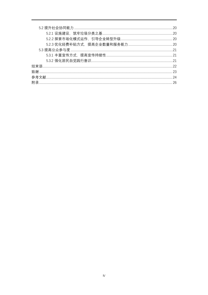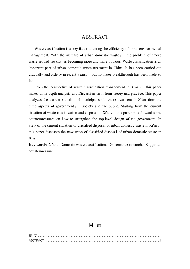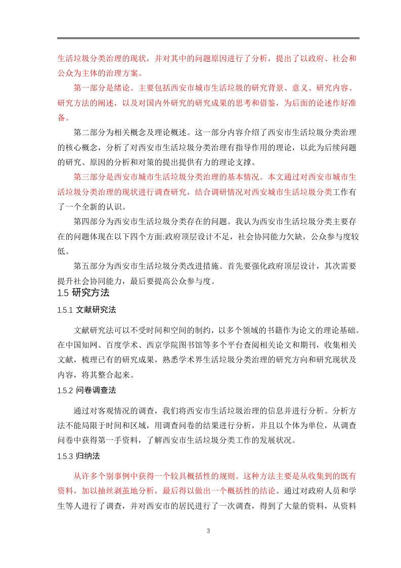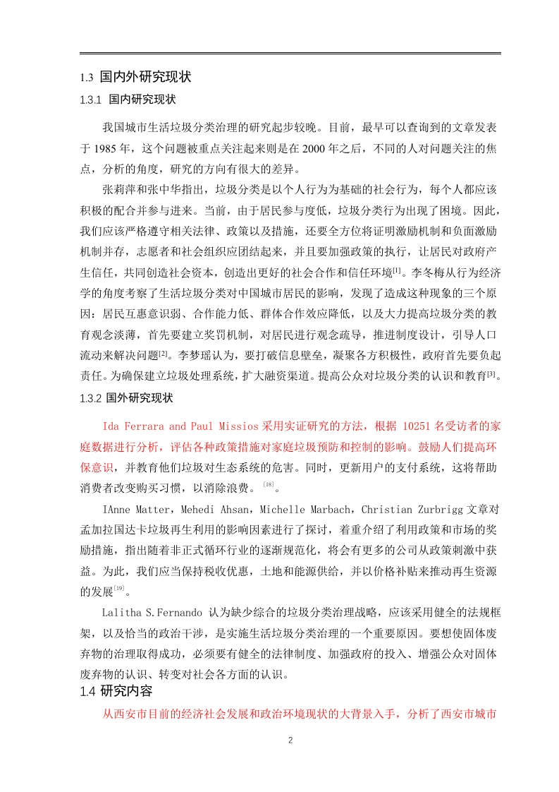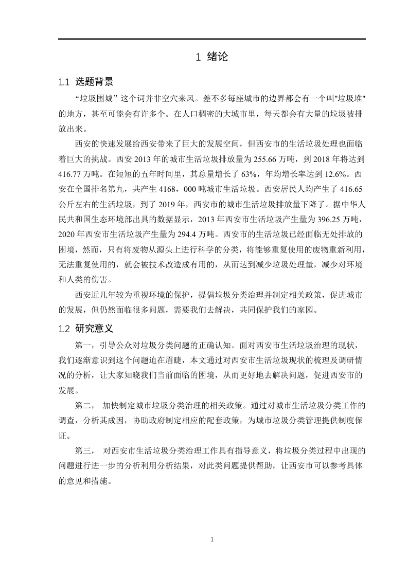 西安市生活垃圾分类治理研究摘要垃圾分类是影响城市环境管理效能的关键因素。随着城市生活垃圾数量的增加,“城市周边垃圾较多”的问题越发明显。垃圾分类是目前我国城市生活垃圾治理的重要内容,近年来逐步有序地进行,但至今未取得重大突破。本文从西安市垃圾分类管理的角度出发,从理论和实际出发,对其进行了深入的分析和探讨。本文从政府门户网站、新闻媒体报道、问卷调查等方面入手,从政府、社会、公众三方面对西安市城市生活垃圾的治理现状进行了分析。本文从西安市垃圾分类处置的现状出发,就如何强化政府的顶层设计,提出一些对策。针对目前西安市城市生活垃圾分类处置的现状,探讨西安市城市生活垃圾分类处置的新途径。关键词:西安:生活垃圾分类:治理研究:建议对策ABSTRACTWaste classification is a key factor affecting the efficiency of urban environmentalmanagement.With the increase of urban domestic waste,the problem of "morewaste around the city"is becoming more and more obvious.Waste classification is animportant part of urban domestic waste treatment in China.It has been carried outgradually and orderly in recent years,but no major breakthrough has been made sofar.From the perspective of waste classification management in Xi'an,this papermakes an in-depth analysis and Discussion on it from theory and practice.This paperanalyzes the current situation of municipal solid waste treatment in Xi'an from thethree aspects of government,society and the public.Starting from the currentsituation of waste classification and disposal in Xi'an,this paper puts forward somecountermeasures on how to strengthen the top-level design of the government.Inview of the current situation of classified disposal of urban domestic waste in Xi'an,this paper discusses the new ways of classified disposal of urban domestic waste inXi'an.Key words:Xi'an,Domestic waste classification,Governance research,Suggestedcountermeasure目录要1绪论4,111洗题背景,11.2研究意义…113国内外研究现状1.3.1国内研究现状,11.3.2国外研究现状…21.4研究内容….21.5研究方法…31.5.1文献研究法131.5.2调查研究法31.5.3归纳法2相关概念及理论概述……2.1城市生活垃圾2.1.1城市生活垃圾的概念1,42.1.2生活垃圾分类标准…2.2治理理论142.3可持续发展理论43西安市生活垃圾分类治理的现状….63.1西安市生活垃圾分类治理基本情况63.11生活垃圾治理的相关文件及措施63.1.2生活垃圾的治理水平73.1.3生活垃圾的治理效果.…3.2调研方法和问卷设计103.3调查问卷结果分析…113.3,1宣传力度1111111111111111111111,113.2.2居民认知度123.3.3居民参与度…144西安市生活垃圾分类治理存在的问题..164.1政府顶层设计不足…164.1.1监管的缺失导致推行力度较弱.164.1,2政策的激励约束机制不合理…164.1.3部门职责的划分较为混乱.164.2社会协同能力欠缺174.2.1垃圾处理配套设施不够完善174.2.2企业数量与服务能力无法满足处置需求174.2.3企业影响力不足,自主性欠缺…174.2.4缺乏制度化、具体化的政策约束和规范.174.3公众参与度较低.175西安市生活垃圾分类治理优化建议195.1强化政府]顶层设计195.1.1加强监管,有序推进定时定点投放195.1.2完善激励约束机制…195.1.3明确部门职责.20川5.2提升社会协同能力205.2.1设施建设,筑牢垃圾分类之基205,2.2探索市场化模式运作,引导企业转型升级…205,2.3优化经费补贴方式,提高企业数量和服务能力205.3提高公众参与度111215.3.1丰富宣传方式,提高宣传持续性2153.2强化居民自觉践行意识21结束语1122致谢23参考文献2426f录4126么
