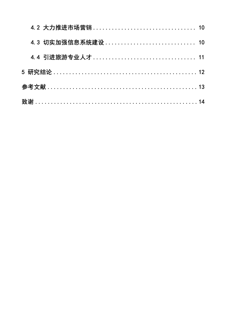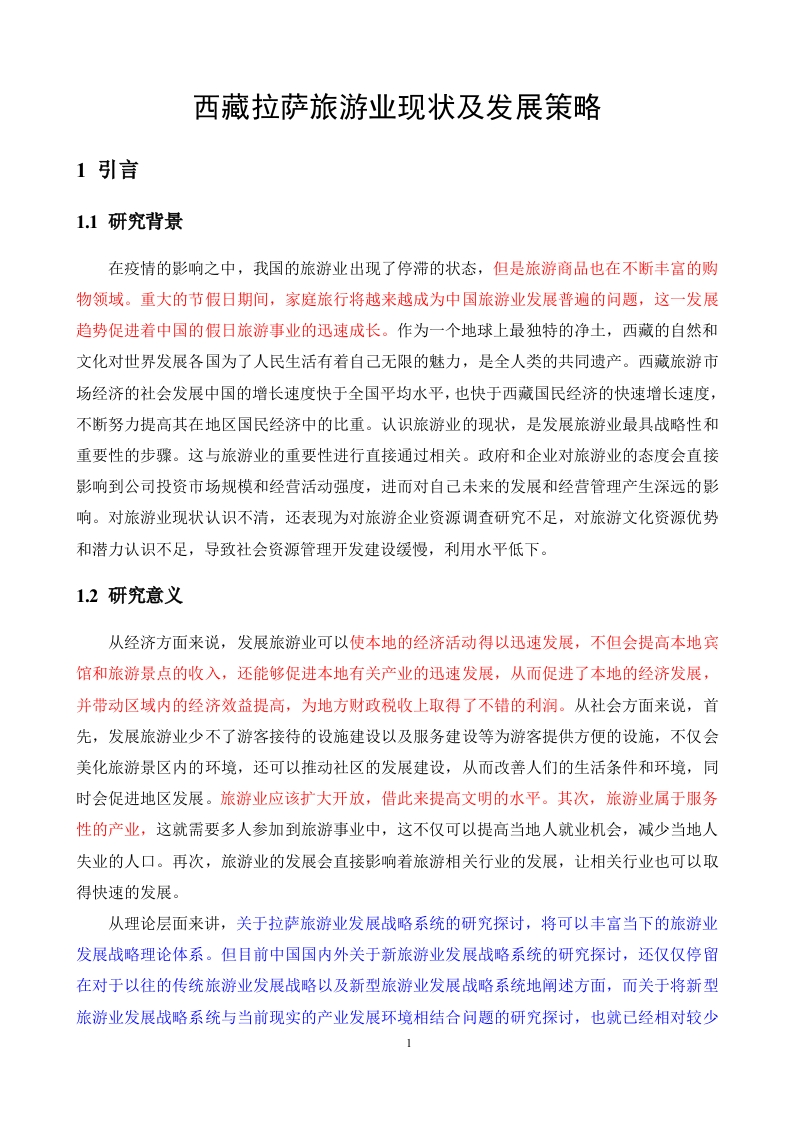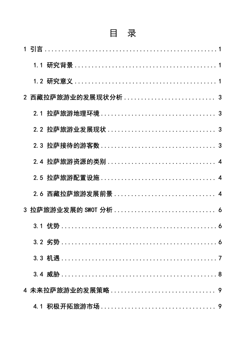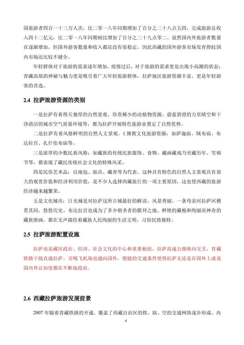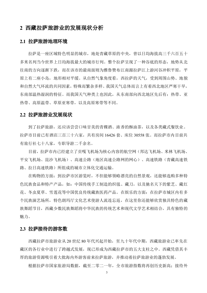 西藏拉萨旅游业现状及发展策略摘要:我国经济的快速发展,人们的生活水平在不断的提高,利用旅行来放松身心以及增加感觉的需求越来越多,在旅游中建议减轻工作以及生活上的压力。由此可知,当下旅游是人们工作生活中不可缺少的一部分,也是旅游行业不断发展的机遇,尤其旅游方式以及旅游产品的不断丰富,人们对旅游的要求也越来越高,但是有很多地区已经展现出当地独具特色的旅游风貌和优势,拉萨正是其中一员。拉萨具有人间天堂的美称,风景优美,藏族文化特色显著,但在实际的旅游业发展过程中存在一定的问题,如旅游资源开发利用低、生态环境保护意识不强,旅游管理较为落后等,在对以上问题进行检视的基础上,理性提出拉萨旅游业未来的发展建议。关键词:拉萨:旅游业:电商;西藏目录1引言.…11.1研究背景11.2研究意义....12西藏拉萨旅游业的发展现状分析32.1拉萨旅游地理环境....32.2拉萨旅游业发展现状...32.3拉萨接待的游客数.·.32.4拉萨旅游资源的类别.·42.5拉萨旅游配置设施..42.6西藏拉萨旅游发展前景...。43拉萨旅游业发展的SW0T分析.63.1优势63.2劣势63.3机遇...73.4威胁...84未来拉萨旅游业的发展策略.,04.1积极开拓旅游市场94.2大力推进市场营销.....104.3切实加强信息系统建设...104.4引进旅游专业人才...·115研究结论....12参考文献..13致谢....西藏拉萨旅游业现状及发展策略1引言1.1研究背景在疫情的影响之中,我国的旅游业出现了停滞的状态,但是旅游商品也在不断丰富的购物领域。重大的节假日期间,家庭旅行将越来越成为中国旅游业发展普遍的问题,这一发展趋势促进着中国的假日旅游事业的迅速成长。作为一个地球上最独特的净土,西藏的自然和文化对世界发展各国为了人民生活有着自己无限的魅力,是全人类的共同遗产。西藏旅游市场经济的社会发展中国的增长速度快于全国平均水平,也快于西藏国民经济的快速增长速度,不断努力提高其在地区国民经济中的比重。认识旅游业的现状,是发展旅游业最具战略性和重要性的步骤。这与旅游业的重要性进行直接通过相关。政府和企业对旅游业的态度会直接影响到公司投资市场规模和经营活动强度,进而对自己未来的发展和经营管理产生深远的影响。对旅游业现状认识不清,还表现为对旅游企业资源调查研究不足,对旅游文化资源优势和潜力认识不足,导致社会资源管理开发建设缓慢,利用水平低下。1.2研究意义从经济方面来说,发展旅游业可以使本地的经济活动得以迅速发展,不但会提高本地宾馆和旅游景点的收入,还能够促进本地有关产业的迅速发展,从而促进了本地的经济发展,并带动区域内的经济效益提高,为地方财政税收上取得了不错的利润。从社会方面来说,首先,发展旅游业少不了游客接待的设施建设以及服务建设等为游客提供方便的设施,不仅会美化旅游景区内的环境,还可以推动社区的发展建设,从而改善人们的生活条件和环境,同时会促进地区发展。旅游业应该扩大开放,借此来提高文明的水平。其次,旅游业属于服务性的产业,这就需要多人参加到旅游事业中,这不仅可以提高当地人就业机会,减少当地人失业的人口。再次,旅游业的发展会直接影响着旅游相关行业的发展,让相关行业也可以取得快速的发展。从理论层面来讲,关于拉萨旅游业发展战略系统的研究探讨,将可以丰富当下的旅游业发展战略理论体系。但目前中国国内外关于新旅游业发展战略系统的研究探讨,还仅仅停留在对于以往的传统旅游业发展战略以及新型旅游业发展战略系统地阐述方面,而关于将新型旅游业发展战略系统与当前现实的产业发展环境相结合问题的研究探讨,也就已经相对较少