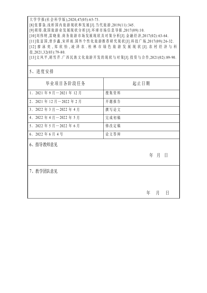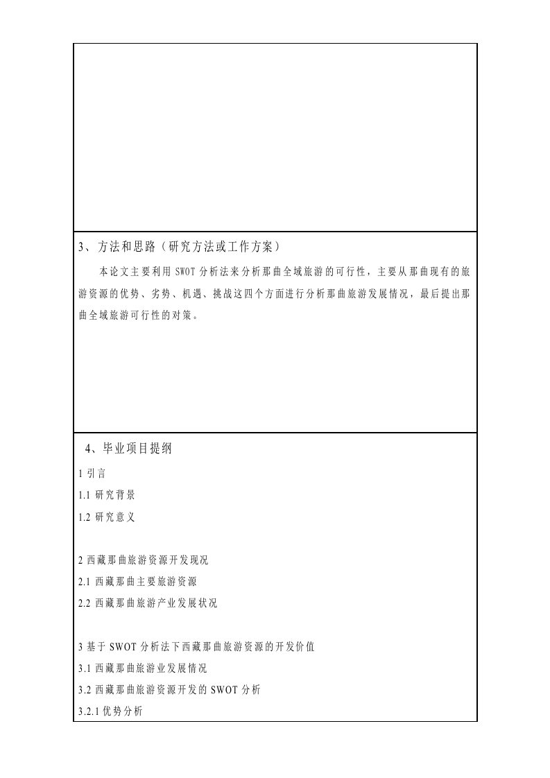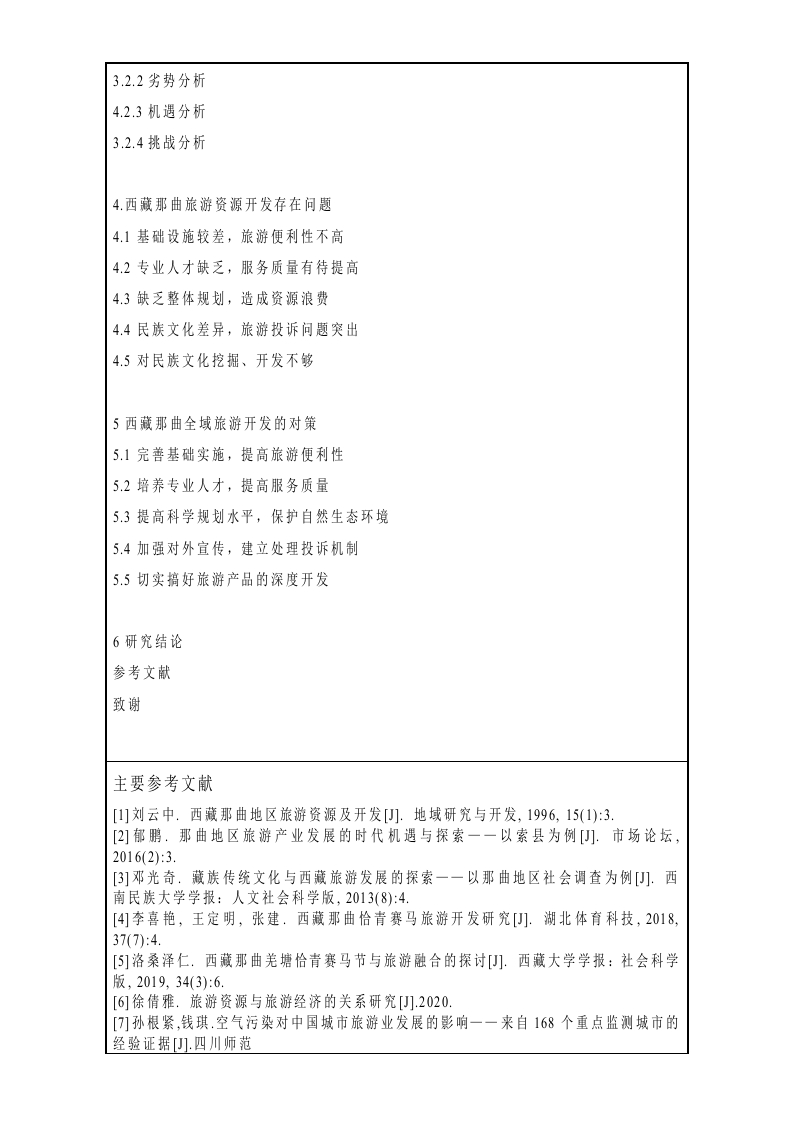 毕业项目题目:西藏那曲市全域旅游资源开发1、选题依据(选题意义、准备和基础等)选题意义习近平总书记指出“发展全域旅游,路子是对的,要坚持走下去”,国务院连续多年来对全域旅游进行部署全域旅游已成为国家战略。随着我国经济社会的发展以及民众对于旅游需求的不断提高,传统分散的、单一的旅模式正在被“全域化”的旅游模式所代替。全域旅游是以旅游业为依托,在一定区域内对经济社会资源、公共服务、相关产业、文明素质、生态环境等进行系统、全面的提升与优化,整合区域资源,带动与促进经济社会协调发展的新模式。近年来,安平县全域旅游的不断推进带动了县内相关产业的快速发展,同时那曲市全域旅游发展的瓶颈和困境也日益凸显,因此本文,通过$0T分析法分析西藏那曲全域旅游资源的发展,对促进西藏那曲全域旅游发展的对策作了分析,为那曲全域旅游的发展给予助力。准备和基础(1)在老师指导和广泛参阅文献资料和研究成果,通过对西藏那曲旅游资源相关资料的介绍和报道,总结自己对西藏那曲全域旅游发展的观点(2)作者自己出生西藏,对那曲的发展比较了解。(3)借助知网等资源及所学的旅游相关的专业知识,温习SOT相关理论知识,本文的研究具有一定的可行性。2、内容综述(目标、主要内容、拟解决的重点问题等)目标:分析对西藏那曲拥有旅游资源以及对西藏那曲全域旅游资源开发价值,通过S0T分析法为西藏那曲全域旅游的开发寻找合理的建议。主要内容:(1)川西藏区旅游产业发展现状,包括川西藏区主要旅游资源以及旅游产业发展状况等:(2)通过S0T分析法对西藏那曲旅游资源的开发进行分析:(3)提出那曲全域旅游资源的开发的建议。拟解决的重点问题:通过SOT分析法对那曲全域旅游的开发进行分析并提出其发展的建议。3、方法和思路(研究方法或工作方案)本论文主要利用SOT分析法来分析那曲全域旅游的可行性,主要从那曲现有的旅游资源的优势、劣势、机遇、挑战这四个方面进行分析那曲旅游发展情况,最后提出那曲全域旅游可行性的对策。4、毕业项目提纲1引言1.1研究背景1.2研究意义2西藏那曲旅游资源开发现况2.1西藏那曲主要旅游资源2.2西藏那曲旅游产业发展状况3基于SWOT分析法下西藏那曲旅游资源的开发价值3.1西藏那曲旅游业发展情况3.2西藏那曲旅游资源开发的SW0T分析3.2.1优势分析3.2.2劣势分析4.2.3机遇分析3.2.4挑战分析4西藏那曲旅游资源开发存在问题4.1基础设施较差,旅游便利性不高4.2专业人才缺乏,服务质量有待提高4.3缺乏整体规划,造成资源浪费4.4民族文化差异,旅游投诉问题突出4.5对民族文化挖掘、开发不够5西藏那曲全域旅游开发的对策5.1完善基础实施,提高旅游便利性5.2培养专业人才,提高服务质量5.3提高科学规划水平,保护自然生态环境5.4加强对外宣传,建立处理投诉机制5.5切实搞好旅游产品的深度开发6研究结论参考文献致谢主要参考文献[1]刘云中.西藏那曲地区旅游资源及开发[.地域研究与开发,1996,15(1):3[2]郁鹏.那曲地区旅游产业发展的时代机遇与探索一一以索县为例).市场论坛,2016(2):3.[3]邓光奇。藏族传统文化与西藏旅游发展的探索一一以那曲地区社会调查为例)西南民族大学学报:人文社会科学版,2013(8):4.[4李喜艳,王定明,张建.西藏那曲恰青赛马旅游开发研究U.湖北体育科技,2018,37(7):4.[⑤]洛桑泽仁.西藏那曲羌塘恰青赛马节与旅游融合的探讨J.西藏大学学报:社会科学版,2019,34(3):6.[6]徐倩雅.旅游资源与旅游经济的关系研究].2020.[)孙根紧,钱琪.空气污染对中国城市旅游业发展的影响一一来自168个重点监测城市的经验证据.四川师范大学学报(社会科学版),2020,47(05)65-73.[8]张蓼袅.浅析国内旅游现状和发展当代旅游,2019(11):345.[9]胡環.我国旅游业发展现状分析环球市场信息导报,2017(09):10.[10]刘伟财,雷晓童.商务旅游市场发展现状及对策分析U].金融经济,2017(02):63-64.[11]张富国,曾步鑫,宋祥雨.国外个性化旅游推荐研究现状.科技广场,2017(09):26-32.[12]廖泳奕,郑欣怡,凌泽农.桂林市绿色旅游发展现状.农村经济与科技,2021,32(03):79-80.[13]文凤平,胡雪芹.广西民族文化旅游开发的现状与对策.投资与合作,2021(02):89-90.5、进度安排毕业项目各阶段任务起止日期1,2021年9月一2021年12月搜集资料2.2021年12月-2022年2月开题报告3.2022年3月一2022年4月撰写论文4,2022年4月一2022年5月完成初稿5,2022年5月一2022年6月修改定稿6.2022年6月4号论文答辩6、指导教师意见年月日7、教学团队意见年月日