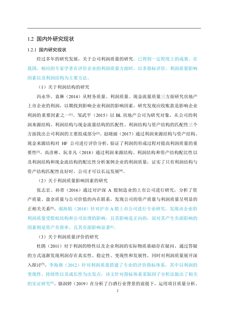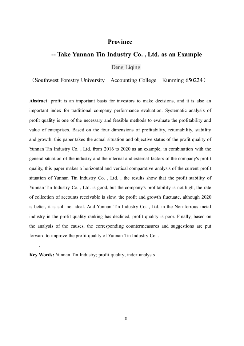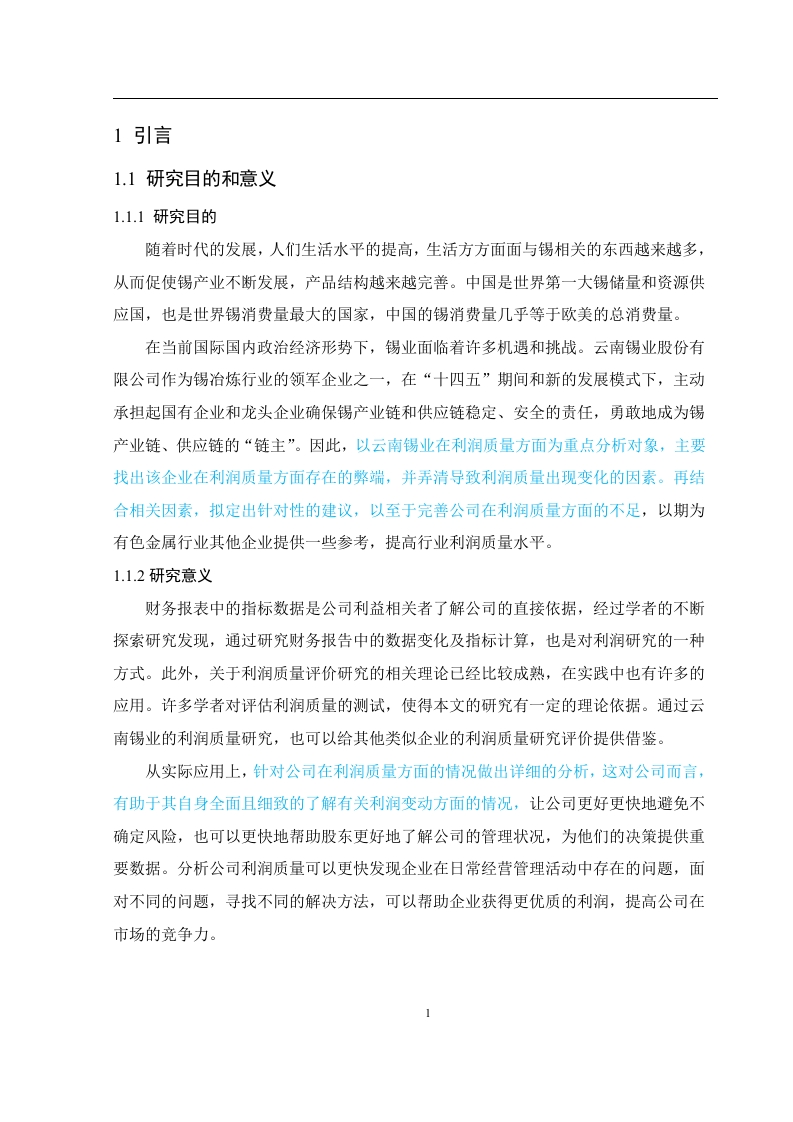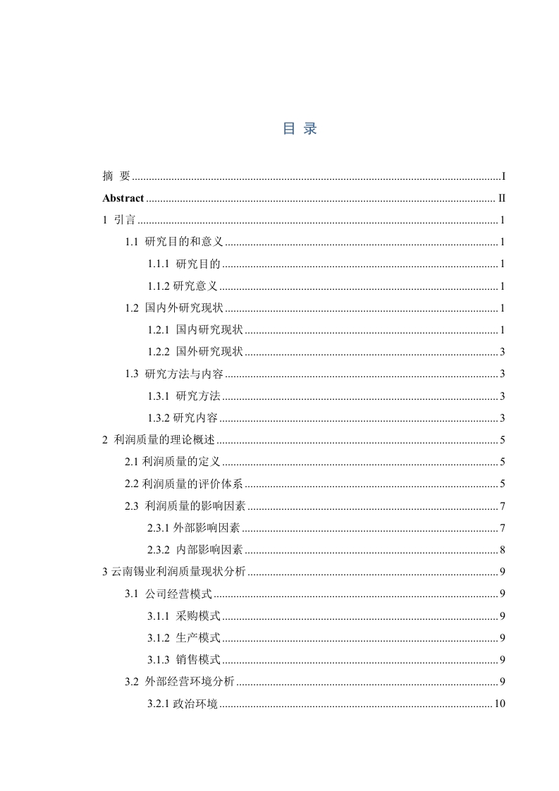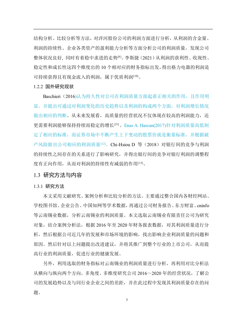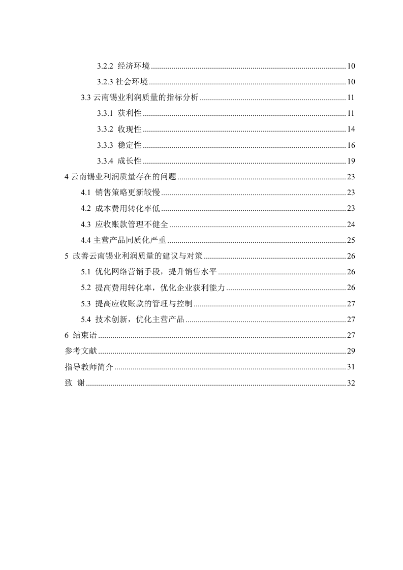 云南省上市公司利润质量研究以云南锡业股份有限公司为例摘要:利润是投资者们进行决策的重要依据,也是传统公司业绩评价的重要指标。系统的分析利润质量是对评价企业盈利能力以及价值评估是否必要可行的方法之一。本篇论文将从四个视角出发,分别为成长性、获利性、稳定性以及收现性,并运用2016一2020年时期云南锡业股份有限公司在利润质量方面的客观现状以及具体情况作为研究例子,结合行业总体状况和公司利润质量的内外部因素,从纵横两个方向对云南锡业股份限公司的利润现状进行对比分析,分析结果表明:云南锡业股份有限公司利润稳定性较好,但公司的收现性不高,应收账款回款速度较慢:利润的获利性和成长性波动起伏,虽然2020年有所提高,但仍不够理想。并且云南锡业股份有限公司在所属有色金属行业中的利润质量排名有所下降,利润质量较为不佳。最后,根据云南锡业股份有限公司在利润质量方面的情况,并结合之前的基础做出对应的解决措施和建议。关键字:云南锡业:利润质量:指标分析Research on Profit Quality of Listed Companies in YunnanIProvince-Take Yunnan Tin Industry Co.Ltd.as an ExampleDeng Liqing(Southwest Forestry University Accounting College Kunming 650224)Abstract:profit is an important basis for investors to make decisions,and it is also animportant index for traditional company performance evaluation.Systematic analysis ofprofit quality is one of the necessary and feasible methods to evaluate the profitability andvalue of enterprises.Based on the four dimensions of profitability,returnability,stabilityand growth,this paper takes the actual situation and objective status of the profit quality ofYunnan Tin Industry Co.,Ltd.from 2016 to 2020 as an example,in combination with thegeneral situation of the industry and the internal and external factors of the company's profitquality,this paper makes a horizontal and vertical comparative analysis of the current profitsituation of Yunnan Tin Industry Co.,Ltd.,the results show that the profit stability ofYunnan Tin Industry Co.,Ltd.is good,but the company's profitability is not high,the rateof collection of accounts receivable is slow,the profit and growth fluctuate,although 2020is better,it is still not ideal.And Yunnan Tin Industry Co.,Ltd.in the Non-ferrous metalindustry in the profit quality ranking has declined,profit quality is poor.Finally,based onthe analysis of the causes,the corresponding countermeasures and suggestions are putforward to improve the profit quality of Yunnan Tin Industry Co..Key Words:Yunnan Tin Industry;profit quality;index analysis目录摘要Abstract........J1引言1.1研究目的和意义…1.1.1研究目的…1.1.2研究意义.…1.2国内外研究现状…1.2.1国内研究现状1.2.2国外研究现状..31.3研究方法与内容31.3.1研究方法…31.3.2研究内容...32利润质量的理论概述.52.1利润质量的定义.52.2利润质量的评价体系..52.3利润质量的影响因素.72.3.1外部影响因素72.3.2内部影响因素83云南锡业利润质量现状分析.93.1公司经营模式…93.1.1采购模式.93.1.2生产模式.93.1.3销售模式…93.2外部经营环境分析.93.2.1政治环境..103.2.2经济环境.103.2.3社会环境.103.3云南锡业利润质量的指标分析3.3.1获利性..113.3.2收现性.143.3.3稳定性.163.3.4成长性.194云南锡业利润质量存在的问题234.1销售策略更新较慢234.2成本费用转化率低.234.3应收账款管理不健全….....244.4主营产品同质化严重…。.255改善云南锡业利润质量的建议与对策..265.1优化网络营销手段,提升销售水平265.2提高费用转化率,优化企业获利能力.….265.3提高应收账款的管理与控制.……275.4技术创新,优化主营产品.276结束语.27参考文献.….29指导教师简介.31致谢..32