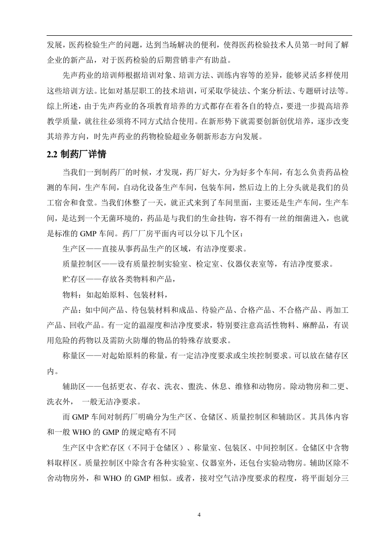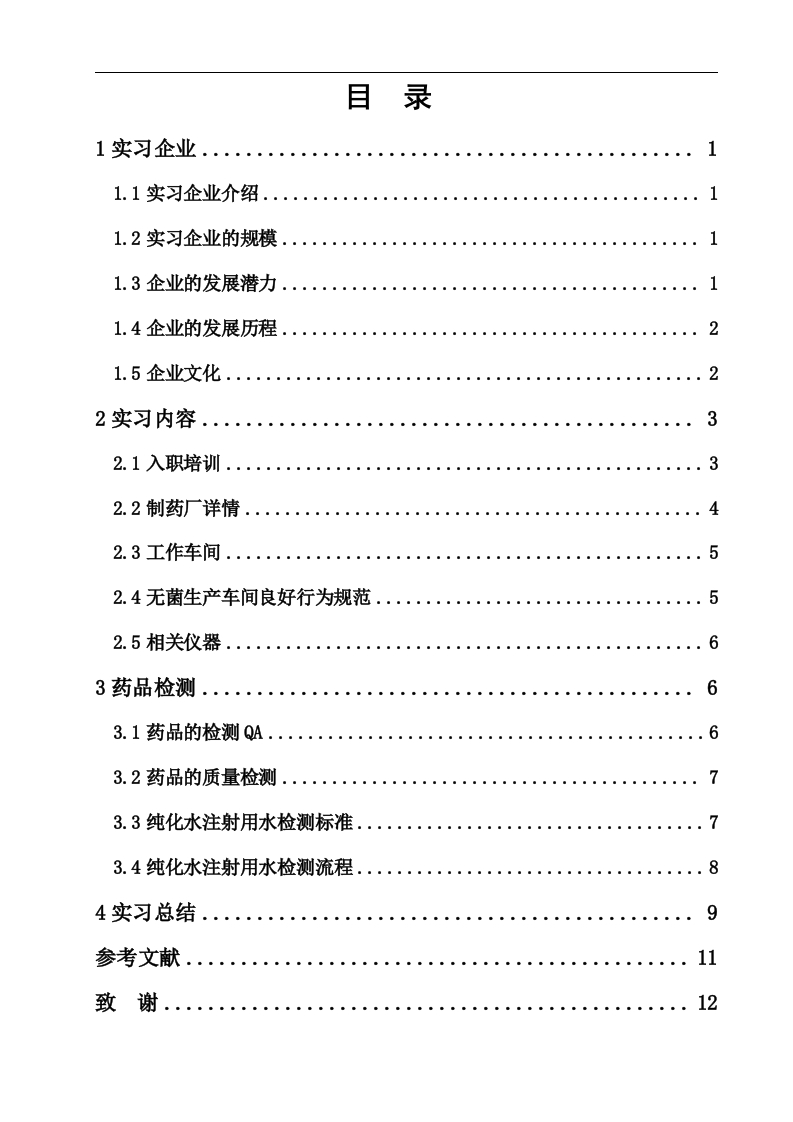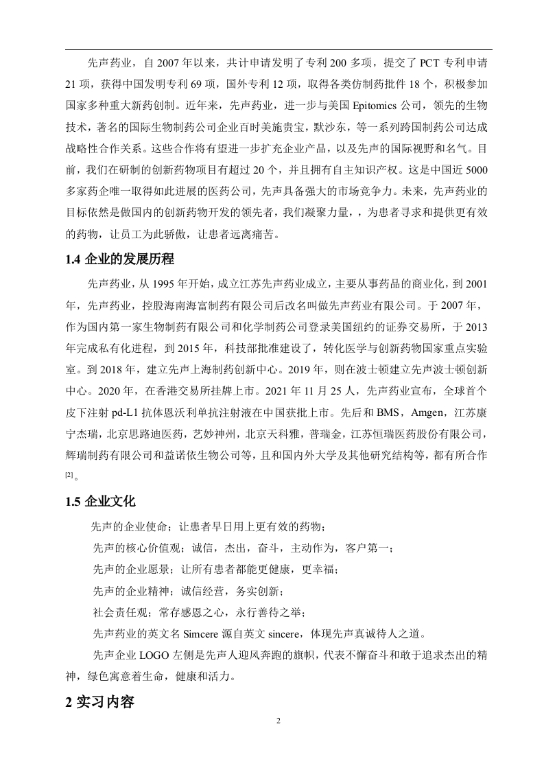 先声药业顶岗实习报告摘要:通过在先声药业顶岗实习的一顿时间,认真学习到药企的相关企业文化和药企的成长环境,以及对社会,对病人,带来的药品的一些基本流程。去了解到一个普通的原材料是通过种种途径,加工,提炼,临床研究,然后上市,最后到达病人手中的一个完整流程,而在接下来的这几个月,我则将会参与到这个药品的整个制药过程中的一个环节。用我在学校学习的专业知识,以及相关的能力,去进行药品的研制跟工作。为我们的健康做一份努力。结论:纸上得来终觉浅,书本上学习到的内容是固定的,在实验室学到的检验和在药企中的检验,也是不大一样的,在这里,我们亲自上手,认真学习专业知识和相关技巧。认真对待手里的每一个药品流出,药是服用的,所以我们加入这一行,这一过程,所要的不仅是认真,更是要有一种责任,一种高尚的道德。最后结合本次先声顶岗实习报告,做出总结,提出相关意见。关键词:先声药业:药品制剂流程:药品检测:目录1实习企业..1.1实习企业介绍11.2实习企业的规模..1.3企业的发展潜力....1.4企业的发展历程..21.5企业文化..22实习内容32.1入职培训..。32.2制药厂详情...。42.3工作车间......52.4无菌生产车间良好行为规范52.5相关仪器..63药品检测..·63.1药品的检测QA....3.2药品的质量检测....73.3纯化水注射用水检测标准.·73.4纯化水注射用水检测流程..84实习总结...9参考文献..11致谢..12先声药业顶岗实习专题报告1实习企业1.1实习企业介绍先声药业创立在1995年3月,总部设在江苏省南京市。先声药业是一家以创新药和研发为驱动力的一家制药公司,致力于让患者早点用上疗效更好的药物。先声药业执行创始人任晋生。我们是一家正在快速向创新与研发转型的制药公司,我们聚焦肿瘤,中枢神经和自身免疫三大疾病领域,在上海,南京,波士顿设有三大研发中心,获得国家科技部批准成立的。转化医学与创新药物国家重点实验室,连续多年获得中国创新医药企业十强和中国制药工业百强称号。我们凭借着优异的研发能力和商业化能力,主要产品在中国保持领先的市场份额。我们秉持开放式创新的研发策略,与多家跨国医药公司生物技术企业公司,成为优秀的合作伙伴,一起促进全球生命科学成果在中国的价值实现。先声药业产品组合包含了6种用于治疗肿瘤疾病的产品,3种用于治疗神经系统疾病的产品,5种用于自身免疫力提高的产品。4种用于心脑血管疾病的产品,15种用于治疗细菌和病毒感染性疾病的产品,以及多种用于治疗其他疾病的产品,包括自主生产的内部药品及来自销售推广的知名医药公司的第三方药品,截止2020年12月31日,先声药业有限公司共有超20共个产品被纳入国家医保药品目录,超过10个产品录入40多个政府单位机构或权威机构专业学会发布的指南和路径。发展成为一家真正帮助患者的医药公司!1.2实习企业的规模先声药业成立于1995年3月28日,至今为止,先声已经发展成集生产,研发,销售为一体,拥有5家通过GMP认证的现代化药品生产企业,一家全国性的药品营销公司。,一家药物研究院,拥有员工6512人的新型药业集团公司。目前先声药业还拥有45种以上的强大产品组合,覆盖了抗肿瘤,感染性疾病,心脑血管等领域。先声药业,还发展了以先声,再林,英太青,必存,等4个中国驰名商标。先声药业,拥有强大的研发能力,于2004年成立的先声药物研究院,拥有好多技术平台,可进行药物和生物化学药品的研究。先声药业,位于南京的研发中心基地,面积大概拥有26000平方米,成为国家医药企业中设施最全,最先进的研发基地之一。13企业的发展潜力先声药业,自2007年以来,共计申请发明了专利200多项,提交了PCT专利申请21项,获得中国发明专利69项,国外专利12项,取得各类仿制药批件18个,积极参加国家多种重大新药创制。近年来,先声药业,进一步与美国Epitomics公司,领先的生物技术,著名的国际生物制药公司企业百时美施贵宝,默沙东,等一系列跨国制药公司达成战略性合作关系。这些合作将有望进一步扩充企业产品,以及先声的国际视野和名气。目前,我们在研制的创新药物项目有超过20个,并且拥有自主知识产权。这是中国近5000多家药企唯一取得如此进展的医药公司,先声具备强大的市场竞争力。未来,先声药业的目标依然是做国内的创新药物开发的领先者,我们凝聚力量,,为患者寻求和提供更有效的药物,让员工为此骄傲,让患者远离痛苦。1.4企业的发展历程先声药业,从1995年开始,成立江苏先声药业成立,主要从事药品的商业化,到2001年,先声药业,控股海南海富制药有限公司后改名叫做先声药业有限公司。于2007年,作为国内第一家生物制药有限公司和化学制药公司登录美国纽约的证券交易所,于2013年完成私有化进程,到2015年,科技部批准建设了,转化医学与创新药物国家重点实验室。到2018年,建立先声上海制药创新中心。2019年,则在波士顿建立先声波士顿创新中心。2020年,在香港交易所挂牌上市。2021年11月25人,先声药业宣布,全球首个皮下注射pd-L1抗体恩沃利单抗注射液在中国获批上市。先后和BMS,Amgen,江苏康宁杰瑞,北京思路迪医药,艺妙神州,北京天科雅,普瑞金,江苏恒瑞医药股份有限公司,辉瑞制药有限公司和益诺依生物公司等,且和国内外大学及其他研究结构等,都有所合作②。1.5企业文化先声的企业使命:让患者早日用上更有效的药物:先声