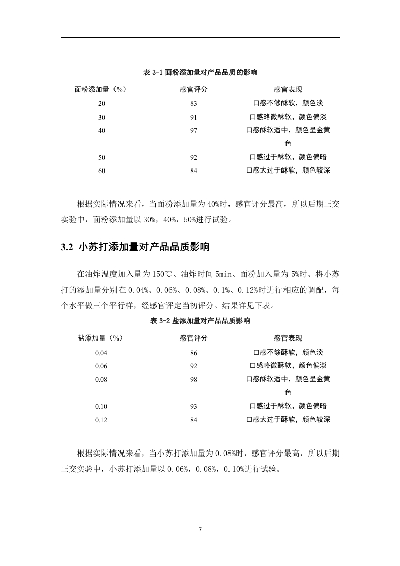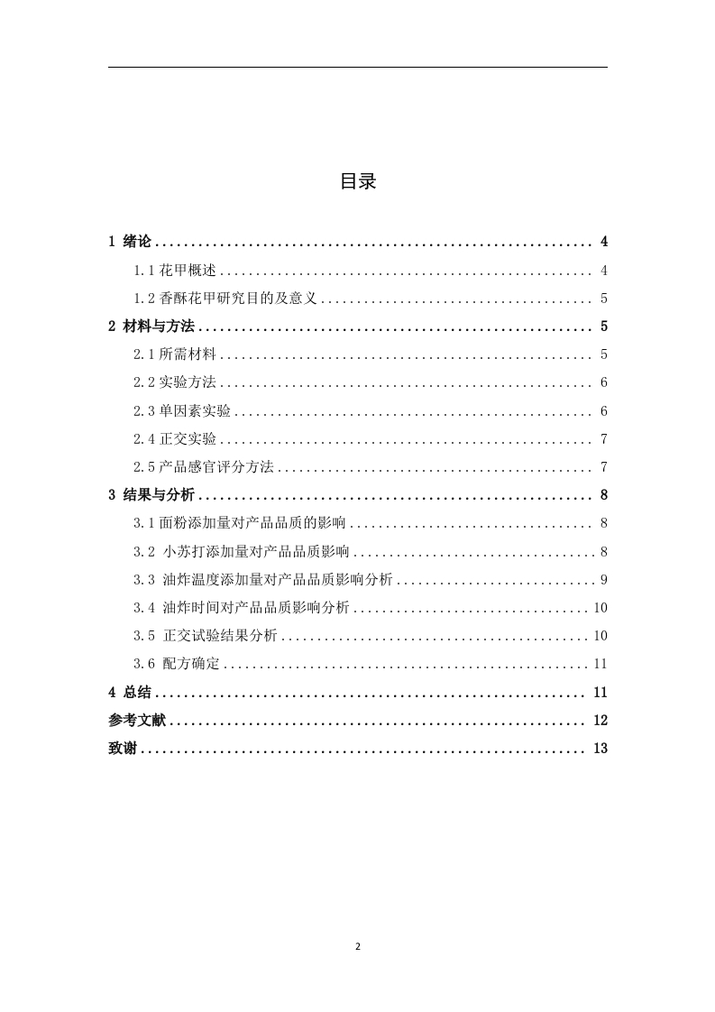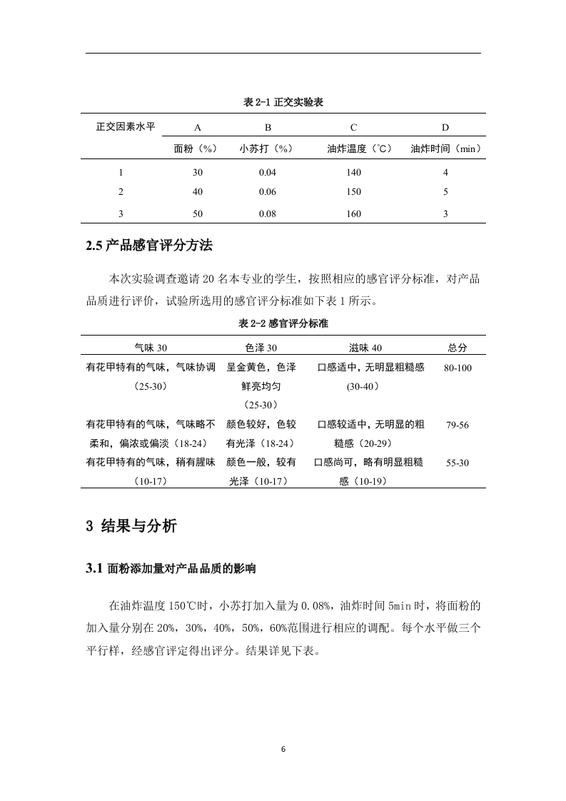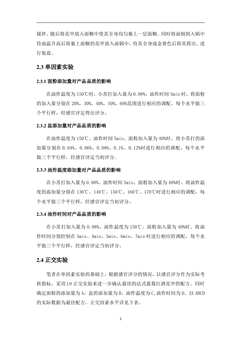 香酥花甲制作工艺研究摘要:花甲又被成为花蛤,其贝壳呈卵圆形。壳质坚厚,膨胀。壳顶稍突出,稍向前方弯曲,生长迅速,养殖周期短,适应性强,离水存活时间长。花甲作为海鲜产品,因其富含高蛋白,低脂肪,低热量的特点深受国人的喜爱,其已经作为我国夜市大排档中必不可少的一道菜。本文将以花甲为主材料,从油炸时间,油炸温度等方面进行工艺研究,制作一道口感酥脆,方便食用的菜肴。在基础配方上,已花甲原有的口感及其营养价值,已油炸烹饪的方式制作出口味俱佳的成品。本文通过对香酥花甲的制作工艺进行深入分析研究最终得出法式香酥花甲的最佳配方为:面粉添加量为40%,小苏打添加量为0.08%,油炸温度为150℃,油炸时间5min,所获得的香酥花甲,其色泽呈金黄色,且香气浓郁,具有花甲特有的香味,口感酥软,且颜色状态均匀。关键词:花甲:口感:制作工艺目录1绪论…41.1花甲概述.………41.2香酥花甲研究目的及意义52材料与方法.......52.1所需材料...52.2实验方法..62.3单因素实验....62.4正交实验.….·72.5产品感官评分方法73结果与分析....83.1面粉添加量对产品品质的影响83.2小苏打添加量对产品品质影响..3.3油炸温度添加量对产品品质影响分析...........93.4油炸时间对产品品质影响分析...·.··103.5正交试验结果分析...103.6配方确定............114总结.…11参考文献..12致谢..…13香酥花甲的制作工艺1绪论1.1花甲概述花甲具有很高的营养价值,具有蛋白质含量高,脂肪和热量含量低的优点。鱼肉中富含各种氨基酸和微量元素,每100g花甲中蛋白质含量约17%-18%,远远高于畜肉和禽肉,其中含有丰富的胶原蛋白和弹性蛋白。经检测,共有17种氨基酸在花甲中被检出,人体所需的八种必需氨基酸和四种呈味氨基酸均在其中,谷氨酸含量最高。人类从食物中摄取蛋白质时,对于蛋白质的含量和分解后产生的氨基酸的种类和含量有十分高的要求,尤其不能缺乏人体必需的氨基酸,因为花甲中的蛋白质能够满足以上要求,花甲蛋白质在人体中的吸收率可高达94%,高于猪肉、羊肉和牛肉。花甲中还富含各种营养成分和微量元素。每100g花甲中,约含钙50mg,磷204mg,钾334mg,钠53.7mg,硫胺素0.03mg,核黄素0.09mg,镁33mg,铁1mg,锰0.05mg,锌2.08mg,铜0.06mg,尼克酸2.7mg。钙是人体骨骼、牙齿的主要成分,也是维持神经传递、肌肉收缩、激素释放等生命活动的必需成分,对于青少年生长发育和维持人类身体机能具有重要作用。磷可以维持人体新陈代谢和体内酸碱平衡,参与形成骨组织和细胞。且花甲中钙磷比例适宜,可相互促进其在人体内的消化吸收。钾对于细胞内外渗透压和体内酸碱平衡的调节十分重要,并对保护神经健康,防治高血压、中风等病症方面也起着关键的作用。硫胺素可预防多种神经炎症和脚气病。核黄素对于人体生物氧化和能量代谢、细胞的生长代谢都有重要的作用。尼克酸可促进消化系统健康,扩张血管,促进血液循环,可用于治疗高血脂、脑血栓等病症。1.2香酥花甲研究目的及意义随着人们生活水平的不断提高,海鲜食品产业得到了迅速发展,开发健康、时尚、功能性食品将是海鲜食品未来主要的发展方向。花甲作为海鲜的一种产量非常大,其离开水也可以继续存活一段时间,因此十分有市场潜力,必将受到人们的追捧。我国是世界上人口最大的国家,每天对花甲的消耗也是十分具体大。但目前花甲普遍的吃法是炒、烹。而对花甲进行油炸的做法并不常见。因此香酥花甲的市场前景十分广阔,开发可行性良好。因此,以花甲为原料,开发新技术、新工艺,发展精深加工,研制出健康、营养、差异化的香酥花甲,有利于提高产品经济效益,平衡市场供给,满足消费者需求。本研究针对花甲进行油炸烹饪,制作出的香酥花甲,并通过单因素实验和正交试验,对产品的配方进行了筛选,确定了产品的工艺参数,制作出的香酥花甲不仅口感酥软,颜色呈金黄色,均匀分布在花甲四周。得到了同学们的一致好评。香酥花甲通过油炸的形式进行制作,为花甲的加工利用提供了新的思路和途径。2材料与方法2.1所需材料花甲购买于海鲜市场调料购买于欧亚超市小苏打由学校实验室提供盐由学校实验室提供2.2实验方法2.2.1工艺流程花甲·去沙→预处理→煮沸→调制面粉→裹面粉→油炸→装盘2.2.2操作要点将花甲放至盐水中将壳中的沙子泡出,并将花甲进行脱壳处理。预处理。并将花甲放入盐水中浸泡20min,进行除腥处理。随后放入开水中煮5min。加适量料酒、盐、鸡精、胡椒粉、少许白油炸温度、水混匀倒入面粉中搅拌成糊状,并加入小苏打,适量添加小苏打可以使香酥牛肉丸在之后的煮制和炸制的过程中受热膨胀而变得酥软,增加口感和风味。搅拌均匀后再将鸡蛋放入面糊中再次进行