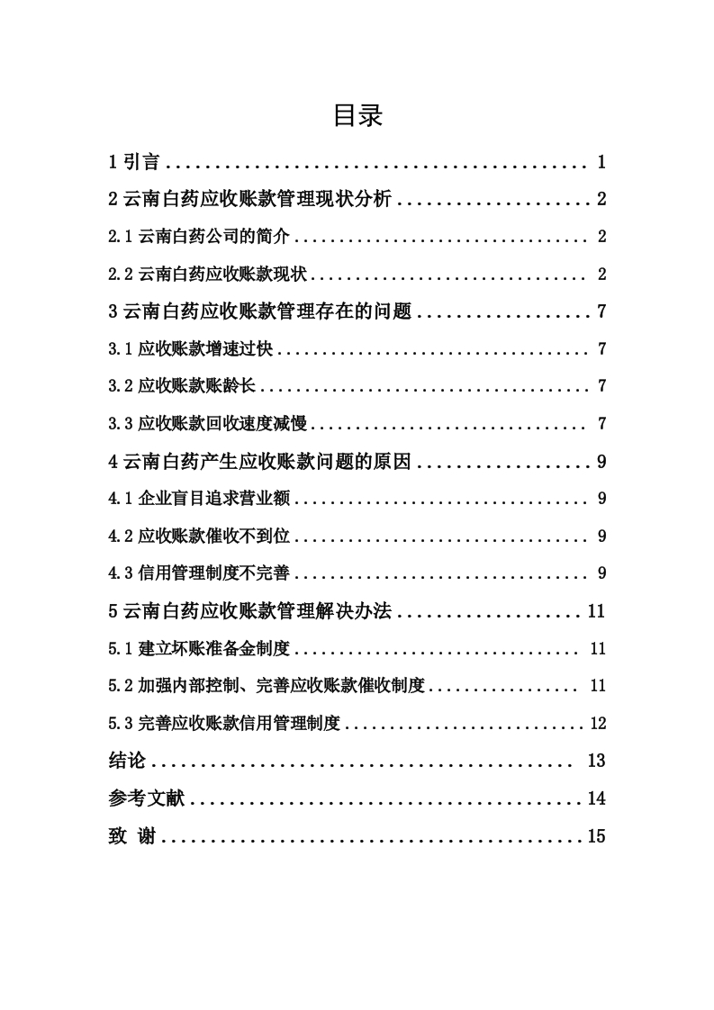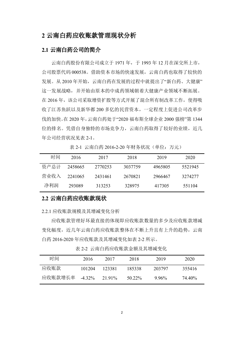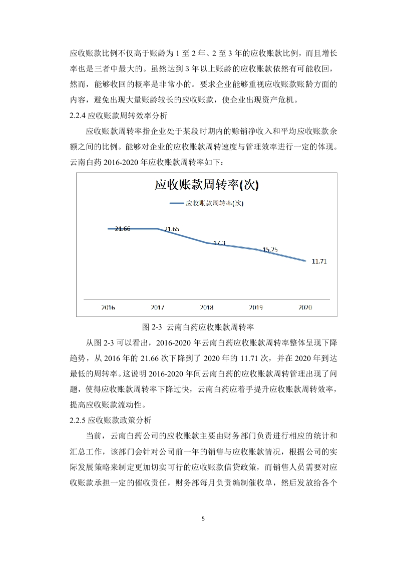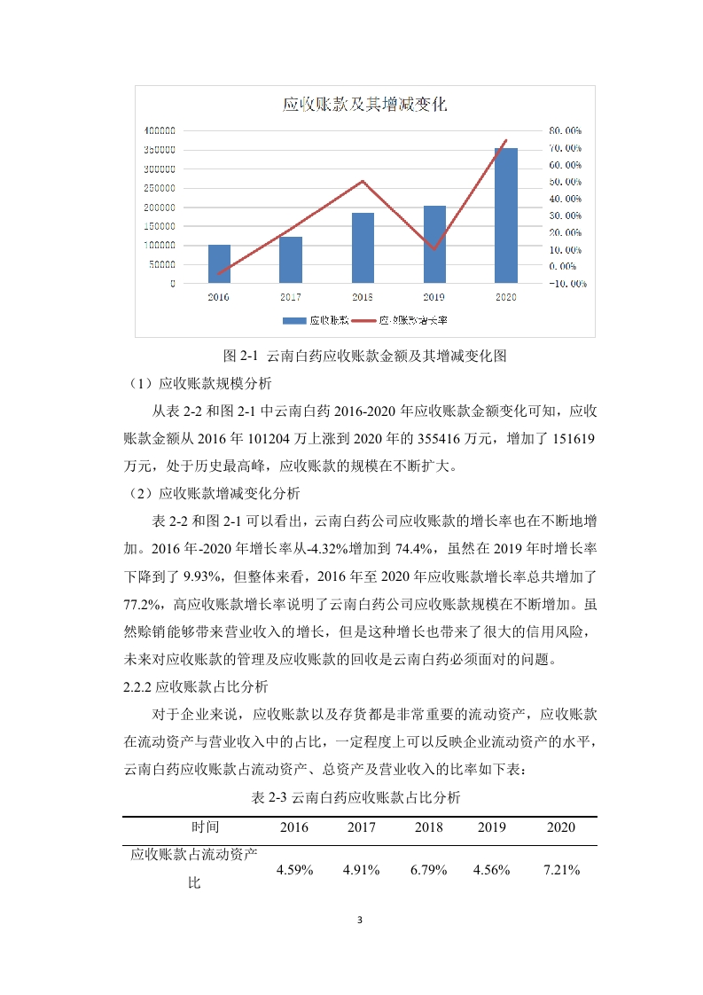 应收账款管理研究分析-以云南白药为例摘要:应收账款管理是企业日常管理的重要环节,作为一种促销手段,应收账款销售可以很大程度上促进产品的销售,增加销售收入,提升自身的竞争力。但是在买方市场环境下,许多企业为扩大销售额而改变自身的销售政策,放宽销售条件,以此抢占市场份额。这种销售方式在增加企业销售额的同时也会导致应收账款的大量增加,在整体经济环境恶化的环境下,过高的应收账款一旦无法按时收回就会影响企业资金的正常周转,影响企业的持续经营。本文以云南白药为研究对象,结合应收账款管理相关知识,对云南白药应收账款管理的现状进行分析,针对云南白药应收账款管理的现状分析其中存在的不足及原因,在此基础上提出相应的对策,以期通过这些措施提升云南白药应收账款管理质量。关键词:应收账款;应收账款管理:账龄:云南白药目录1引言...…2云南白药应收账款管理现状分析..。22.1云南白药公司的简介.·22.2云南白药应收账款现状.....23云南白药应收账款管理存在的问题.........73.1应收账款增速过快....3.2应收账款账龄长..73.3应收账款回收速度减慢.....。74云南白药产生应收账款问题的原因…94.1企业盲目追求营业额.......942应收账款催收不到位....94.3信用管理制度不完善.....…95云南白药应收账款管理解决办法.........115.1建立坏账准备金制度..........…115.2加强内部控制、完善应收账款催收制度.....a115.3完善应收账款信用管理制度...12结论...13参考文献..14致谢.......15应收账款管理研究分析一以云南白药为例1引言随着我国经济规模的不断扩大,越来越多的企业在不断地扩大自身的规模,市场上的竞争加剧。应收账款是双方企业基于信用情况下的一种交易方式。在企业经营过程中,一定范围内的应收账款是企业经营扩大规模以及增加客户等必不可少的手段。但是当企业的应收账款到了约定的交付时间而没有收到该款项时,企业需要采取一定的手段收取应收账款,而对于一些大概率不能返还的应收账款可能形成坏账企业更应该加大催收力度。应收账款管理是企业管理的重要一环,而且其回收成本是非常高的。如果所合作的客户产生资金周转问题,以及存在其他的信用问题,这个时候可能会导致企业应收账款难以回收的情况,就会造成企业自身的应收账款居高不下,甚至对企业自身正常经营造成冲击,企业因款项无法回收导致企业因流转资金不足而倒闭,因此企业在重视经营利润的同时也应重视应收账款的收回。随着规模的扩大和市场环境的恶化,云南白药近几年也扩大了赊销的形式,同时带来的难题是公司应收账款连续几年在不断攀升,这给云南白药这样的公司带来了巨大的风险和经营压力,如何解决这种问题的困扰是云南白药业必须面对的难题,这种问题能够得到及时解决有助于企业轻松上阵,提升自身的盈利能力。2云南白药应收账款管理现状分析2.1云南白药公司的简介云南白药股份有限公司成立于1971年,于1993年12月在深交所上市,公司股票代码000538。借助资本市场的快速发展,云南白药也取得了较快的发展。从2010年开始,云南白药在发展的过程中就提出了“新白药、大健康”这一发展战略,并开始由原本的中成药领域朝着大健康产业领域不断拓展。在2016年,该公司采取增资扩股等方式开展了混合所有制改革工作,使得吸收了江苏鱼跃以及新华都200多亿的民营资本,一定程度上促进公司改革步伐的加快。在2020年,云南白药处于“2020福布斯全球企业2000强榜”第1344位的排名。凭借自身独特的市场竞争力,云南白药取得了较好的业绩,近几年公司经营状况见表2-1。表2-1云南白药2016-2-20年财务状况(单位:万元)时间20162017201820192020资产总计24586652770253303775949658055521945营业收入22410652431461267082129664673274277净利润2930893132533289754173055511042.2云南白药应收账款现状2.2.1应收账款规模及其增减变化分析应收账款管理好坏最直接的体现即应收账款数量的多少及应收账款增减变化幅度,近几年云南白药应收账款整体在不断上升且有上升的趋势,云南白药2016-2020年应收账款及其增减变化如表2-2所示。表2-2云南白药应收账款金额及其增减变化时间20162017201820192020应收账款101204123381185338203797355416应收账款增长率4.32%21.91%50.22%9.96%74.40%2