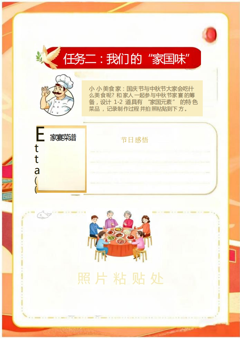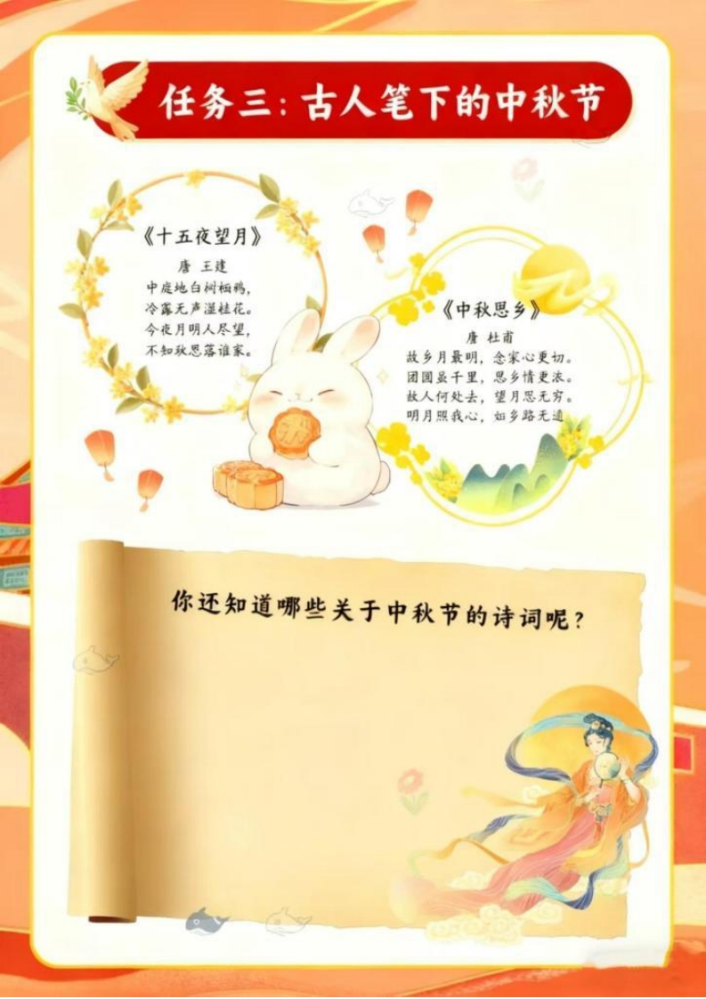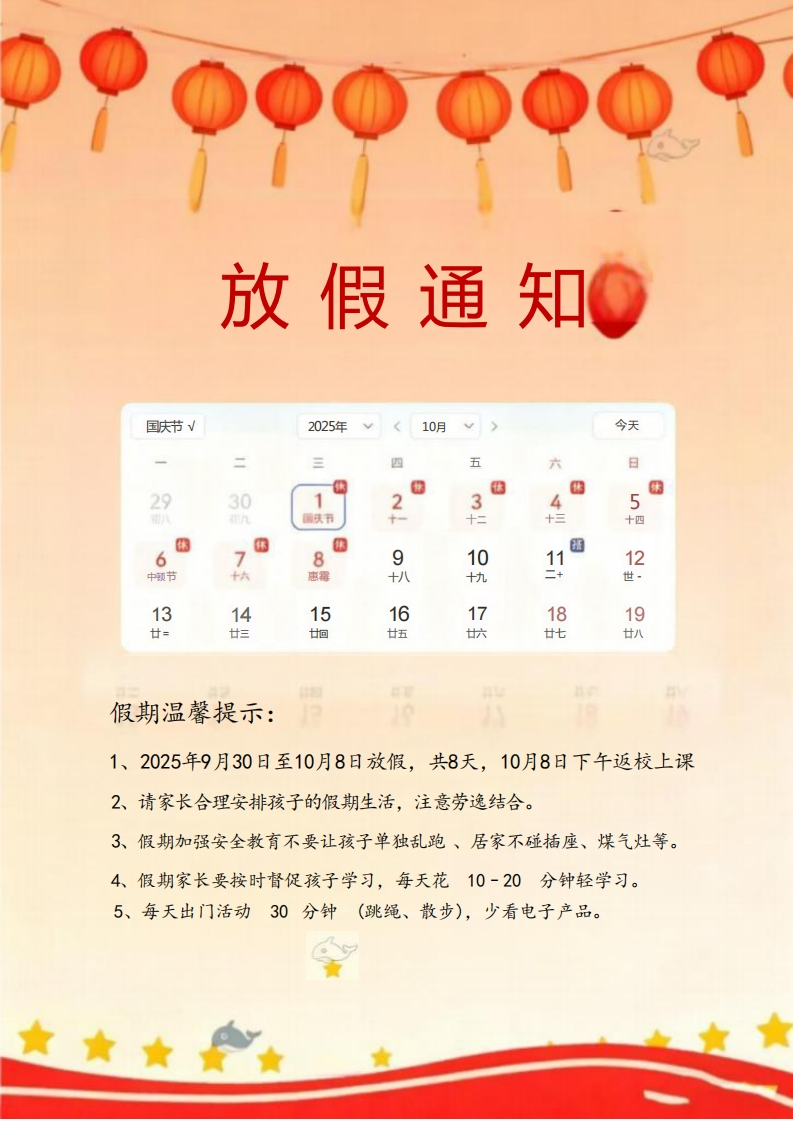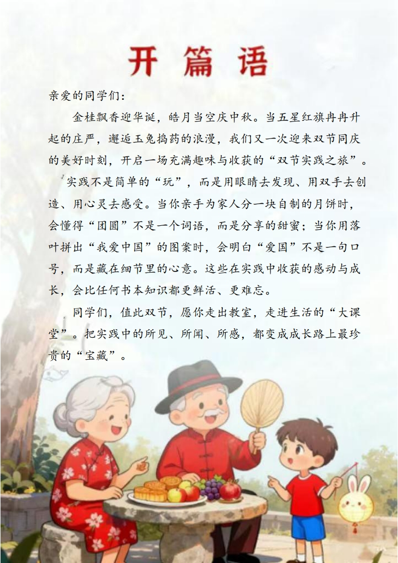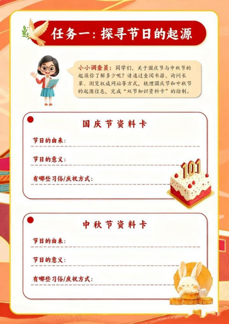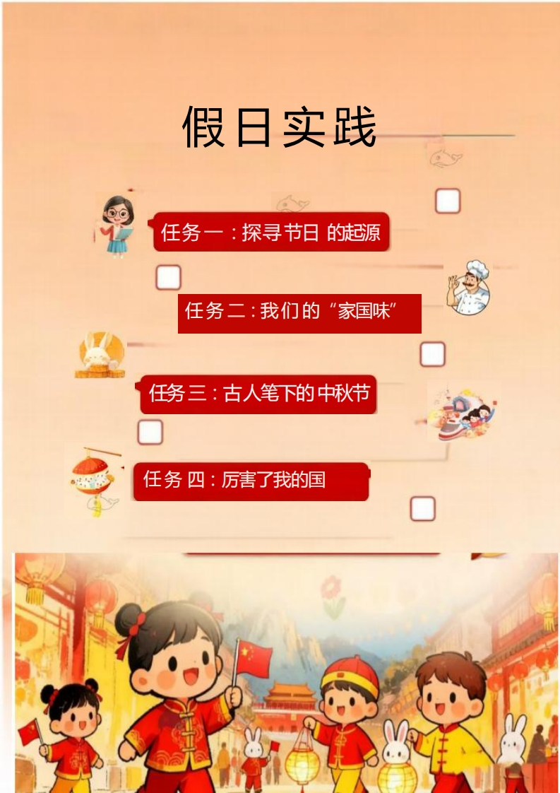 国庆中秋假日实践月光下的中国红学校:班级:姓名:开篇语亲爱的同学们:金桂飘香迎华诞,酷月当空庆中秋。当五星红旗冉冉升起的庄严,邂逅玉兔捣药的浪漫,我们又一次迎来双节同庆的美好时刻,开启一场充满趣味与收获的“双节实践之旅”。实践不是简单的“玩”,而是用眼睛去发现、用双手去创造、用心灵去感受。当你亲手为家人分一块自制的月饼时,会懂得“团圆”不是一个词语,而是分享的甜蜜;当你用落叶拼出“我爱中国”的图案时,会明白“爱国”不是一句口号,而是藏在细节里的心意。这些在实践中收获的感动与成长,会比任何书本知识都更鲜活、更难忘。同学们,值此双节,愿你走出教室,走进生活的“大课堂”。把实践中的所见、所闻、所感,都变成成长路上最珍贵的“宝藏”。放假通知○国庆节√2025年<10月>今天三四五六因困293012345圆庆节BBB6789101182中顿节十六忠霉+八十九世131415161819廿=廿扫回廿五六廿七廿八假期温馨提示:1、2025年9月30日至10月8日放假,共8天,10月8日下午返校上课2、请家长合理安排孩子的假期生活,注意劳逸结合。3、假期加强安全教育不要让孩子单独乱跑、居家不碰插座、煤气灶等。4假期家长要按时督促孩子学习,每天花10-20分钟轻学习。5、每天出门活动30分钟(跳绳、散步),少看电子产品。女★★女假日实践任务一:探寻节日的起源任务二:我们的“家国味”任务三:古人笔下的中秋节任务四:厉害了我的国