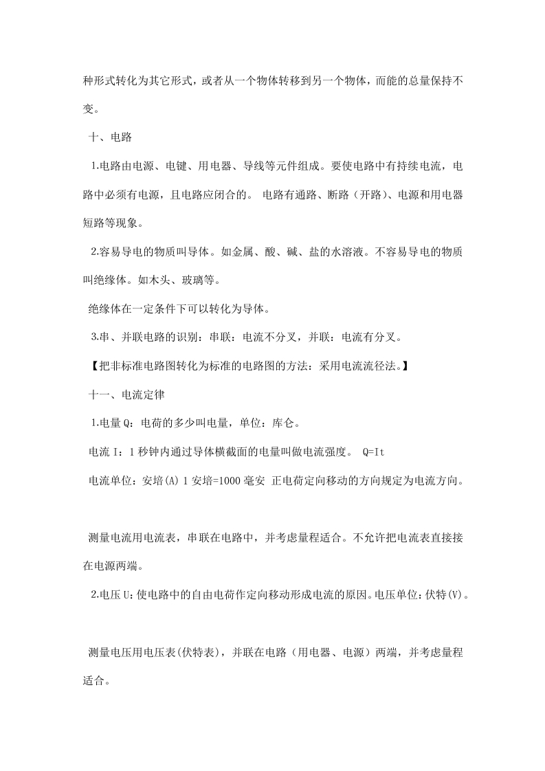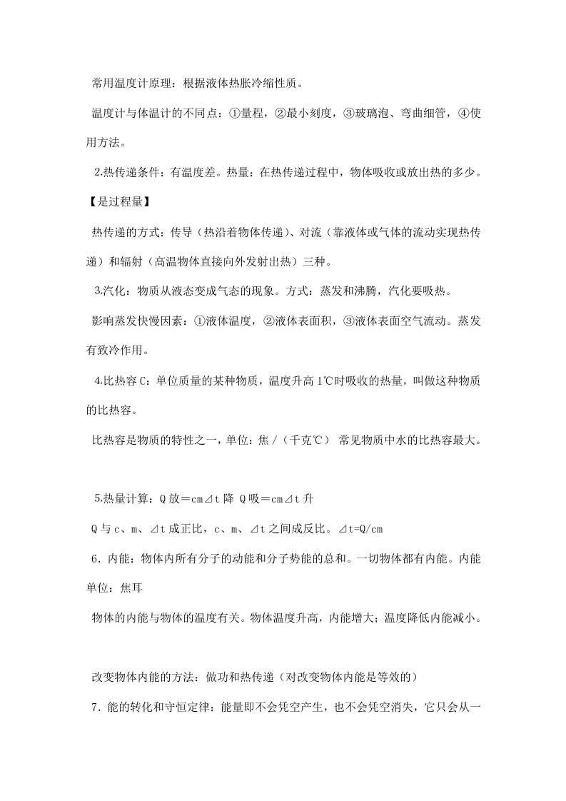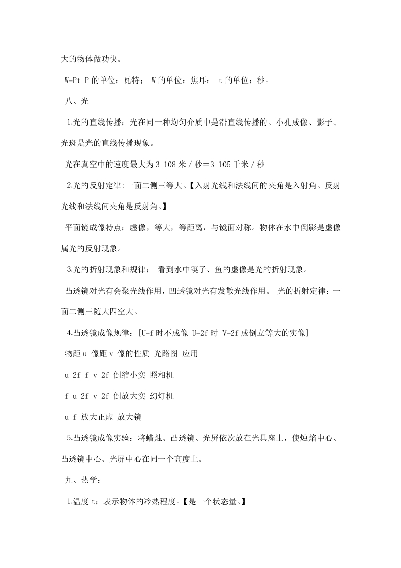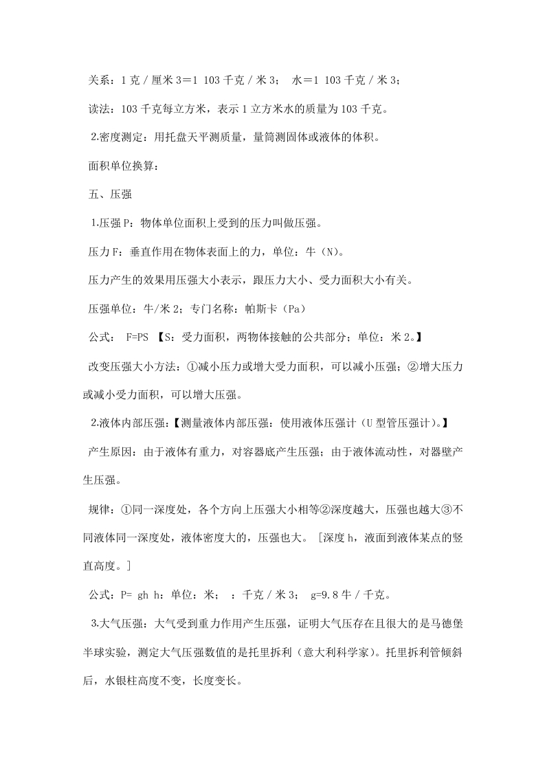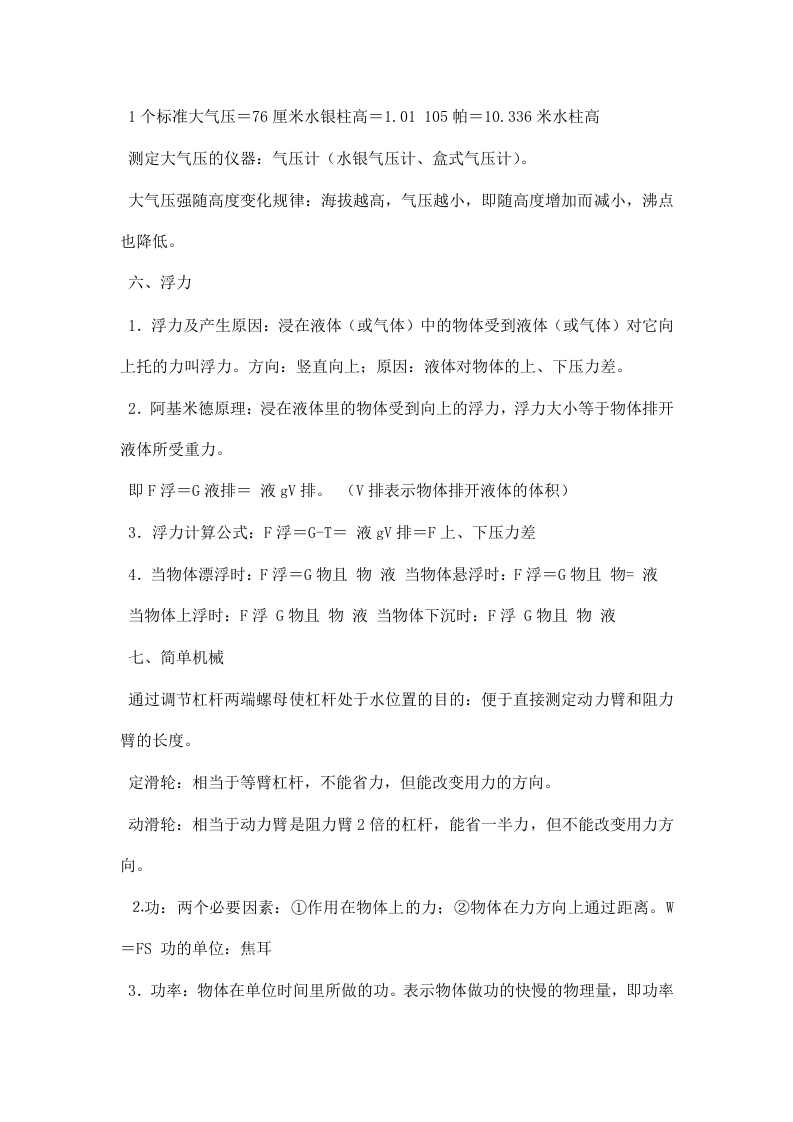 初中物理知识点总结初中物理基本概念概要一、测量1长度L:主单位:米:测量工具:刻度尺:测量时要估读到最小刻度的下一位:光年的单位是长度单位。2时间t:主单位:秒:测量工具:钟表:实验室中用停表。1时=3600秒,1秒=1000毫秒。3.质量m:物体中所含物质的多少叫质量。主单位:千克:测量工具:秤:实验室用托盘天平。二、机械运动1机械运动:物体位置发生变化的运动。参照物:判断一个物体运动必须选取另一个物体作标准,这个被选作标准的物体叫参照物。2.匀速直线运动:①比较运动快慢的两种方法:a比较在相等时间里通过的路程。b比较通过相等路程所需的时间。②公式:1米/秒=3.6千米/时。三、力1.力F:力是物体对物体的作用。物体间力的作用总是相互的。力的单位:牛顿(N)。测量力的仪器:测力器:实验室使用弹簧秤。力的作用效果:使物体发生形变或使物体的运动状态发生改变。物体运动状态改变是指物体的速度大小或运动方向改变。2.力的三要素:力的大小、方向、作用点叫做力的三要素。力的图示,要作标度:力的示意图,不作标度。3重力G:由于地球吸引而使物体受到的力。方向:竖直向下。重力和质量关系:G=mgm=G/gg9.8牛/千克。读法:9.8牛每千克,表示质量为1千克物体所受重力为9.8牛。重心:重力的作用点叫做物体的重心。规则物体的重心在物体的几何中心。4.二力平衡条件:作用在同一物体;两力大小相等,方向相反:作用在一直线上。物体在二力平衡下,可以静止,也可以作匀速直线运动。物体的平衡状态是指物体处于静止或匀速直线运动状态。处于平衡状态的物体所受外力的合力为零。6相同条件下,滚动摩擦力比滑动摩擦力小得多。滑动摩擦力与正压力,接触面材料性质和粗糙程度有关。【滑动摩擦、滚动摩擦、静摩擦】7.牛顿第一定律也称为惯性定律其内容是:一切物体在不受外力作用时,总保持静止或匀速直线运动状态。惯性:物体具有保持原来的静止或匀速直线运动状态的性质叫做惯性。四、密度1密度:某种物质单位体积的质量,密度是物质的一种特性。公式:m=V国际单位:千克/米3,常用单位:克/厘米3,关系:1克/厘米3=1103千克/米3:水=1103千克/米3:读法:103千克每立方米,表示1立方米水的质量为103千克。2密度测定:用托盘天平测质量,量简测固体或液体的体积。面积单位换算:五、压强1.压强P:物体单位面积上受到的压力叫做压强。压力F:垂直作用在物体表面上的力,单位:牛(N)。压力产生的效果用压强大小表示,跟压力大小、受力面积大小有关。压强单位:牛/米2:专门名称:帕斯卡(Pa)公式:F=PS【S:受力面积,两物体接触的公共部分:单位:米2。】改变压强大小方法:①减小压力或增大受力面积,可以减小压强:②增大压力或减小受力面积,可以增大压强。2液体内部压强:【测量液体内部压强:使用液体压强计(U型管压强计)。】产生原因:由于液体有重力,对容器底产生压强:由于液体流动性,对器壁产生压强。规律:①同一深度处,各个方向上压强大小相等②深度越大,压强也越大③不同液体同一深度处,液体密度大的,压强也大。[深度h,液面到液体某点的竖直高度。]公式:P=ghh:单位:米;:千克/米3:g=9.8牛/千克。3.大气压强:大气受到重力作用产生压强,证明大气压存在且很大的是马德堡半球实验,测定大气压强数值的是托里拆利(意大利科学家)。托里拆利管倾斜后,水银柱高度不变,长度变长。1个标准大气压=76厘米水银柱高=1.01105帕=10.336米水柱高测定大气压的仪器:气压计(水银气压计、盒式气压计)。大气压强随高度变化规律:海拔越高,气压越小,即随高度增加而减小,沸点也降低。六、浮力1.浮力及产生原因:浸在液体(或气体)中的物体受到液体(或气体)对它向上托的力叫浮力。方向:竖直向上;原因:液体对物体的上、下压力差。2.阿基米德原理:浸在液体里的物体受到向上的浮力,浮力大小等于物体排开液体所受重力。即F浮=G液排=液gV排。(V排表示物体排开液体的体积)3.浮力计算公式:F浮=G-T=液gV排=F上、下压力差4.当物体漂浮时:F浮=G物且物液当物体悬浮时:F浮=G物且物=液当物体上浮时:F浮G物且物液当物体下沉时:F浮G物且物液七、简单机械通过调节杠杆两端螺母使杠杆处于水位置的目的:便于直接测定动力臂和阻力臂的长度。定滑轮:相当于等臂杠杆,不能省力,但能改变用力的方向。动滑轮:相当于动力臂是阻力臂2倍的杠杆,能省一半力,但不能改变用力方向。2功:两个必要因素:①作用在物体上的力:②物体在力方向上通过距离。W=FS功的单位:焦耳3.功率:物体在单位时间里所做的功。表示物体做功的快慢的物理量,即功率