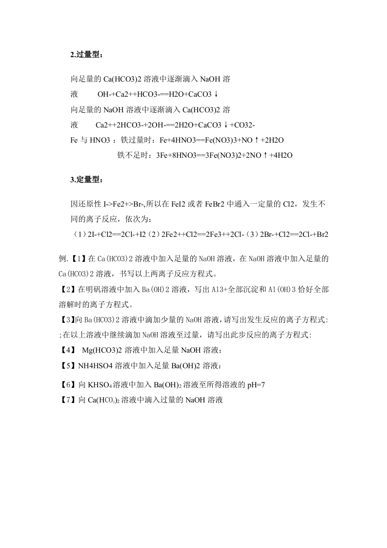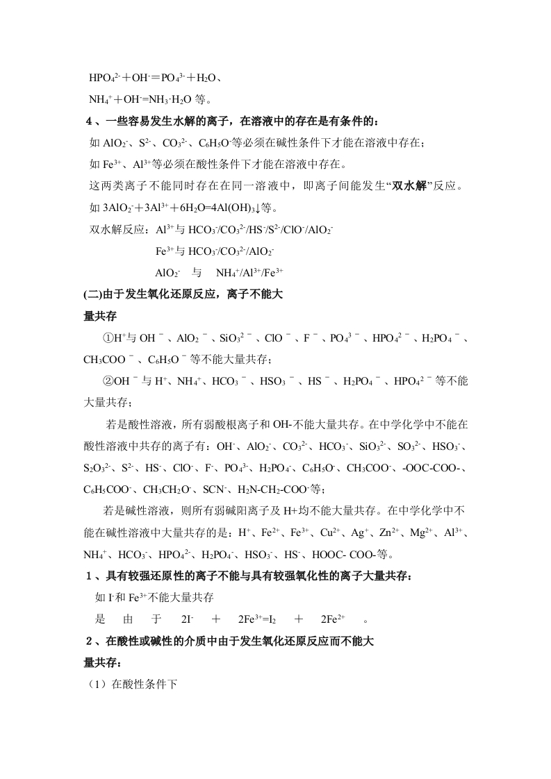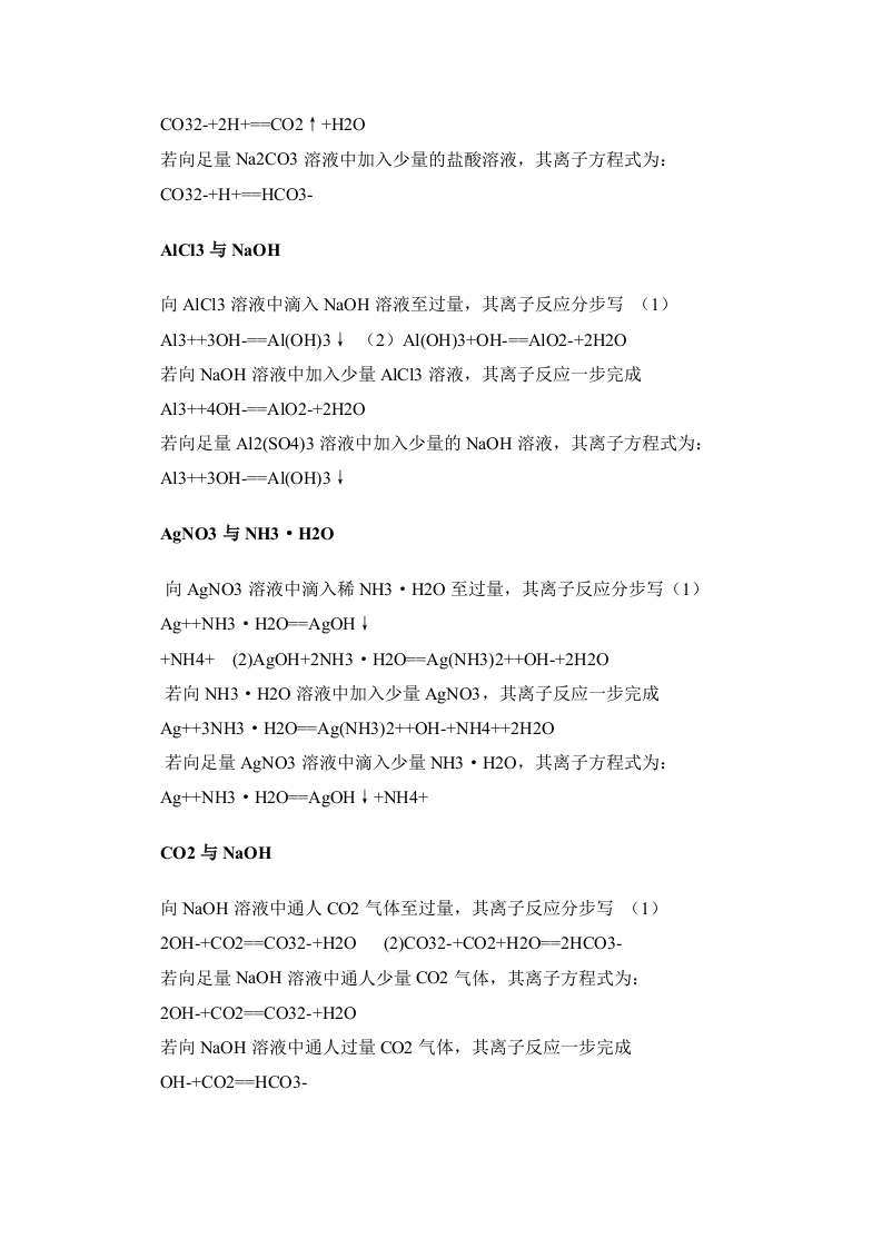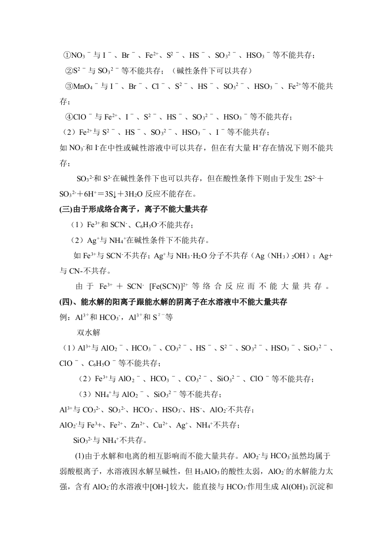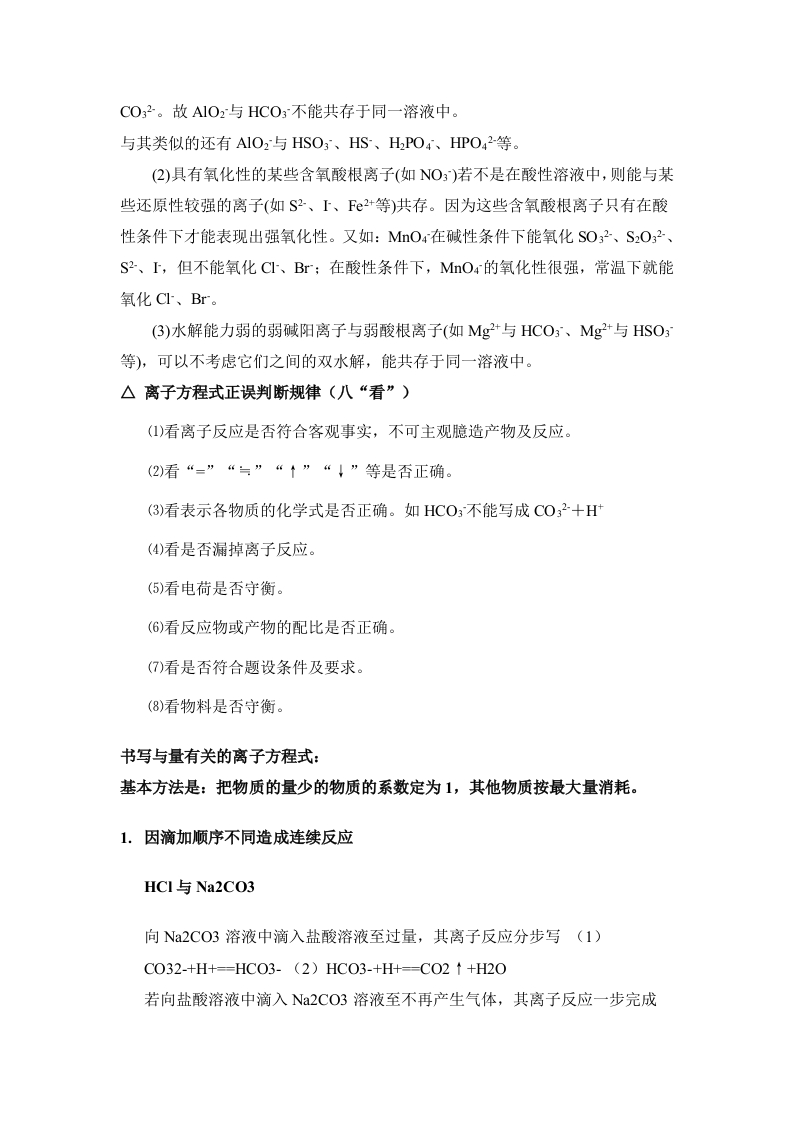 离子方程式和离子共存问题△判断离子是否可以共存的方法主要有:①看是否发生有气体或有沉淀生成的反应:②是否有弱电解质的生成:③是否与易水解的离子发生双水解:④是否会发生氧化还原反应:⑤形成络合物。(一)发生复分解反应1、有气体产生:H+与C032-、HC03-、S032-、HS03-、S2-、HS-等不能共存如CO32、S2、HS、HSO3、等易挥发的弱酸的酸根与H不能大量共存,主要是由于CO32+2H+=CO2↑+H20、HS+H+=H2S↑。2、有沉淀生成:①S042-与Ba2+、Ca2+、Ag+等不能共存;②C032-与Ba2+、Ca2+、Mg2+、Ag*、Cu2+、Zn2+等不能共存:③S2-与Cu2+、Pb2+、Fe2+、Hg2+、Ag+等不能共存;④0H-与Mg2+、A13+、Fe2+、Fe3+、Cu2+、Ag、Zn2+等不能共存:⑤AIO2-与HC03-不能大量共存:A1O2-+HC03-+HO=A1(OH)3↓+C032Mg2+不能与S042大量共存主要是由于Ba2++C032=CaC03、Ca2++S042=CaS04(微溶):Cu2+、Fe3+等不能与OH大量共存也是因为Cu2++2OH=Cu(OH)2↓,Fe3++3OH=Fe(OH)3l等。3、有弱电解质生成:如OH、CH3COO、PO43、HPO42、HPO4等与H不能大量共存,主要是由于OH+H=HO、CH3COO+H=CH3COOH:一些酸式弱酸根不能与OH大量共存是因为HC03+OH-C032+HO、HPO42+OH=PO43+H0、NH4+OH=NH3H2O等。4、一些容易发生水解的离子,在溶液中的存在是有条件的:如A1O2、S2、CO2、CHO等必须在碱性条件下才能在溶液中存在:如Fe+、A1+等必须在酸性条件下才能在溶液中存在。这两类离子不能同时存在在同一溶液中,即离子间能发生“双水解”反应。如3A1O2+3A13++6H20-4A1(OHD3等双水解反应:A13+与HCO3/CO32HS/S2/CIO/A1O2Fe3+与HCO3/CO32/A1O2AIO2与NH4+/AI3+Fe3(二)由于发生氧化还原反应,离子不能大量共存①Ht与OH-、A1O2-、SiO32-、C1O-、F-、P043-、HPO42-、H2PO4-、CH:COO-、CHsO-等不能大量共存:②OH-与H、NH4、HCO3-、HSO3-、HS、HPO4、HPO42-等不能大量共存:若是酸性溶液,所有弱酸根离子和OH-不能大量共存。在中学化学中不能在酸性溶液中共存的离子有:OH、A1O2、C032、HC03、SiO32、S032、HS03、S2O32、S2、HS、C1O、F、PO43、H2PO4、C6H50、CHCO0、-O0C-COO-、C6H5COO、CHCH2O、SCN、H2N-CH2-COO等:若是碱性溶液,则所有弱碱阳离子及H+均不能大量共存。在中学化学中不能在碱性溶液中大量共存的是:H、Fe2+、Fe3+、Cu2+、Ag*、Zn2+、Mg2+、A13+、NH4、HCO3、HPO42、H2PO4、HSO3、HS、HOOC-COO-等。1、具有较强还原性的离子不能与具有较强氧化性的离子大量共存:如和Fe+不能大量共存是由于2I+2Fe3+=I2+2Fe2+2、在酸性或碱性的介质中由于发生氧化还原反应而不能大量共存:(1)在酸性条件下①NO3-与I-、Br-、Fe2+、Sg-、HS-、SO32-、HSO3-等不能共存;②S2-与S032-等不能共存:(碱性条件下可以共存)③MnO4-与I-、Br-、Cl-、S2-、HS-、S032-、HSO3-、Fe2+等不能共存:④ClO-与Fe2+、I-、S2-、HS-、S032-、HS03-等不能共存;(2)Fe2+与S2-、HS-、S032-、HS03-、I-等不能共存:如NO3和上在中性或碱性溶液中可以共存,但在有大量H存在情况下则不能共存:S032和S2在碱性条件下也可以共存,但在酸性条件下则由于发生2S2+S0,2+6H=3S+3H20反应不能存在。(三)由于形成络合离子,离子不能大量共存(1)Fe+和SCN、CHO不能共存:(2)Ag与NH4在碱性条件下不能共存。如Fe3+与SCN不共存;Ag*与NH3HO分子不共存(Ag(NH3)2OH);Ag+与CN-不共存。由于Fe++SCN-[Fe(SCN)]P+等络合反应而不能大量共存。(四)、能水解的阳离子跟能水解的阴离子在水溶液中不能大量共存例:AI3+和HCO3,AI+和S2-等双水解(1)A13+与A1O2、HC03、C02-、HS、S2-、S032-、HS03、Si032-、CIO-、CH50-等不能共存:(2)Fe+与A1O2-、HC03-、C032-、Si02-、C10-等不能共存:(3)NH4与A1O2-、SiO32-等不能共存:A13+与CO32、S032、HCO3、HSO3、HS、A1O2不共存:AlO2与Fe3+、Fe2+、Zn2+、Cu2+、Ag、NH4不共存:SiO2与NH4*不共存。(1)由于水解和电离的相互影响而不能大量共存。A1O2与HCO3虽然均属于弱酸根离子,水溶液因水解呈碱性,但H3A1O3的酸性太弱,AIO2的水解能力太强,含有A1O2的水溶液中[OH-]较大,能直接与HCO3作用生成A1(OH)3沉淀和CO32。故A1O2与HCO3不能共存于同一溶液中。与其类似的还有A1O2与HSO3、HS、HPO4、HPO42等。(2)具有氧化性的某些含氧酸根离子(如NO3)若不是在酸性溶液中,则能与某些还原性较强的离子(如S2、上、F2+等)共存。因为这些含氧酸根离子只有在酸性条件下才能表现出强氧化性。又如:MnO4在碱性条件下能氧化SO32、S2O32、S2、,但不能氧化C、Br:在酸性条件下,MnO4的氧化性很强,常温下就能氧化C、Br。(3)水解能力弱的弱碱阳离子与弱酸根离子(如Mg2+与HCO3、Mg+与HSO等),可以不考虑它们之间的双水解,能共存于同一溶液中。△离子方程式正误判断规律(八“看”)(1)看离子反应是否符合客观事实,不可主观臆造产物及反应。(2)看“=”“=”“↑”“↓”等是否正确。(3)看表示各物质的化学式是否正确。如HCO3不能写成C032+H(4)看是否漏掉离子反应。(5)看电荷是否守衡。(6)看反应物或产物的配比是否正确。(7)看是否符合题设条件及要求。(8)看物料是否守衡。书写与量有关的离子方程式:基本方法是:把物质的量少的物质的系数定为1,其他物质按最大量消耗。1.因滴加顺序不同造成连续反应HCI与Na2CO3向N2CO3溶液中滴入盐酸溶液至过量,其离子反应分步写(1)CO32-+H+-HCO3-(2)HCO3-+H+--CO2 t+H20若向盐酸溶液中滴入Na2CO3溶液至不再产生气体,其离子反应一步完成