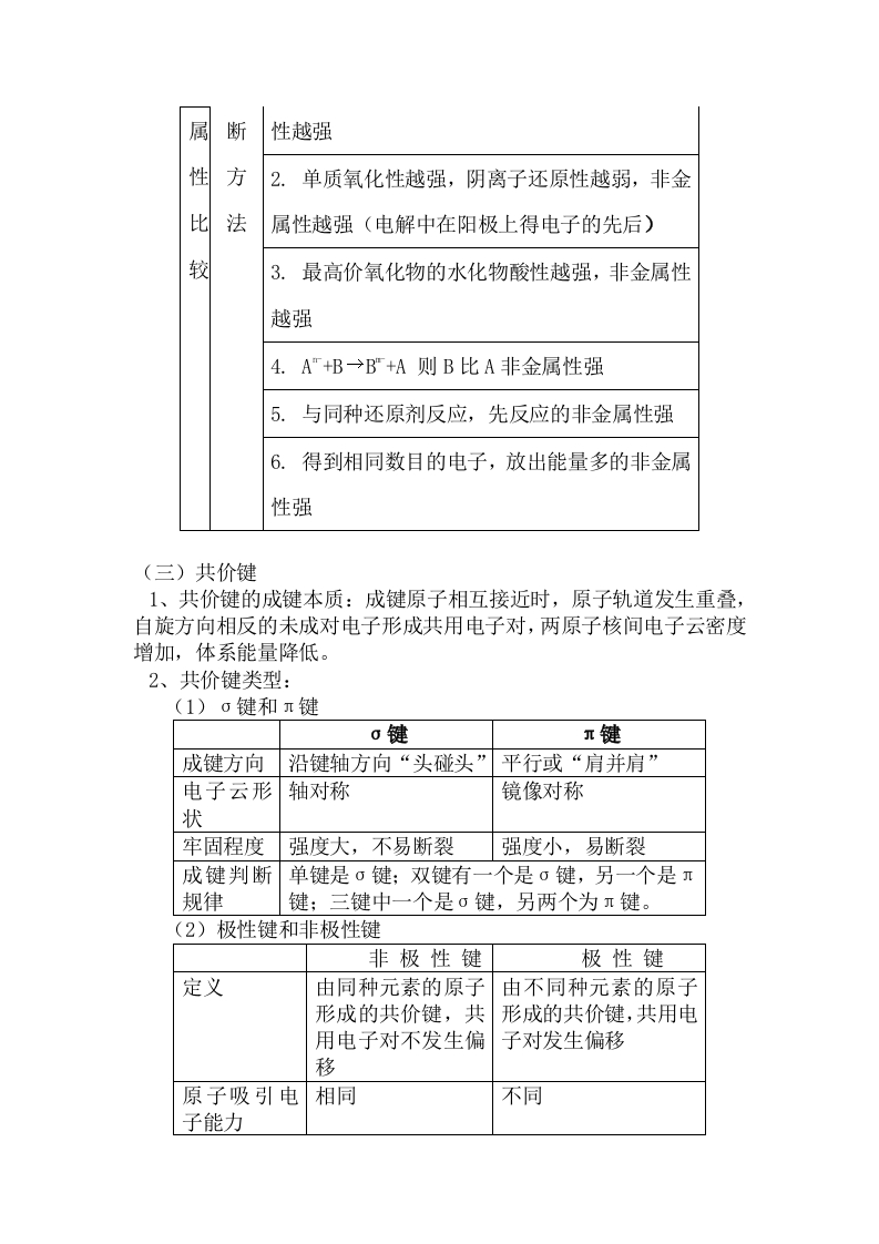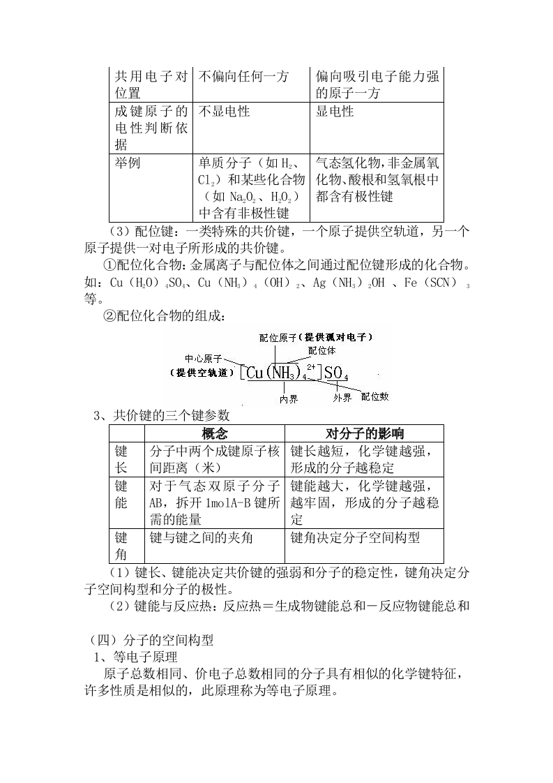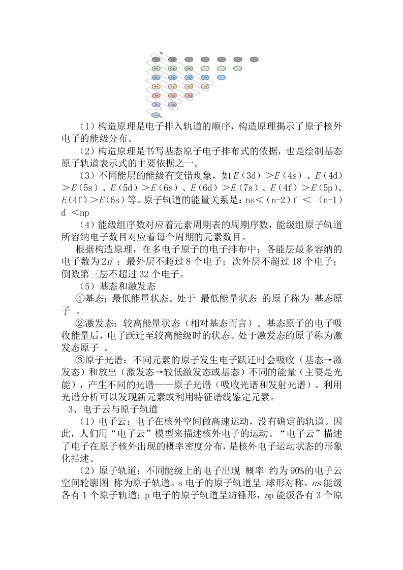 高中化学选修3知识点总结二、复习要点1、原子结构2、元素周期表和元素周期律3、共价键4、分子的空间构型5、分子的性质6、晶体的结构和性质(一)原子结构1、能层和能级(1)能层和能级的划分能层能级1Is2L283I3s3p3d4N4s4p4d4fO5p5d6P6s6P6dQ7s7P7d原子轨道:1357可容纳电子数:261014①在同一个原子中,离核越近能层能量越低。②同一个能层的电子,能量也可能不同,还可以把它们分成能级s、p、d、f,能量由低到高依次为s、p、d、f。③任一能层,能级数等于能层序数。④s、p、d、f…可容纳的电子数依次是1、3、5、7…的两倍。⑤能层不同能级相同,所容纳的最多电子数相同。(2)能层、能级、原子轨道之间的关系能层n123林号KLMN能绿P轨道数13357最多容纳262610261014的电子数2818322n2每能层所容纳的最多电子数是:2n2(n:能层的序数)。2、构造原理w@●●○@⊙⑧@⊙o@@⊙D⊙DO。®(1)构造原理是电子排入轨道的顺序,构造原理揭示了原子核外电子的能级分布。(2)构造原理是书写基态原子电子排布式的依据,也是绘制基态原子轨道表示式的主要依据之一。(3)不同能层的能级有交错现象,如E(3d)>E(4s)、E(4d)>E(5s)、E(5d)>E(6s)、E(6d)>E(7s)、E(4f)>E(5p)、E(4f)>E(6s)等。原子轨道的能量关系是:ns<(n-2)f<(n-1)d Mg>A1>Si>P>S>C1