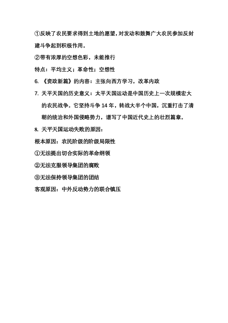 初二第3课背诵内容1.太平天国运动兴起的原因:①外因(客观原因):外国资本主义的侵略,民族矛盾加剧②内因(根本原因):清政府统治腐败,阶级矛盾激化③诱因(直接原因):自然灾害频发④理论指导(个人原因):洪秀全创立“拜上帝教"推动起义2.太平天国运动大事件表进程时间及事件兴起1851年1月金田起义建制1851年9月永安建制定都1853年3月定都天京全盛1853—1856年北伐与西征由盛转衰1856年天京事变失败1864年天京陷落3.永安封王存在隐患:①具有浓厚的封建性②为以后天王和东王的争权埋下祸根。4.太平军进军如此迅速的原因:①清政府腐败无能;②阶级矛盾尖锐,洪秀全的理念获得了广大农民的支持;③太平军纪律严明,作战英勇5.《天朝田亩制度》的评价及特点:①反映了农民要求得到土地的愿望,对发动和鼓舞广大农民参加反封建斗争起到积极作用。②带有浓厚的空想色彩,未能推行特点:平均主义;革命性;空想性6.《资政新篇》的内容:主张向西方学习,改革内政7.天平天国的历史意义:太平天国运动是中国历史上一次规模宏大的农民战争。它坚持斗争14年,转战大半个中国,沉重打击了清朝的统治和外国侵略势力,谱写了中国近代史上的壮烈篇章。8.天平天国运动失败的原因:根本原因:农民阶级的阶级局限性①无法提出切合实际的革命纲领②无法克服领导集团的腐败③无法保持领导集团的团结客观原因:中外反动势力的联合镇压