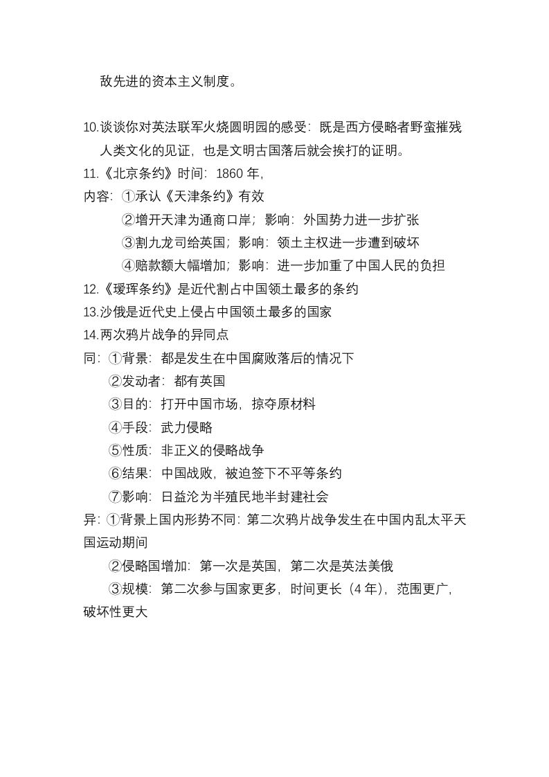 初二第2课背诵内容1.英国对华贸易达不到预期的原因?①中国自然经济抵制:②鸦片输入和白银外流削弱了中国购买力。2.第二次鸦片战争的时间:1856—1860年3.第二次鸦片战争的实质:第二次鸦片战争是鸦片战争的延续。4.第二次鸦片战争的发动者:英法;支持者:美俄5.第二次鸦片战争的影响:中国半殖民地半封建化程度进一步加深。6.第二次鸦片战争爆发的原因:根本原因:进一步打开中国市场,扩大侵略权益直接原因:“亚罗号事件”(英国);“马神甫事件”(法国)7.两次鸦片战争通商口岸的变化:①数量增加,②范围扩大,从东南沿海深入到长江中下游地区8.《天津条约》时间:1858年(第二次鸦片战争)内容:①西方列强获得外国公使进驻北京;影响:方便干预中国内政,破坏我国外交主权。②增开汉口,南京等十处为通商口岸;影响:进一步打开中国市场,外国势力深入到长江中下游地区。③外国商船和军舰可以在长江各口岸自由航行;影响:破坏了内河航运权。④英法两国还得到巨额赔款;影响:进一步加重了人民负担。9.第二次鸦片战争清政府失败的根本原因:腐朽落后的封建制度不敌先进的资本主义制度。10.谈谈你对英法联军火烧圆明园的感受:既是西方侵略者野蛮摧残人类文化的见证,也是文明古国落后就会挨打的证明。11.《北京条约》时间:1860年,内容:①承认《天津条约》有效②增开天津为通商口岸;影响:外国势力进一步扩张③割九龙司给英国;影响:领土主权进一步遭到破坏④赔款额大幅增加;影响:进一步加重了中国人民的负担12.《瑗珲条约》是近代割占中国领土最多的条约13.沙俄是近代史上侵占中国领土最多的国家14.两次鸦片战争的异同点同:①背景:都是发生在中国腐败落后的情况下②发动者:都有英国③目的:打开中国市场,掠夺原材料④手段:武力侵略⑤性质:非正义的侵略战争⑥结果:中国战败,被迫签下不平等条约⑦影响:日益沦为半殖民地半封建社会异:①背景上国内形势不同:第二次鸦片战争发生在中国内乱太平天国运动期间②侵略国增加:第一次是英国,第二次是英法美俄③规模:第二次参与国家更多,时间更长(4年),范围更广,破坏性更大