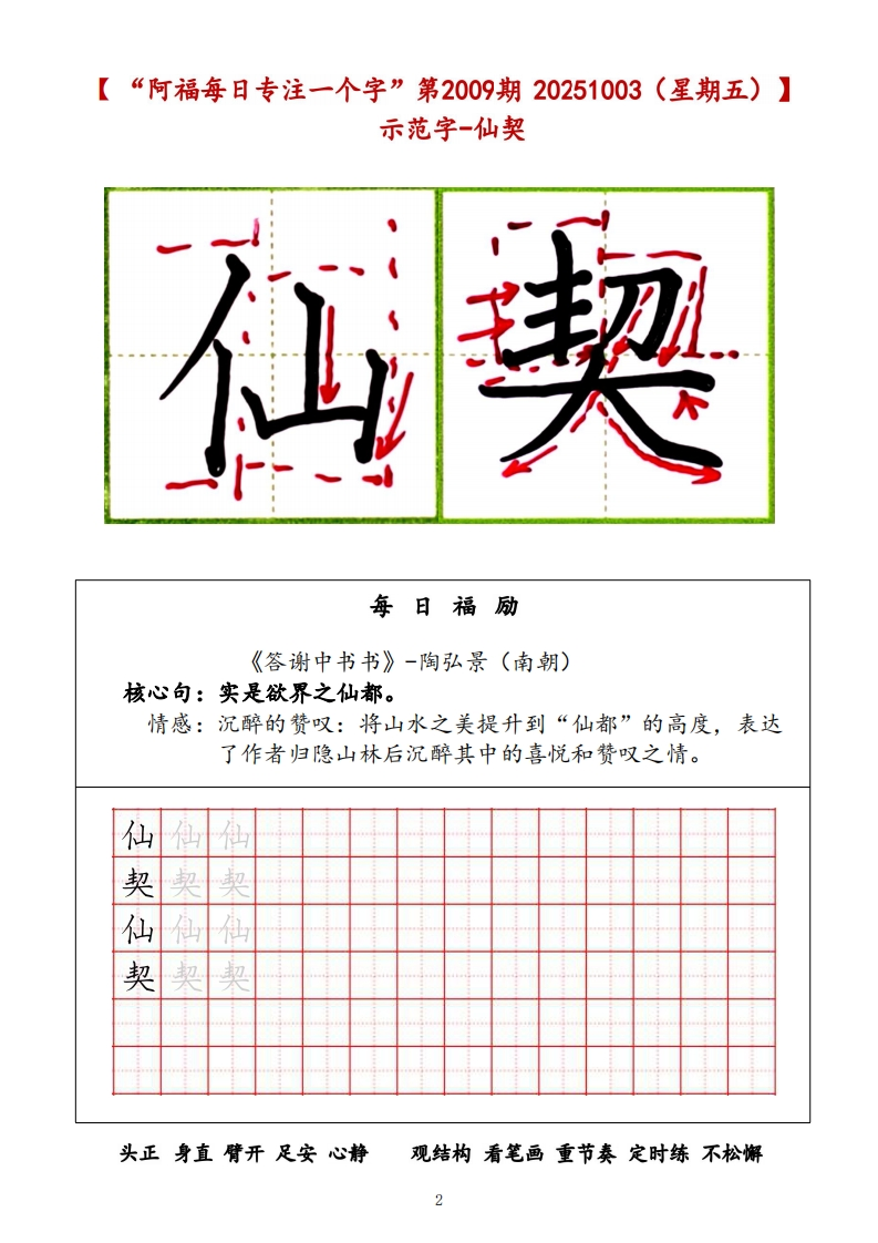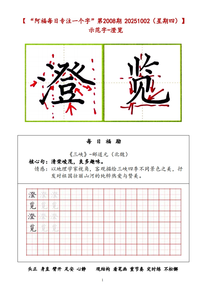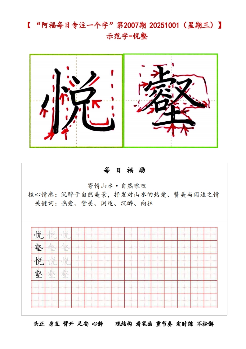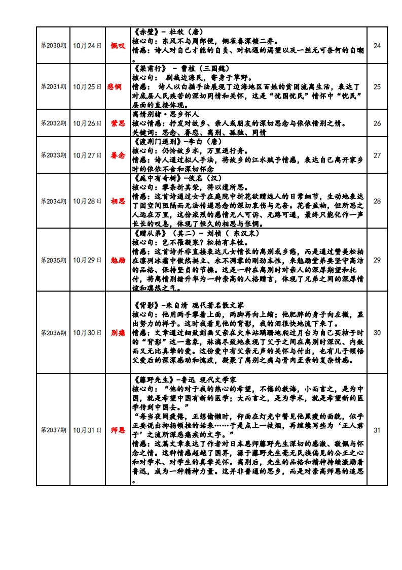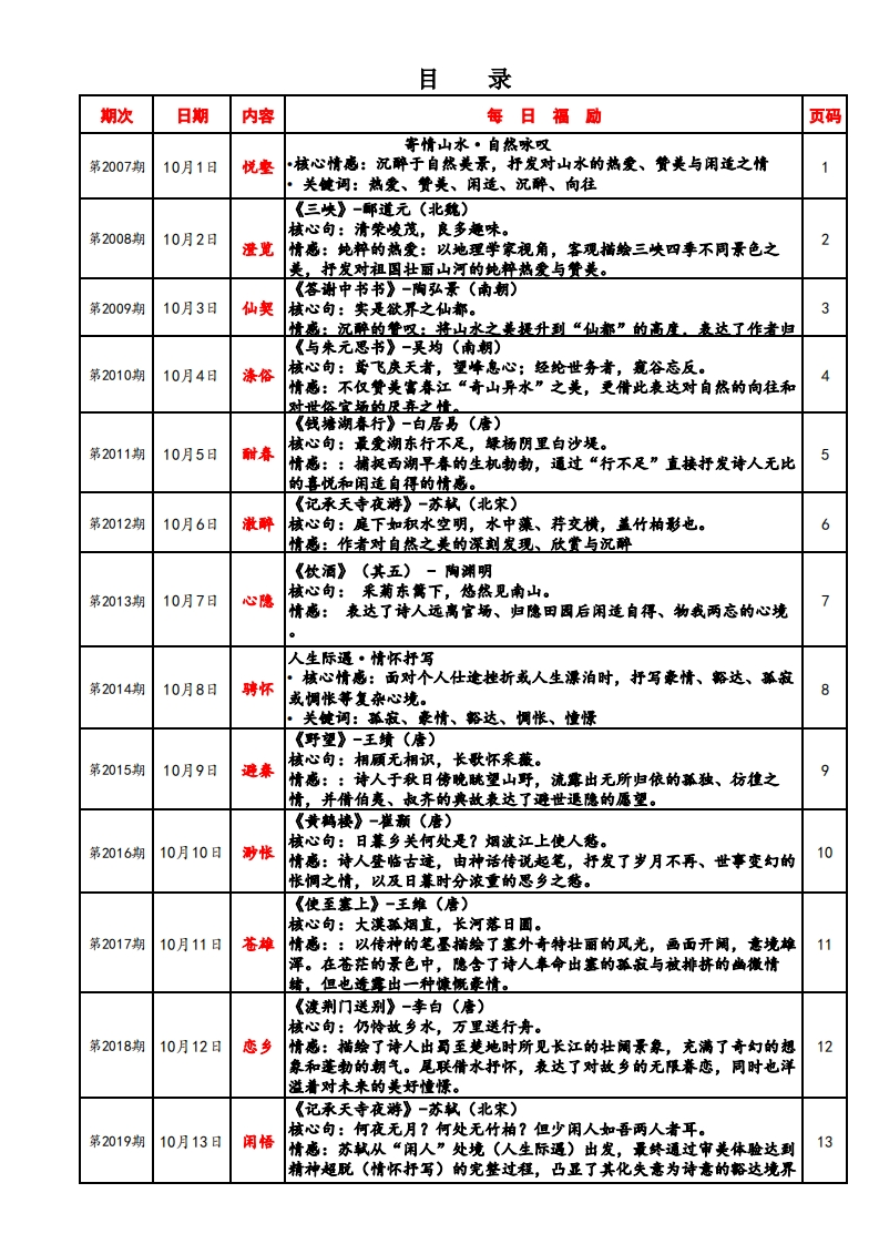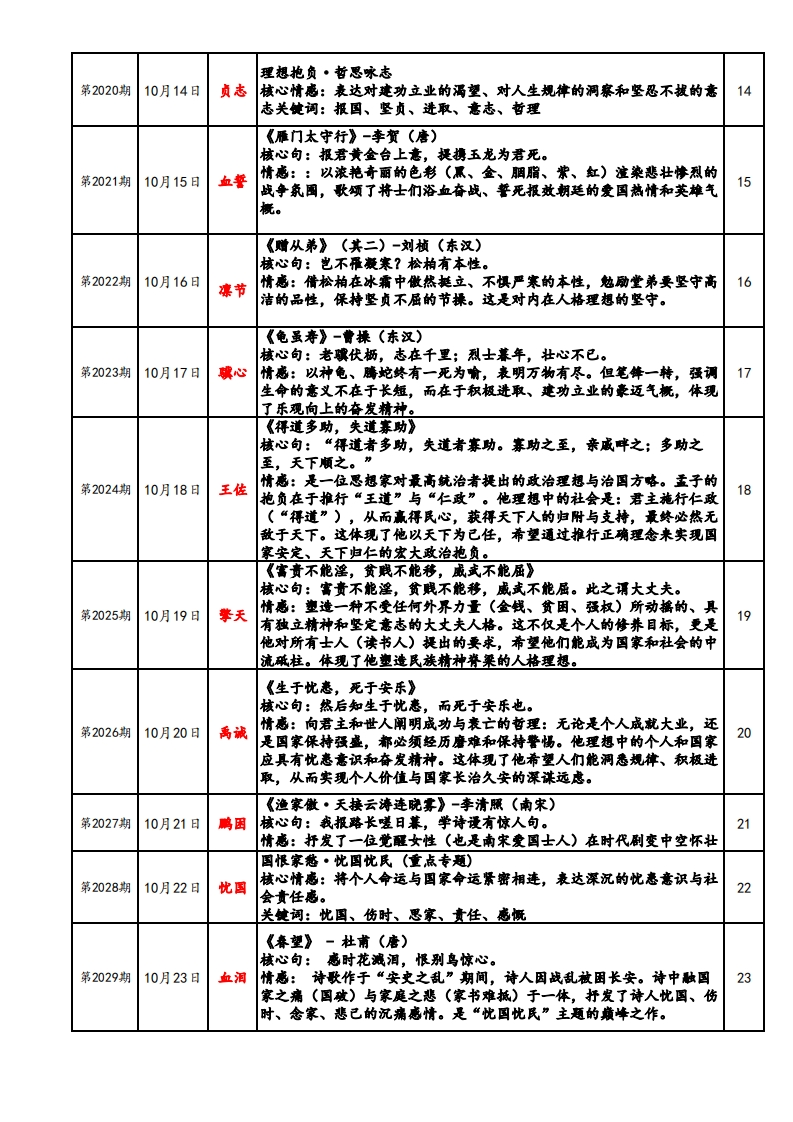 阿福每日专注一个字(2025.10.1-2025.10.31)福阿福每日专注一个字阿福工作室公众号▣▣阿福工作室出品目录期次日期内容每日福励页码寄情山水·自热咏叹第2007期10月1日悦妻核心情感:沉醉于自然美景,抒发对山水的热爱、管美与闲适之情关使词:热爱、赞美、闲适、况醉、向往《三峡》-耶道元(北魏)第2008期核心句:清荣峻茂,良多趣味。10月2日澄览情感:纯粹的热爱:以地理学家视角,客观描绘三峡四季不周景色之2美,抒发对祖国壮丽山河的纯粹热爱与赞美。《答谢中书书》-陶弘景(南朝)第2009期10月3日仙奥核心句:实是欲界之仙都。情感:沉醉的管叹:将山水之美提升到“仙都”的高度表达了作者归《与朱元思书》-吴均(南期)第2010期10月4日涤俗核心句:鸢飞庚天者,望峰息心;经蛇世务者,窥谷忘反。情感:不仅赞美寓春江“奇山异水”之美,更倩此表达对自然的向往和对世俗宫场的原弃之情。《钱塘湖春行》-白居易(唐)核心句:最爱湖东行不足,绿杨阴里白沙是。第2011期10月5日酣春情感::捕捉西湖早春的生机勒勃,通过“行不足”直接抒发诗人无比5的喜悦和闲适自得的情感。《记承天寺夜游》一苏就(北宋)第2012期10月6日浓醉核心句:庭下如积水空明,水中藻、荇交横,盖竹柏移也。6情感:作者对自然之美的谋刻发现、欣堂与沉醉《饮酒》(其五)一陶渊明第2013期10月7日心隐核心句:果菊东篱下,悠然见南山。情感:表达了诗人远离官场、归隐田因后闲适自得、物我两忘的心境>人生际遥·情怀抒写核心情感:面对个人仕逢挫折或人生漂泊时,抒写豪情、豁达、萧寂第2014期10月8日骋怀或惆怅等复杂心境。8关使词:菲寂、豪情、豁达、惆怅、幢悸《野望》-王绩(唐)核心句:相顾无相识,长歌怀采藏。第2015期10月9日进泰情感::诗人于秋日传晚眺望山野,流露出无所归依的菲独、行准之情,并倩伯夷、叔齐的典故表达了避世退隐的愿望。《黄鸬楼》-崔颜(唐)核心句:日幕乡关何处是?烟波江上使人慈。第2016期10月10日渺怅情感:诗人登临古迹,由神话传说起笔,抒发了岁月不再、世事变幻的10怅惆之情,以及日幕时分浓重的思乡之巷。《使至塞上》-王维(唐)核心句:大漠孤烟直,长河落日圆。第2017期10月11日苍雄情感::以传神的笔墨描绘了塞外奇特壮丽的风光,画面开阔,意境雄11浑。在苍茫的景色中,隐含了诗人奉命出塞的菲寂与被排挤的幽横情绪,但也透蓬出一种慷慨凄情。《渡荆门送别》-李白(唐)核心句:仍怜故乡水,万里送行舟。第2018期10月12日恋乡情感:描绘了诗人出蜀至楚地时所见长江的壮闻景象,充满了奇幻的想12象和蓬勃的期气。尾联情水抒怀,表达了对故乡的无限眷恋,周时也洋溢着对未来的美好懂悸。《记承天寺夜游》一苏戟(北宋)核心句:何夜无月?何处无竹柏?但少闲人如吾两人者耳。第2019期10月13日闲悟情感:苏机从“闲人”处境(人生际逼)出发,最终通过审美体验达到13精神超脱(情怀杆写)的完整过程,凸显了其化失意为诗意的髂达境界理想抱负·哲思咏志第2020期10月14日负志核心情感:表达对建功立业的福望、对人生规律的洞察和坚恐不拔的意14志关使词:报国、坚贞、进取、意志、哲理《雁门太守行》-李贺(唐)核心句:报君黄金台上意,提携玉龙为君死。第2021期10月15日血誓情感::以浓港奇丽的色彩(黑、金、朋脂、紫、红)注染悲壮修烈的战争氛国,歌颂了将士们浴血奋战、警死报效朝廷的爱国热情和英雄气15机。《赠从弟》(其二)-刘桢(东汉)核心句:岂不雁藏寒?松柏有本性。第2022期10月16日凛节情感:借松柏在冰霜中做然挺立、不惧严寒的本性,热励堂弟要坚守高16洁的品性,保持坚贞不屈的节操。这是对内在人格理想的坚守。《龟虽寿》-曹搛(东汉)核心句:老蝶伏枥,志在千里;烈士幕年,壮心不已。第2023期10月17日蝶心情感:以神龟、腾蛇终有一死为喻,表明万物有尽。但笔锋一转,强调17生命的意义不在于长短,而在于积极进取、建功立业的豪迈气概,体现了乐观向上的奋发精神。《得道多助,失道春助》核心句:“得道者多助,失道者寡功。寡助之至,亲成中之;多助之至,天下顺之。”第2024期王佐情感:是一位思想家对最高毓治者提出的政治理想与治国方略。孟子的10月18日抱负在于推行“王道”与“仁政”。他理想中的社会是:君主施行仁政18(“得道”),从而赢得民心,获得天下人的归附与支特,最终必热无敌于天下。这体现了他以天下为己任,希望通过推行正确理念来实现国家安定、天下归仁的宏大政治抱负。《富责不能淫,黄贱不能移,威武不能屈》核心句:害贵不能淫,贷贱不能移,咸式不能屈。此之谓大丈夫。第2025期情感:塑造一种不受任何外界力量(金钱、黄困、强权)所动摇的、具10月19日拳天有独立精神和坚定意志的大丈夫人格。这不仅是个人的修养目标,更是19他对所有士人(读书人)提出的要求,希望他们能成为国家和社会的中流砥柱。体现了他塑造民族精神誉莱的人格理想。《生于忧卷,死于安乐》核心句:热后知生于忧惠,而死于安乐也。第2026期情感:向君主和世人阐明成功与表亡的哲理:无论是个人成就大业,还10月20日禹诚是国家保持强盛,都必须经历磨难和保持警惕。他理想中的个人和国家20应具有忧惠意识和奋发精神。这体现了他希望人们能洞悉规律、积极进取,从而实现个人价值与国掌长治久安的深沫远虑。《渔家微·天接云涛连晓雾》一李清照(南宋)