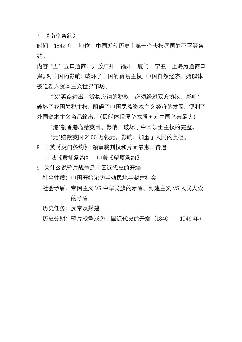 初二第1课背诵内容1.鸦片给中国带来的危害:①经济:白银大量外流,直接影响清政府的财政。②社会:严重摧残中国人民的体质,导致政治腐败和军队战斗力削弱。加重人民负担。2.“苟利国家生死以,岂因祸福避趋之”一一林则徐评价:林则徐是中华民族的民族英雄,虎门销烟体现了其敢于反抗,维护民族利益的斗争精神。3.虎门硝烟的意义:是中国人民禁烟的伟大胜利,显示了中华民族反抗外来侵略的坚强意志。4.鸦片战争爆发的原因①打开市场,掠夺原料(根本原因)②虎门销烟(直接原因,导火索〉③扭转贸易逆差,走私鸦片5.鸦片战争中反抗侵略的英雄人物及体现的精神:将领关天培、葛云飞、王锡朋、郑国鸿、陈化成、海龄等人民三元里抗英(中国人民第一次自发反抗外来侵略的斗争)精神:英勇顽强、不畏牺牲、反抗外来侵略、斗争到底的爱国主义精神!6.鸦片战争清政府(中国)失败的原因:根本原因:腐朽落后的封建制度不敌先进的资本主义制度。具体原因:①军事技术和装备落后:②清朝统治者昏庸愚昧,盲目自大,对内敌视人民,对外妥协投降。7.《南京条约》时间:1842年地位:中国近代历史上第一个丧权辱国的不平等条约。内容:“五”五口通商:开放广州,福州,厦门,宁波,上海为通商口岸。对中国的影响:破坏了中国的贸易主权;中国自然经济开始解体被迫卷入资本主义世界市场。“议”英商进出口货物应纳的税款,必须经过双方协议。影响:破坏了我国关税主权,阻碍了中国民族资本主义经济的发展,便利了外国资本主义商品输出。(最能体现侵华本质+对中国危害最大)“港”割香港岛给英国。影响:破坏了中国领土主权的完整。“元”赔款英国2100万银元。影响:加重了人民的负担。8.中英《虎门条约》:领事裁判权和片面最惠国待遇中法《黄埔条约》中美《望厦条约》9.为什么说鸦片战争是中国近代史的开端社会性质:中国开始沦为半殖民地半封建社会社会矛盾:帝国主义VS中华民族的矛盾、封建主义VS人民大众的矛盾历史任务:反帝反封建历史分期:鸦片战争成为中国近代史的开端(1840一1949年)