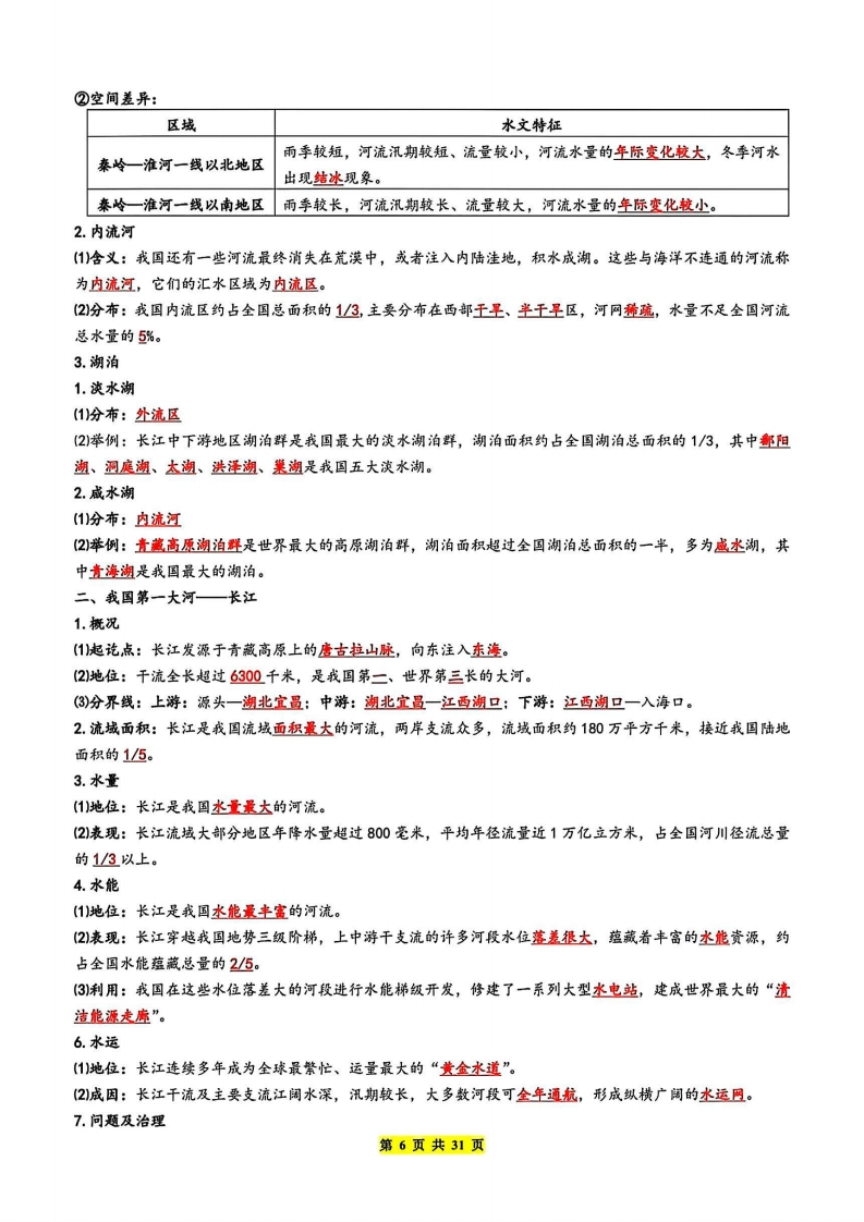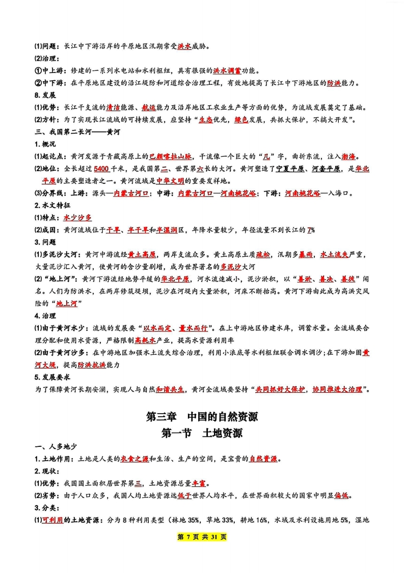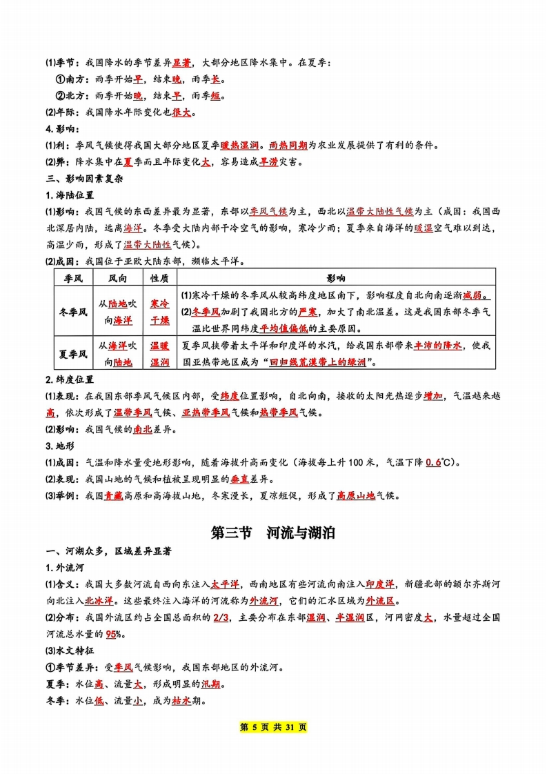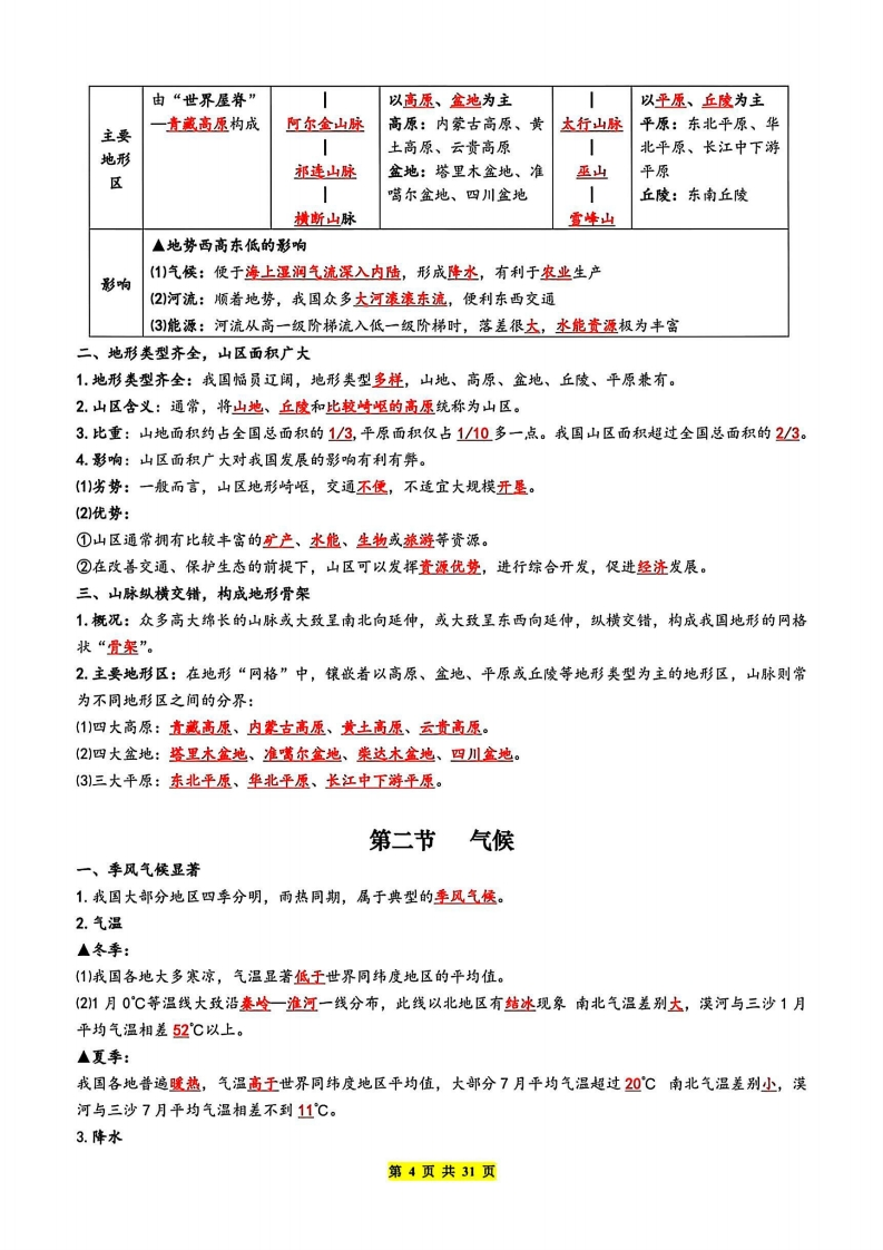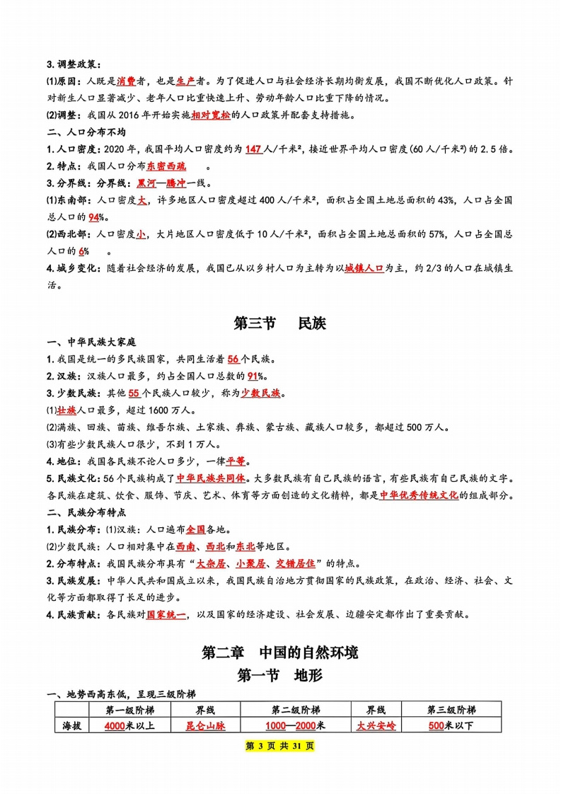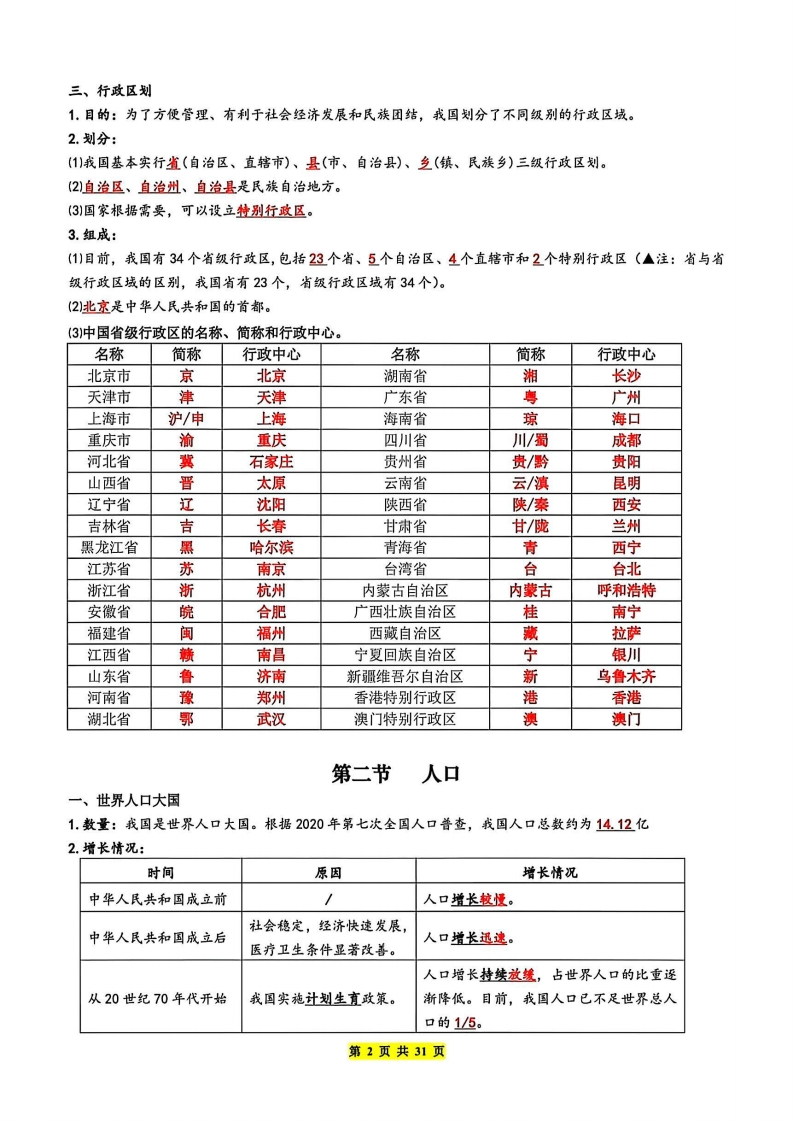 2025年秋新教材八上《地理》必背知识(背诵版)班级姓名第一章从世界看中国第一节疆域一、优越的地理位置1.位置()半球位置:从东西半球看,位于东半魏:从南北半球看,位于北半魏。(2)纬度位置:我国大部分地区位于北温带,南部部分地区位于热带,没有地区位于寒董。(③)海陆位置:我国位于世界最大的大陆一亚歌太陆的东部、世界最大的大洋一太平洋的西岸,海陆兼备。2.优越性()纬度位置的优越性:温带和热带的光照、热量条件,适宜人们的生适和生产活动。(2)海陆位置的优越性:①西部:深入亚欧大陆内部,陆上与许多国家接壤,通过陆路可以到达亚欧大陆的很多地方。②东部:我国海岸线曲折漫长,岛屿众多,通过水路可以到达世界主要港口。二、海阔陆广的大国1.陆广(1)跨度:跨度疆域四至表现最南端:在海南省南沙群岛中的曾母暗沙南北气候差异显著(当黑龙江沿岸冰天南北跨纬度最北端:在黑龙江省漠河市北端的黑龙江主航雪地的时候,南沙群岛却是天气炎热、近50°道中心线上树木葱郁)最西端:在新疆维吾尔自治区的帕米尔高愿上东西时间差大(当乌苏里江早晨洒满东西跨经度最东端:位于黑龙江省黑龙江与乌苏里江主抗金色阳光的时候,帕米尔高原还是满天超过60°道中心线的汇合处星斗的黑夜(2)面积:我国陆地领土面积960万平方千米,仅次于俄罗斯和加李大,居世界第三位,与欧洲面积相当。(3)国界线:我国陆上国界线长约2.2五千米,与14个国家接壤。2.海闲(1)海城面积:我国领海面积37五平方千米,可主张的管辖海域面积约300五平方千米,大陆海岸线长约1.8五千米。(2)临海:我国大陆濒临的海洋,从北到南,依次为渤海、黄海、东海、南海,台湾岛东岸直接濒临太平洋。(3)内海:辽东半岛和山东半岛所环抱的教海,以及雷州半岛和海南岛之间的琼州海峡,是我国的内海。(4)岛屿:我国近海分布着台湾岛、海南岛、身山群岛、南海诸岛等1.1万余个岛屿,南海谐岛是我国领土的组成部分,约鱼岛及其附属岛屿是我国固有领土。⑤)隔海相望的国家:我国与8个国家隔海相望。其中,我国与朝邂、越南既陆上相邻,又隔海相望。①陆上相邻:逆时针:朝鲜、俄罗逝、蒙支、哈萨克斯坦、吉尔吉斯斯坦、塔吉克斯坦、阿富迁、巴基斯坦、印度、尼泊尔、不丹、缅甸、老挝、越南。②隔海相望:顺时针:韩国、旦本、菲律宾、马来西亚、文莱、印度尼西亚。③既陆上相邻又隔海相望:朝斟、越虚。第1页共31页三、行政区划1.目的:为了方便管理、有利于社会经济发展和民族团结,我国划分了不同级别的行政区城。2.划分:()我国基本实行省(自治区、直辖市)、县(市、自治县)、乡(镇、民族乡)三级行政区划。(2)自治区、自治州、自治县是民族自治地方。(3)国家根据需要,可以设立特别行政区。3.组成:(1)目前,我国有34个省级行政区,包括23个省、互个自治区、4个直辖市和2个特别行政区(▲注:省与省级行政区域的区别,我国省有23个,省级行政区域有34个)。(2)北京是中华人民共和国的首都。(3)中国省级行政区的名称、简称和行政中心。名称简称行政中心名称简称行政中心北京市京北京湖南省湘长沙天津市津天津广东省粤广州上海市沪/申上海海南省琼海口重庆市渝重庆四川省川/蜀成都河北省冀石家庄贵州省贵/黔责阳山西省晋太原云南省云/滇昆明辽宁省辽沈阳陕西省陕/秦西安吉林省吉长春甘肃省甘/陇兰州黑龙江省黑哈尔滨青海省青西宁江苏省苏南京台湾省台台北浙江省浙杭州内蒙古自治区内蒙古呼和浩特安徽省皖合肥广西壮族自治区桂南宁福建省闽福州西藏自治区藏拉萨江西省赣南昌宁夏回族自治区宁银川山东省鲁济南新弧维吾尔自治区新鸟鲁木齐河南省豫郑州香港特别行政区港香港湖北省郭武汉澳门特别行政区澳澳门第二节人口一、世界人口大国1.数量:我国是世界人口大国。根据2020年第七次全国人口普查,我国人口总数约为14.12亿2.增长情况:时间原因增长情况中华人民共和国成立前/人口增长较慢。社会稳定,经济快速发展,中华人民共和国成立后人口增长迅速。医疗卫生条件显著改善。人口增长持续放线,占世界人口的比重逐从20世纪70年代开始我国实施计划生直政策。浙降低。目前,我国人口已不足世界总人口的15。第2页共31页3.调整政策:()原因:人既是消费者,也是生产者。为了促进人口与社会经济长期均衡发展,我国不断优化人口政策。针对新生人口显著减少、老年人口比重快速上升、劳动年龄人口比重下降的情况。(2)调整:我国从2016年开始实施相对宽松的人口政策并配套支持措施。二、人口分布不均1.人口密度:2020年,我国平均人口密度约为147人/千米2,接近世界平均人口密度(60人/千米)的2.5倍。2.特点:我国人口分布东蜜西疏3.分界线:分界线:黑江一腾冲一线。(1)东南部:人口密度大,许多地区人口密度超过400人/千米2,面积占全国土地总面积的43%,人口占全国总人口的94%。(2)西北部:人口密度小,大片地区人口密度低于10人/千米2,面积占全国土地总面积的57%,人口占全国总人口的%4.城乡变化:随着社会经济的发展,我国已从以乡村人口为主转为以城镇人旦为主,约2/3的人口在城镇生活。第三节民族一、中华民族大家庭1.我国是统一的多民族国家,共同生活着56个民族。2.汉族:汉族人口最多,约占全国人口总数的91%。3.少数民族:其他55个民族人口较少,称为少数民族。(1世族人