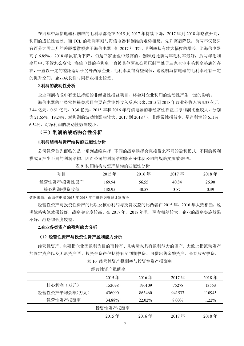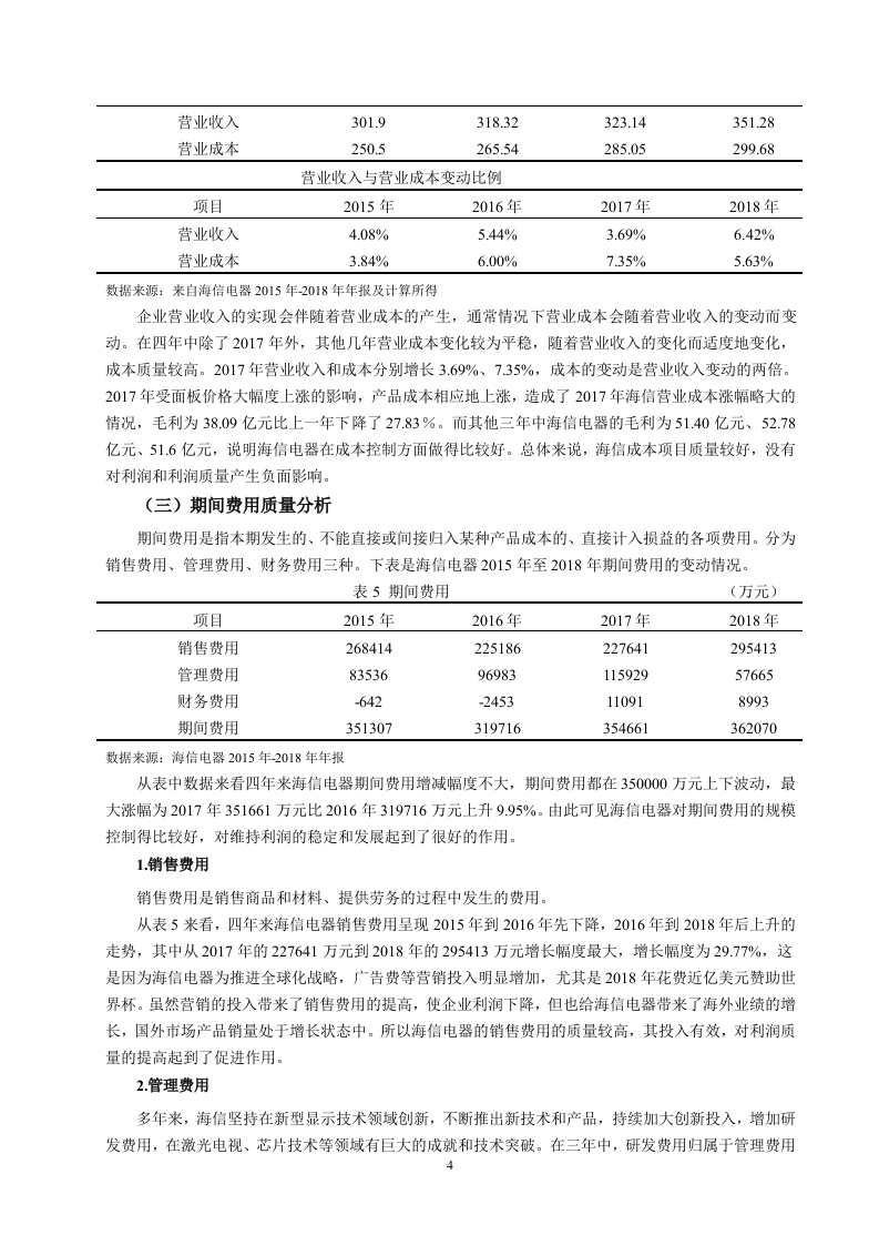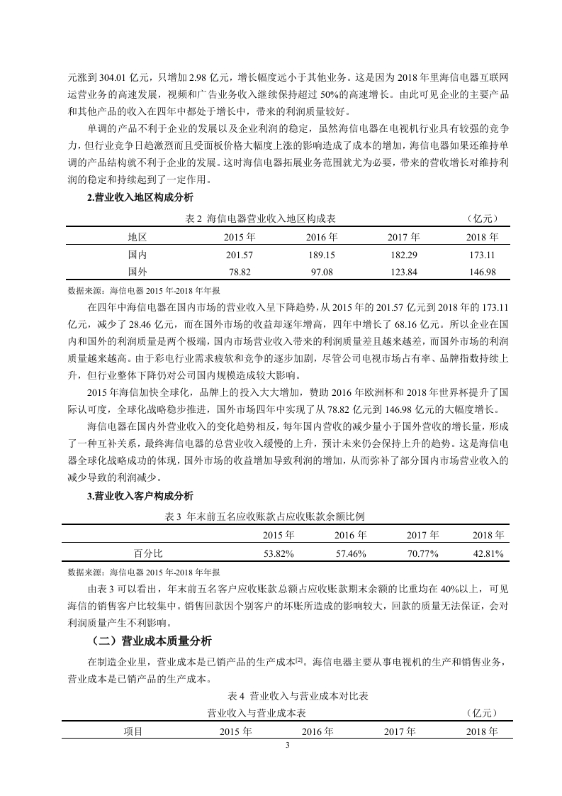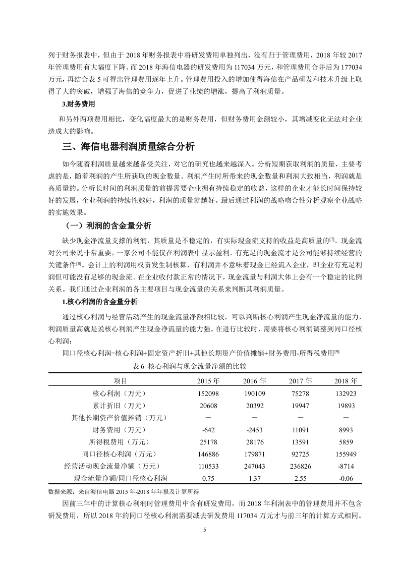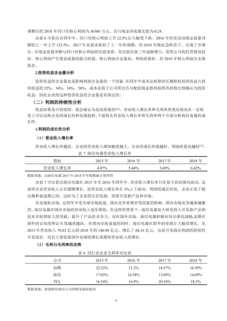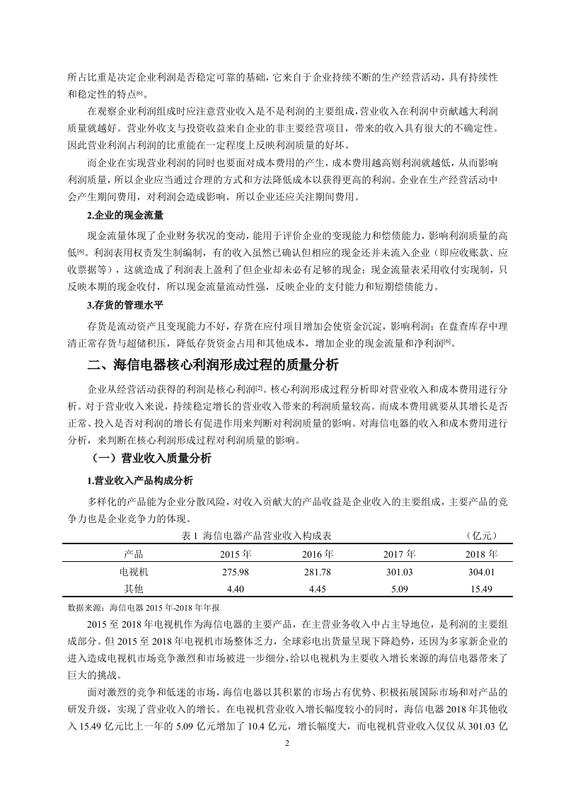 引言各企业随着我国经济的快速发展而发展壮大着,关注企业发展情况的人也越来越多。而利润作为衡量一个企业经营成果和盈利能力的重要项目,人们对它的关注程度越来越高,利润信息越来越重要。企业的经营与发展需要有持续稳定的利润流入,充足的利润既是企业发展的动力又是员工们工作的动力。一个拥有充足可靠利润的企业更能吸引投资者对企业投资。利润质量的研究不仅有利于公司的发展,促进资源的优化配置,更能对社会经济的发展起到推动作用)。因此利润质量分析成为了业界和学界关注的焦点。目前学界通过不同的角度和不同层次对企业利润质量分析进行研究,取得了丰富的研究成果,搭建了完善的利润质量分析框架,为对企业利润质量评价提供了分析依据和方向。其中利润的持续性和利润的稳定性一直是研究的热点。张新民、钱爱民将利润质量与公司业务结构、公司战略吻合度、利润结构、资产结构等要素结合起来,构建利润质量分析框架。但是国内外研究中对具体某企业的利润质量分析较为缺乏,这就为本文的分析提供了契机。青岛海信电器股份有限公司位于山东省青岛市,1997年4月在上海证交所上市,是中国著名的家电生产厂商,以电视机为核心产品。在2016年到2018年三年中,海信电器净利润下滑,但这并不足以说明企业的利润的质量差。本文将以海信电器为例,以国内外研究的理论成果为支撑,将现有理论与实际应用相结合,对海信电器核心利润的形成过程、利润的含金量、持续性和战略吻合性进行分析,进而进行综合分析,最后对利润质量做出评价与建议。因此,本研究可以帮助企业的经营者进行管理决策,也能让投资者和其他利益相关者根据利润质量分析判断企业的发展状况和投资价值。一、利润质量的内涵、影响因素(一)利润质量的内涵利润质量还叫做盈余质量、收益质量。张新民给利润质量的定义是:企业利润形成的过程、组成部分以及利润结果等共同构成了利润质量可。利润的形成过程中,营业收入是利润的主要组成部分,持续稳定的营业收入是高质量利润的重要组成项目。而成本费用会降低利润,使利润质量降低,但我们不能仅仅从这个方面来判断成本费用对利润质量的影响,还应该从其投入的有效性、是否对企业的收入带来积极影响等来判断对利润质量的影响。盈利能力的强弱是判断企业好坏的重要项目,可以从利润中看出来。传统的财务报表分析通过毛利率、销售净利率等衡量利润的相当规模来分析企业的盈利能力,并没有从质量方面来考虑对盈利能力的影响。企业的核心竞争力能通过提高利润质量来获得提高,这样才能在激烈的竞争环境中立足。相反,如果利润质量相对较差,企业的运营管理难以实现有效的长期发展。在实际中,具有高利润的企业可能并没有强大的盈利能力,这就是企业利润质量方面出现了问题,这时企业应该关注的不是利润的单方面提高,而应该着重于改善企业的利润质量来提高盈利能力。分析短期获取利润的质量,主要考虑的是,随着利润的产生所获取的现金数量。利润产生时所带来的现金数量和利润大致相当,利润就是高质量的长时间的利润质量,需要企业拥有持续稳定的利润收入来源,使其能够维持长期良好的运营发展。企业的利润在长时期保持持续稳定,那么企业的利润质量就比较高。(二)利润质量的影响因素1.企业利润来源利润主要由主营业务利润、投资收益、营业外收支净额构成。在利润构成内容中,营业利润及其1所占比重是决定企业利润是否稳定可靠的基础,它来自于企业持续不断的生产经营活动,具有持续性和稳定性的特点阿。在观察企业利润组成时应注意营业收入是不是利润的主要组成,营业收入在利润中贡献越大利润质量就越好。营业外收支与投资收益来自企业的非主要经营项目,带来的收入具有很大的不确定性。因此营业利润占利润的比重能在一定程度上反映利润质量的好坏。而企业在实现营业利润的同时也要面对成本费用的产生,成本费用越高则利润就越低,从而影向利润质量,所以企业应当通过合理的方式和方法降低成本以获得更高的利润。企业在生产经营活动中会产生期间费用,对利润会造成影响,所以企业还应关注期间费用。2.企业的现金流量现金流量体现了企业财务状况的变动,能用于评价企业的变现能力和偿债能力,影响利润质量的高低阿。利润表用权责发生制编制,有的收入虽然己确认但相应的现金还并未流入企业(即应收账款、应收票据等),这就造成了利润表上盈利了但企业却未必有足够的现金:现金流量表采用收付实现制,只反映本期的现金收付,所以现金流量流动性强,反映企业的支付能力和短期偿债能力。3.存货的管理水平存货是流动资产且变现能力不好,存货在应付项目增加会使资金沉淀,影响利润:在盘查库存中理清正常存货与超储积压,降低存货资金占用和其他成本,增加企业的现金流量和净利润。二、海信电器核心利润形成过程的质量分析企业从经营活动获得的利润是核心利润②。核心利润形成过程分析即对营业收入和成本费用进行分析。对于营业收入来说,持续稳定增长的营业收入带来的利润质量较高。而成本费用就要从其增长是否正常、投入是否对利润的增长有促进作用来判断对利润质量的影响。对海信电器的收入和成本费用