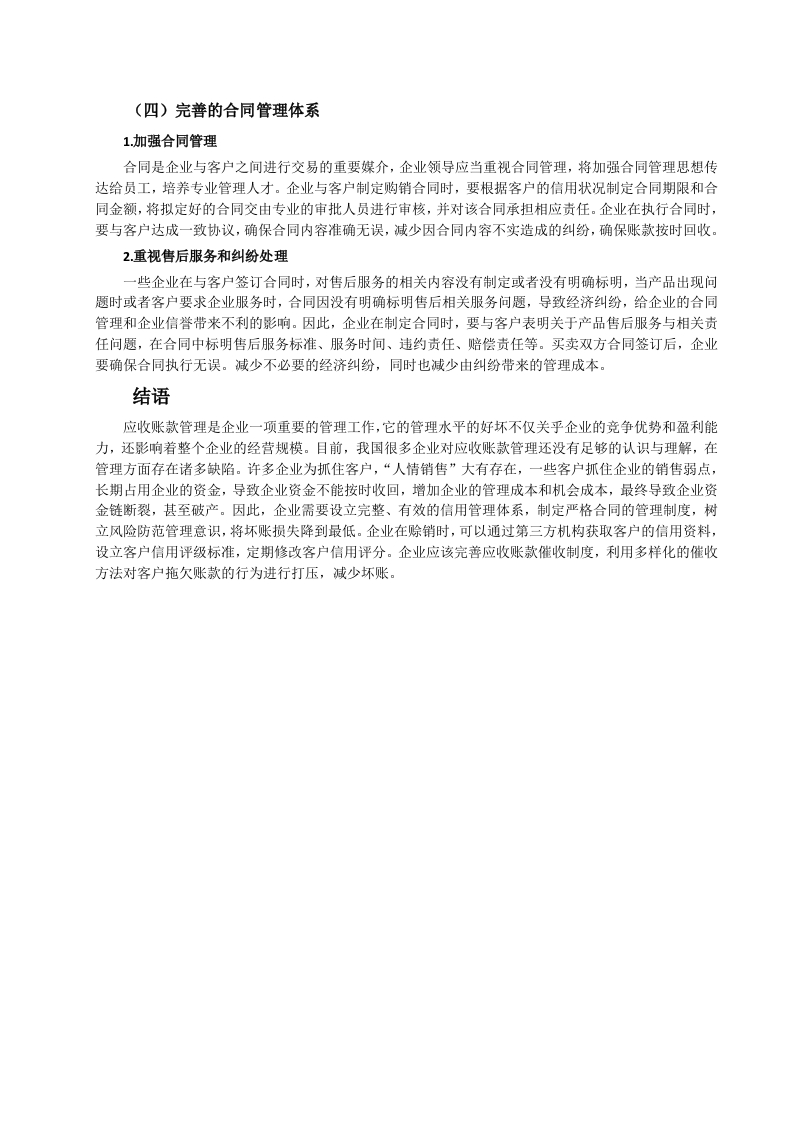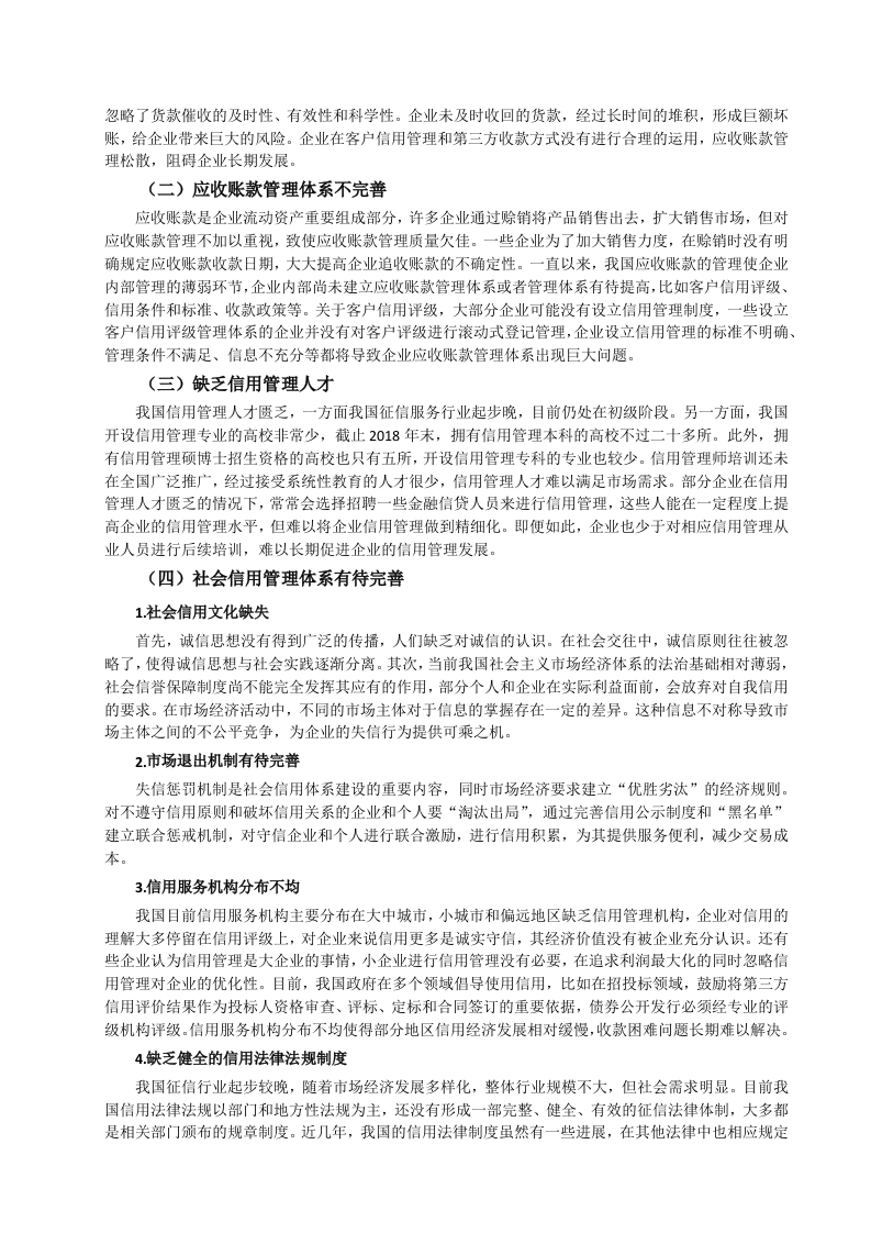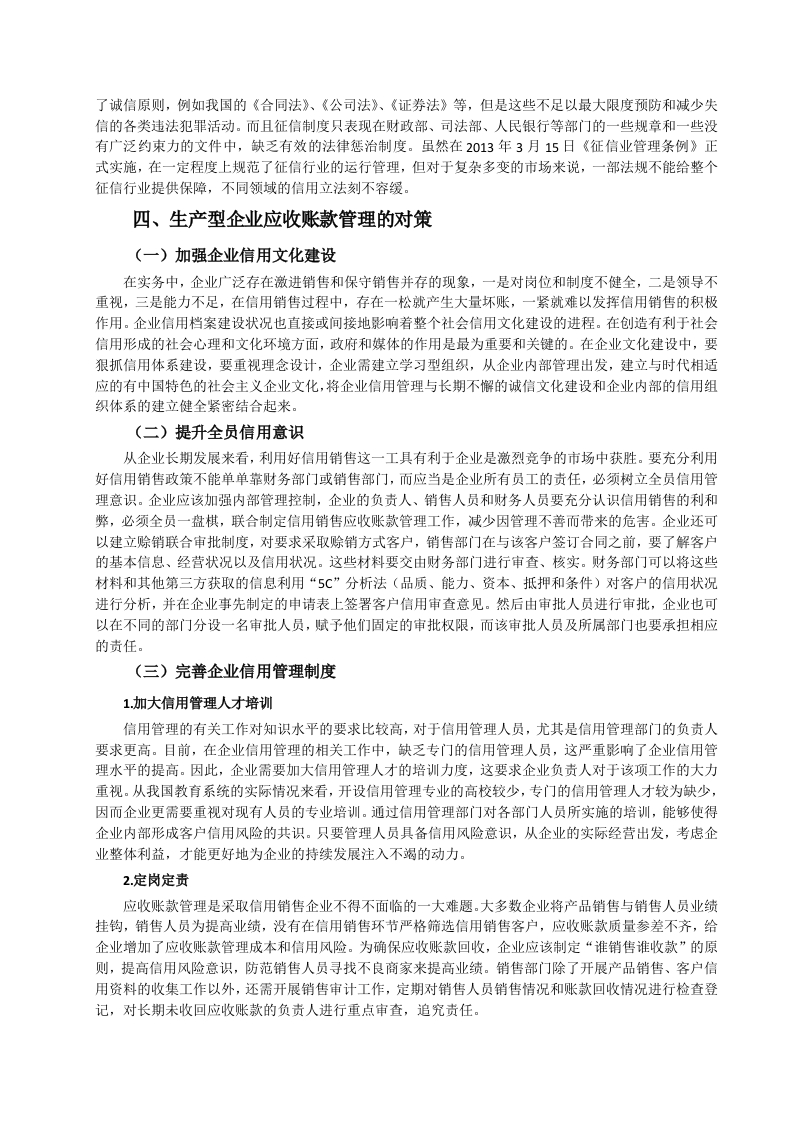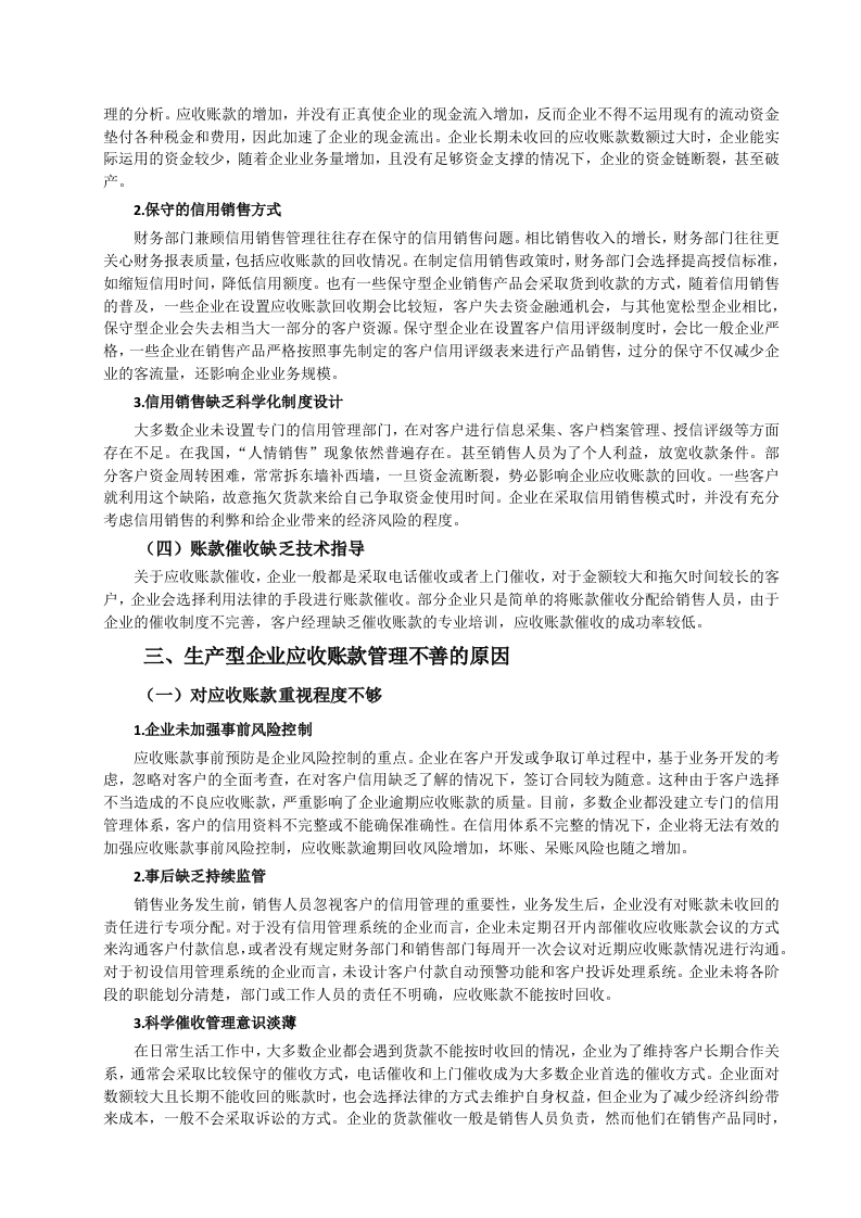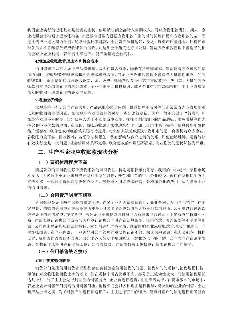 引言随着信用销售的广泛运用,应收账款管理的重要性不断提升。应收账款是企业流动资产的重要组成部分,应收账款的增加,意味着企业的营业收入未能及时收回,即使企业账上利润增加,但收现质量较差,甚至部分企业因此面临着资金断裂的风险。由于企业对客户的信用管理体系不完善,在对客户授信前没有进行较为科学的信用评级,客户评级偏差大,导致企业应收账款管理缺乏科学性。在我国很多企业都没有设立专门的信用管理部门,应收账款管理较为混乱,一些应收账款因为各种原因长期难以收回,增加了各项管理成本,减少了企业利润,降低资金使用效率,影响企业后期发展。因此,企业要加强对应收账款的管理,完善客户管理体系以及企业内控管理,减少坏账损失,而不能盲目追求营业收入增长,放宽应收账款信用管理。一、生产型企业应收账款管理变的理论基础(一)应收账款的概念应收账款是指企业在正常的经营过程中因销售商品和提供劳务等业务,应向购买单位收取的款项包括应由购买单位或接受劳务单位负担的税金、代购买方垫付的包装费各种运杂费等。此外,在有销售折扣的情况下,还应考虑商业折扣和现金折扣等因素。四(二)应收账款管理的概念应收账款管理是指在赊销业务中,从授信方(销售商)将货物或服务提供给受信方(购买商),债权成立开始,到款项实际收回或作为坏账处理结束,授信企业采用系统的方法和科学的手段,对应收账款回收全过程所进行的管理。其目的是保证足额、及时收回应收账款,降低和避免信用风险。应收账款管理是信用管理的重要组成部分,它属于企业后期信用管理范畴。四(三)应收账款形成的原因竞争激烈是企业进行信用销售的主要原因,也是形成应收账款的主要原因。在竞争日益激烈的卖方市场条件下,企业为了在市场中生存下去,扩大销售额,增加市场份额,提高市场占有率,以此提高经济效益。此外,市场产品更新替代速度快,企业为了减少产品库存,获取利润,降低单位生产成本。企业除了低价销售产品争夺市场外,赊销成了重要的销售方式,因此产生了大量的应收账款,给企业带来了严重的潜在风险。(四)应收账款管理不普的影响1.降低资金使用效率应收账款属于短期流动资产,当企业存在过多的应收款未收回时,坏账的风险增加,严重的情况下,可能还会导致企业资金链断裂。由于企业物流与现金流的时间不一致,货物发出,开出销售发票,货款却不能同步收回,而销售己经成立。这种没有货款流入的销售收入,势必影响资产质量。在没有资金流入的情况下,企业还要上缴销售税金以及税金预缴,如果遇到跨年度的应收账款,可能会因此虚增利润,并且用现有流动资金分红。长期未收回的货款会占用大量的资金,久之会影响企业的资金正常运转,虚增利润,隐藏企业经营的真实情况,导致企业不能正常经营。2产生坏账风险面对竞争激烈的市场,企业若只重视增加销售规模,扩大市场份额,由于考核与销售收入挂钩,很容易造成盲目的赊销产品、延长信用还款日期等问题。这种普遍只重视收营业入和利润指标,不重视应收账款的回收,如果资金不能回笼,就会产生没有现金流的账面利润,企业也就会形成许多呆账、坏账,严重还会影响企业的后续发展。3.资产质量下降处于买方市场的生产企业应收账款占比较高,一般而言,应收账款与销售收入呈正相关关系。由于我国企业实行的记账基础是权责发生制,信用销售额全部计入当期收入,同时应收账款增加。期末,企业按照会计准则计提坏账准备,计提标准通常为根据应收账款产生的时间长短计提和应收账款的某一固定比例或一定区间内计提。通常计提比率越高,企业资产质量越好,反之,则资产质量越差。计提坏账准备后并不意味着放弃应收账款的催收,只是从会计角度进行了处理,但是应收账款管理不善造成的损失会减少企业利润,若计提比率过低,资产质量则会被高估。4增加应收账款管理成本和机会成本信用销售可以扩大企业产品销售量,减少存货占有率,降低存货管理成本。但是随着应收账款的增加的同时,应收账款管理成本和机会成本相应增加。当企业应收账款管理不善造成大量逾期未收回的应收账款时,就会增加应收账款收款费,如诉讼费、律师费以及采用第三方收款支付费用等。大量的应收账款同样也会增加企业的机会成本,企业面临高回报投资时,或者企业扩大市场规模时,由于应收账款未及时收回,造成企业措施发展良机。5.增加经济纠纷宏观经济下行、合同存在瑕疵、产品或服务质量问题、投诉处理不及时等问题常常成为应收账款难以及时收回的重要因素。在宏观经济发展较好的时期,资金比较宽裕,客户一般不会过于“较真”,但在经济发展不好时期,部分债务人为了不还款或少还款,往往会利用细小的产品瑕疵、服务质量等作为拖欠和拒不付款的理由。在我国,商账追收属于法律边缘行业,加上信用体系不完善,信息孤岛现象仍然广泛存在,联合惩戒制度的效果还有待提升,对失信人缺乏威慑力,收账难问题一直困扰着众多企业若收账力度不够,回收困难:若采取法律措施,势必影响与客户之间的关系,即便能够胜诉,是否能够有效执行也是一大问题。社会信用体系不完善,联合惩戒的作用还不凸显,商业拖欠问题仍然较为严重。二、生产型企业应收账款现状分析(一)票据使用